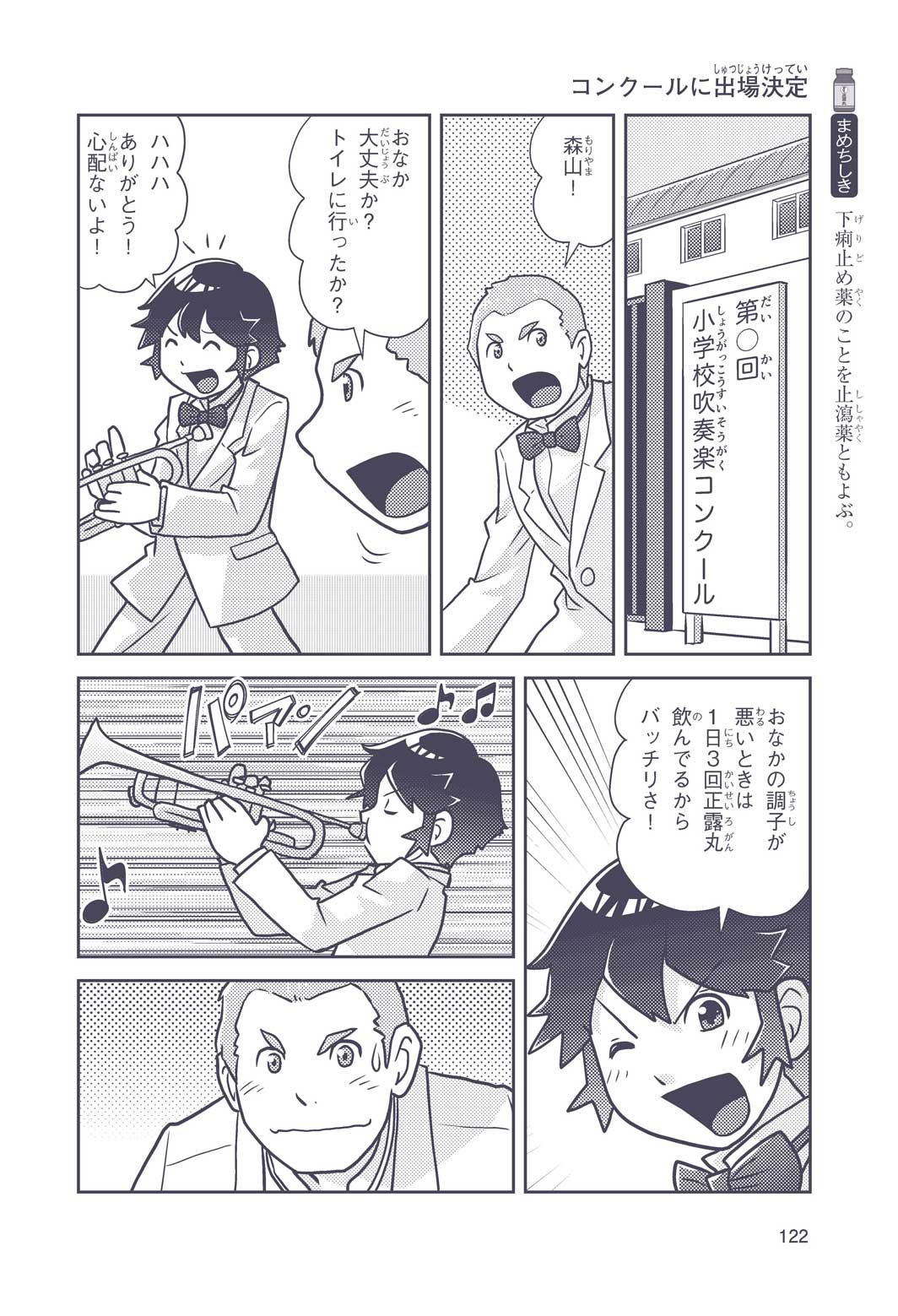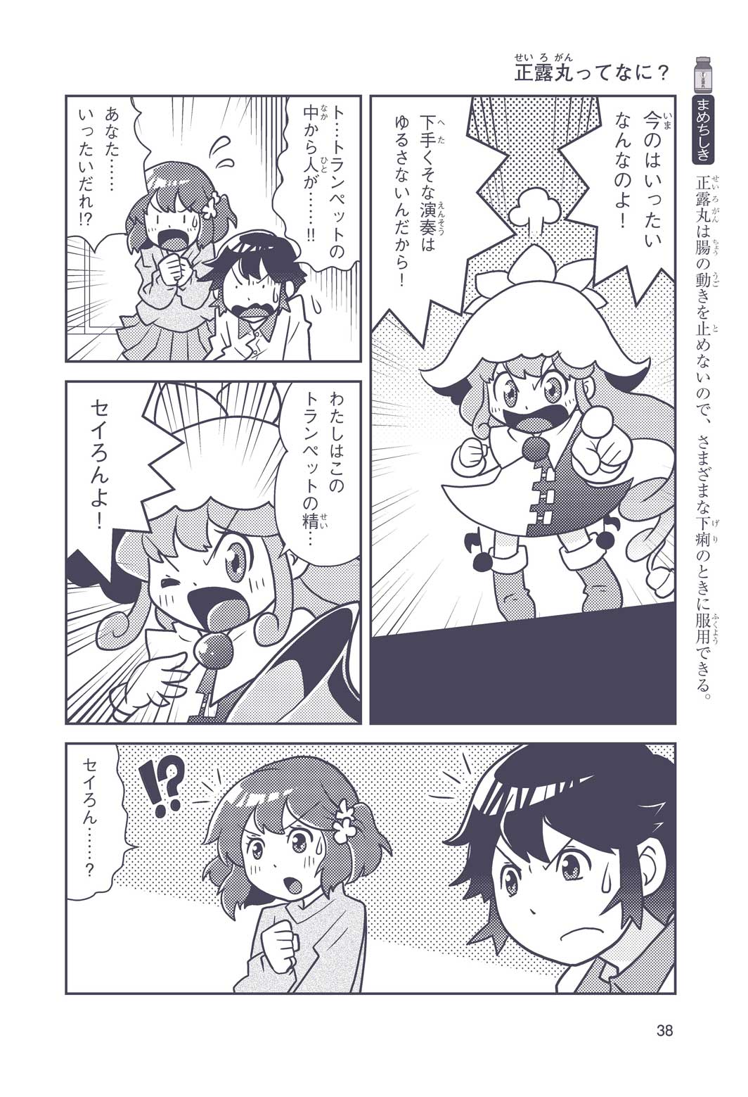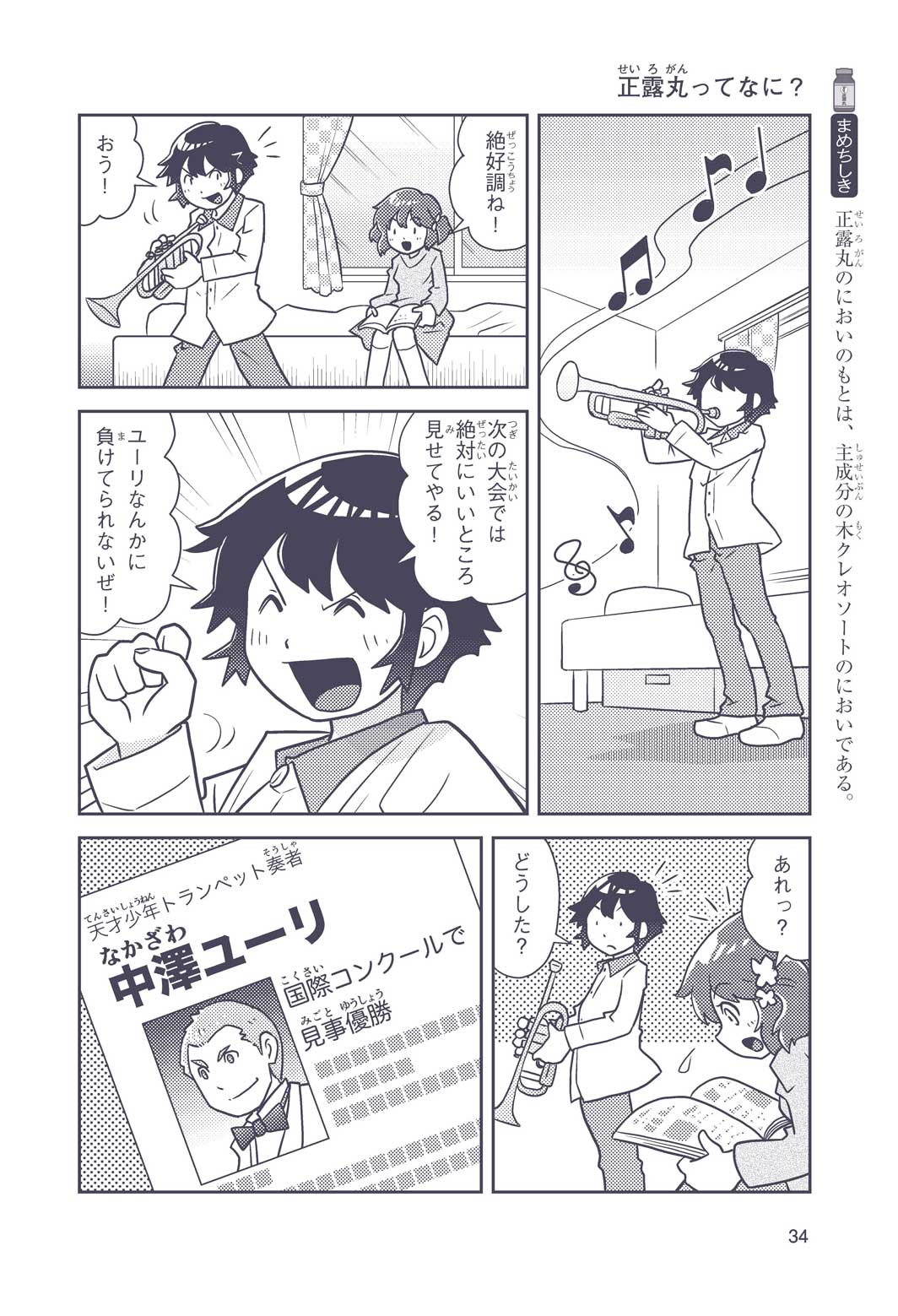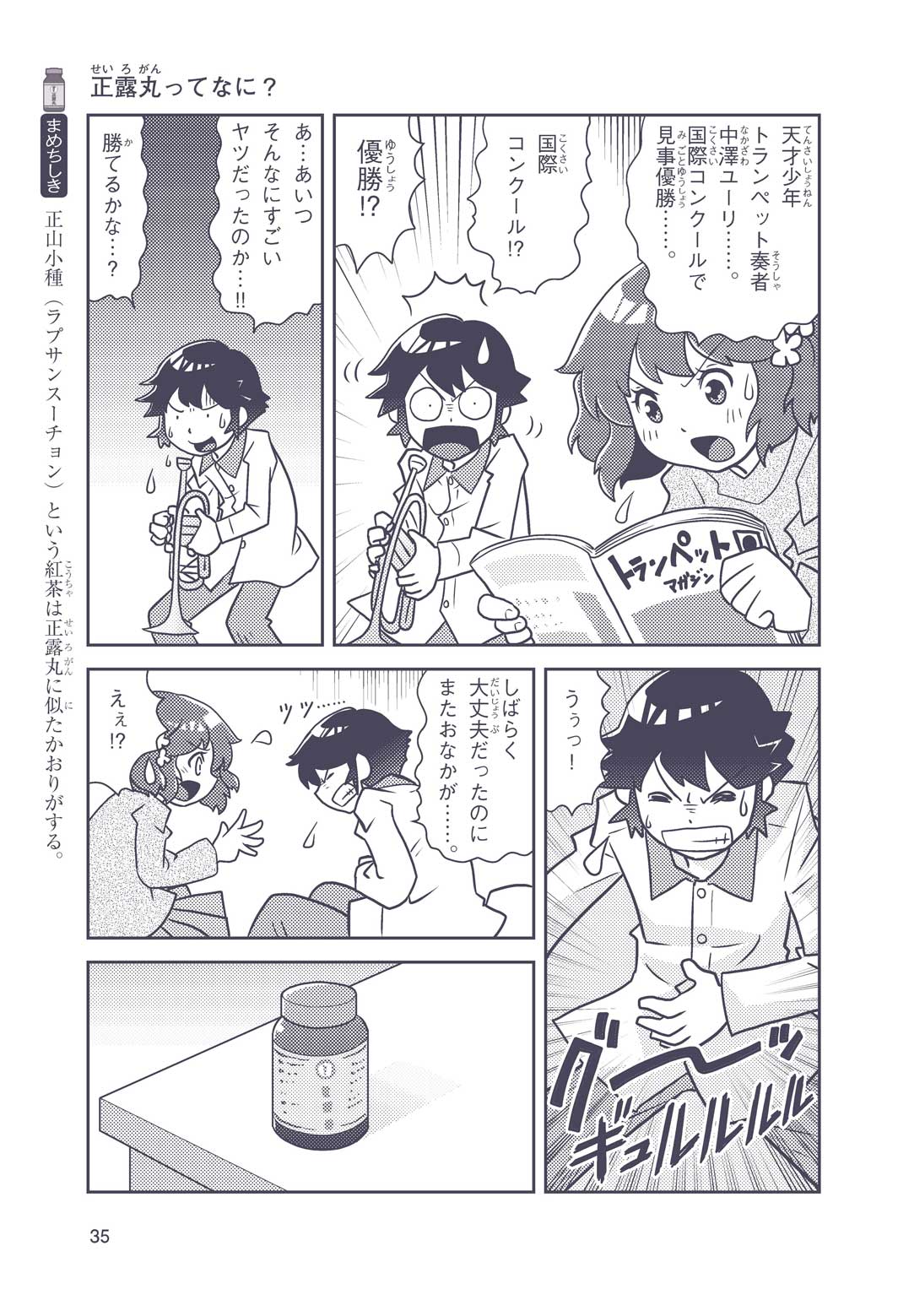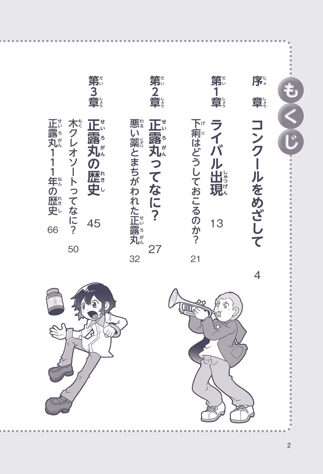 正はトランペットのソロ演奏者(えんそうしゃ)。きんちょうするとすぐおなかがいたくなっちゃって、本番では失敗ばかり。そんな時、トランペットの得意なユーリが転校してきて、さあ大変! 正はユーリと正々堂々戦うために、おなかの薬「正露丸(せいろがん)」を飲んだけれど…。正露丸って、どんな薬? いつから使われ始めたんだろう? 正はトランペットの精(せい)、セイろんといっしょに、時空をこえた旅に出る!