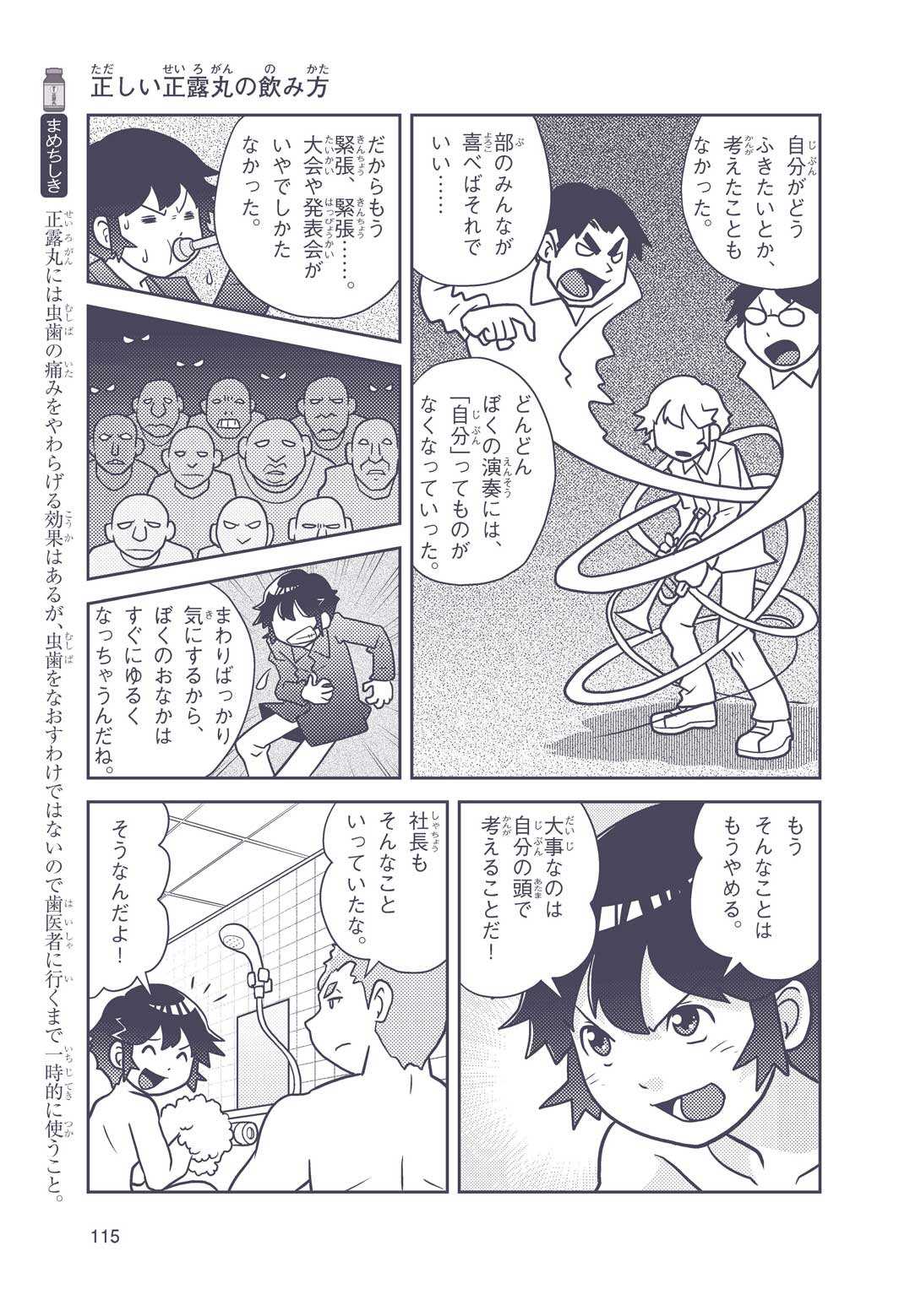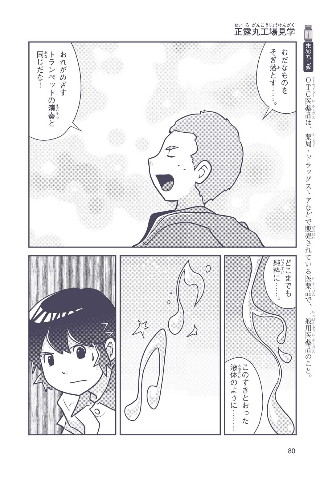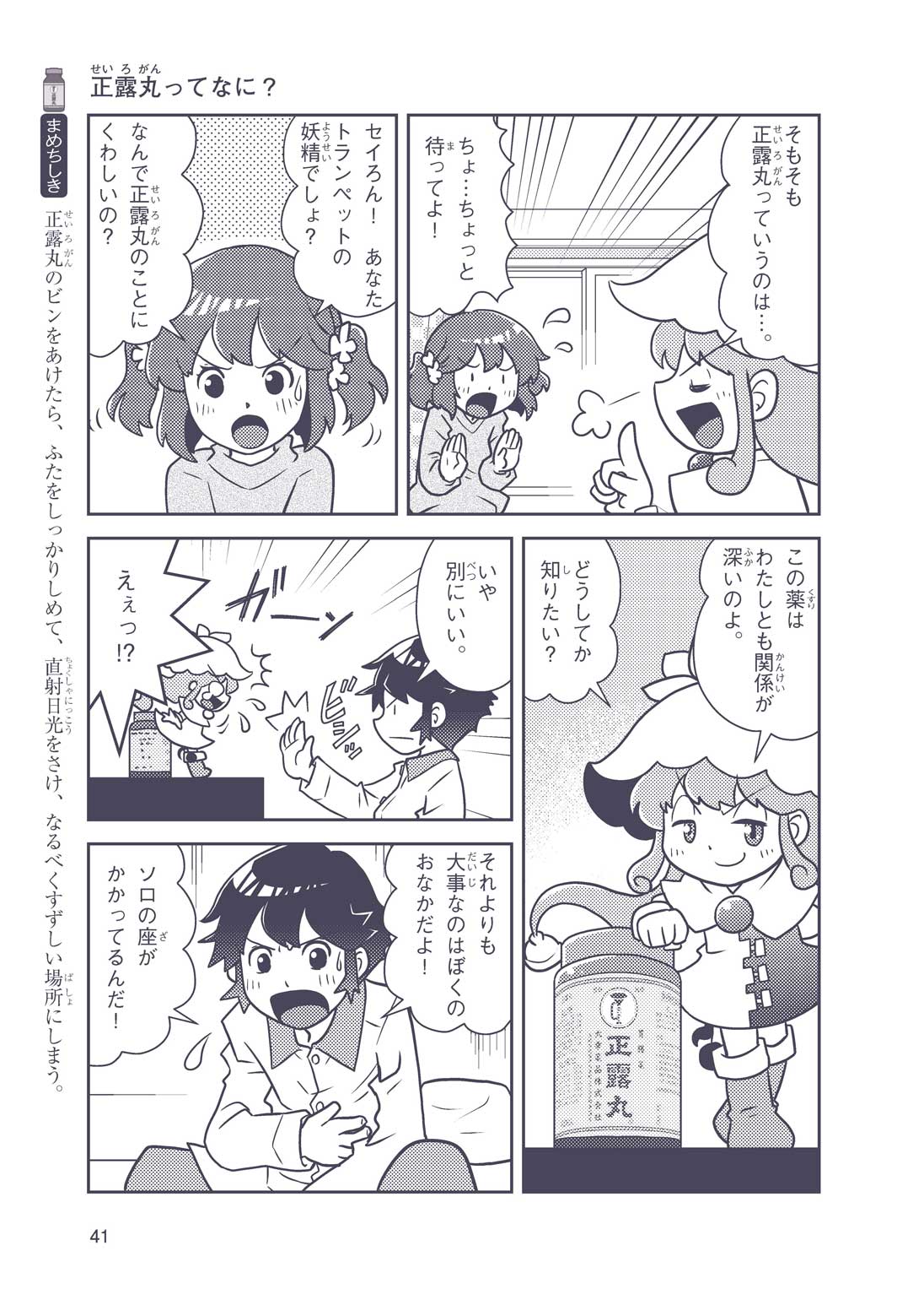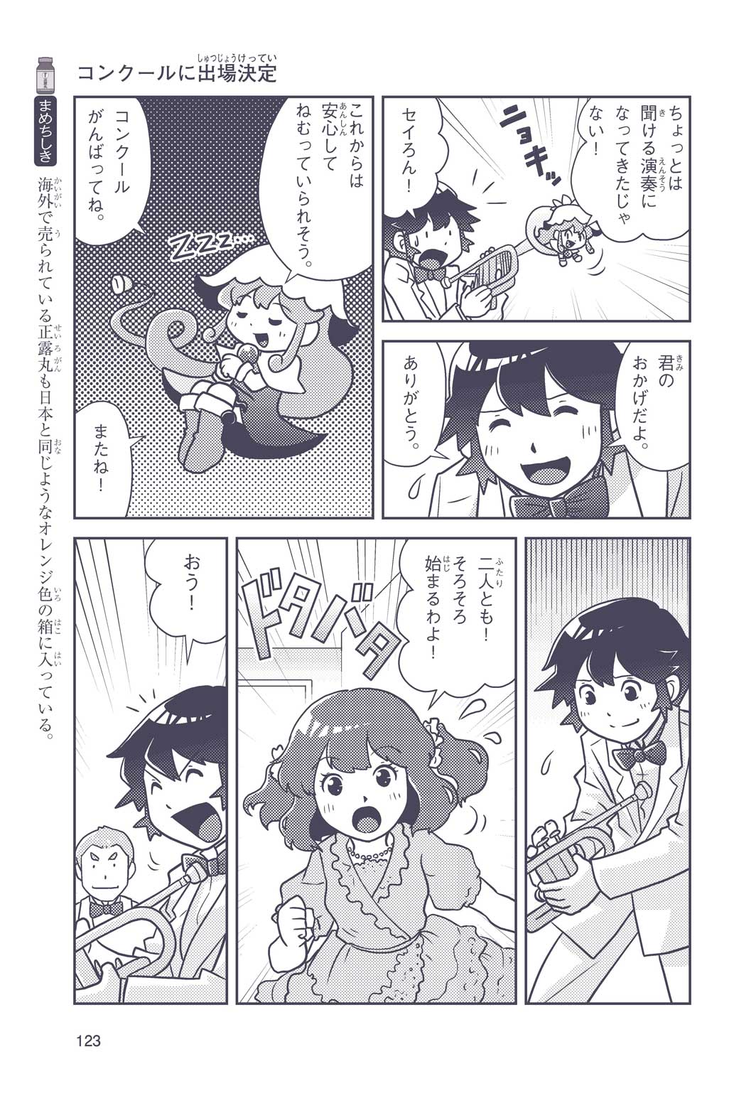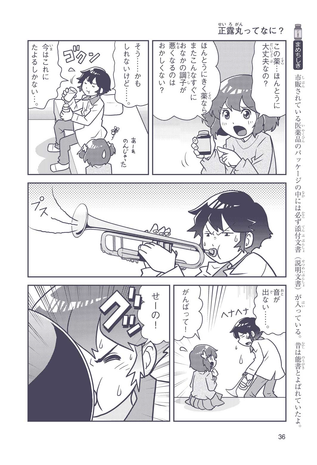正はトランペットのソロ演奏者(えんそうしゃ)。きんちょうするとすぐおなかがいたくなっちゃって、本番では失敗ばかり。そんな時、トランペットの得意なユーリが転校してきて、さあ大変! 正はユーリと正々堂々戦うために、おなかの薬「正露丸(せいろがん)」を飲んだけれど…。正露丸って、どんな薬? いつから使われ始めたんだろう? 正はトランペットの精(せい)、セイろんといっしょに、時空をこえた旅に出る!