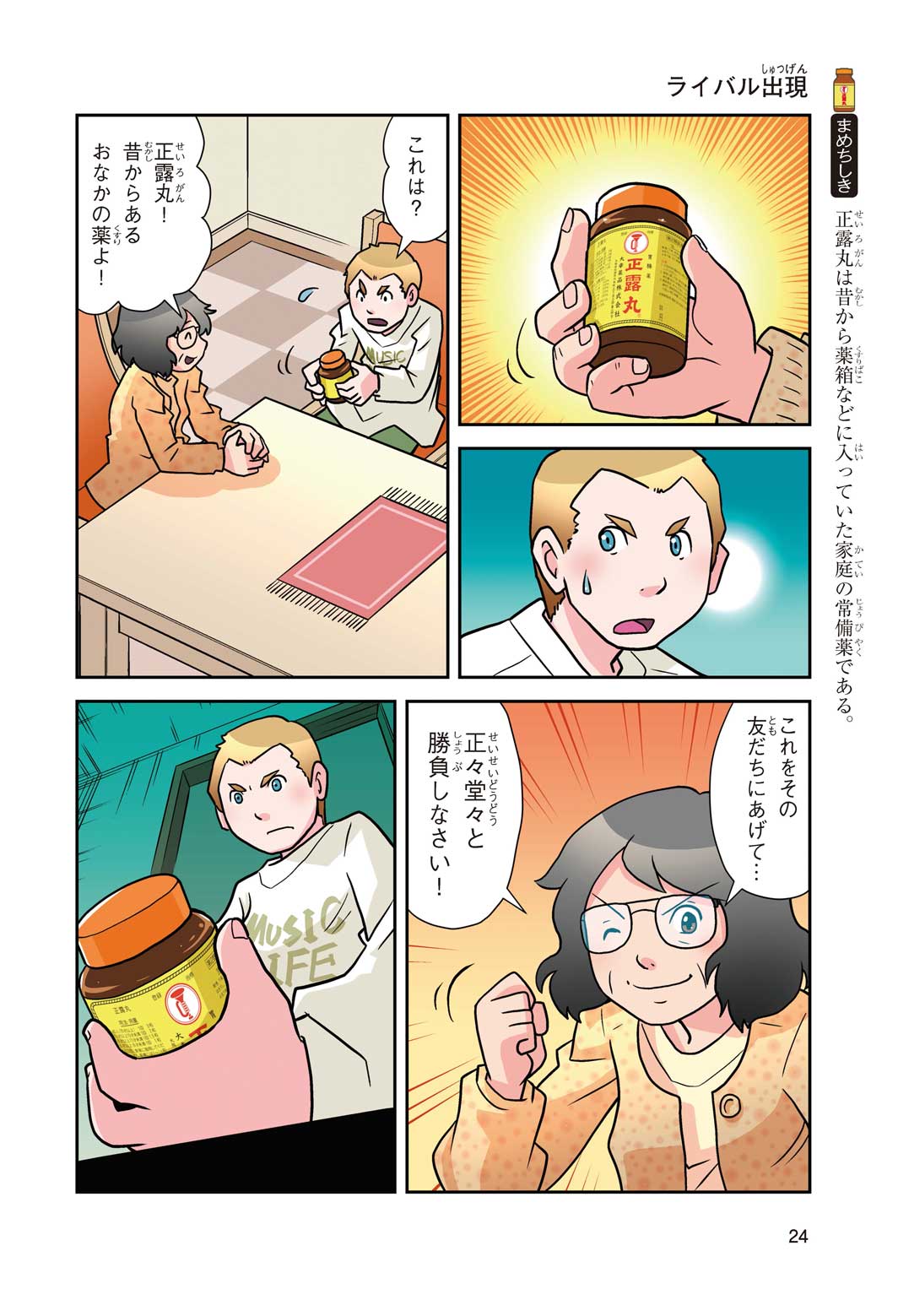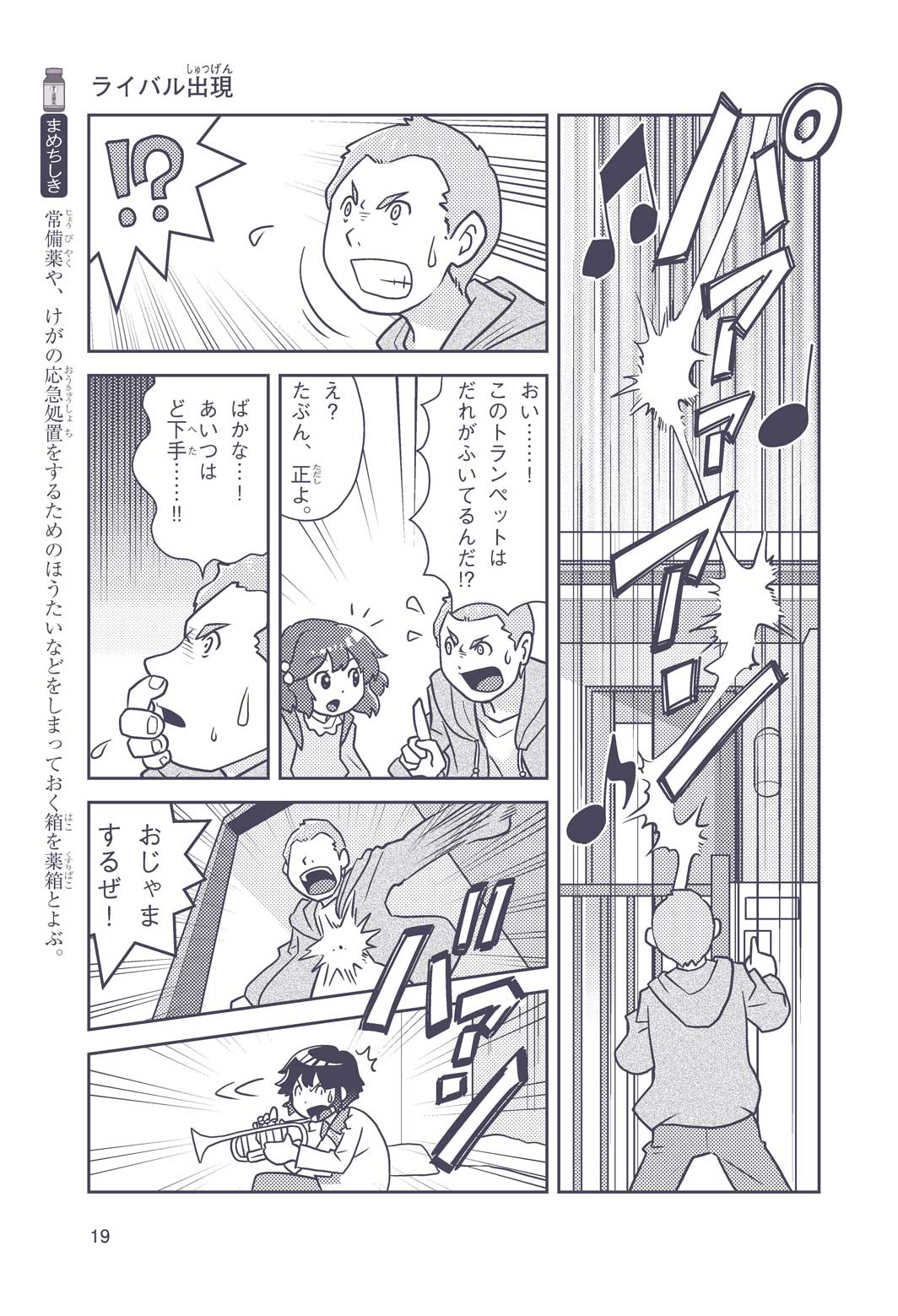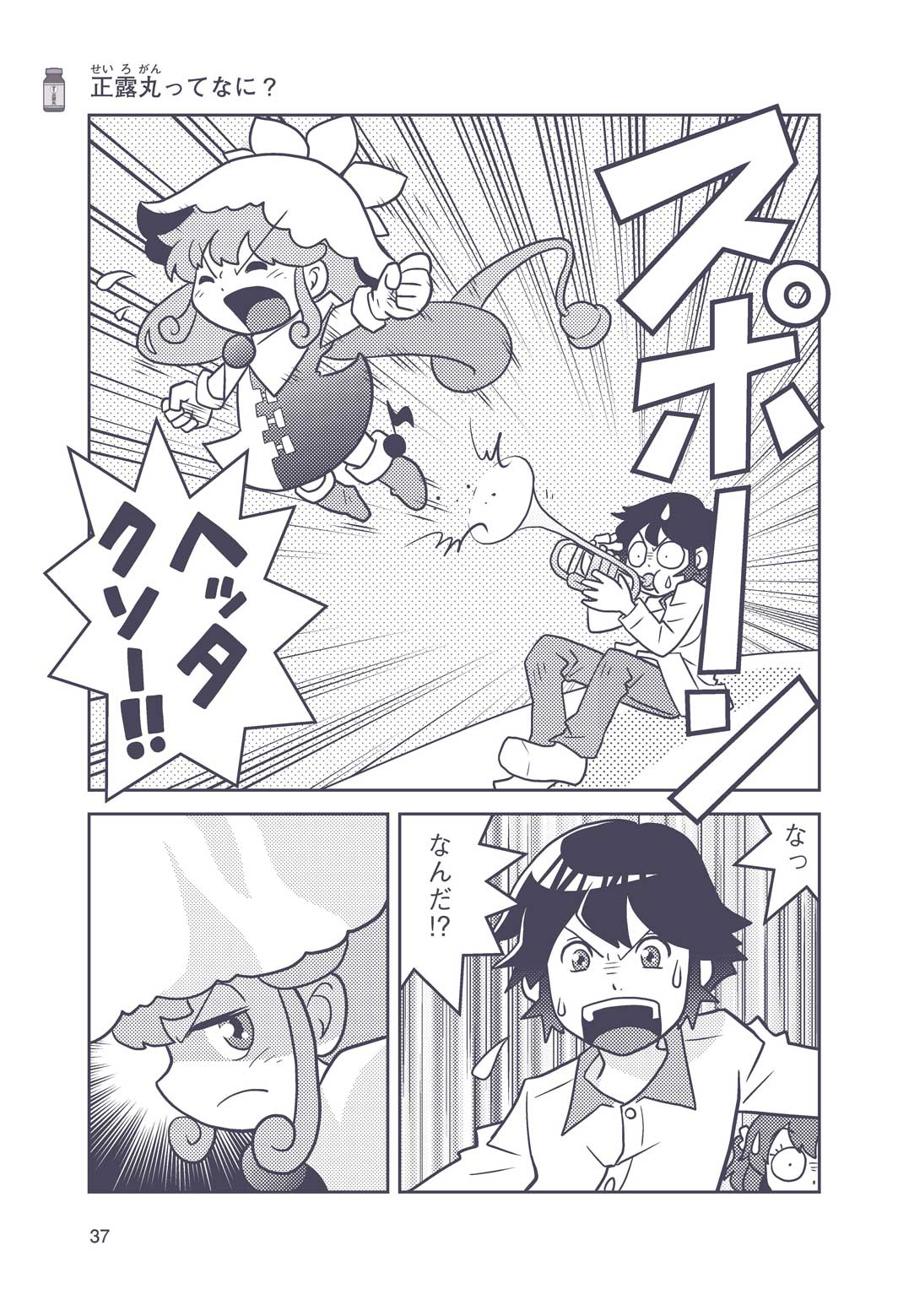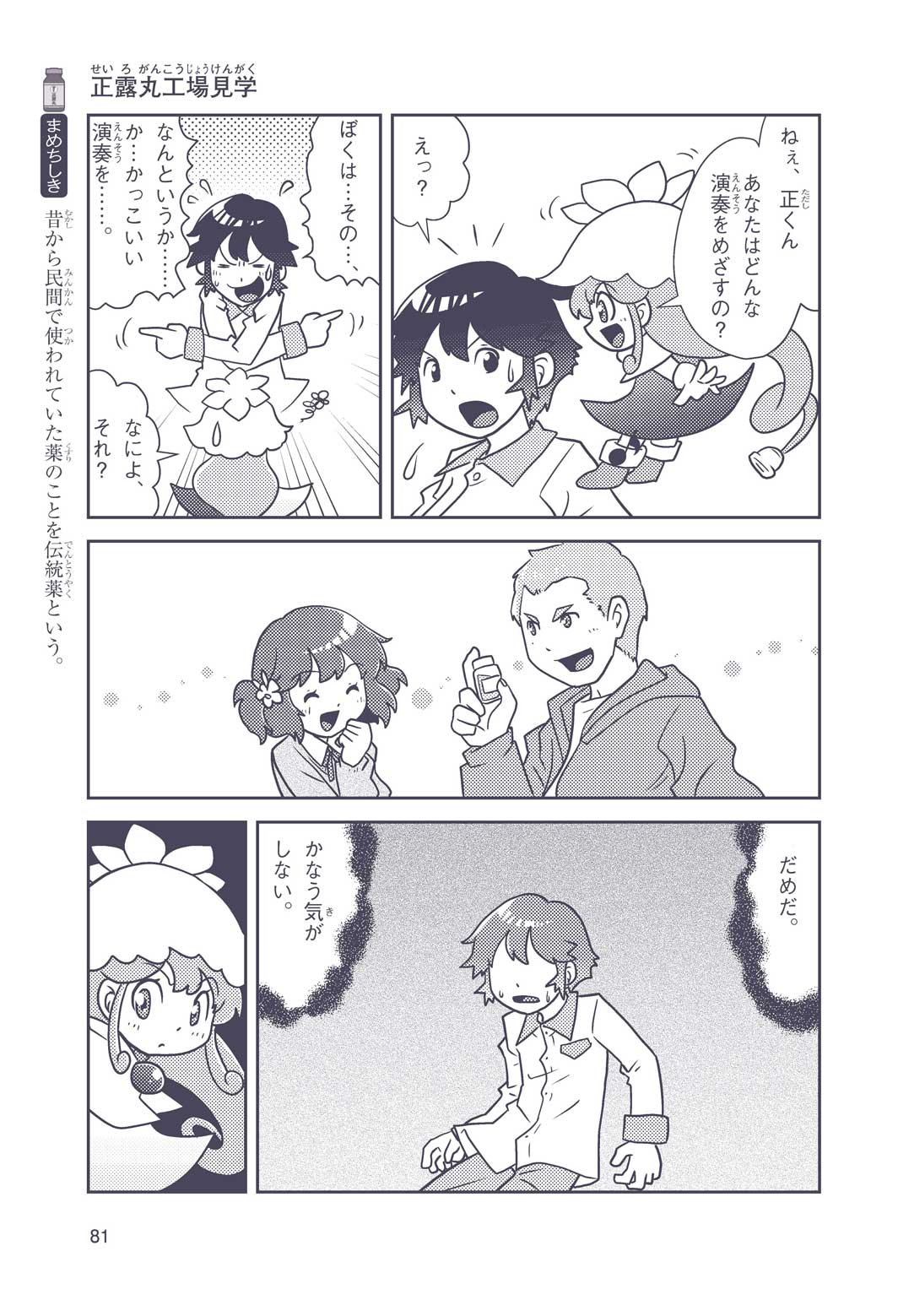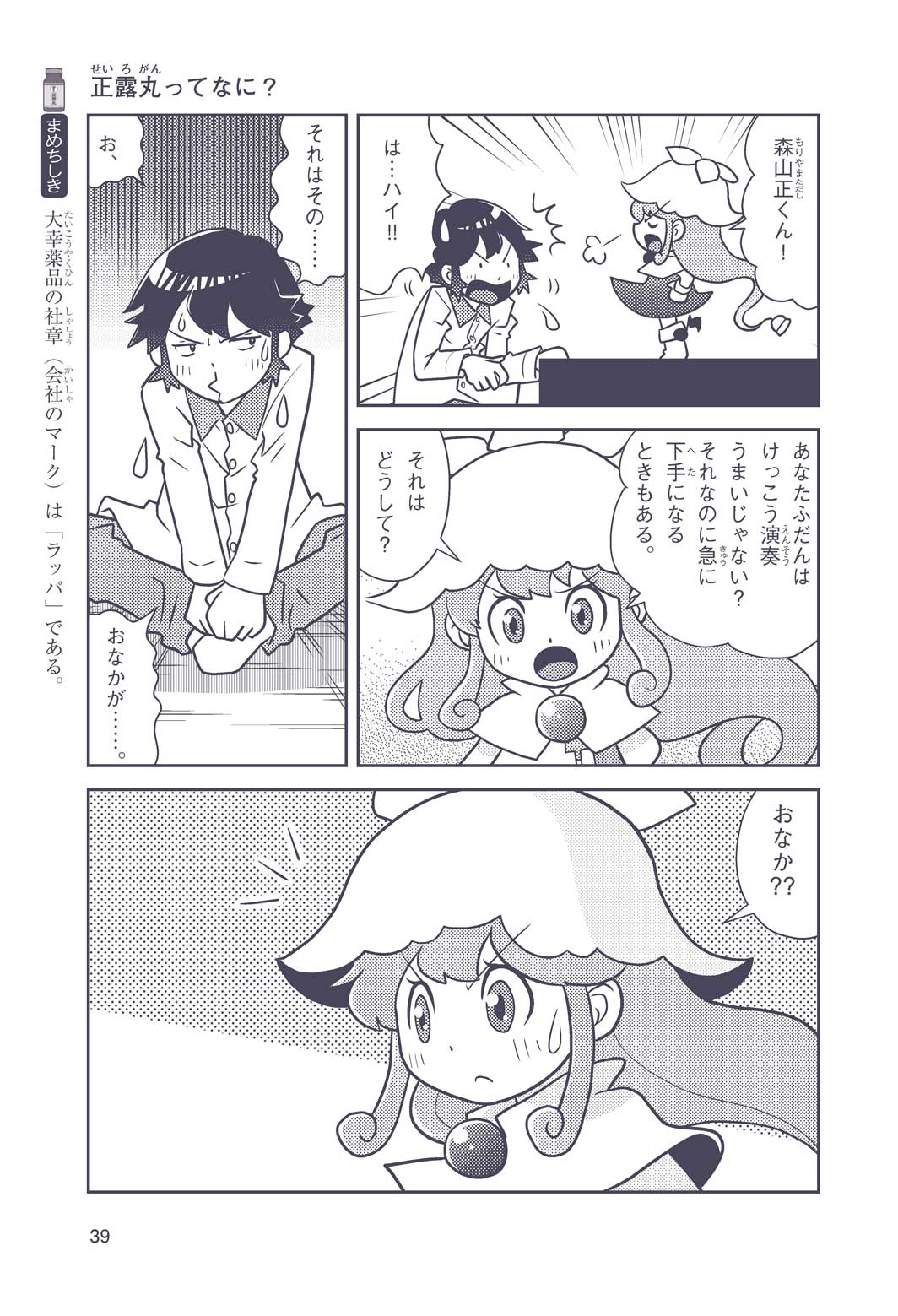 正はトランペットのソロ演奏者(えんそうしゃ)。きんちょうするとすぐおなかがいたくなっちゃって、本番では失敗ばかり。そんな時、トランペットの得意なユーリが転校してきて、さあ大変! 正はユーリと正々堂々戦うために、おなかの薬「正露丸(せいろがん)」を飲んだけれど…。正露丸って、どんな薬? いつから使われ始めたんだろう? 正はトランペットの精(せい)、セイろんといっしょに、時空をこえた旅に出る!