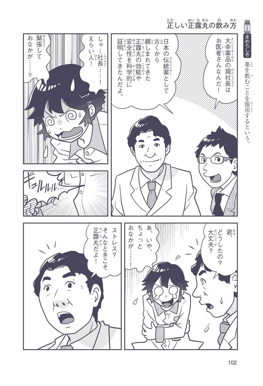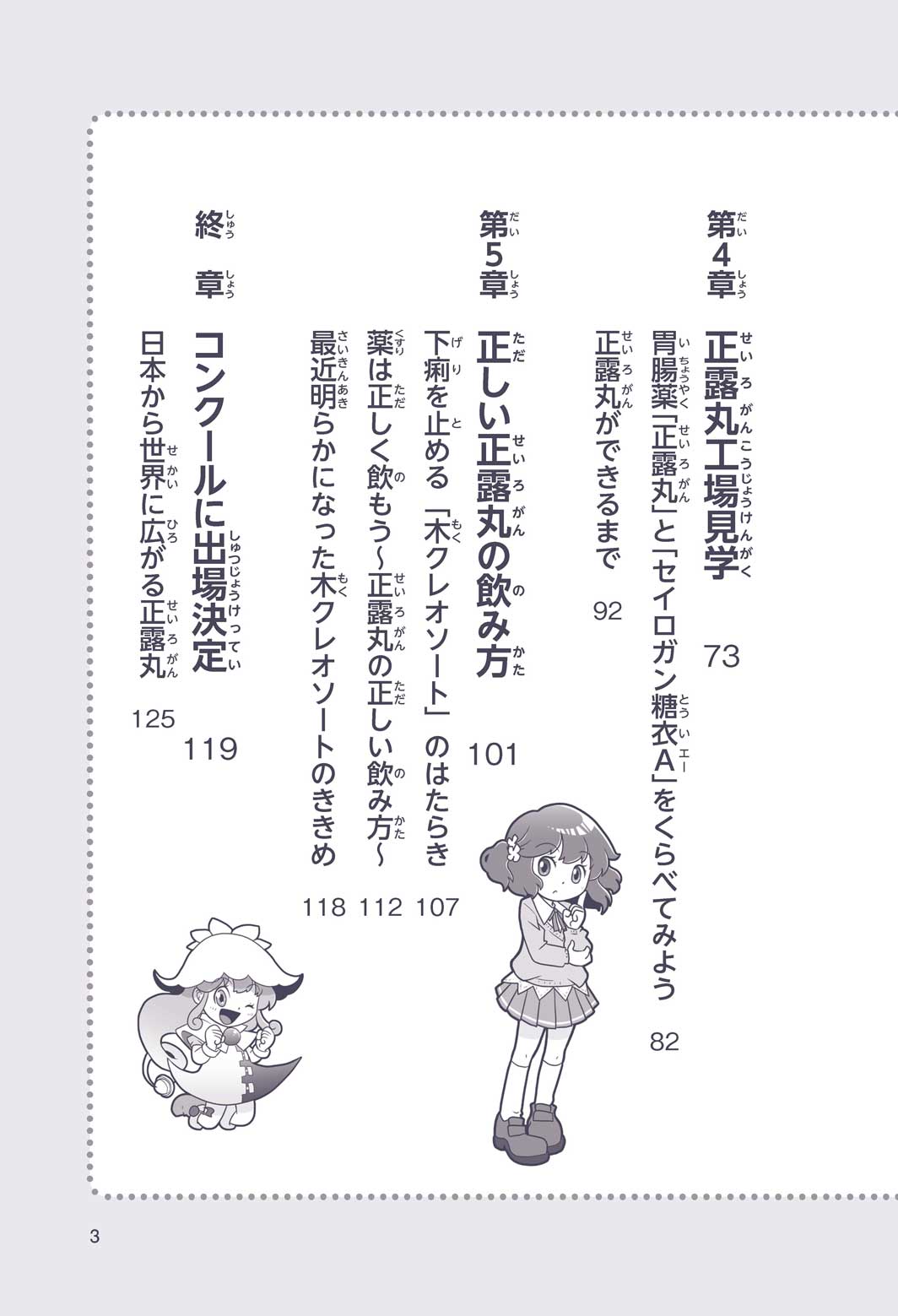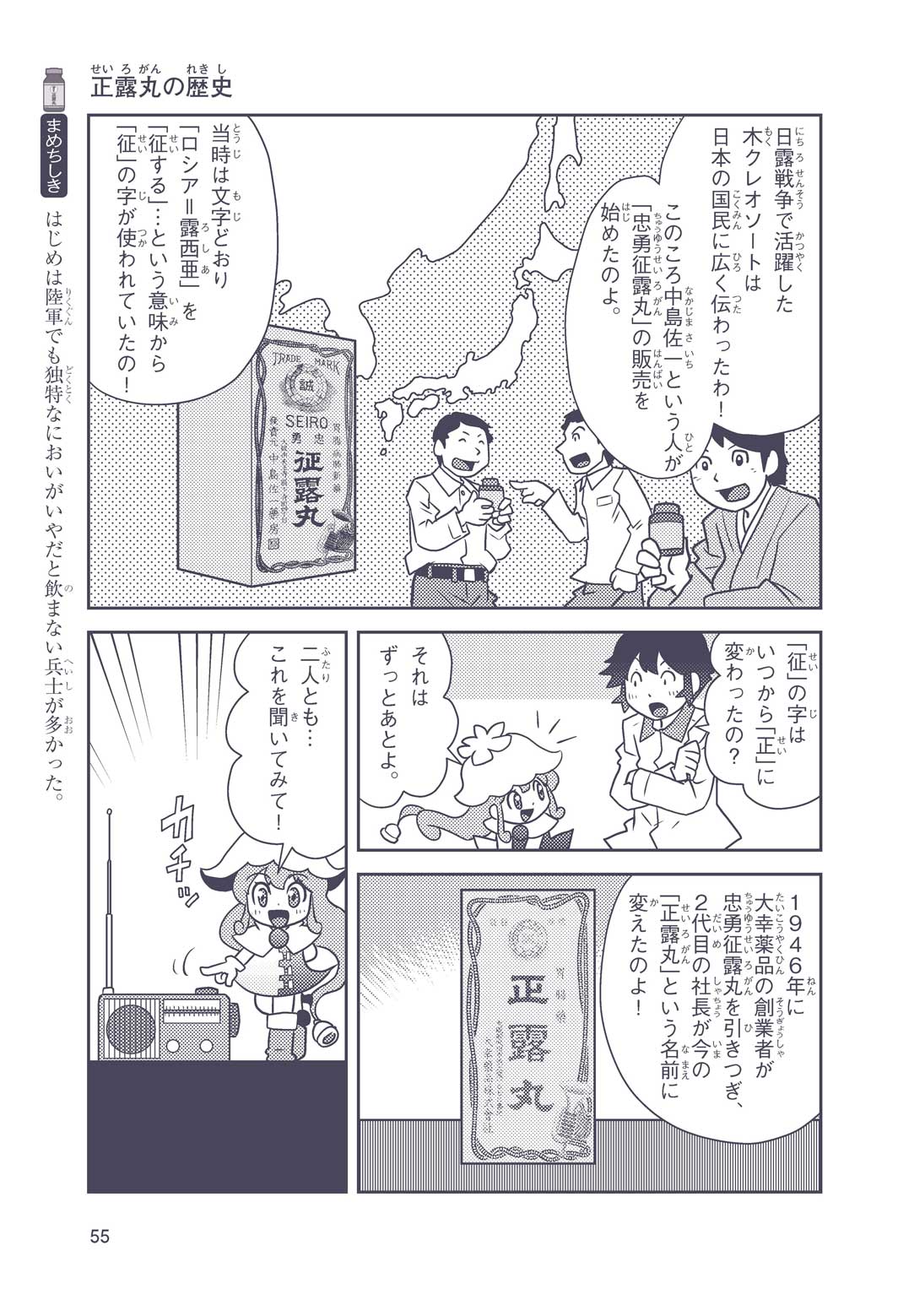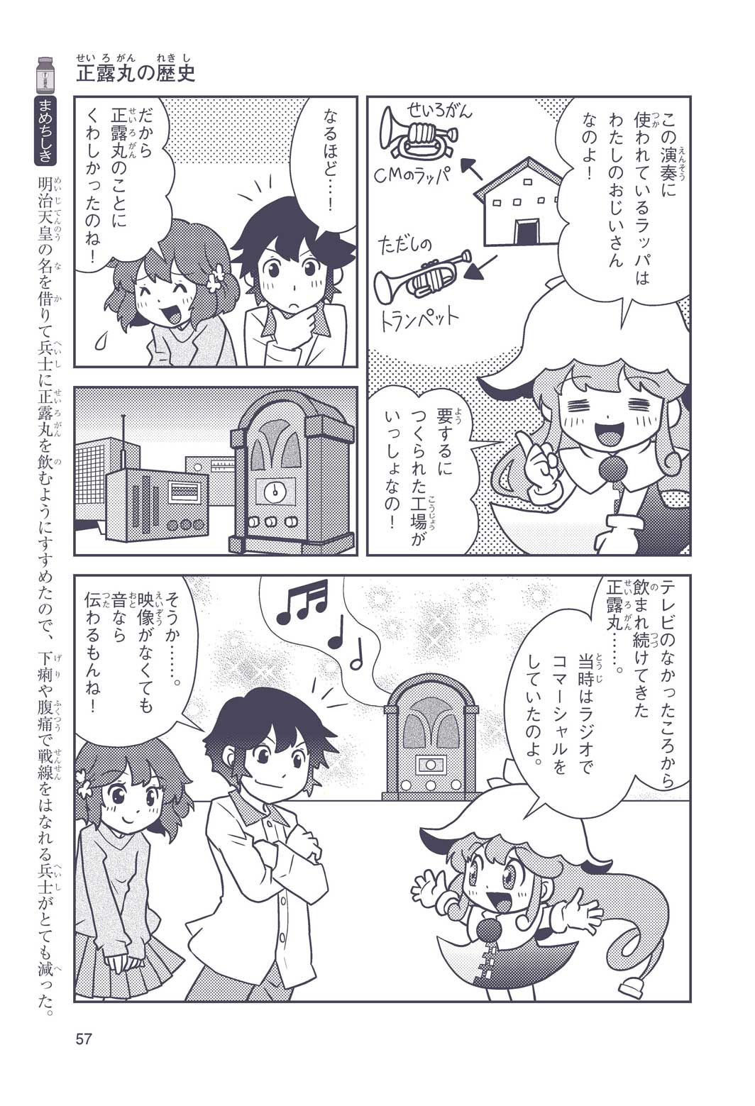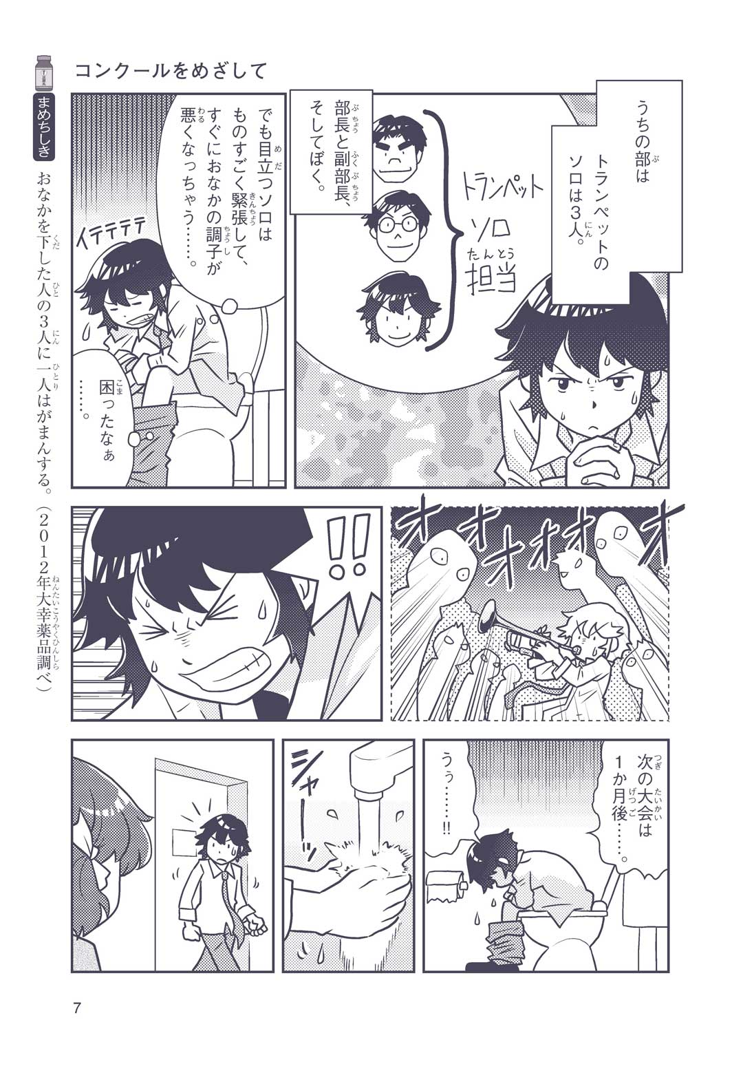 正はトランペットのソロ演奏者(えんそうしゃ)。きんちょうするとすぐおなかがいたくなっちゃって、本番では失敗ばかり。そんな時、トランペットの得意なユーリが転校してきて、さあ大変! 正はユーリと正々堂々戦うために、おなかの薬「正露丸(せいろがん)」を飲んだけれど…。正露丸って、どんな薬? いつから使われ始めたんだろう? 正はトランペットの精(せい)、セイろんといっしょに、時空をこえた旅に出る!