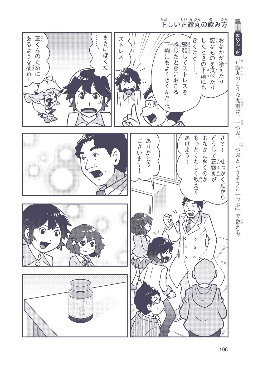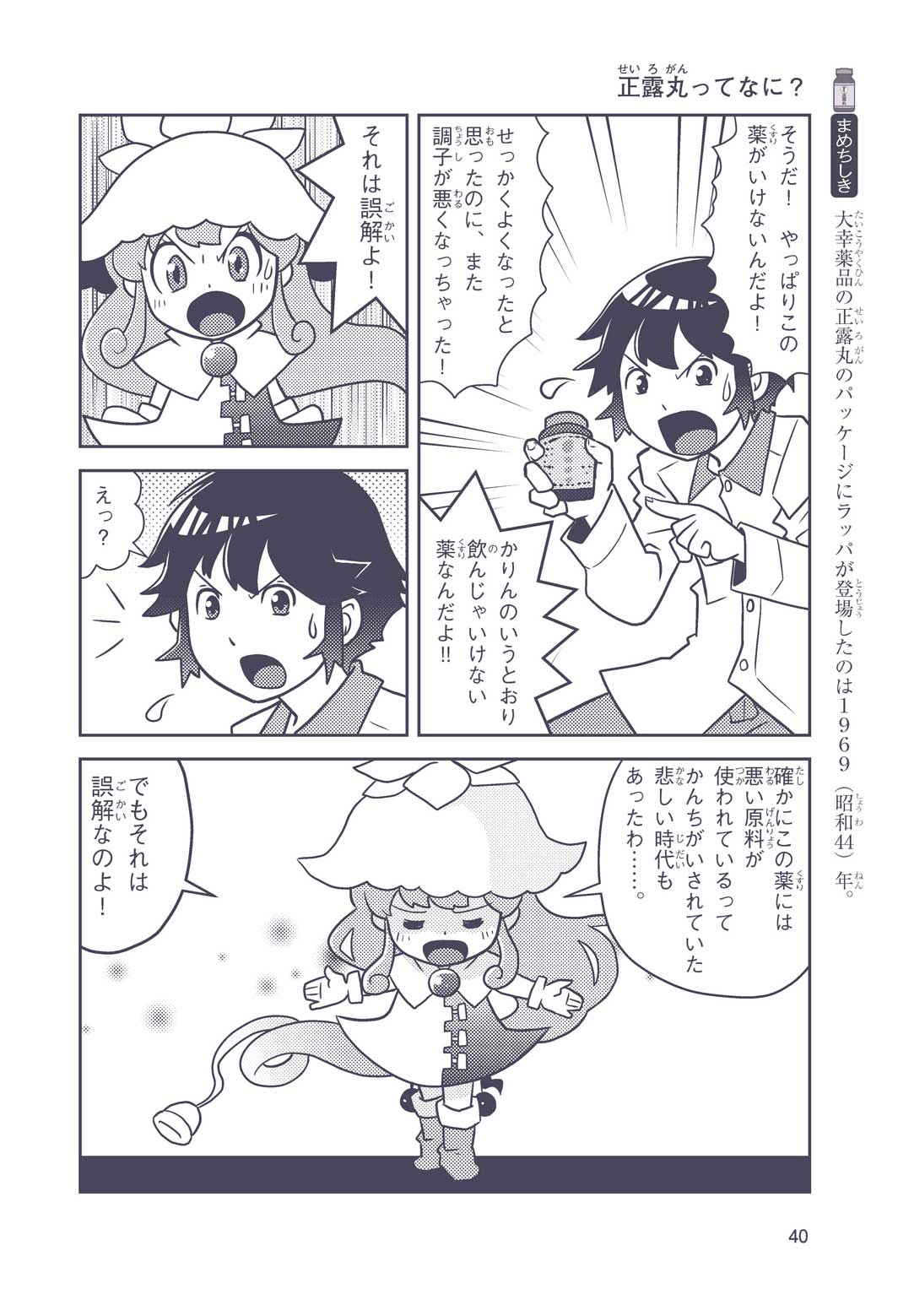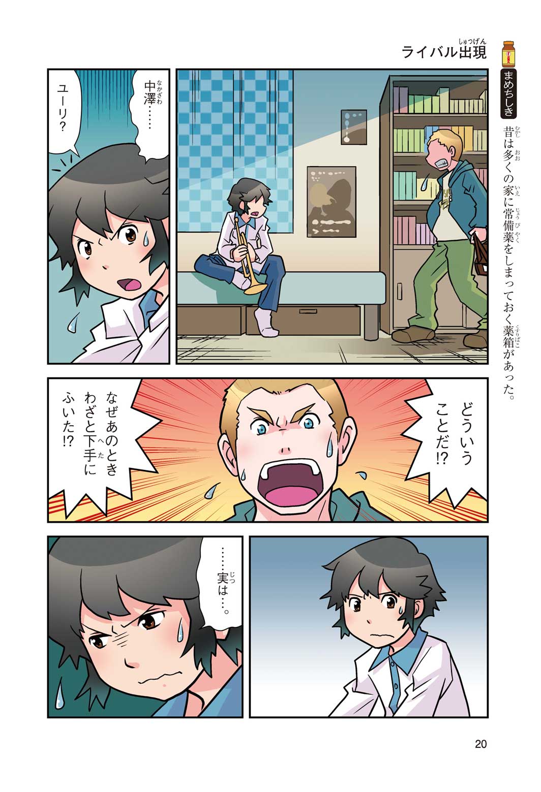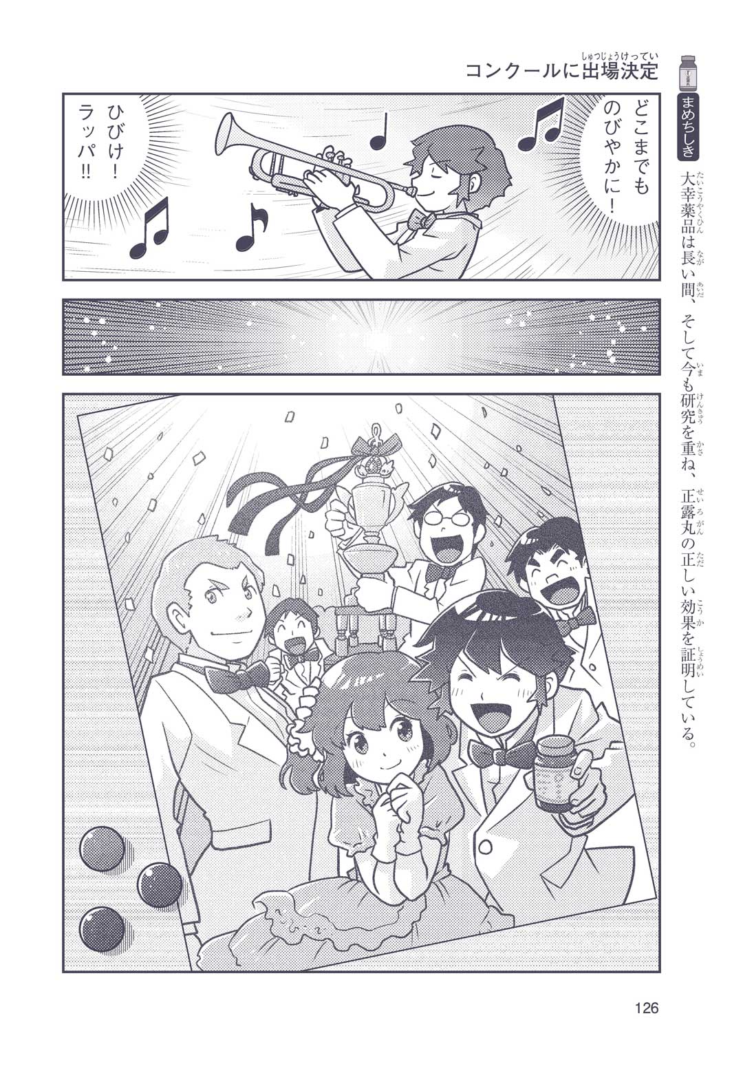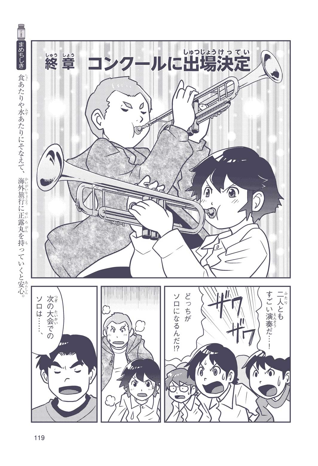 正はトランペットのソロ演奏者(えんそうしゃ)。きんちょうするとすぐおなかがいたくなっちゃって、本番では失敗ばかり。そんな時、トランペットの得意なユーリが転校してきて、さあ大変! 正はユーリと正々堂々戦うために、おなかの薬「正露丸(せいろがん)」を飲んだけれど…。正露丸って、どんな薬? いつから使われ始めたんだろう? 正はトランペットの精(せい)、セイろんといっしょに、時空をこえた旅に出る!
