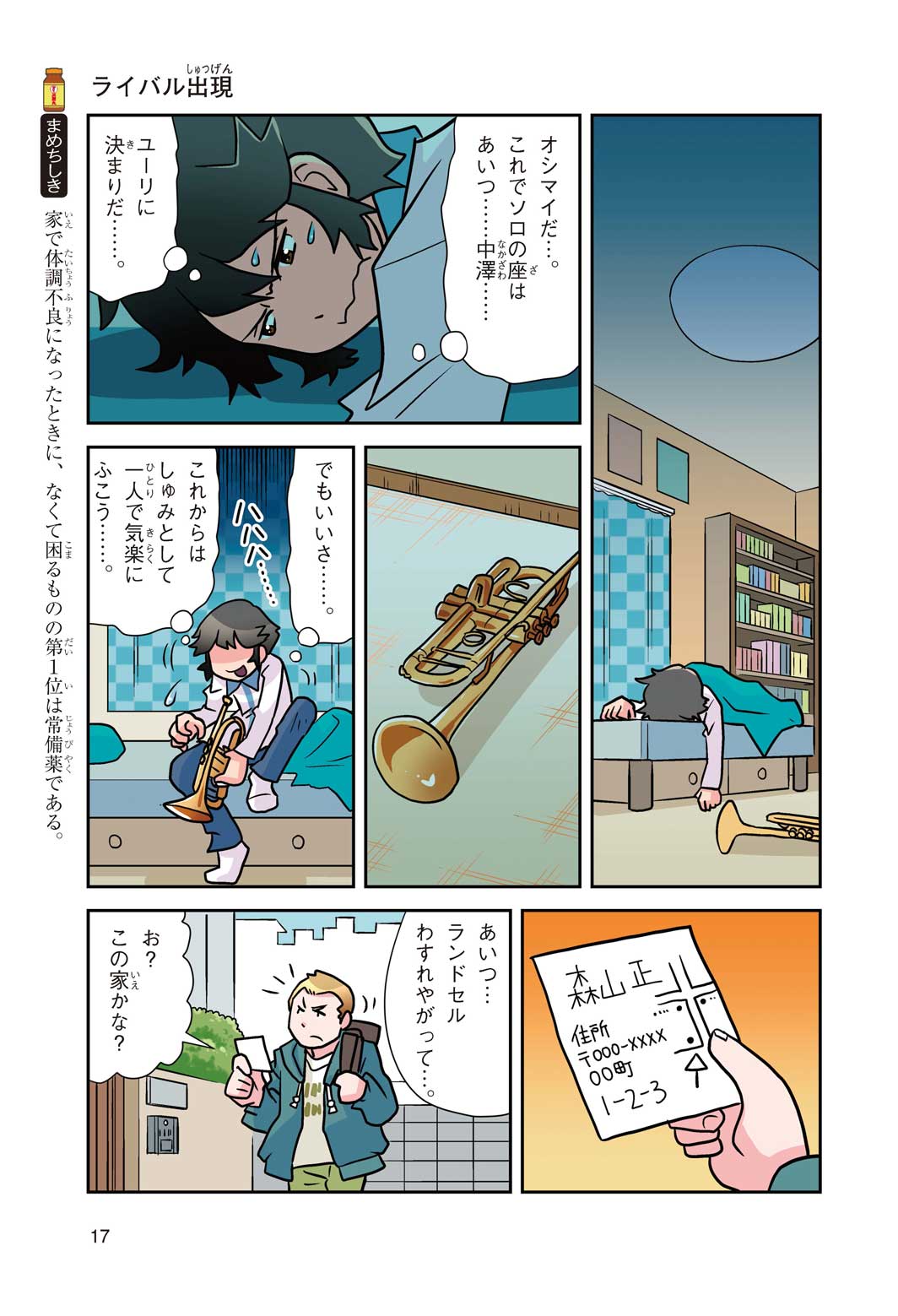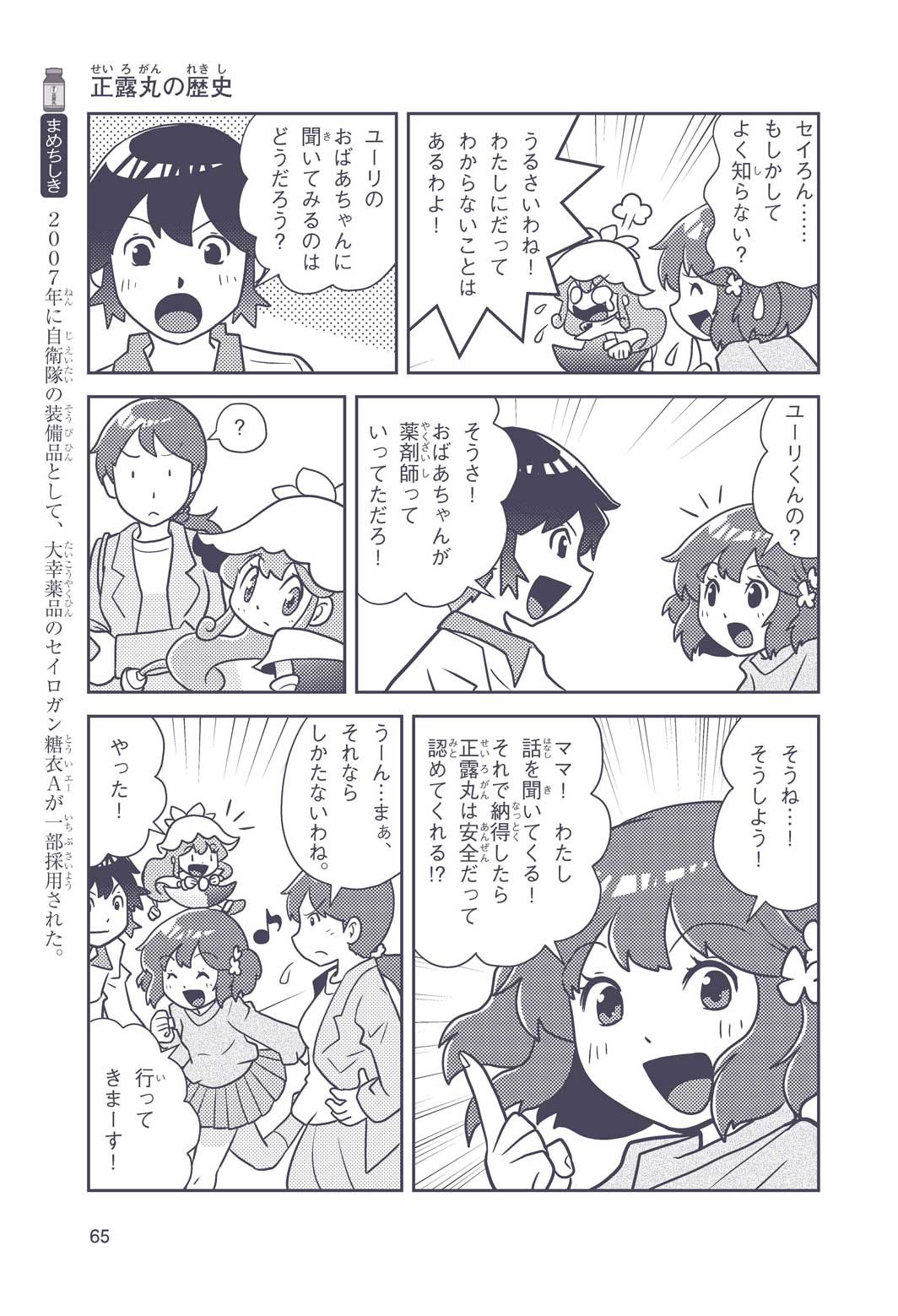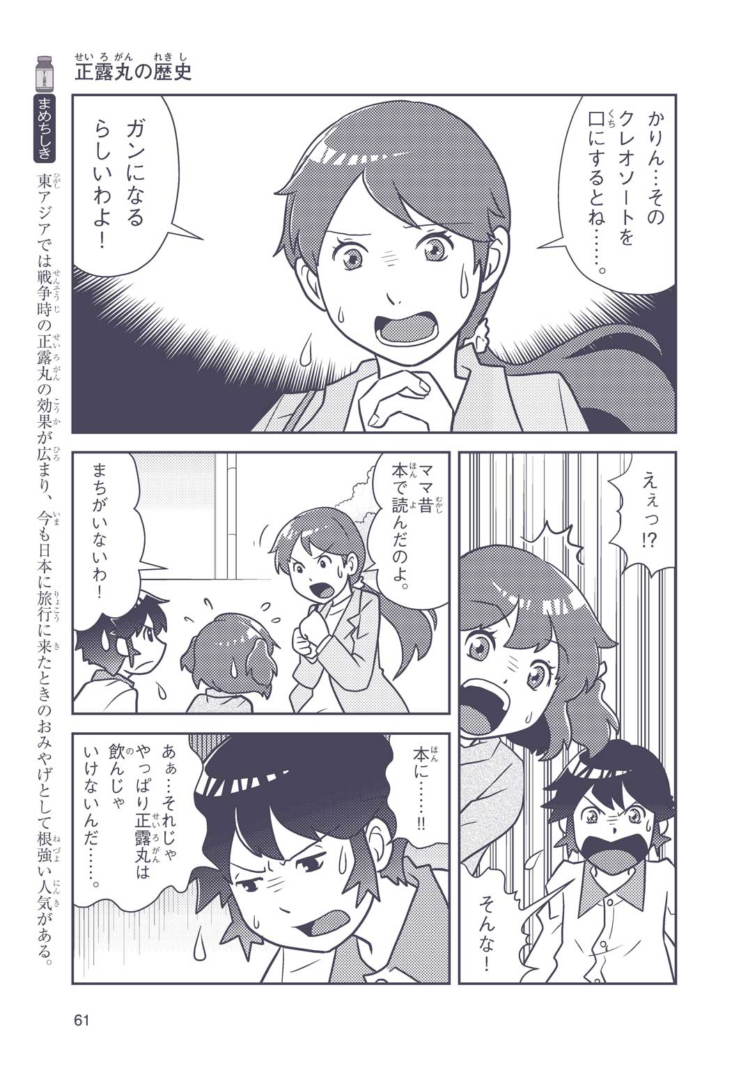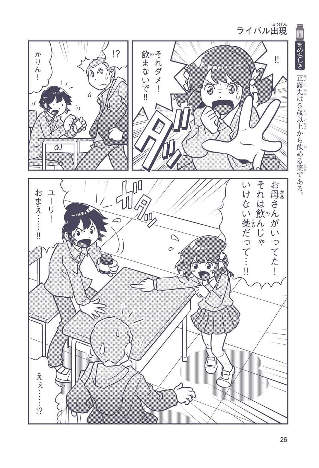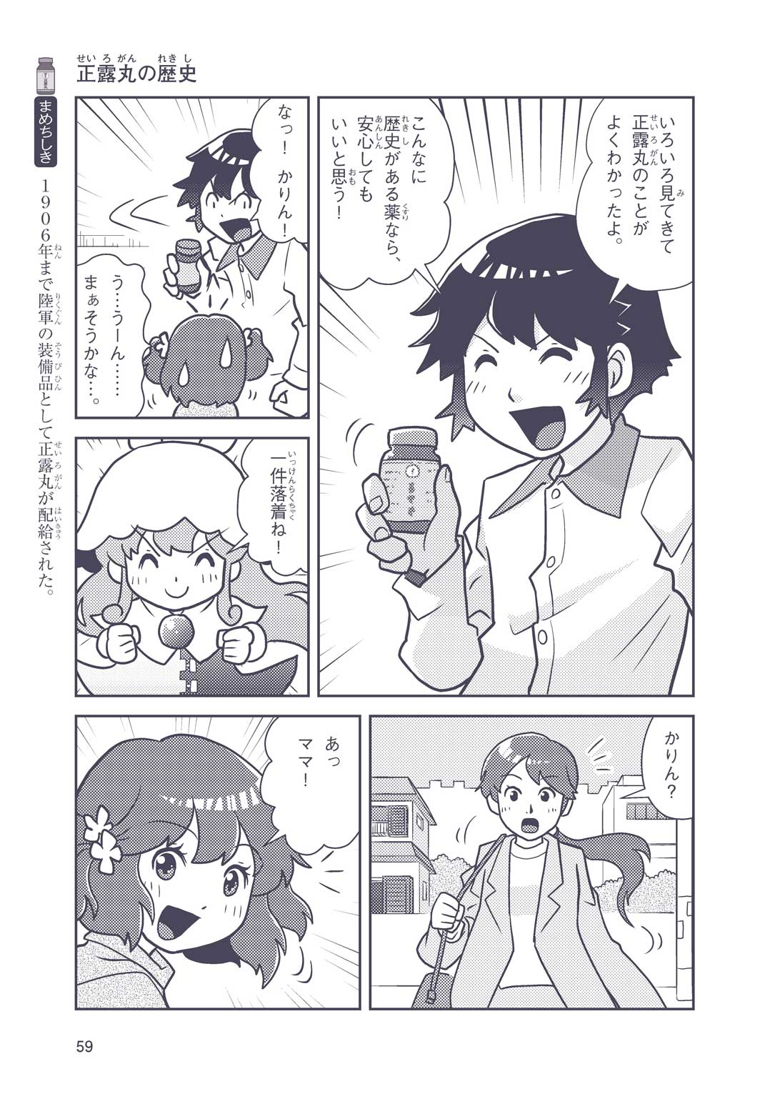 正はトランペットのソロ演奏者(えんそうしゃ)。きんちょうするとすぐおなかがいたくなっちゃって、本番では失敗ばかり。そんな時、トランペットの得意なユーリが転校してきて、さあ大変! 正はユーリと正々堂々戦うために、おなかの薬「正露丸(せいろがん)」を飲んだけれど…。正露丸って、どんな薬? いつから使われ始めたんだろう? 正はトランペットの精(せい)、セイろんといっしょに、時空をこえた旅に出る!
