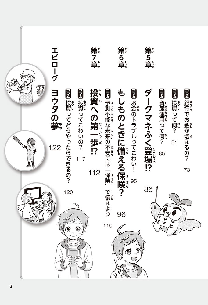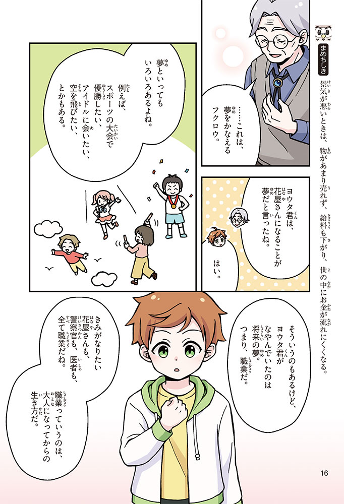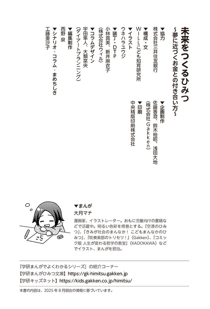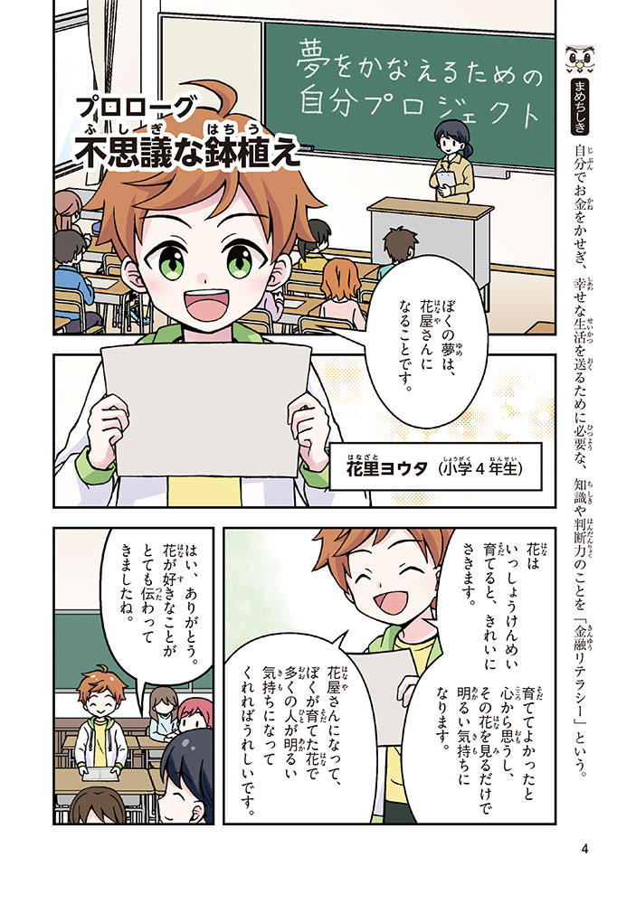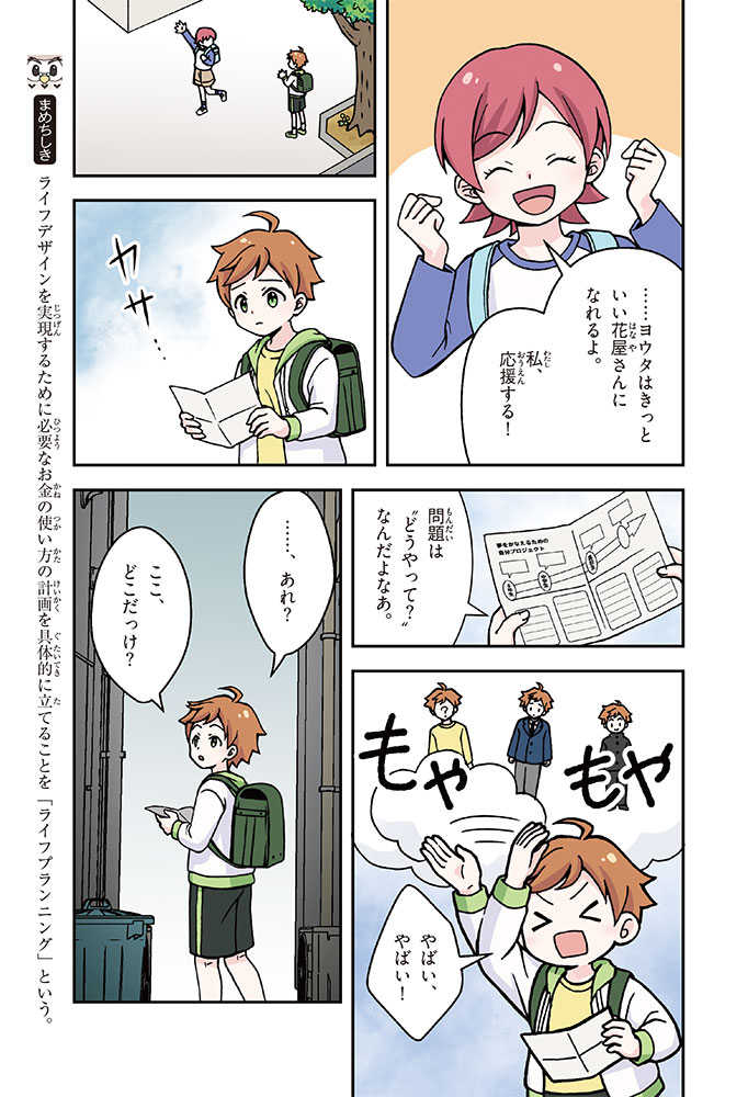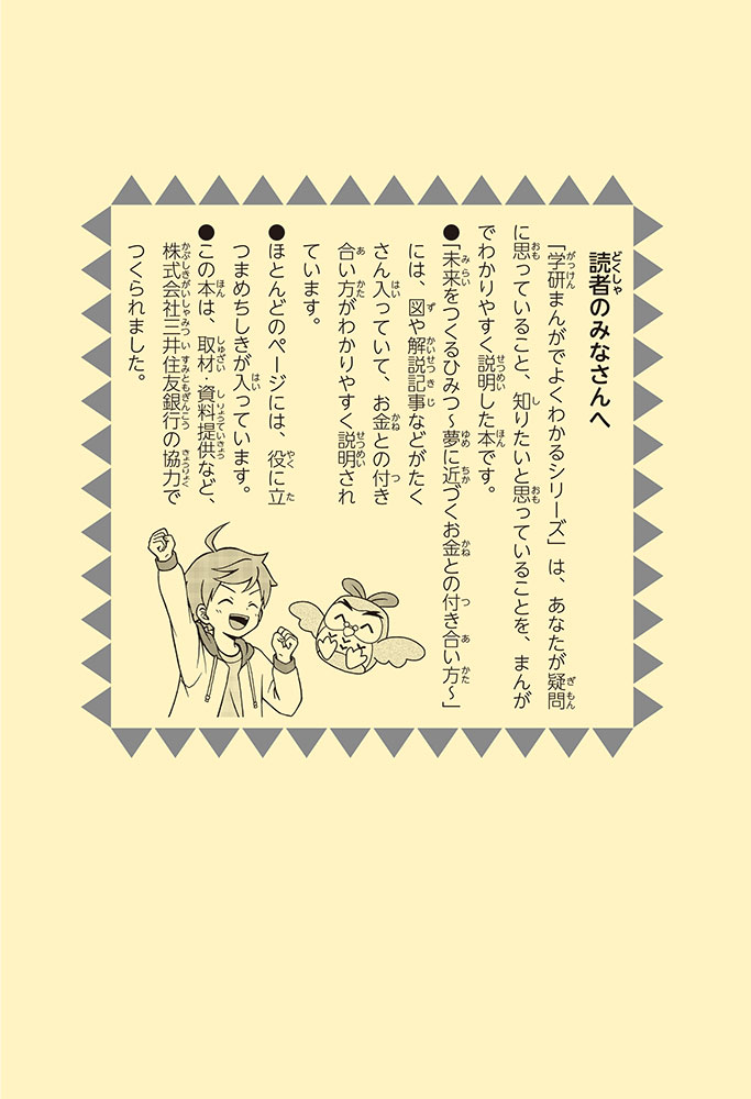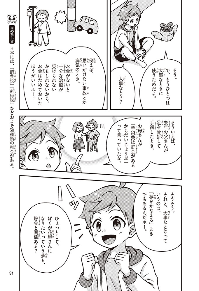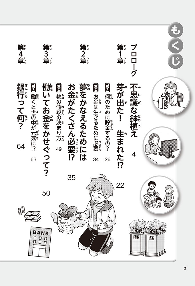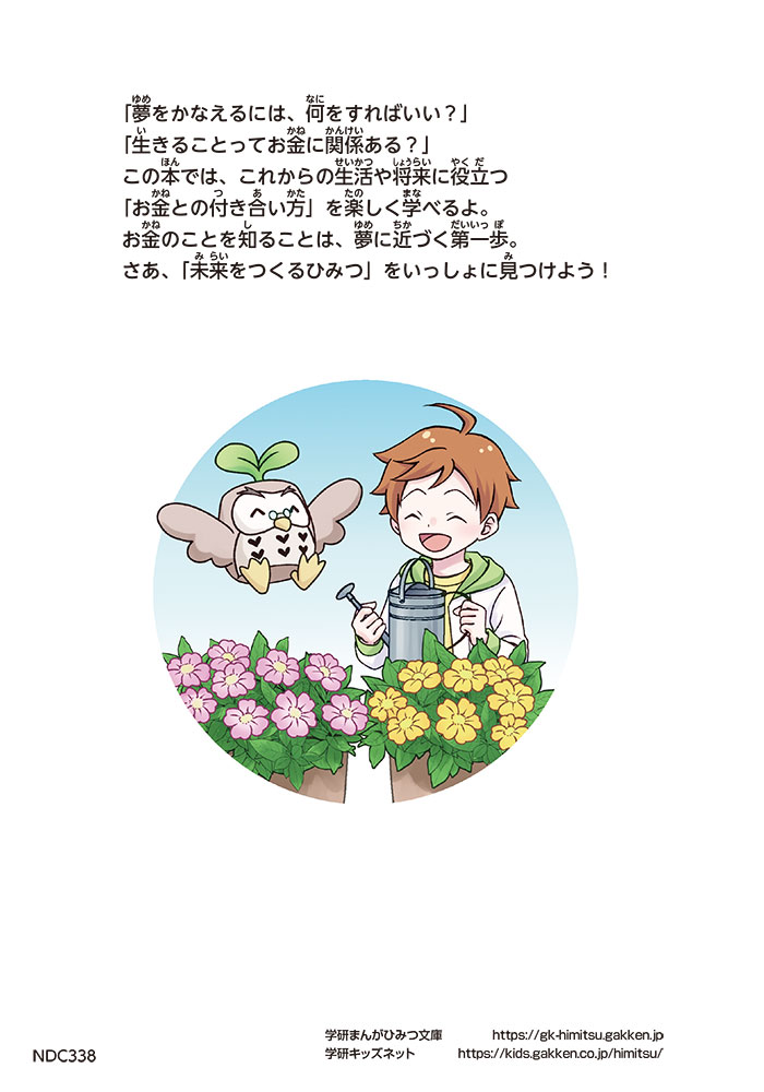きみの将来の夢は何かな? なりたいもの、やりたいことがありすぎてまよっちゃう? 夢はあるけれど、かなえるために何をすればいいのかわからなくて不安に思っているかもしれないね。この本では「花屋になりたい」という夢をもつヨウタが、お金にくわしい貯金箱の「マネふく」とであって「お金との付き合い方」を楽しく学んでいくよ。お金のことを知ることは、夢に近づく第一歩。さあ、「未来をつくるひみつ」をいっしょに見つけよう!