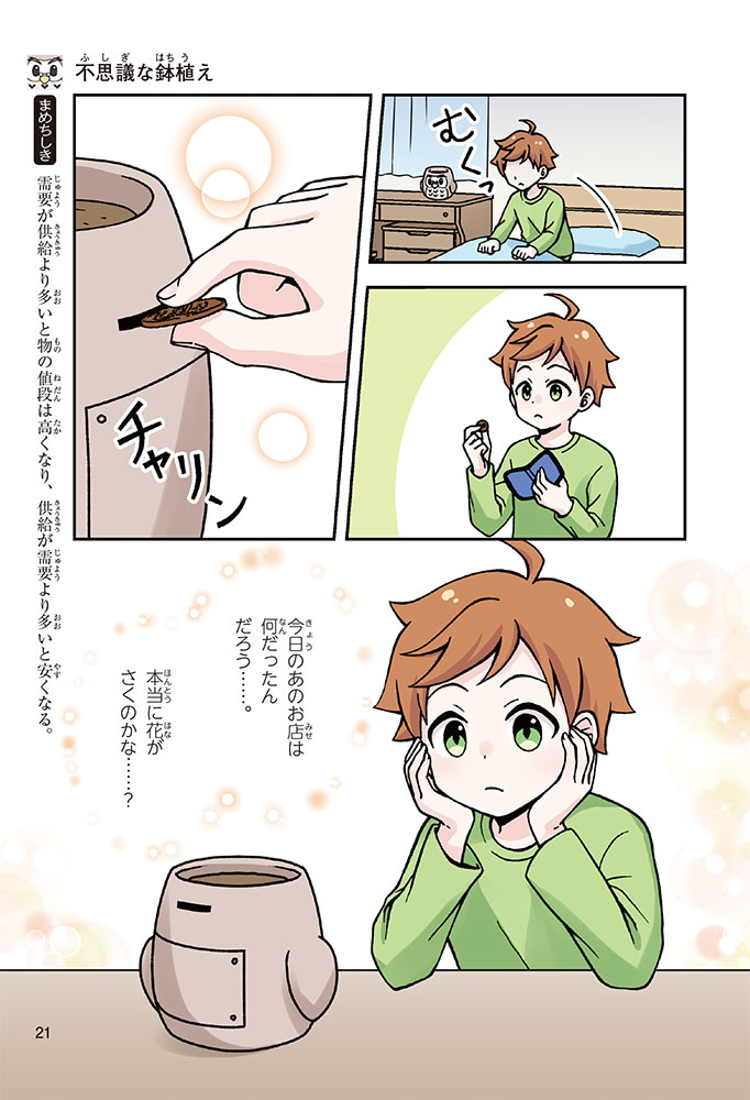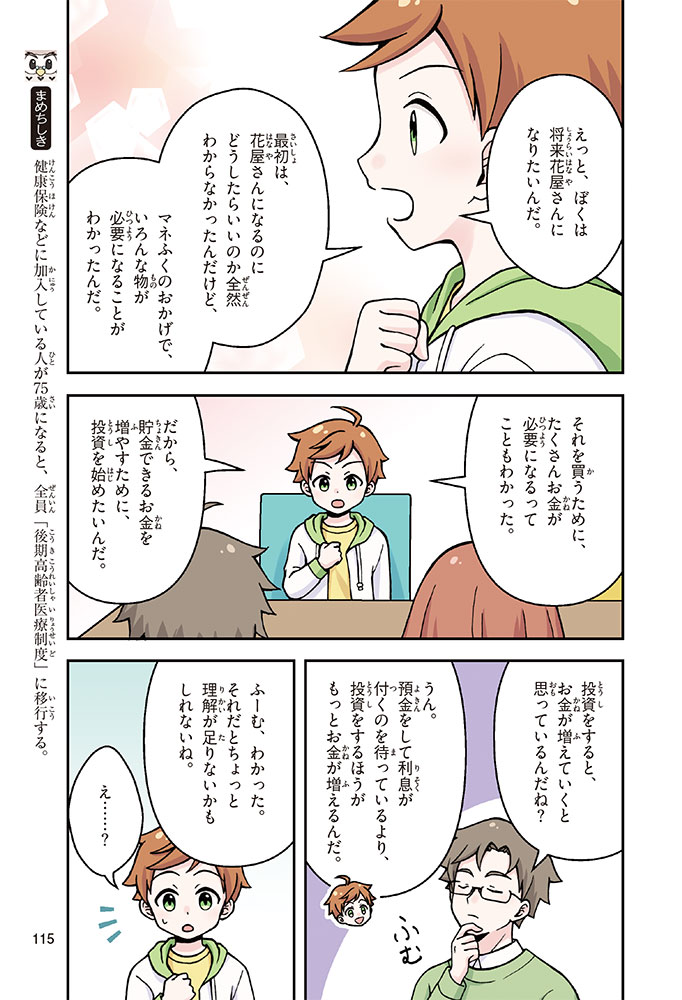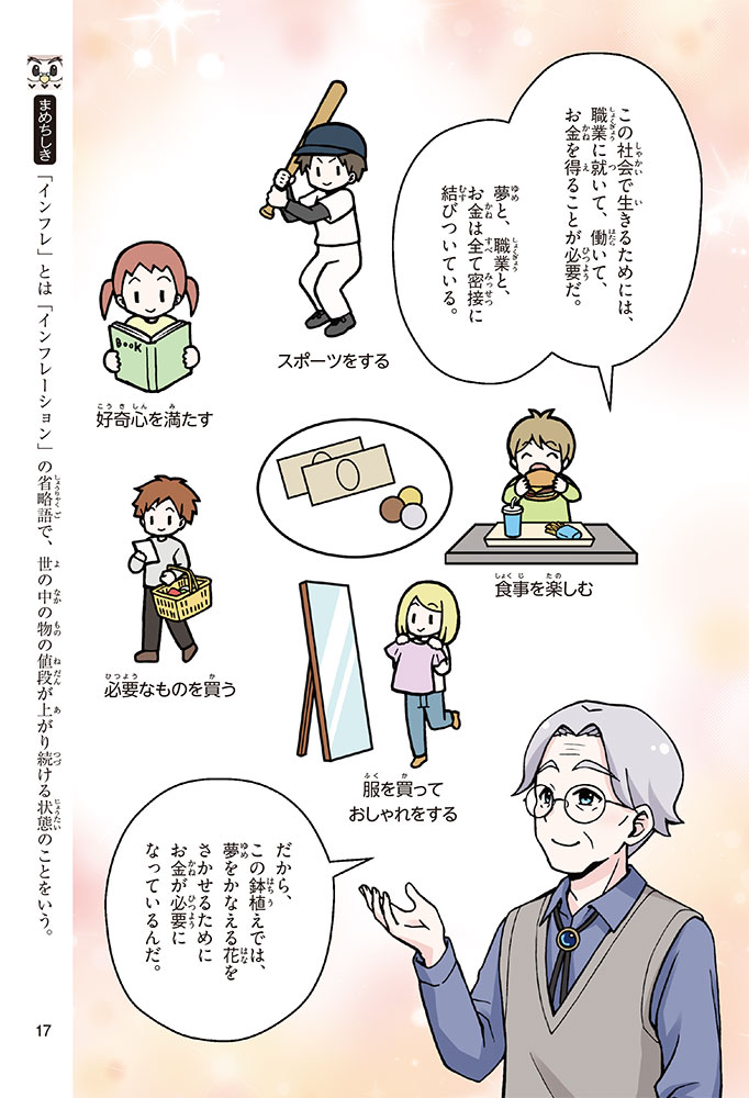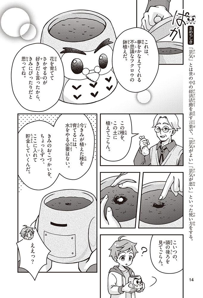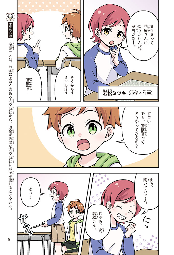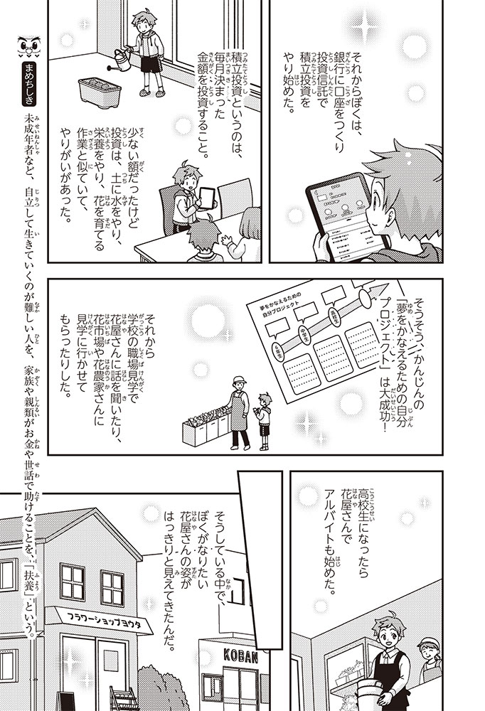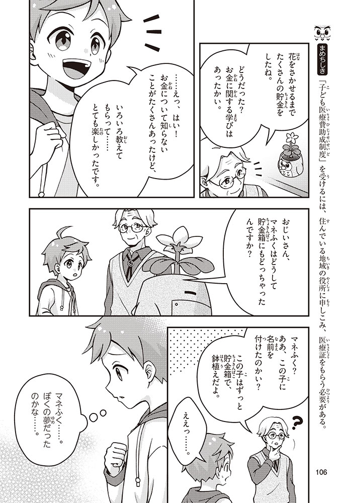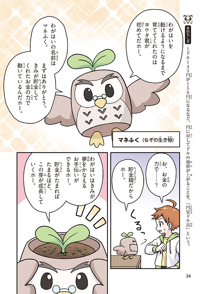 きみの将来の夢は何かな? なりたいもの、やりたいことがありすぎてまよっちゃう? 夢はあるけれど、かなえるために何をすればいいのかわからなくて不安に思っているかもしれないね。この本では「花屋になりたい」という夢をもつヨウタが、お金にくわしい貯金箱の「マネふく」とであって「お金との付き合い方」を楽しく学んでいくよ。お金のことを知ることは、夢に近づく第一歩。さあ、「未来をつくるひみつ」をいっしょに見つけよう!