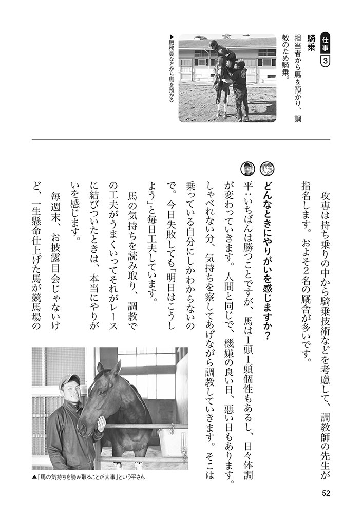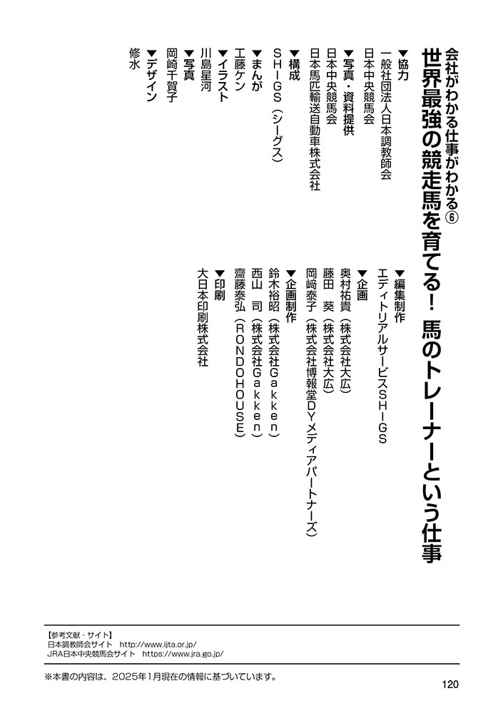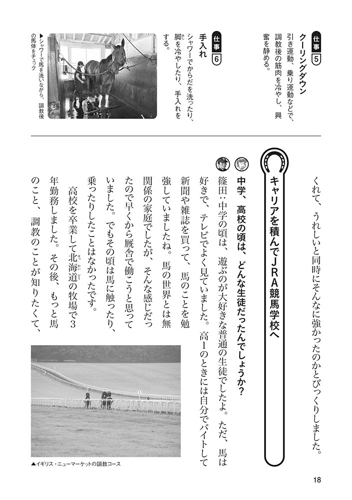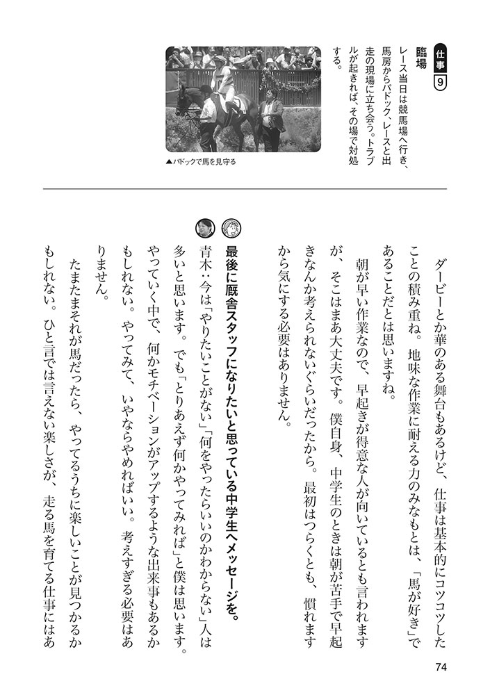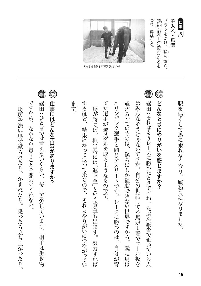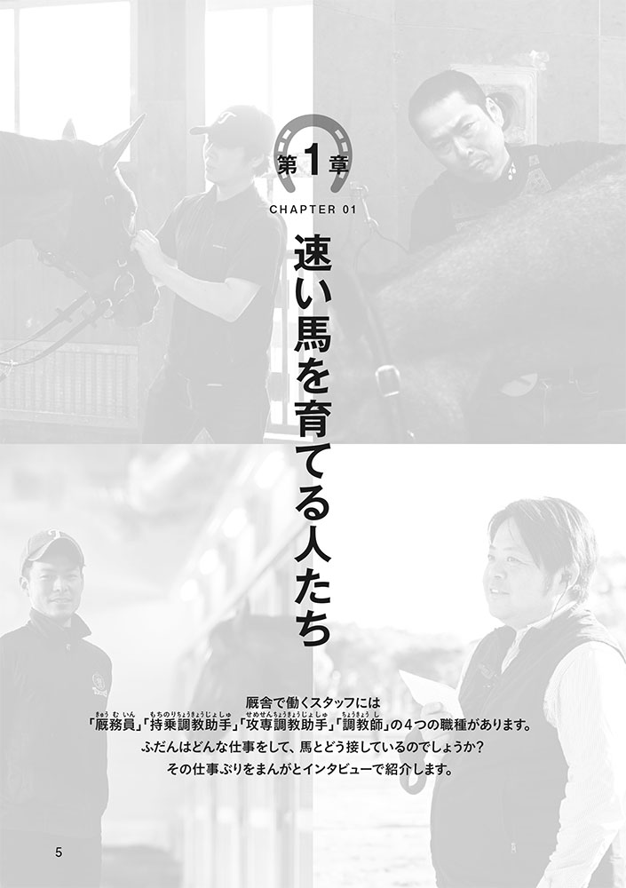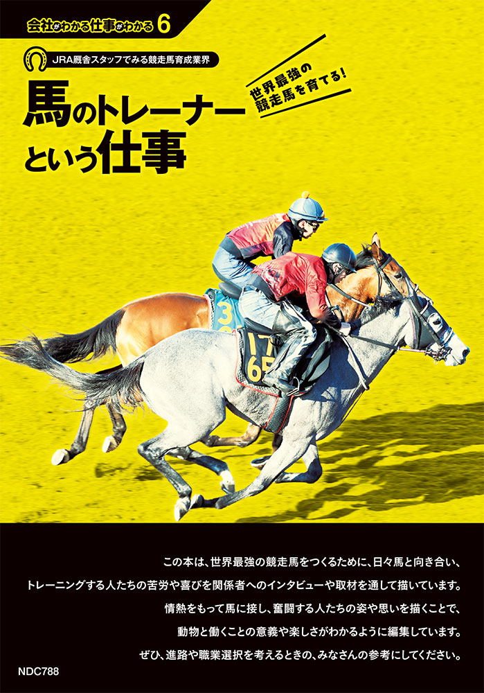 この本は、世界最強の競走馬をつくるために、日々馬と向き合い、トレーニングする人たちの苦労や喜びを関係者へのインタビューや取材を通して描いています。情熱をもって馬に接し、奮闘する人たちの姿や思いを描くことで、動物と働くことの意義や楽しさがわかるように編集しています。ぜひ、進路や職業選択を考えるときの、みなさんの参考にしてください。
