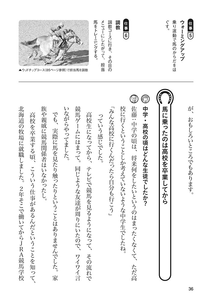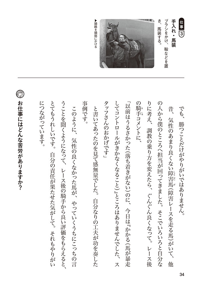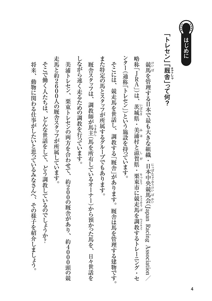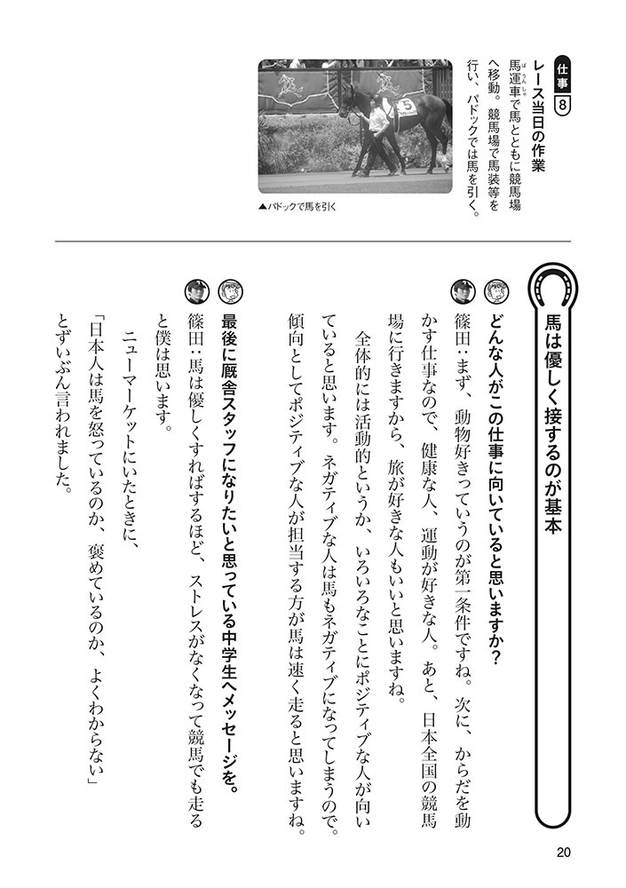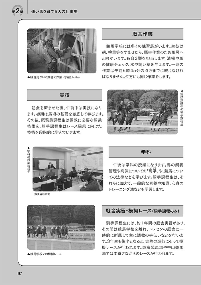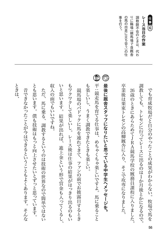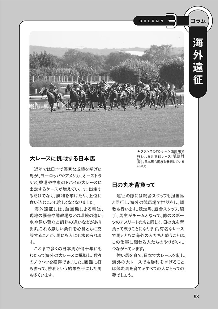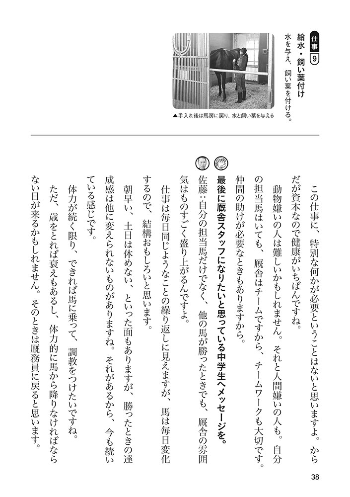 この本は、世界最強の競走馬をつくるために、日々馬と向き合い、トレーニングする人たちの苦労や喜びを関係者へのインタビューや取材を通して描いています。情熱をもって馬に接し、奮闘する人たちの姿や思いを描くことで、動物と働くことの意義や楽しさがわかるように編集しています。ぜひ、進路や職業選択を考えるときの、みなさんの参考にしてください。