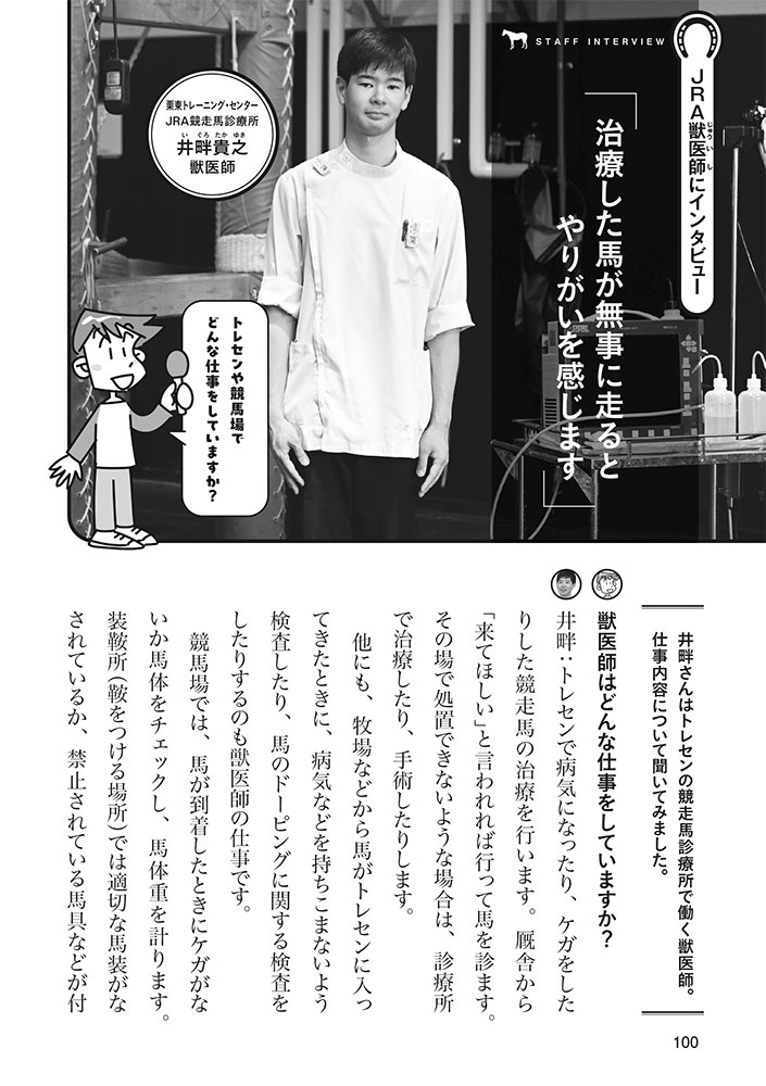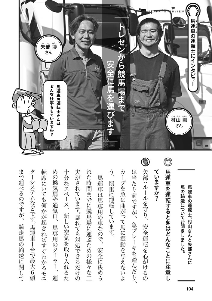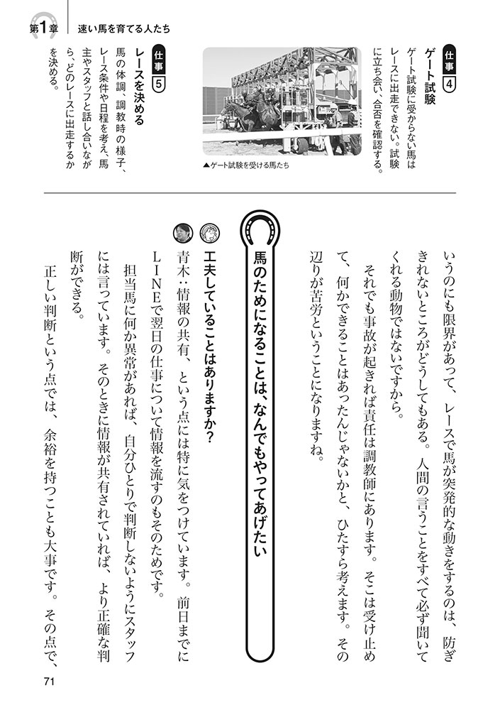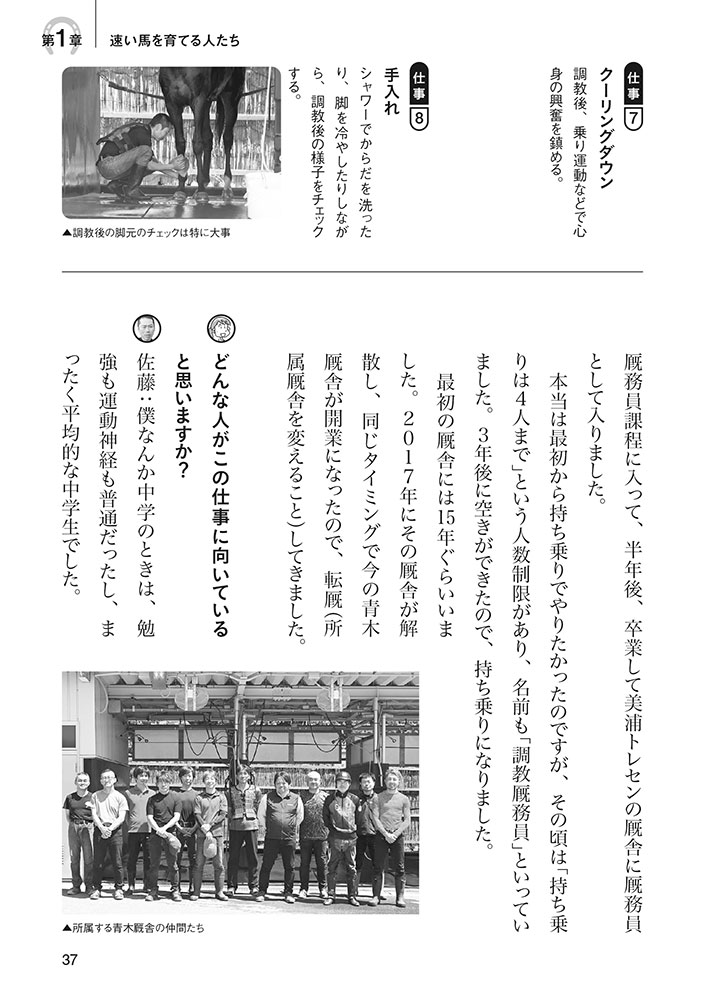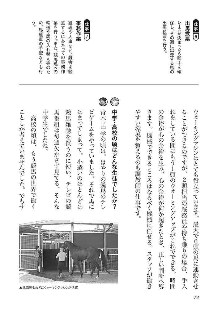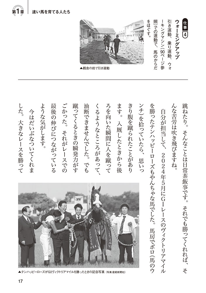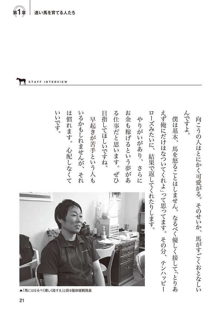 この本は、世界最強の競走馬をつくるために、日々馬と向き合い、トレーニングする人たちの苦労や喜びを関係者へのインタビューや取材を通して描いています。情熱をもって馬に接し、奮闘する人たちの姿や思いを描くことで、動物と働くことの意義や楽しさがわかるように編集しています。ぜひ、進路や職業選択を考えるときの、みなさんの参考にしてください。