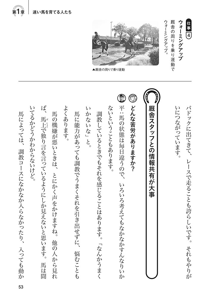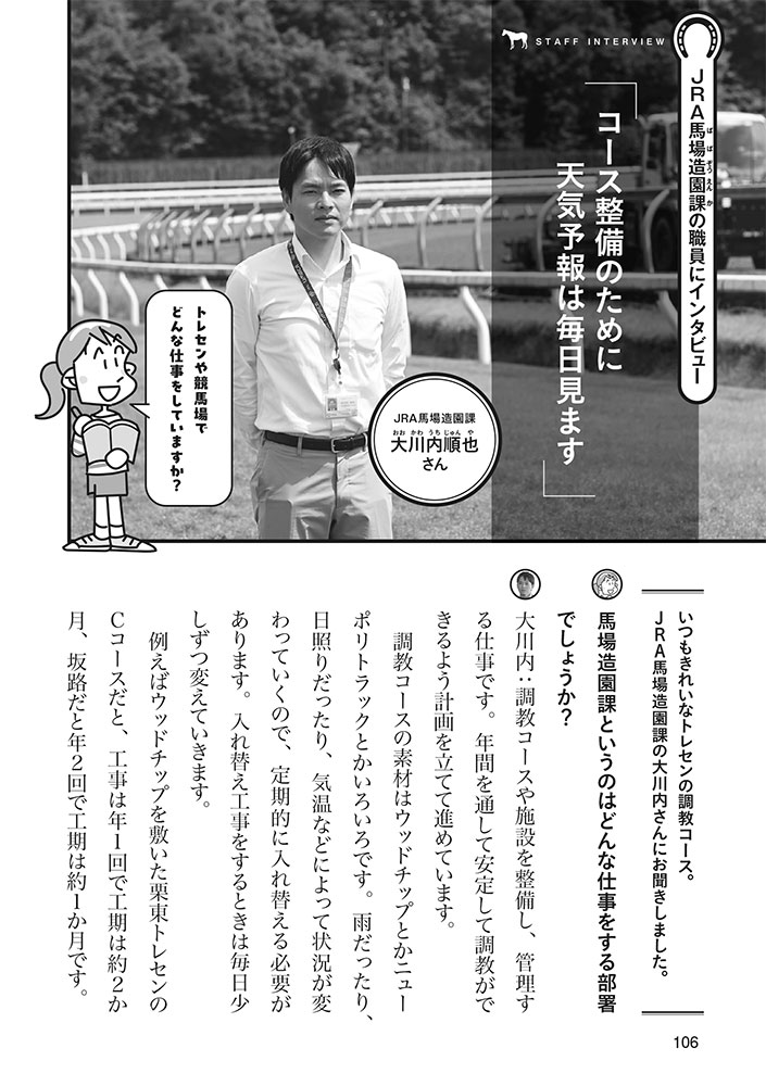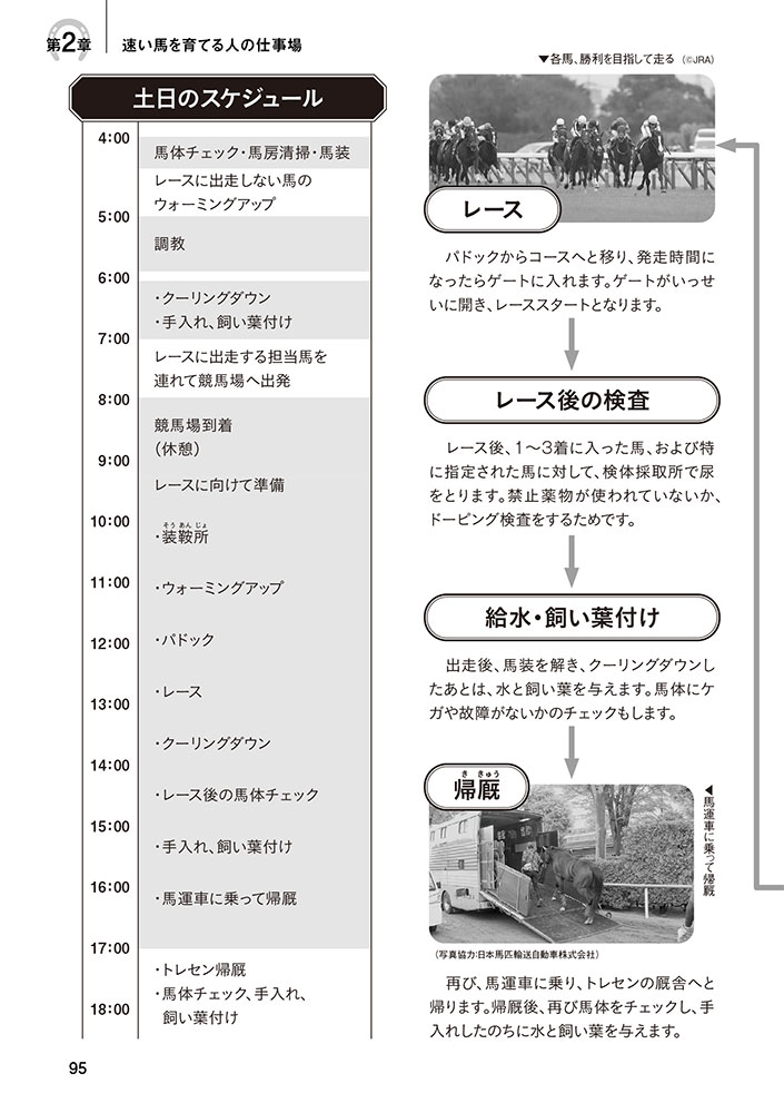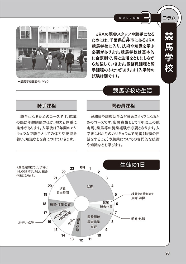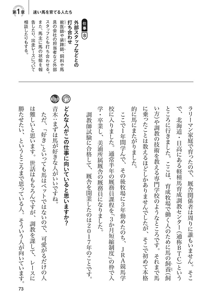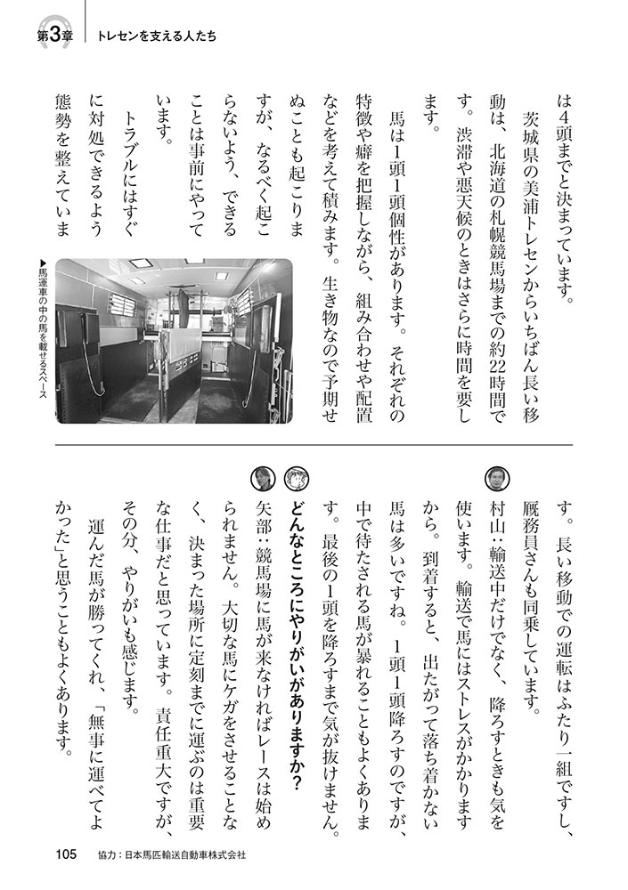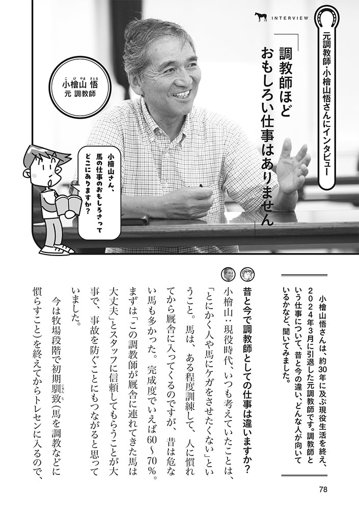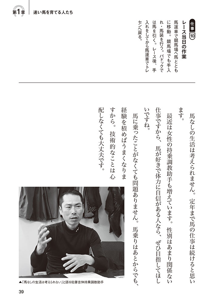 この本は、世界最強の競走馬をつくるために、日々馬と向き合い、トレーニングする人たちの苦労や喜びを関係者へのインタビューや取材を通して描いています。情熱をもって馬に接し、奮闘する人たちの姿や思いを描くことで、動物と働くことの意義や楽しさがわかるように編集しています。ぜひ、進路や職業選択を考えるときの、みなさんの参考にしてください。
