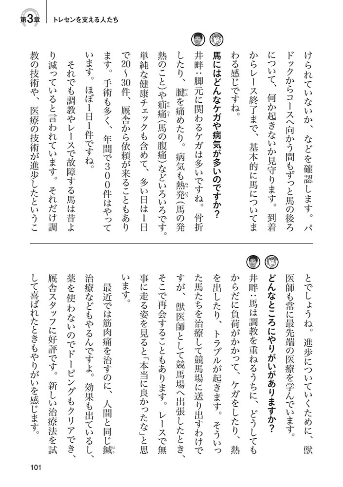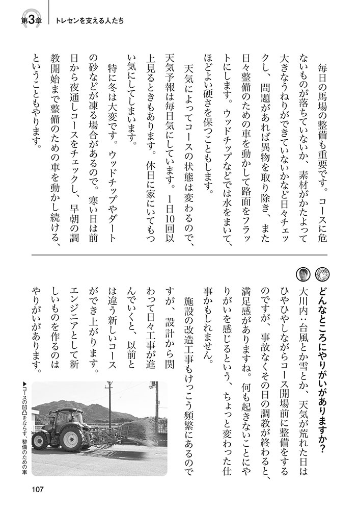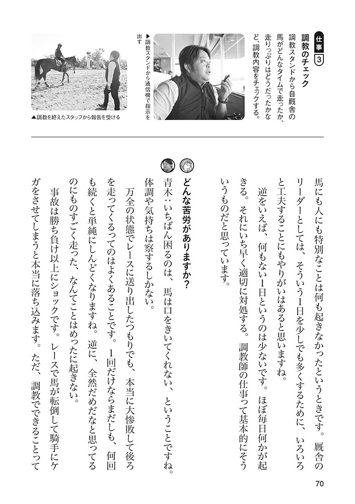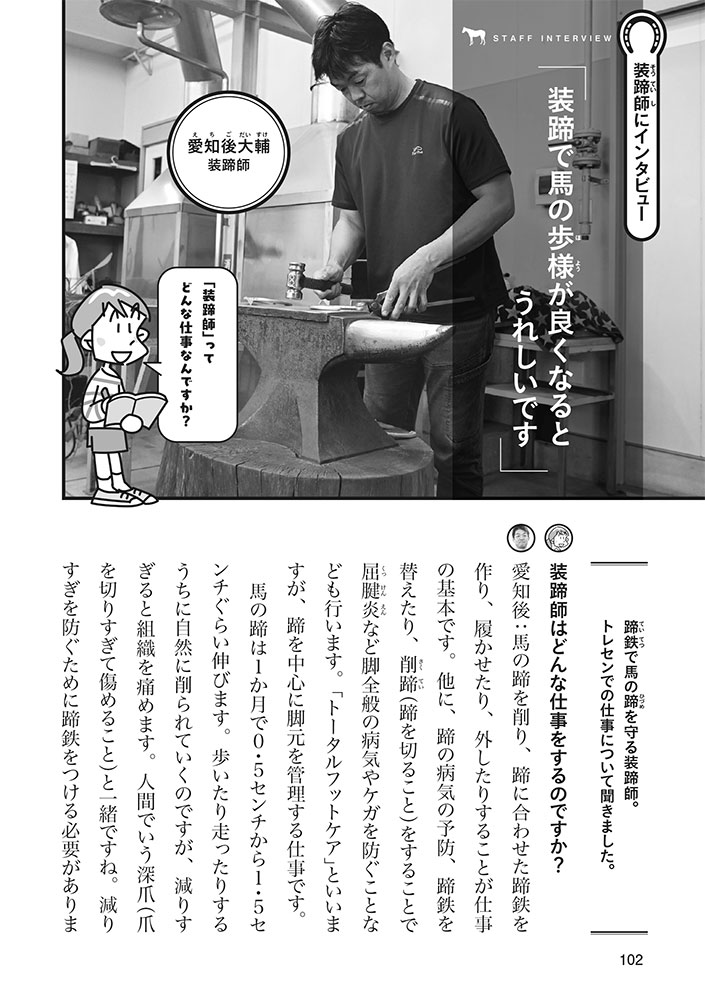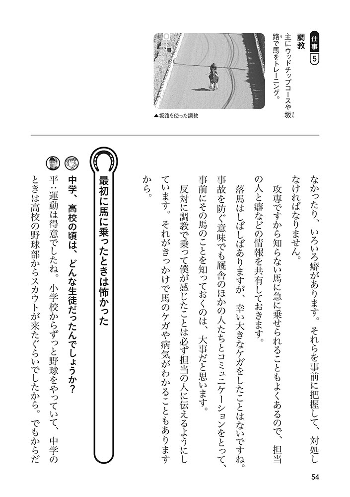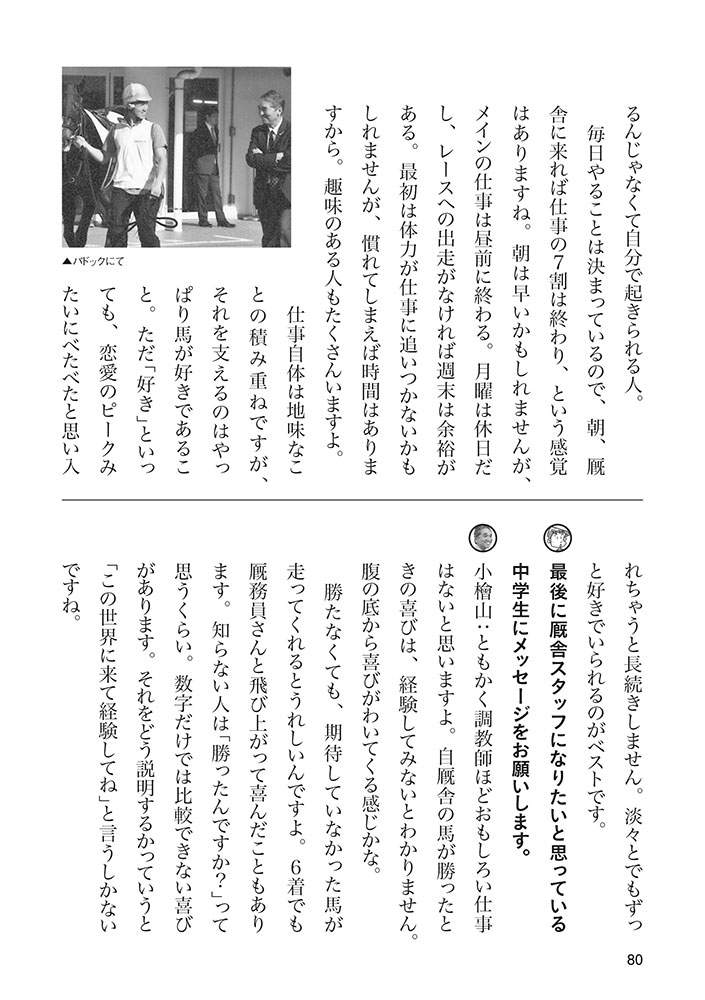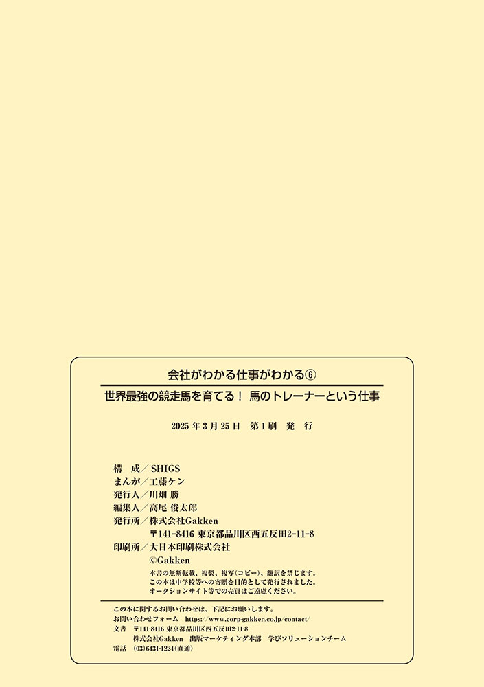 この本は、世界最強の競走馬をつくるために、日々馬と向き合い、トレーニングする人たちの苦労や喜びを関係者へのインタビューや取材を通して描いています。情熱をもって馬に接し、奮闘する人たちの姿や思いを描くことで、動物と働くことの意義や楽しさがわかるように編集しています。ぜひ、進路や職業選択を考えるときの、みなさんの参考にしてください。