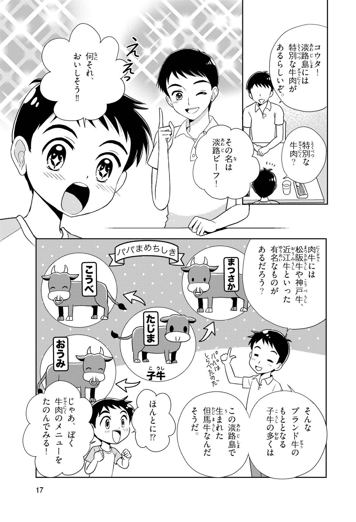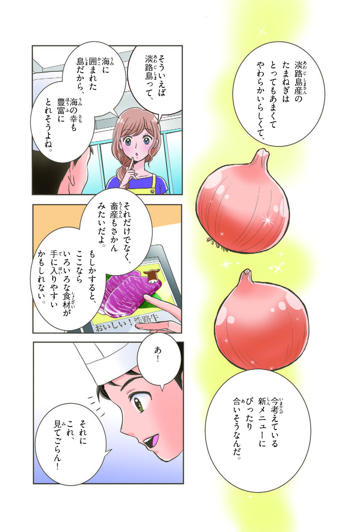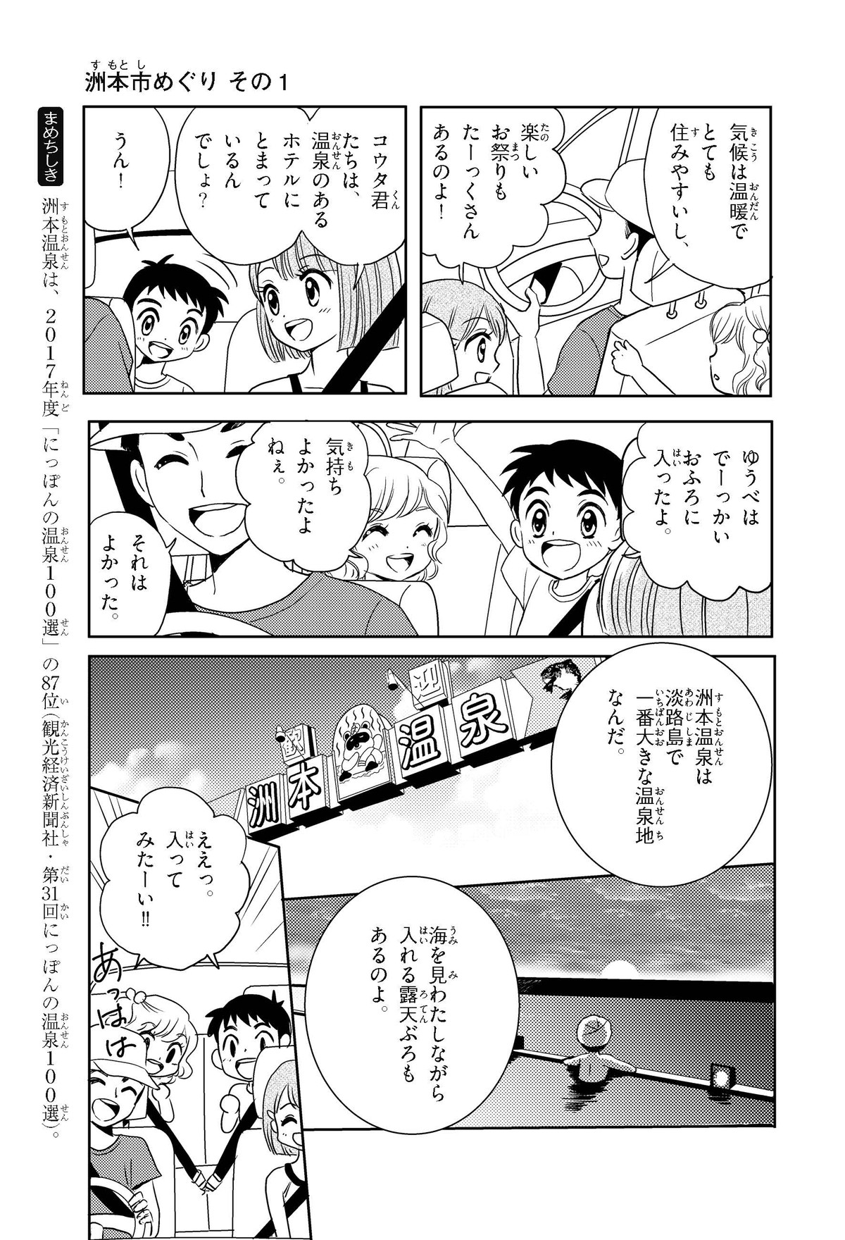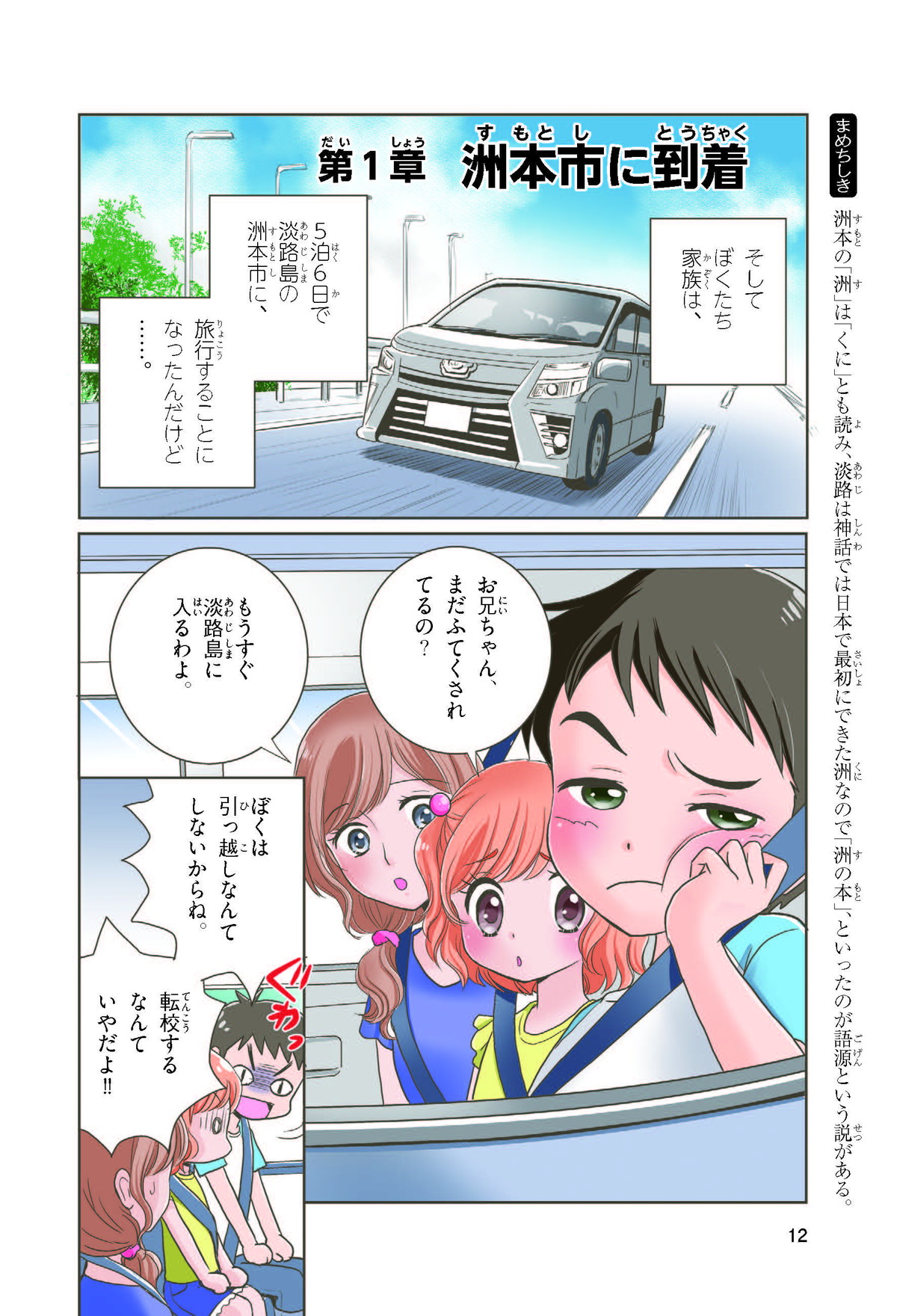 小学5年生のコウタのおうちは洋食屋さん。引っ越しの下見のため、淡路島(あわじしま)・洲本市(すもとし)へ旅行に行くことに。淡路島は、日本の神話でイザナギ、イザナミという神様が最初に生んだ島といわれているよ。温泉や海水浴などが楽しめる場所や、おまつりなどのイベントもあって、たまねぎや淡路牛、春夏秋冬の海の幸と、おいしい食べ物もいっぱい! そんな洲本市のひみつを探っていこう!
