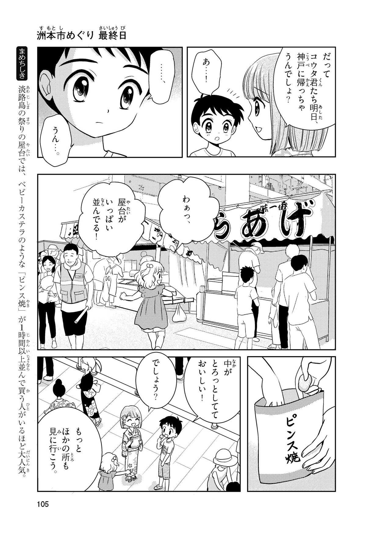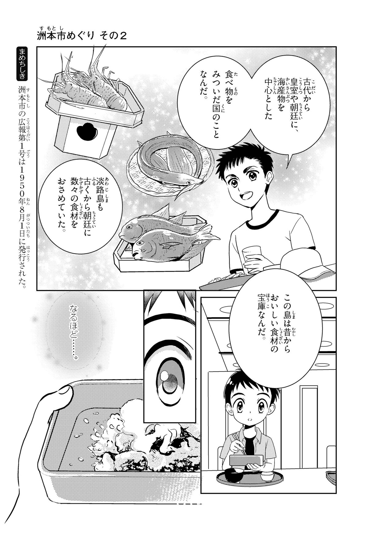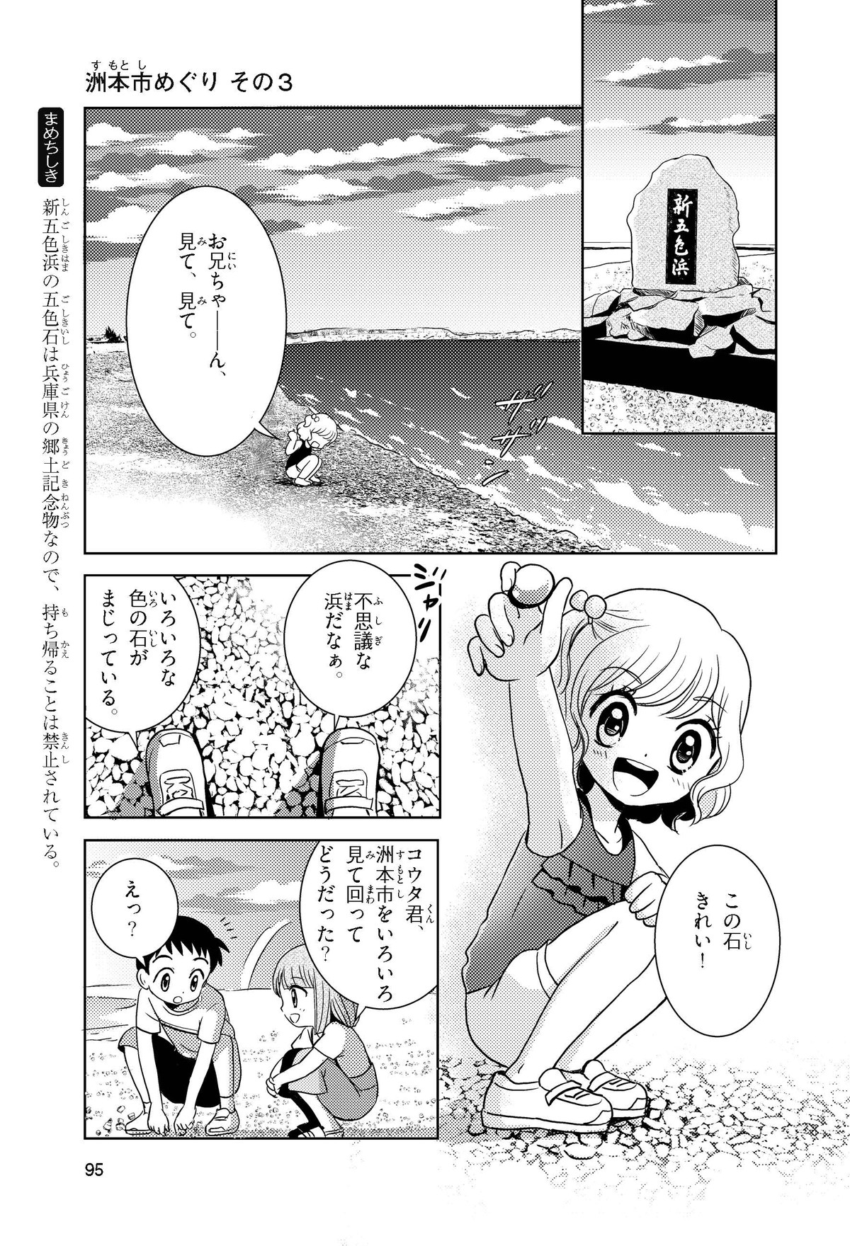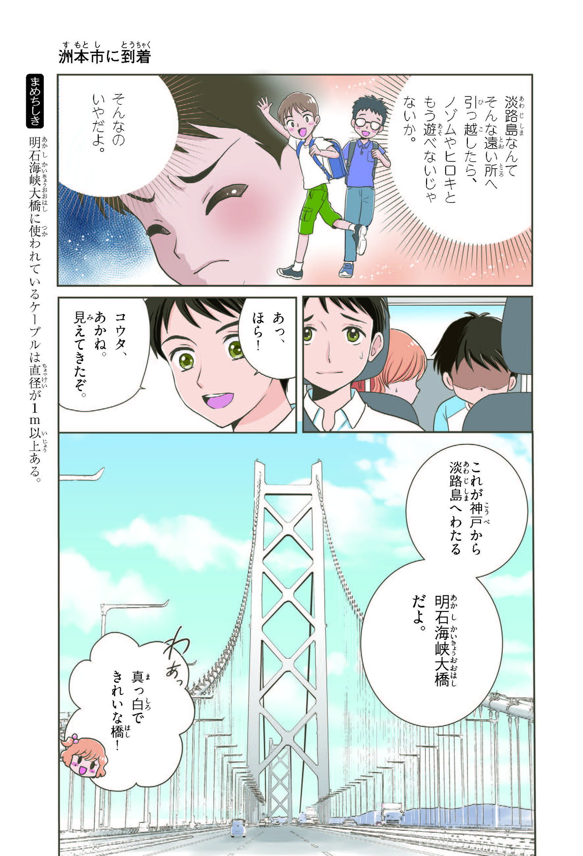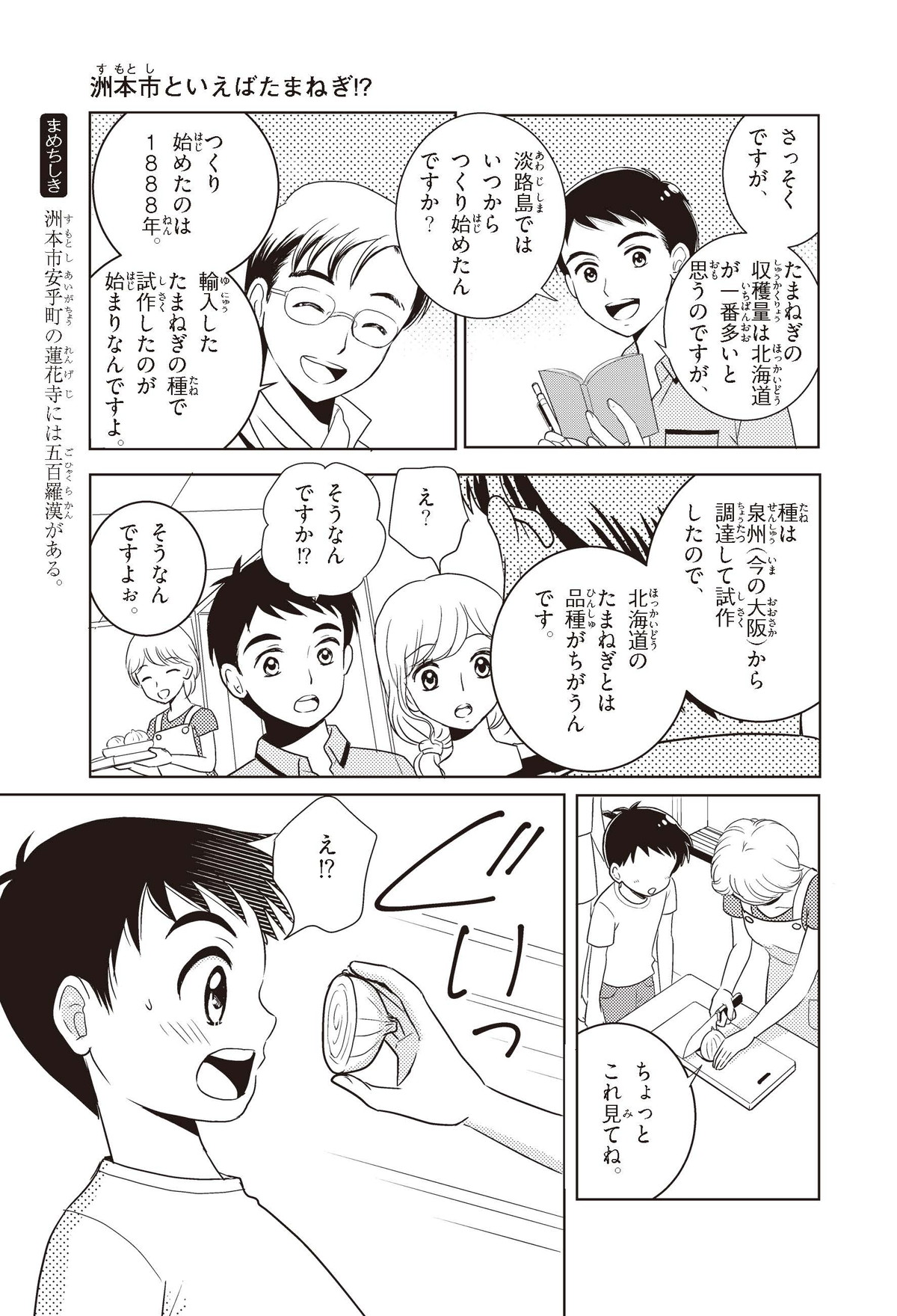小学5年生のコウタのおうちは洋食屋さん。引っ越しの下見のため、淡路島(あわじしま)・洲本市(すもとし)へ旅行に行くことに。淡路島は、日本の神話でイザナギ、イザナミという神様が最初に生んだ島といわれているよ。温泉や海水浴などが楽しめる場所や、おまつりなどのイベントもあって、たまねぎや淡路牛、春夏秋冬の海の幸と、おいしい食べ物もいっぱい! そんな洲本市のひみつを探っていこう!