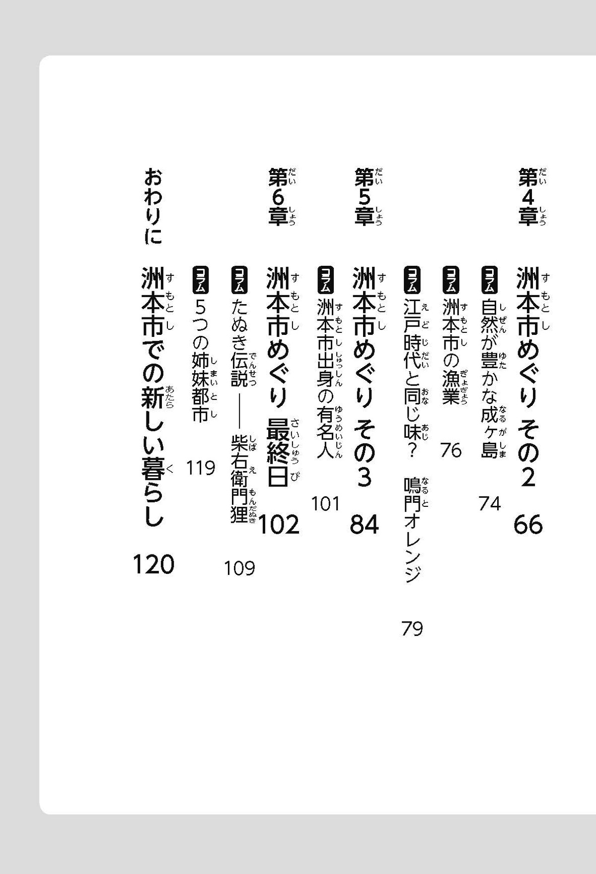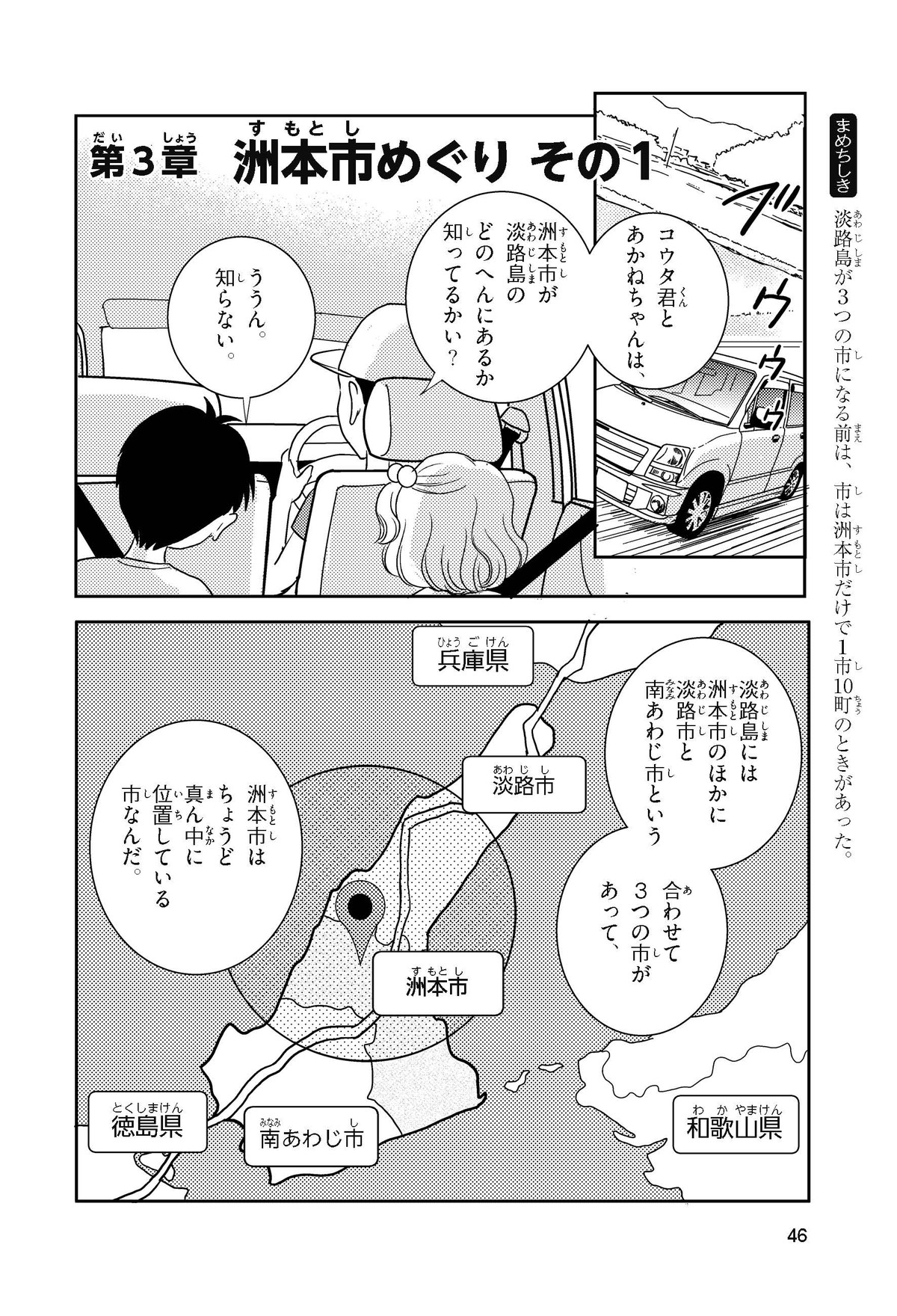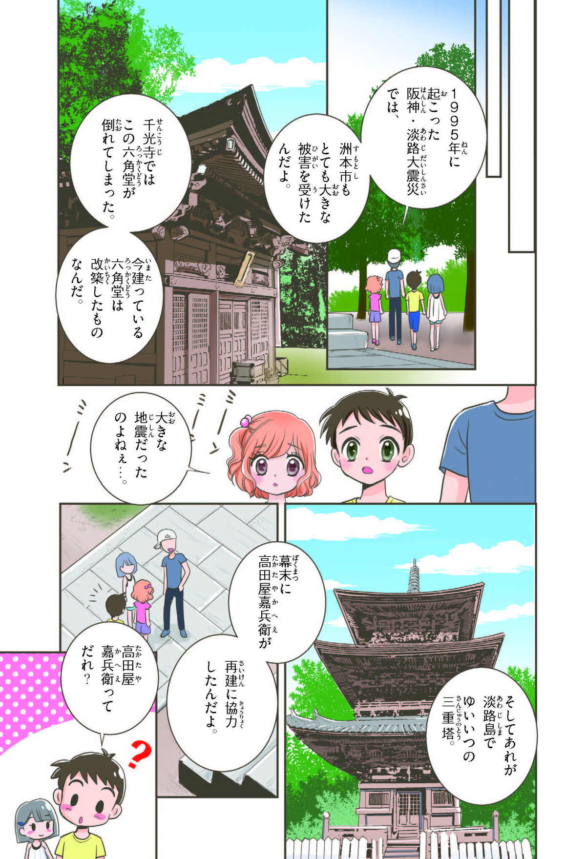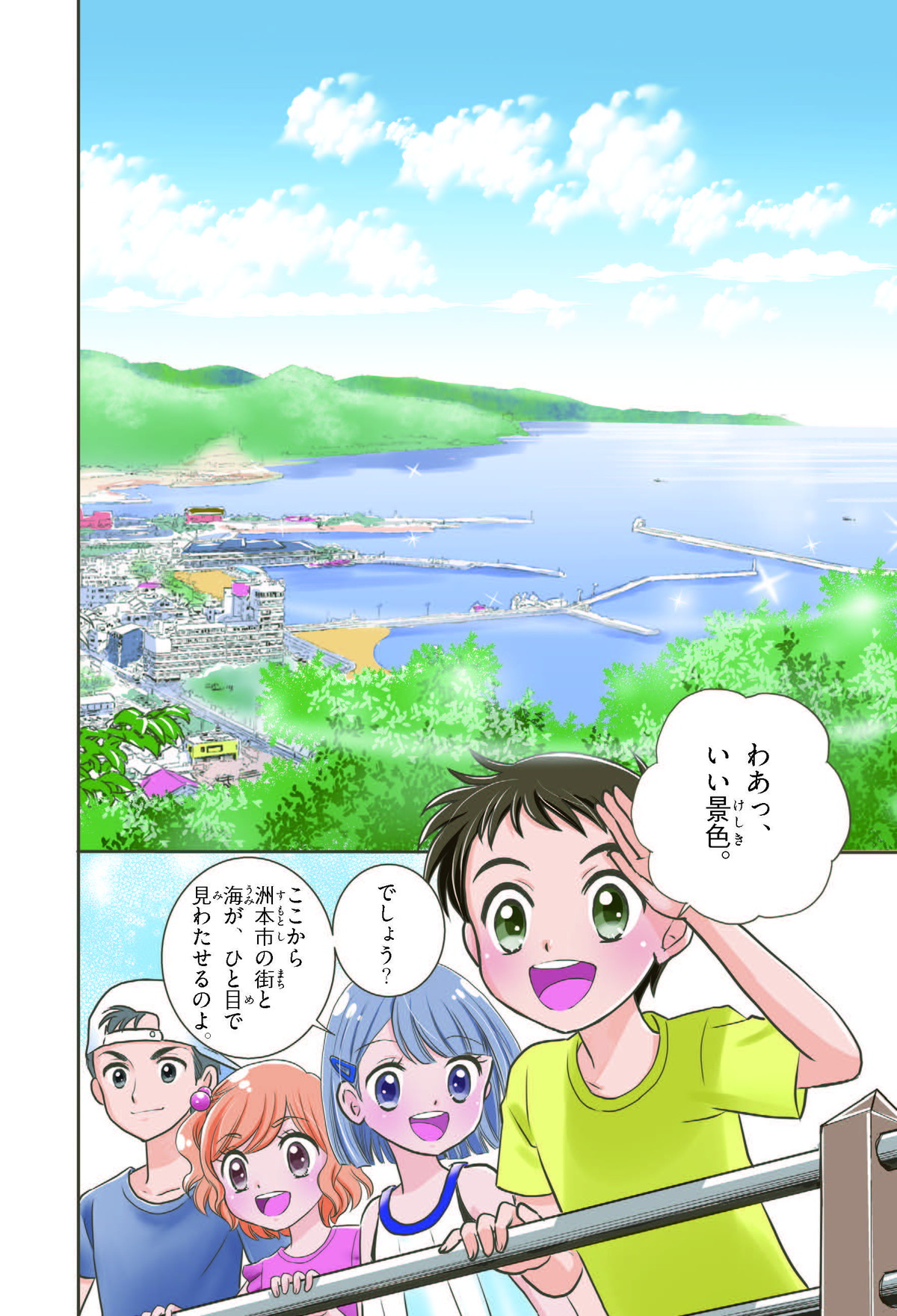 小学5年生のコウタのおうちは洋食屋さん。引っ越しの下見のため、淡路島(あわじしま)・洲本市(すもとし)へ旅行に行くことに。淡路島は、日本の神話でイザナギ、イザナミという神様が最初に生んだ島といわれているよ。温泉や海水浴などが楽しめる場所や、おまつりなどのイベントもあって、たまねぎや淡路牛、春夏秋冬の海の幸と、おいしい食べ物もいっぱい! そんな洲本市のひみつを探っていこう!