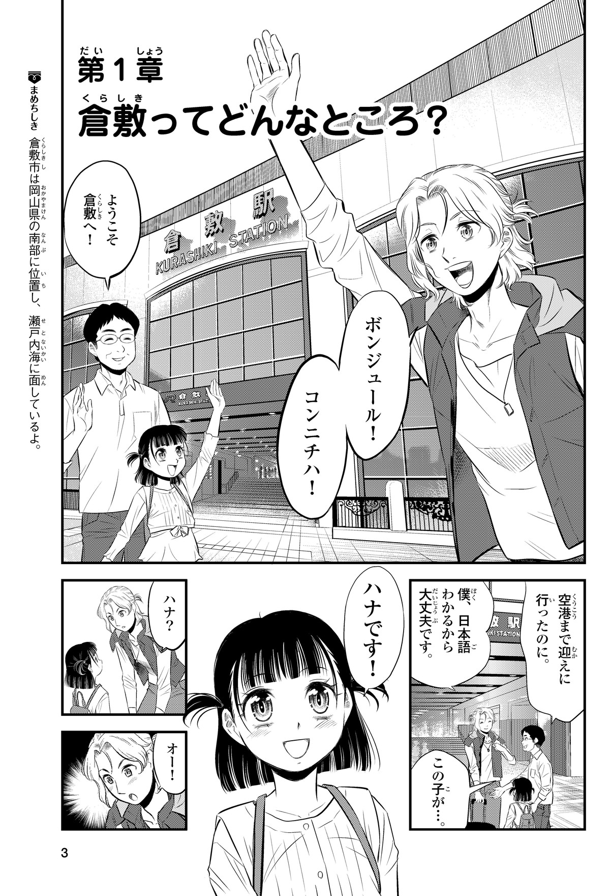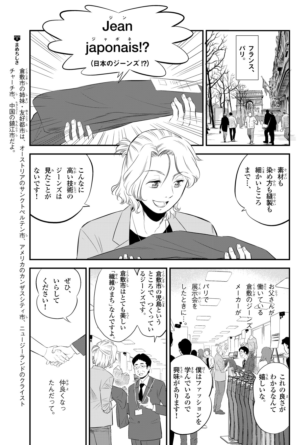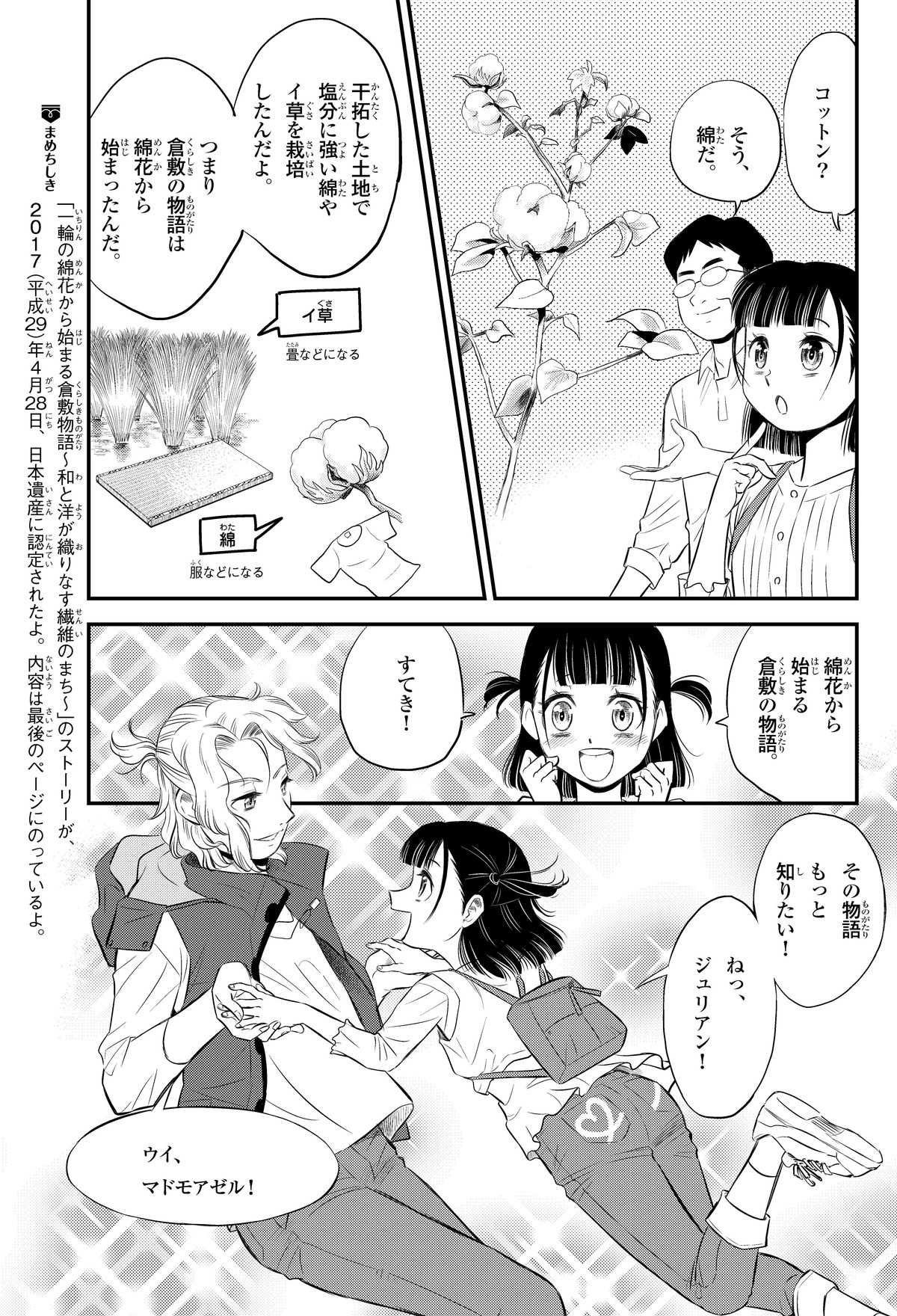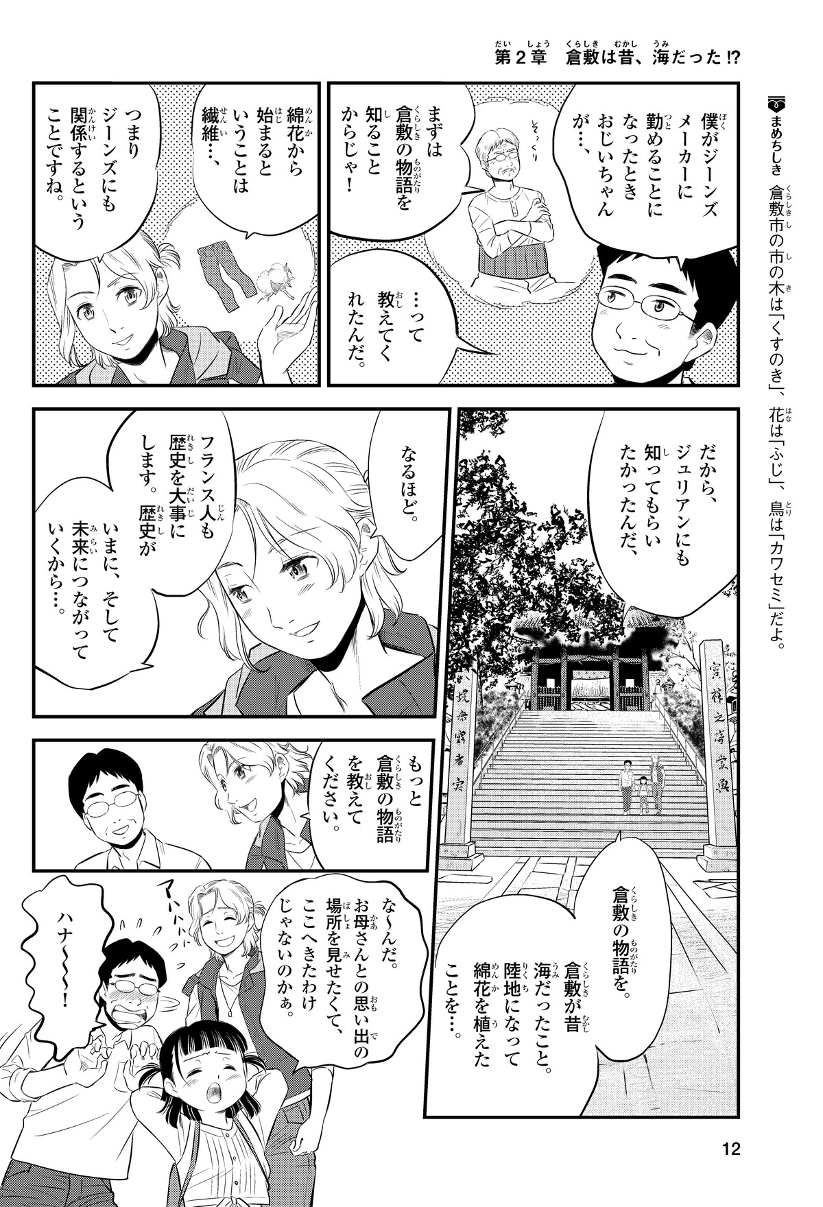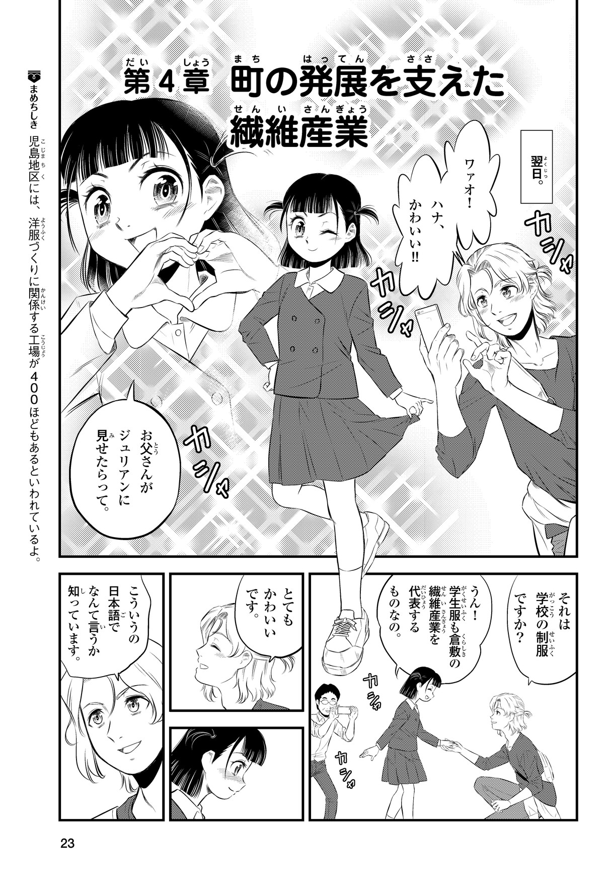 小学生のハナは、倉敷市に住む女の子。倉敷市は「繊維(せんい)のまち」として有名で、ハナのお父さんもジーンズメーカーで働いているよ。その高い技術(ぎじゅつ)で作られた倉敷市のジーンズに惹かれて日本に来た、フランス人のジュリアン。ハナとジュリアンは、倉敷市がもともと海だったこと、干拓した土地に綿花を植えたことなど、倉敷市の歴史を学んでいくよ。そして、ジュリアンはあることを決意して……!?