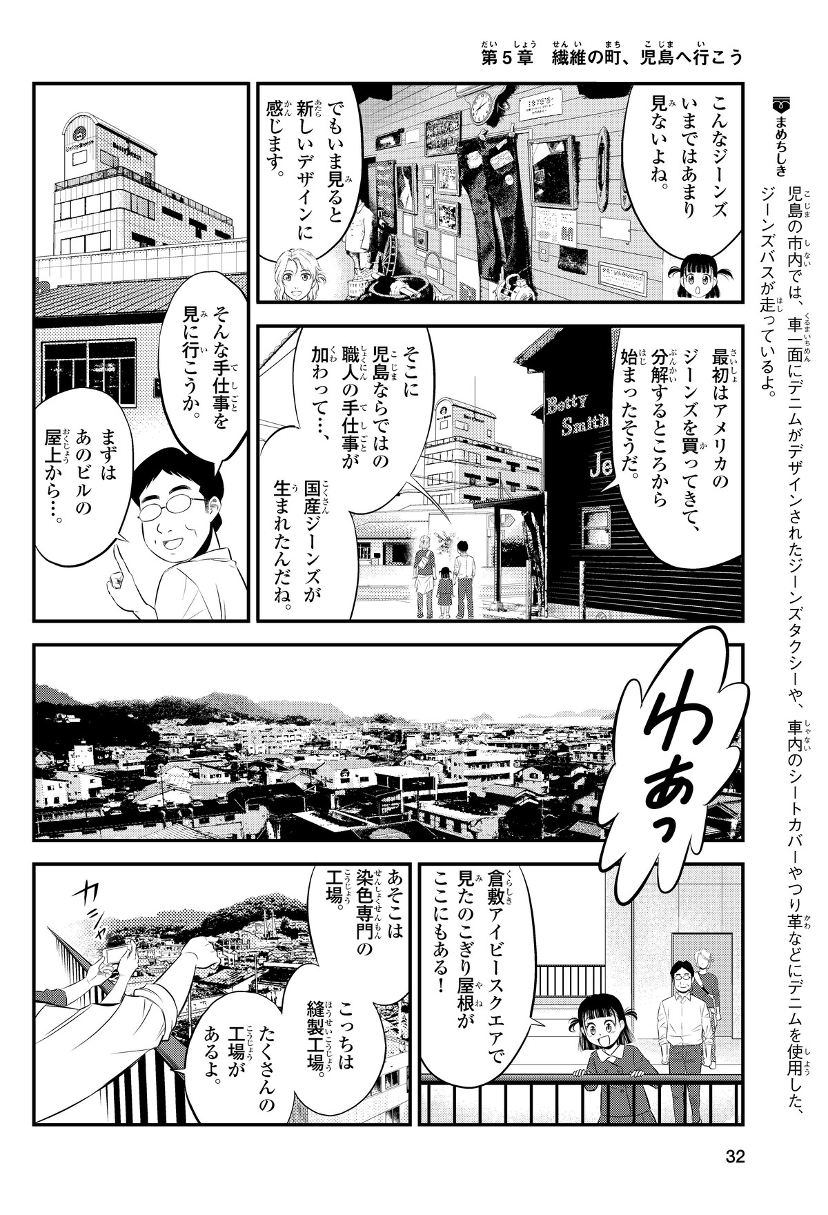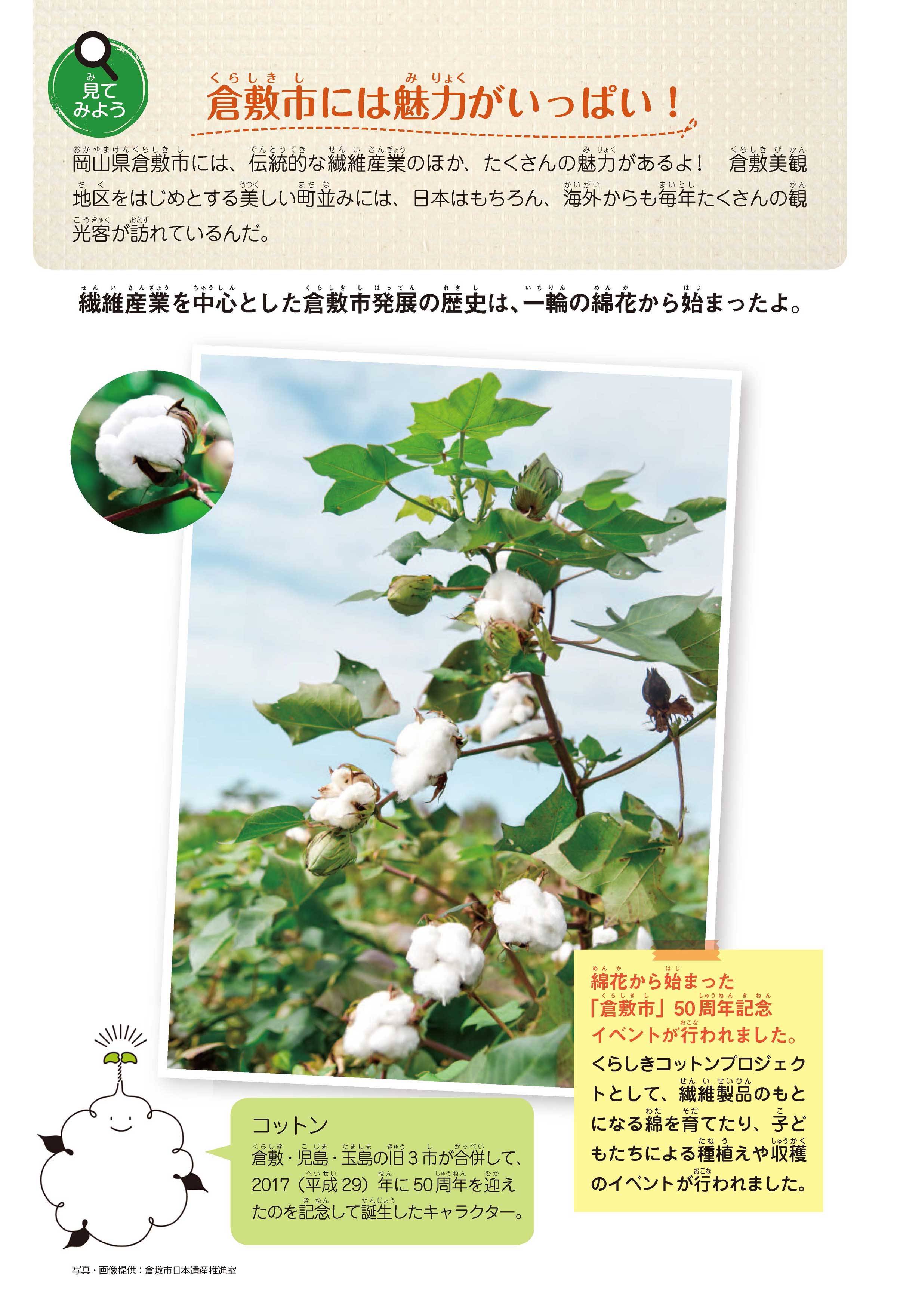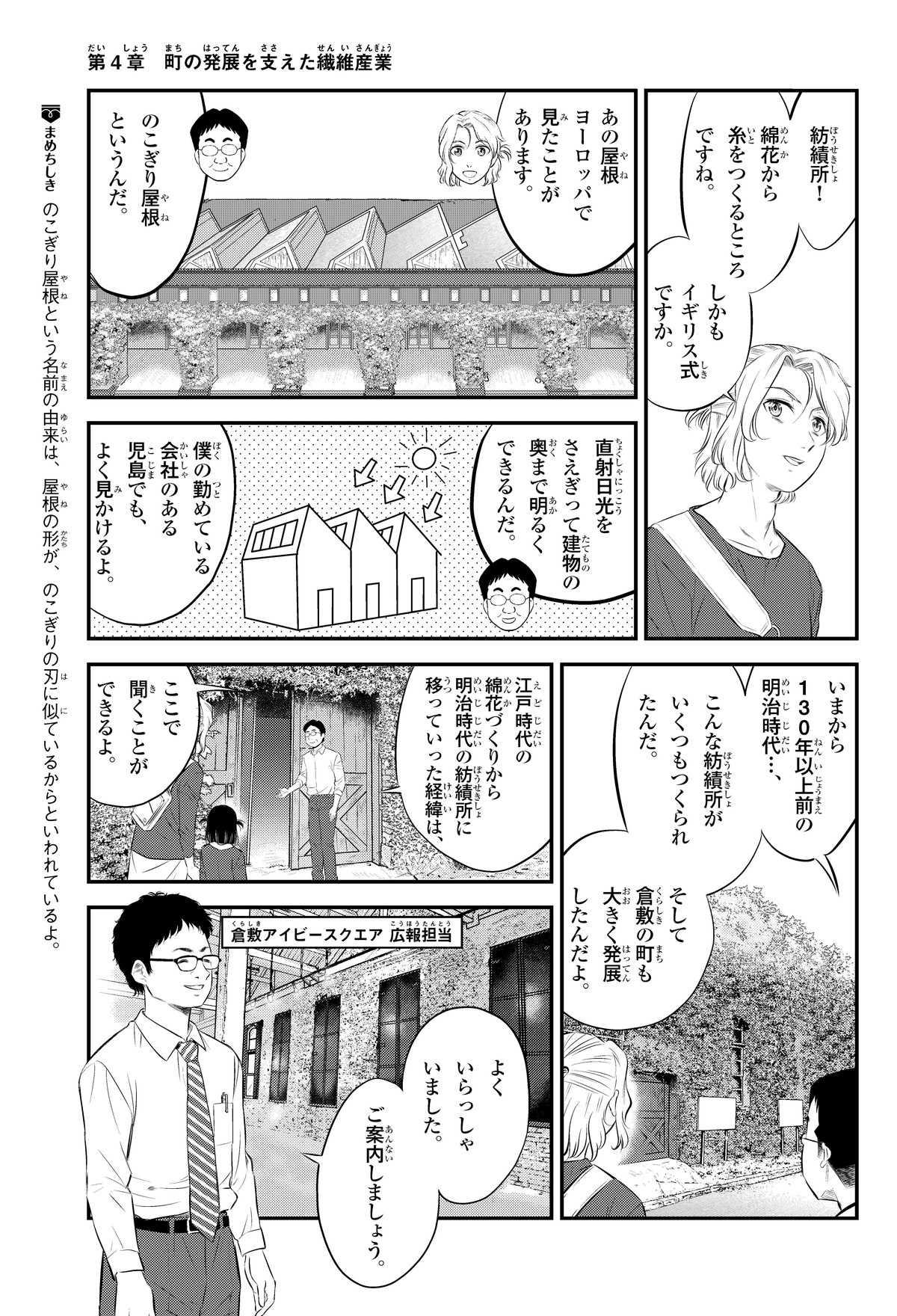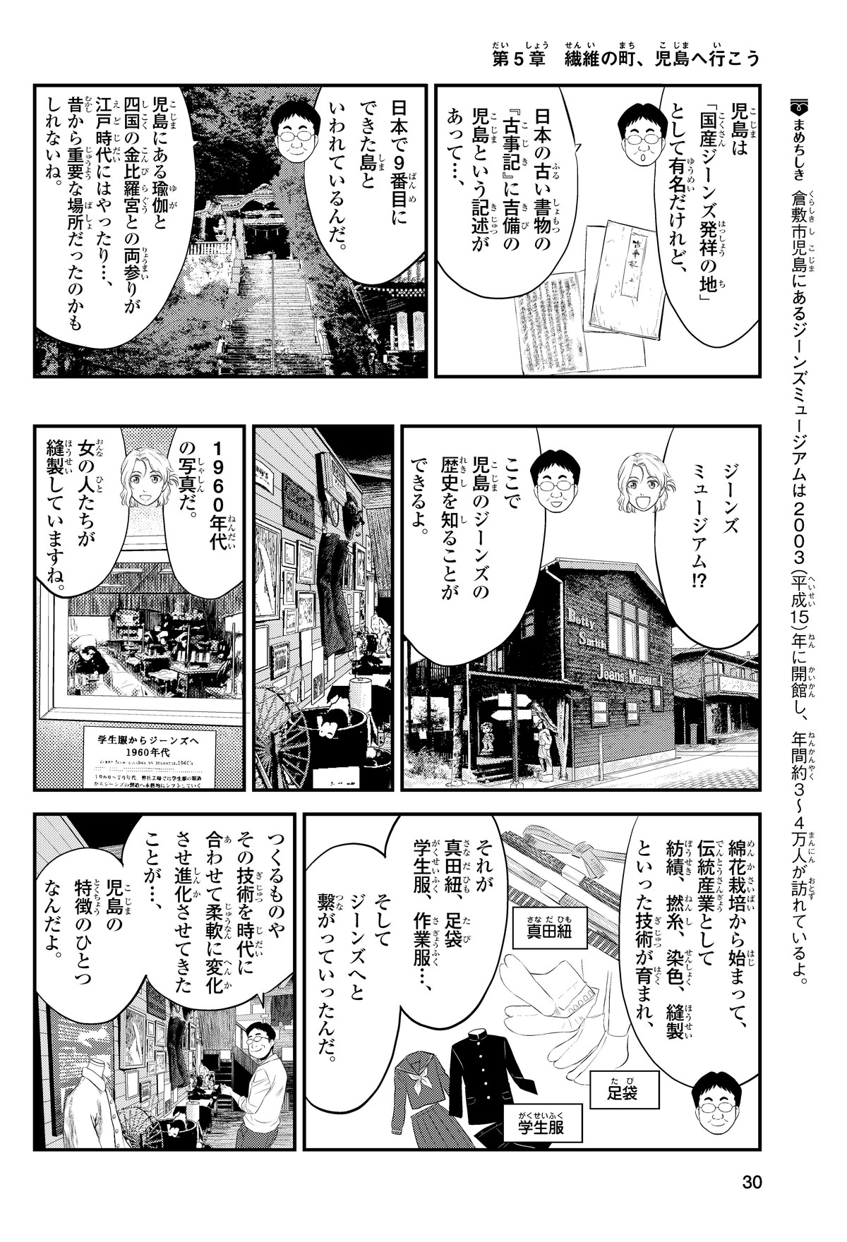 小学生のハナは、倉敷市に住む女の子。倉敷市は「繊維(せんい)のまち」として有名で、ハナのお父さんもジーンズメーカーで働いているよ。その高い技術(ぎじゅつ)で作られた倉敷市のジーンズに惹かれて日本に来た、フランス人のジュリアン。ハナとジュリアンは、倉敷市がもともと海だったこと、干拓した土地に綿花を植えたことなど、倉敷市の歴史を学んでいくよ。そして、ジュリアンはあることを決意して……!?