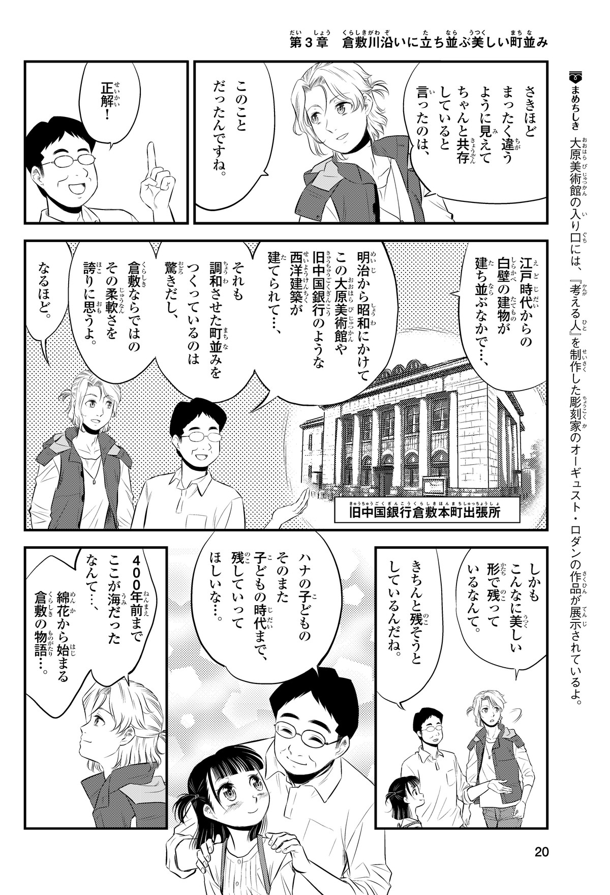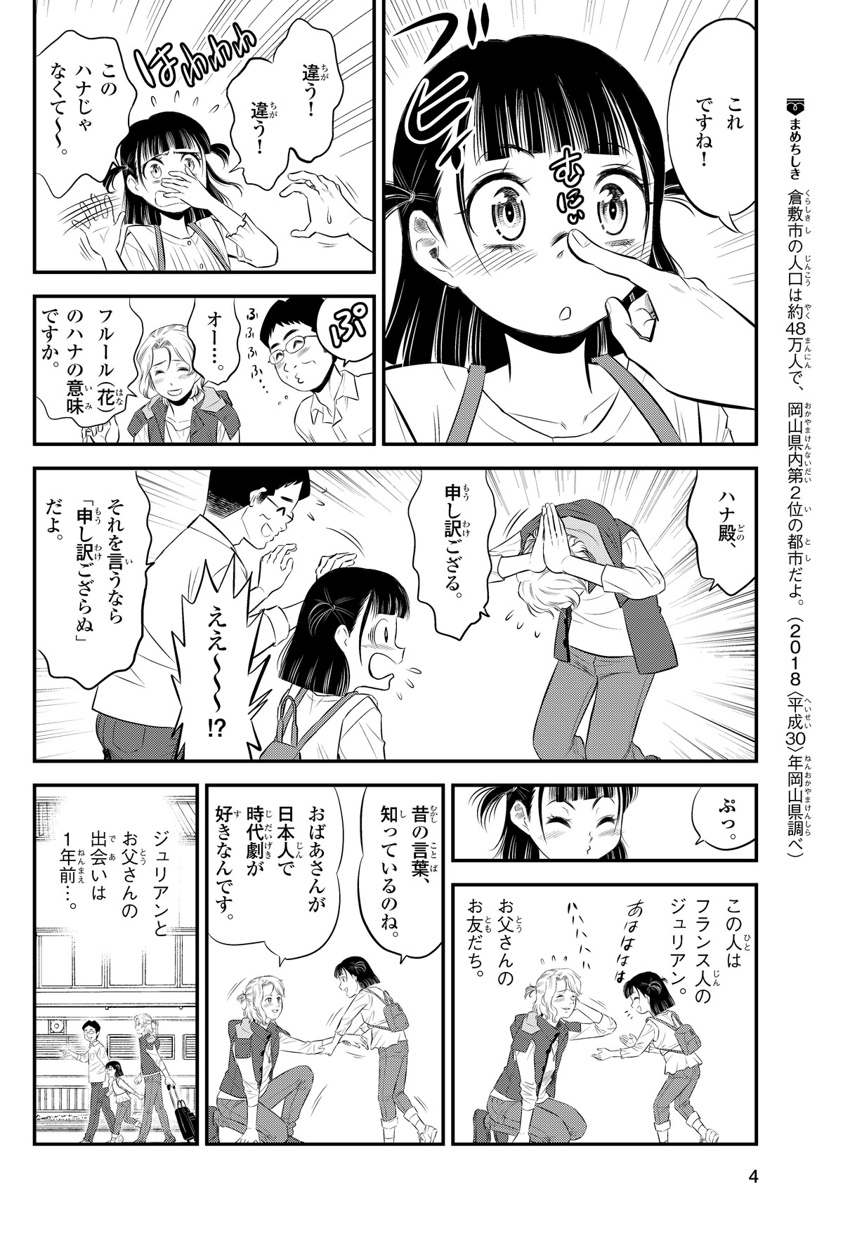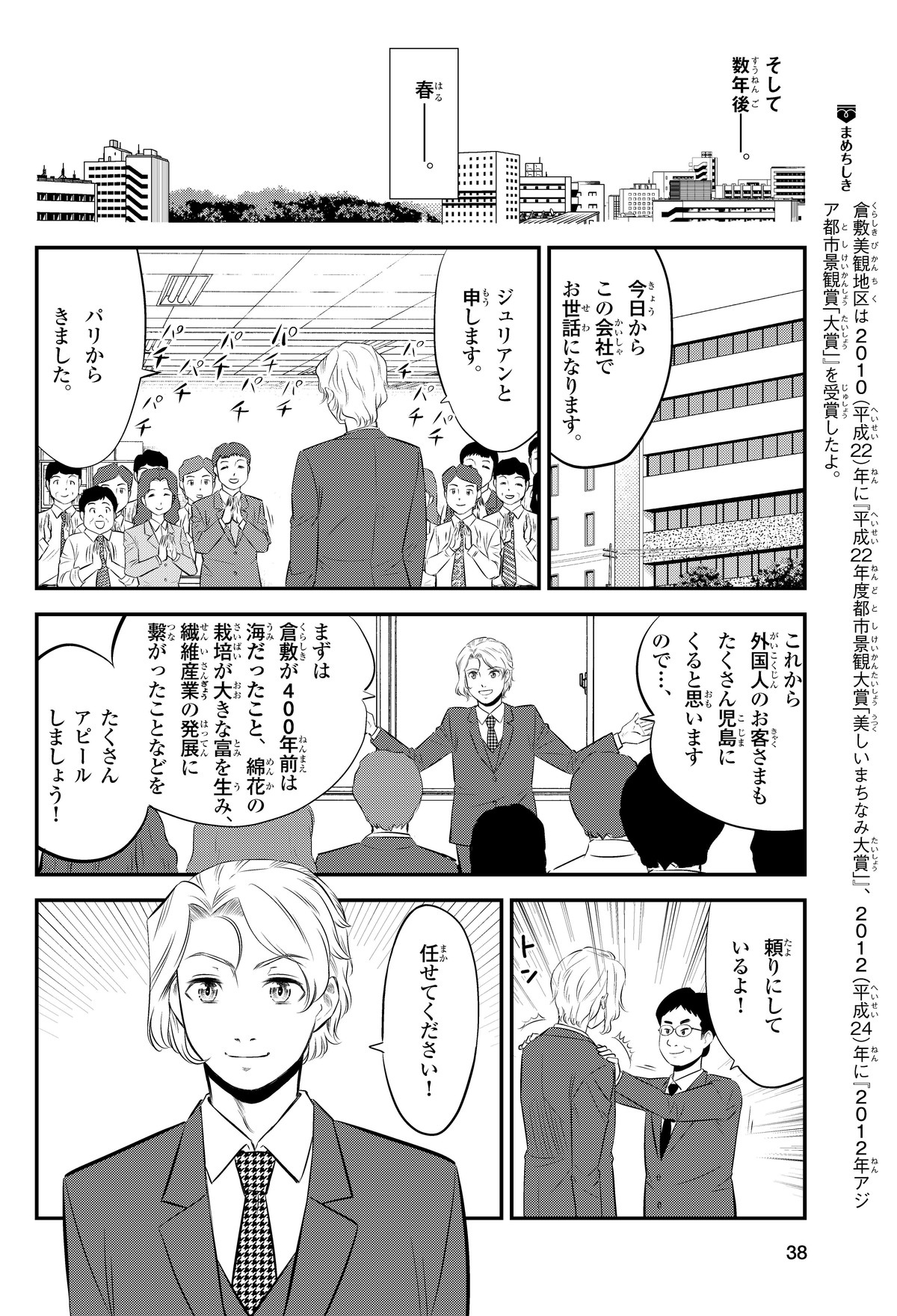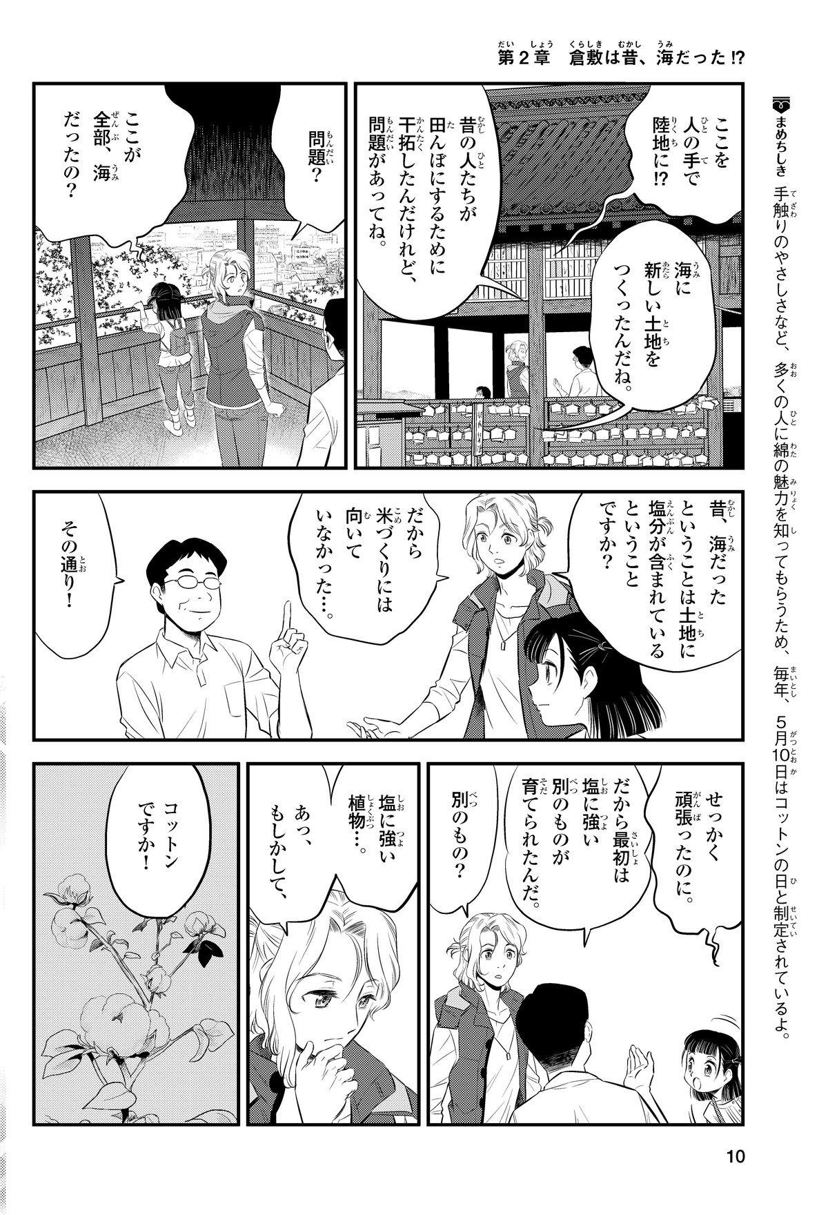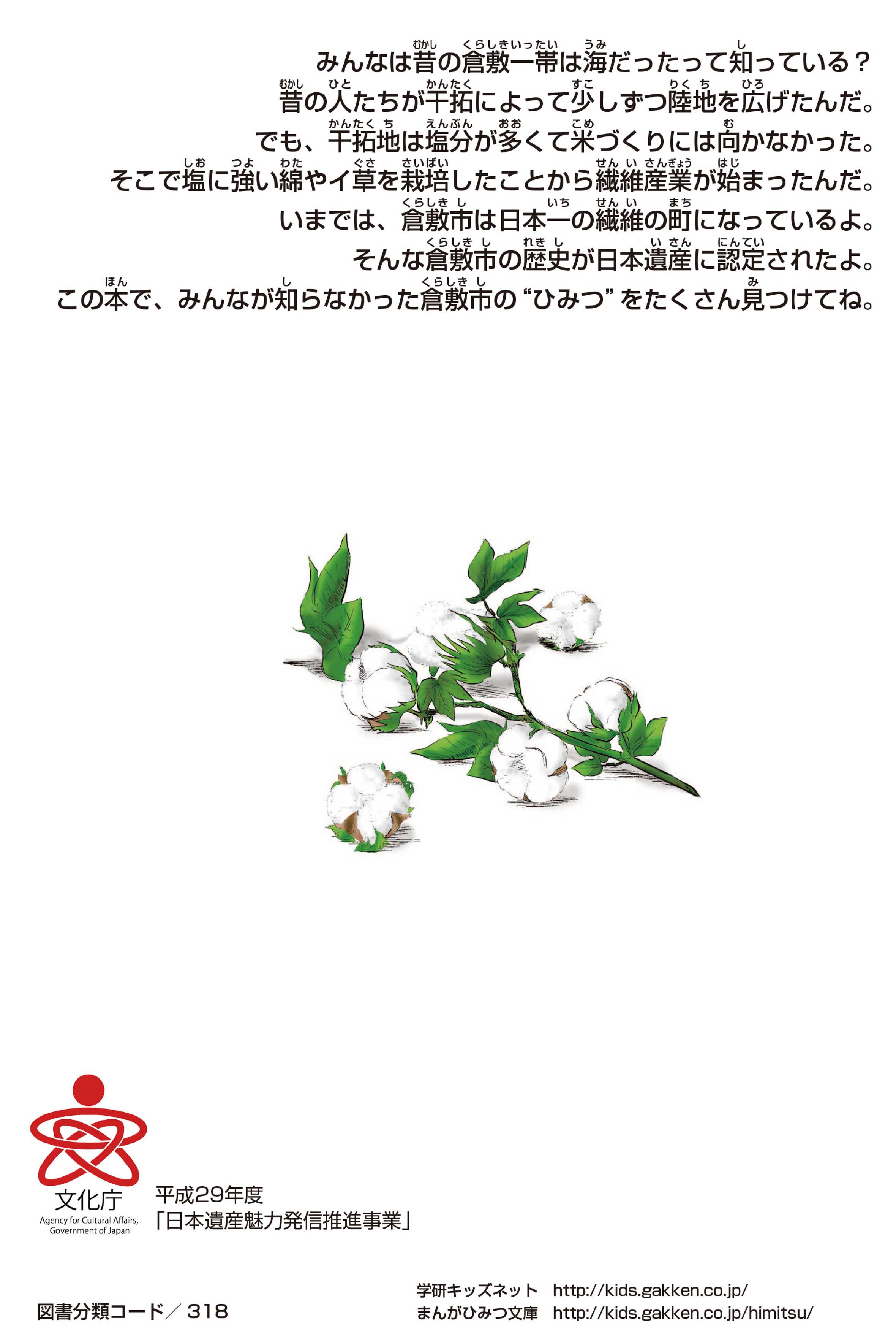 小学生のハナは、倉敷市に住む女の子。倉敷市は「繊維(せんい)のまち」として有名で、ハナのお父さんもジーンズメーカーで働いているよ。その高い技術(ぎじゅつ)で作られた倉敷市のジーンズに惹かれて日本に来た、フランス人のジュリアン。ハナとジュリアンは、倉敷市がもともと海だったこと、干拓した土地に綿花を植えたことなど、倉敷市の歴史を学んでいくよ。そして、ジュリアンはあることを決意して……!?