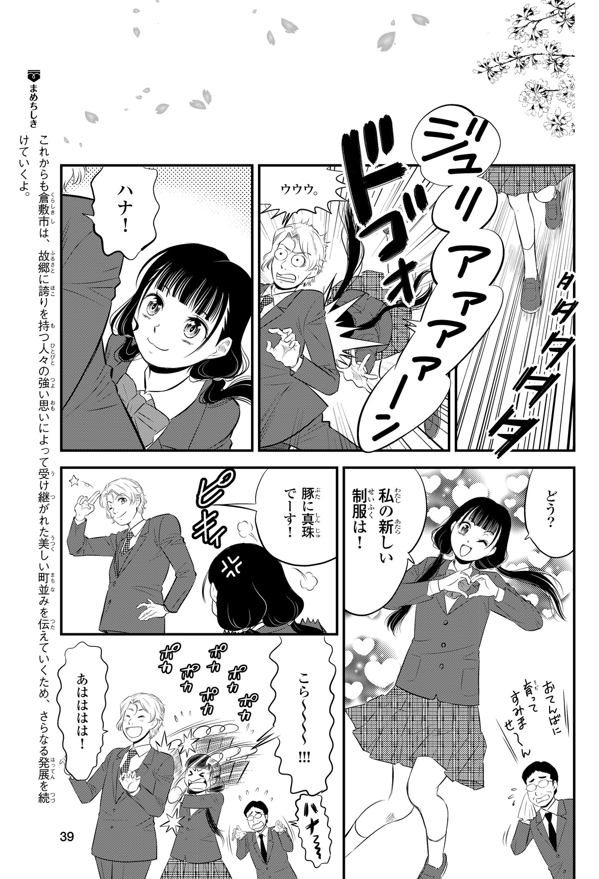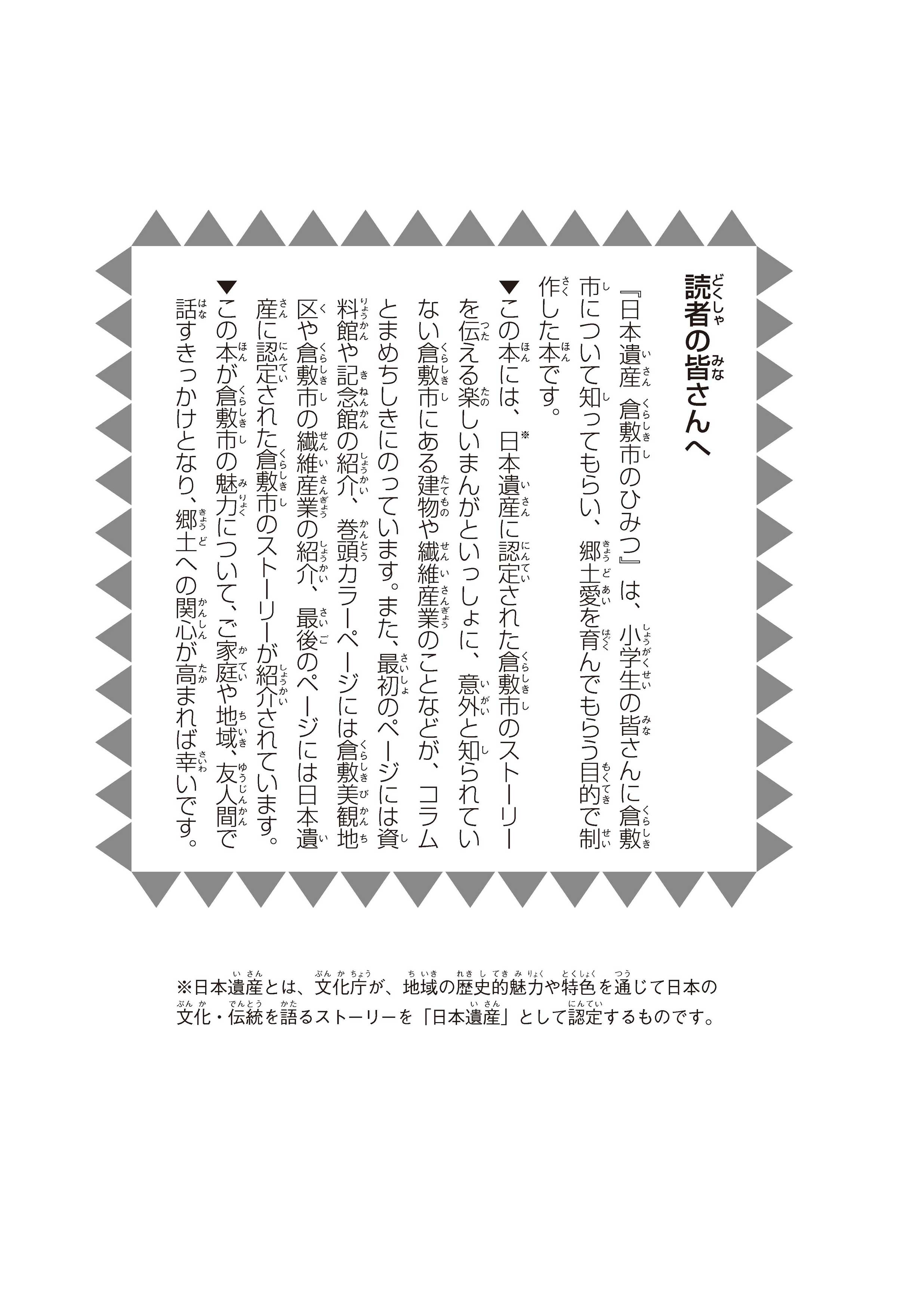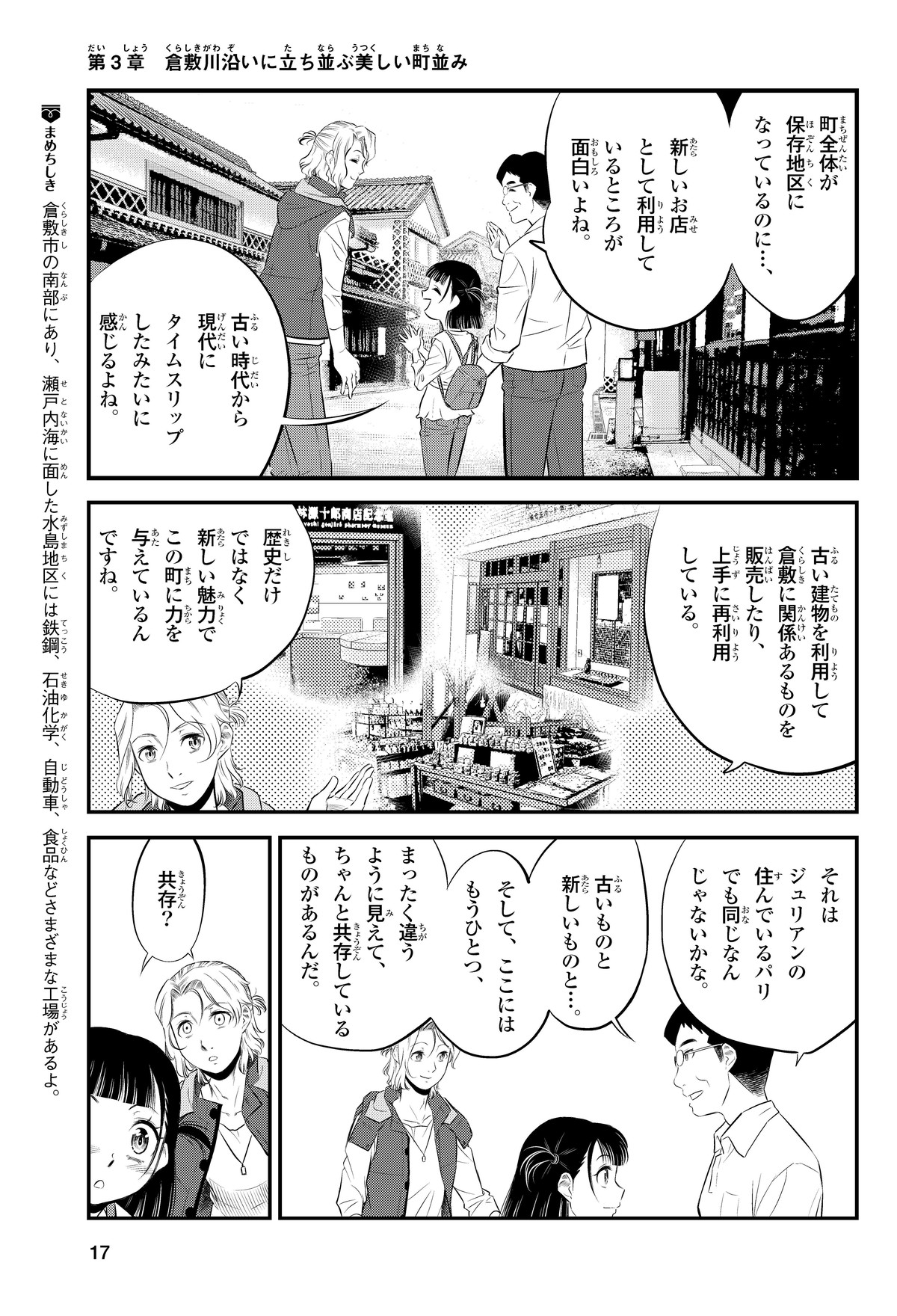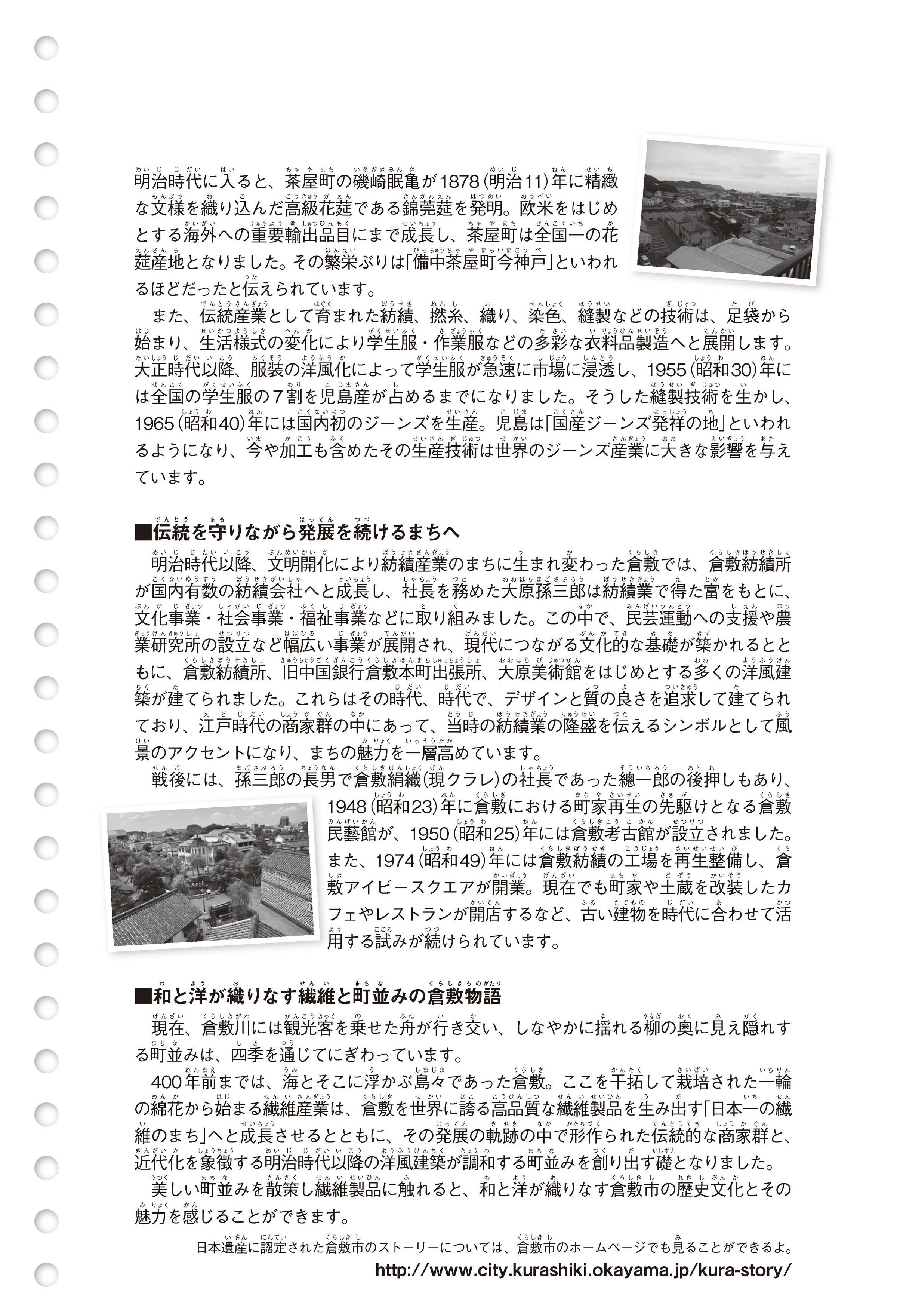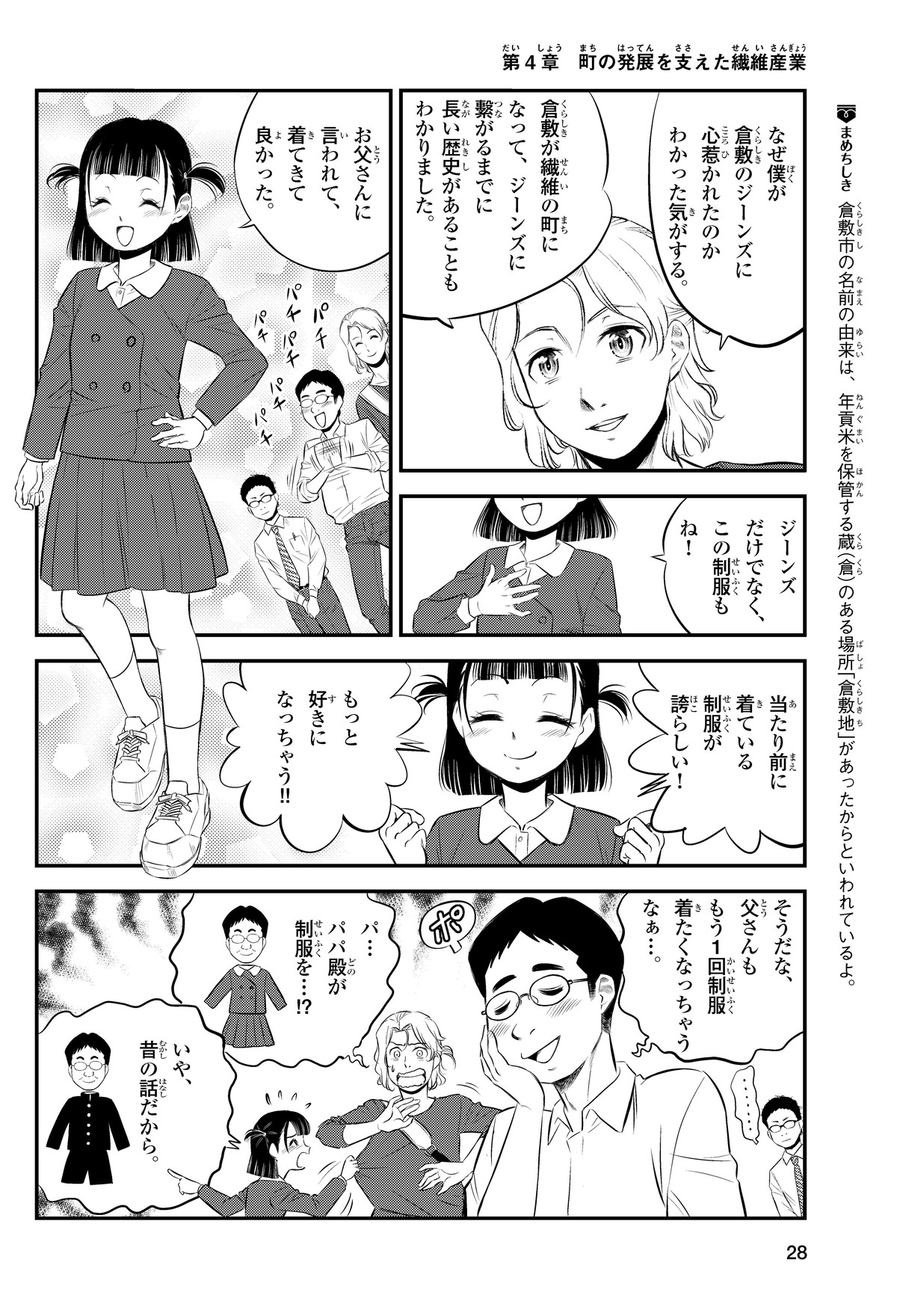 小学生のハナは、倉敷市に住む女の子。倉敷市は「繊維(せんい)のまち」として有名で、ハナのお父さんもジーンズメーカーで働いているよ。その高い技術(ぎじゅつ)で作られた倉敷市のジーンズに惹かれて日本に来た、フランス人のジュリアン。ハナとジュリアンは、倉敷市がもともと海だったこと、干拓した土地に綿花を植えたことなど、倉敷市の歴史を学んでいくよ。そして、ジュリアンはあることを決意して……!?