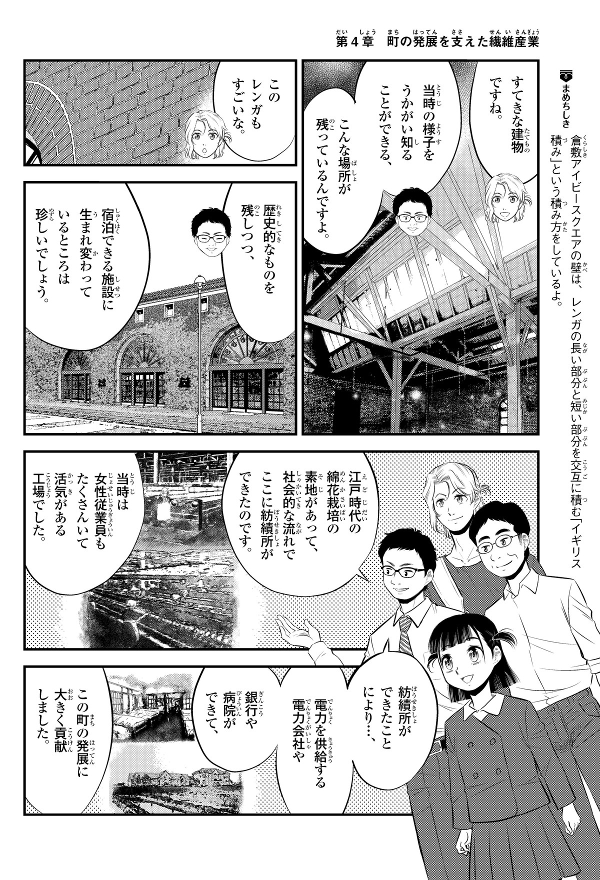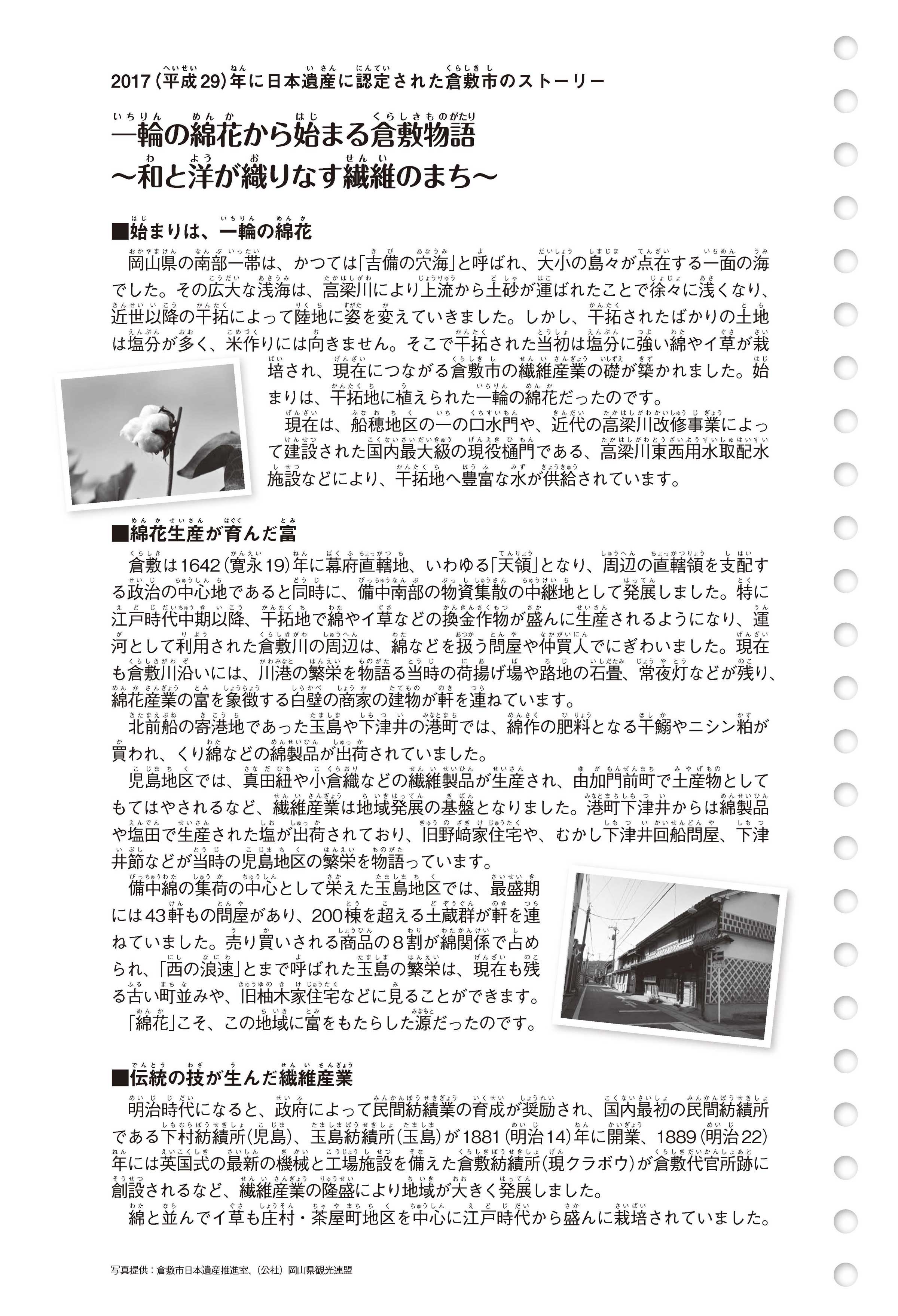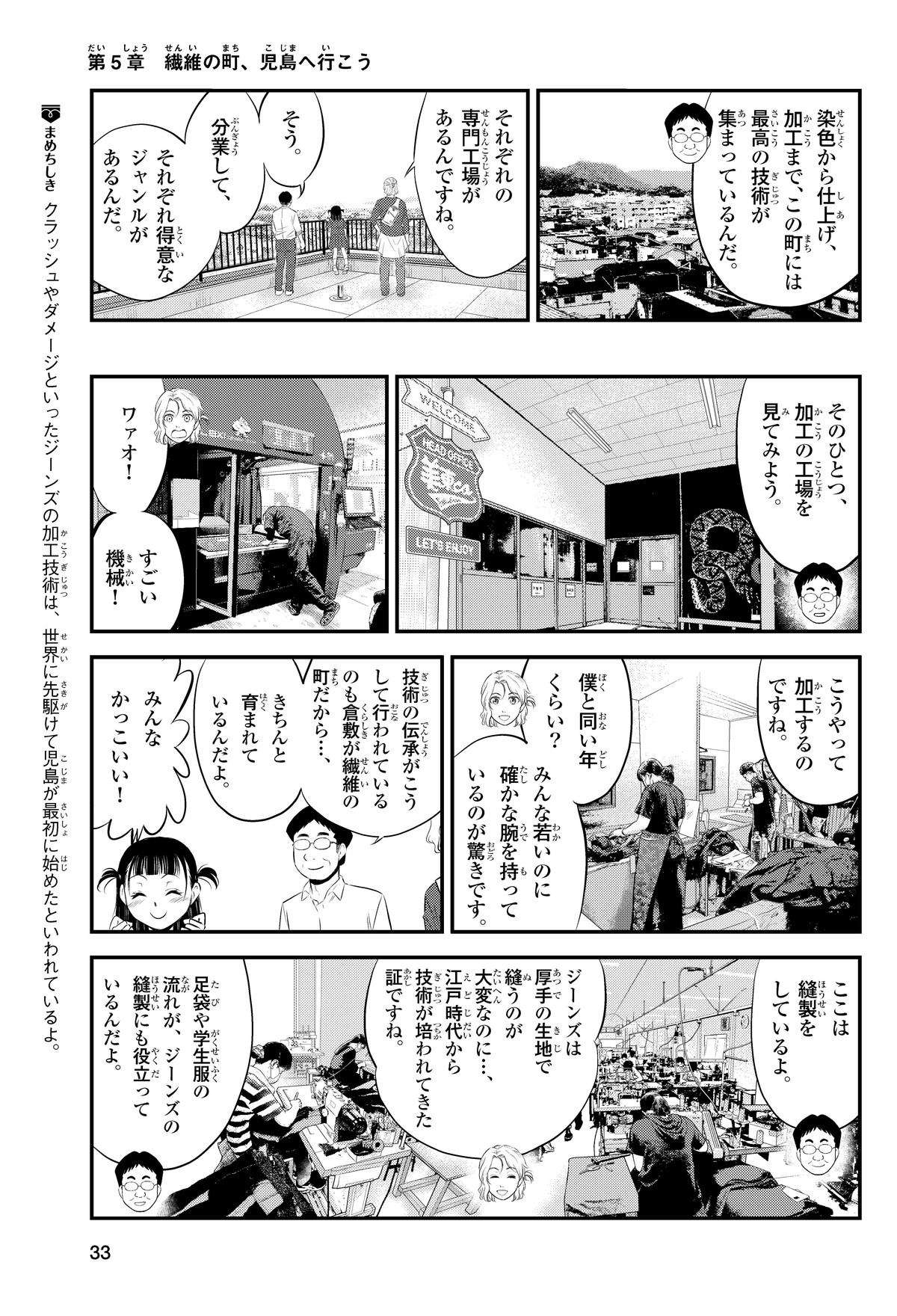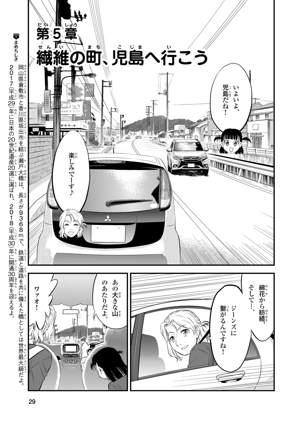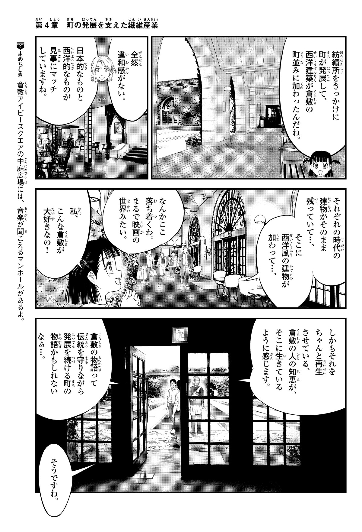 小学生のハナは、倉敷市に住む女の子。倉敷市は「繊維(せんい)のまち」として有名で、ハナのお父さんもジーンズメーカーで働いているよ。その高い技術(ぎじゅつ)で作られた倉敷市のジーンズに惹かれて日本に来た、フランス人のジュリアン。ハナとジュリアンは、倉敷市がもともと海だったこと、干拓した土地に綿花を植えたことなど、倉敷市の歴史を学んでいくよ。そして、ジュリアンはあることを決意して……!?