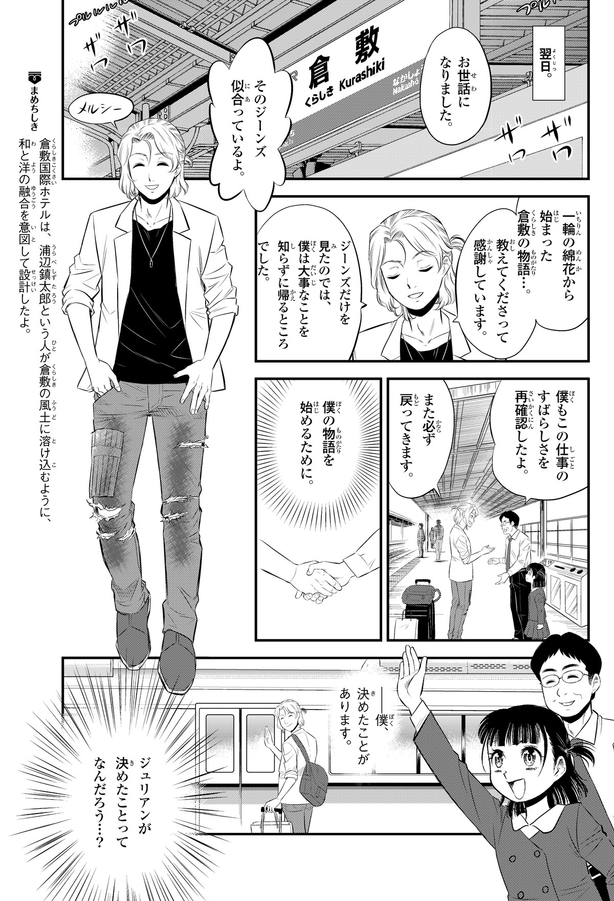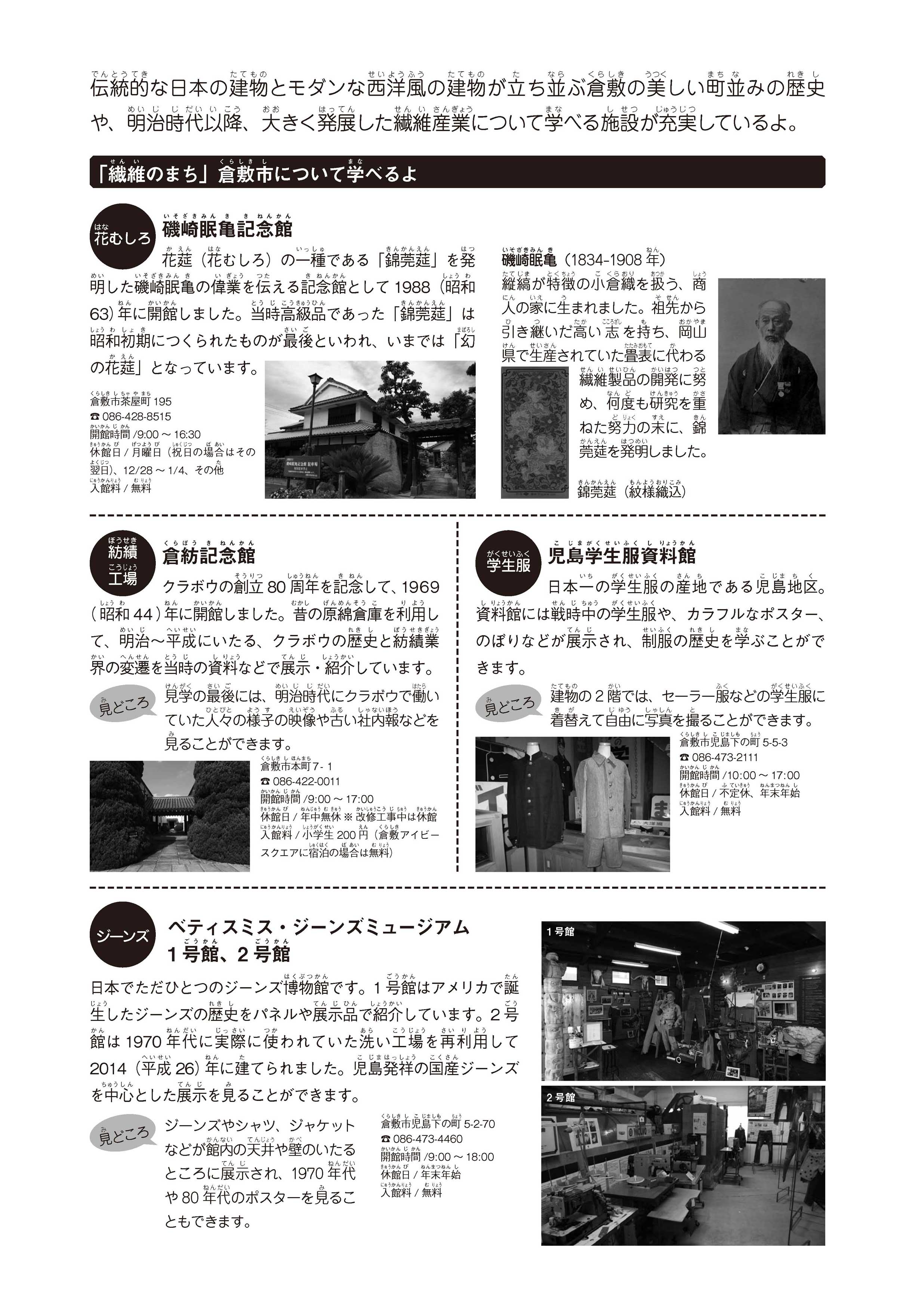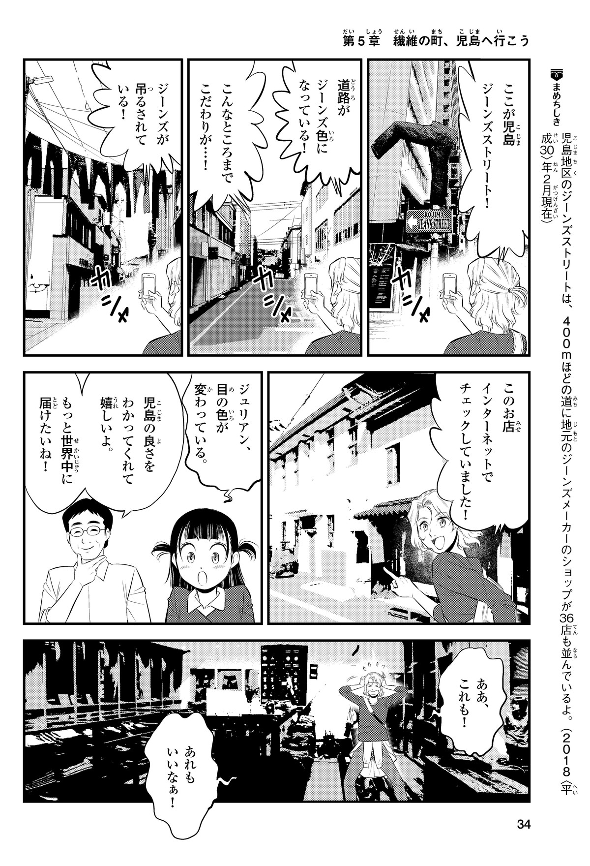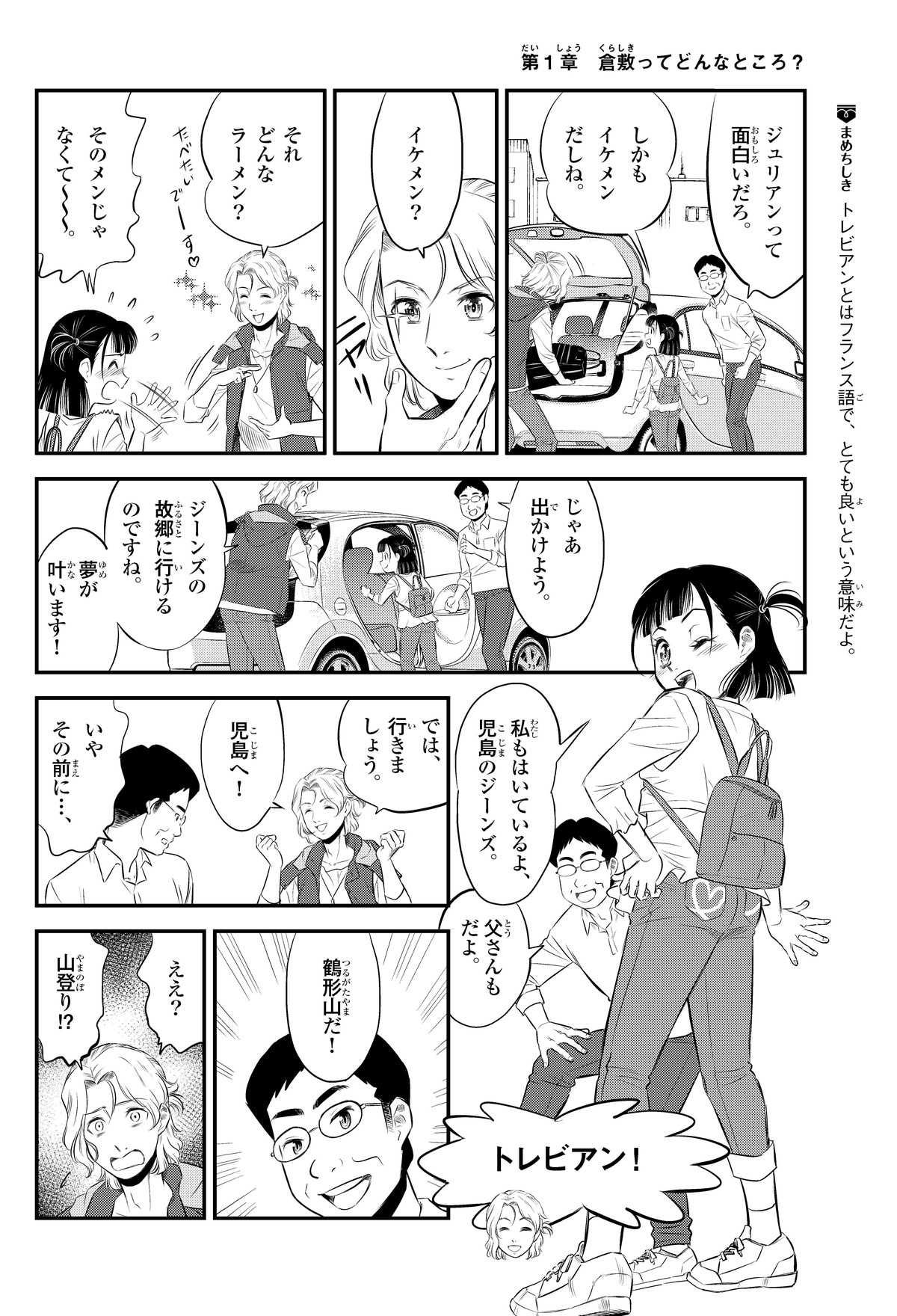 小学生のハナは、倉敷市に住む女の子。倉敷市は「繊維(せんい)のまち」として有名で、ハナのお父さんもジーンズメーカーで働いているよ。その高い技術(ぎじゅつ)で作られた倉敷市のジーンズに惹かれて日本に来た、フランス人のジュリアン。ハナとジュリアンは、倉敷市がもともと海だったこと、干拓した土地に綿花を植えたことなど、倉敷市の歴史を学んでいくよ。そして、ジュリアンはあることを決意して……!?