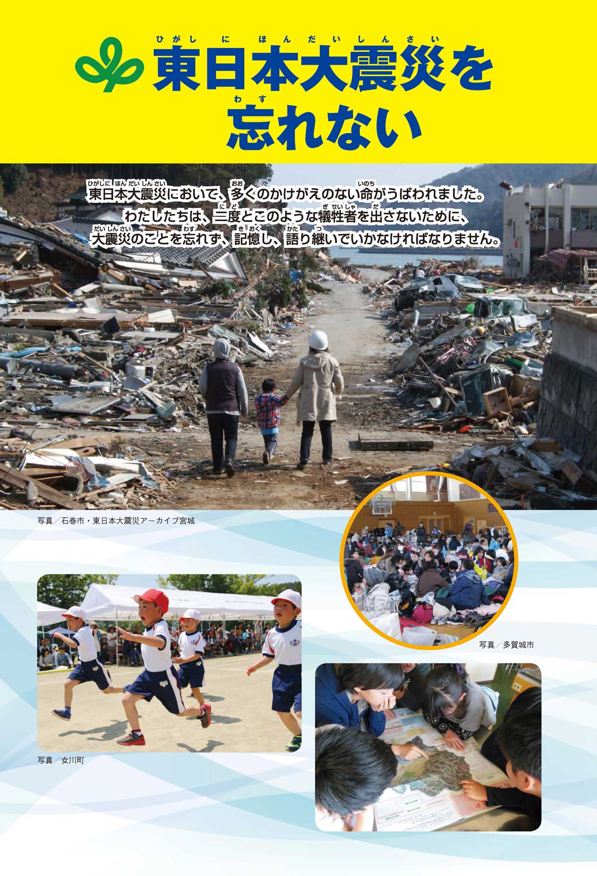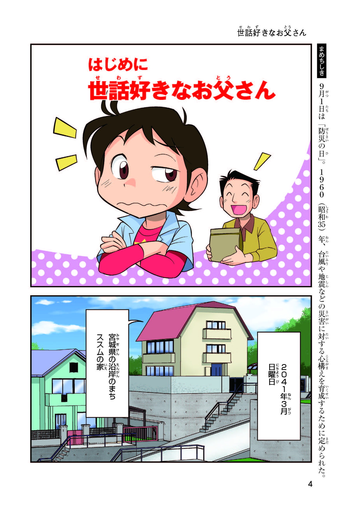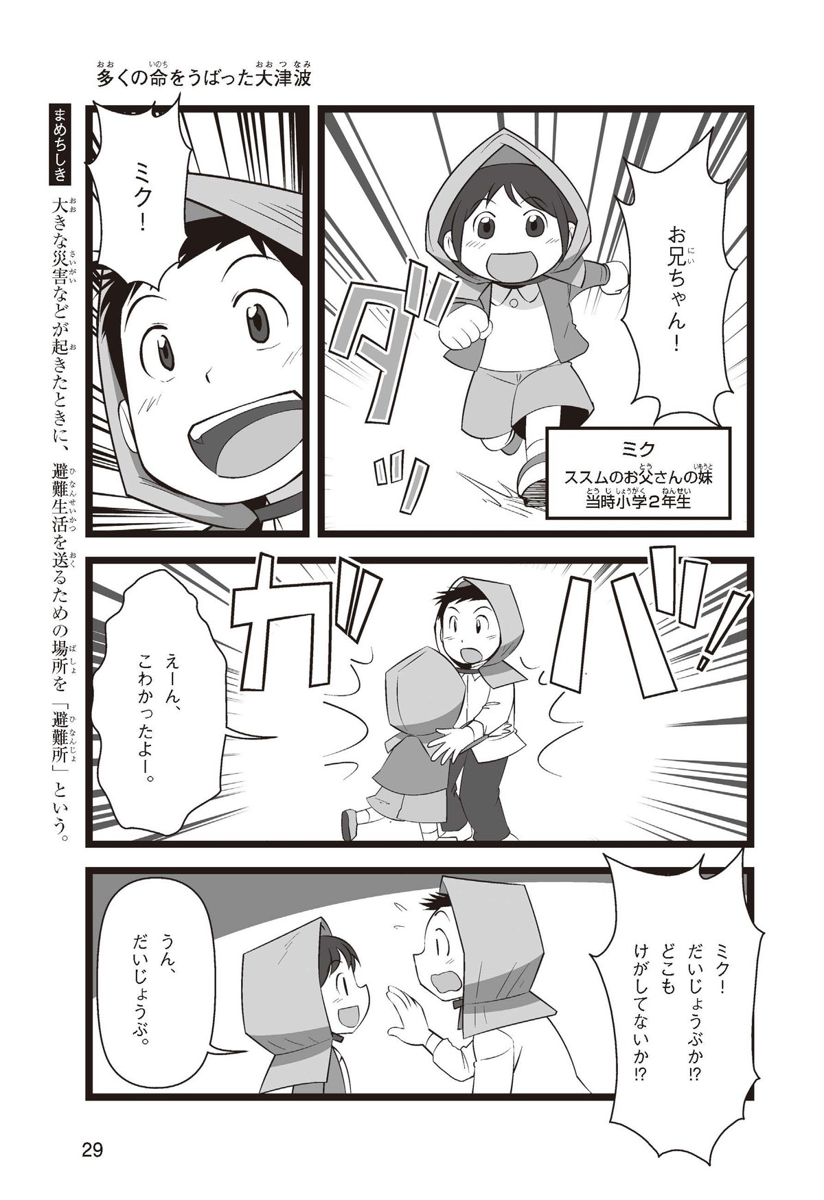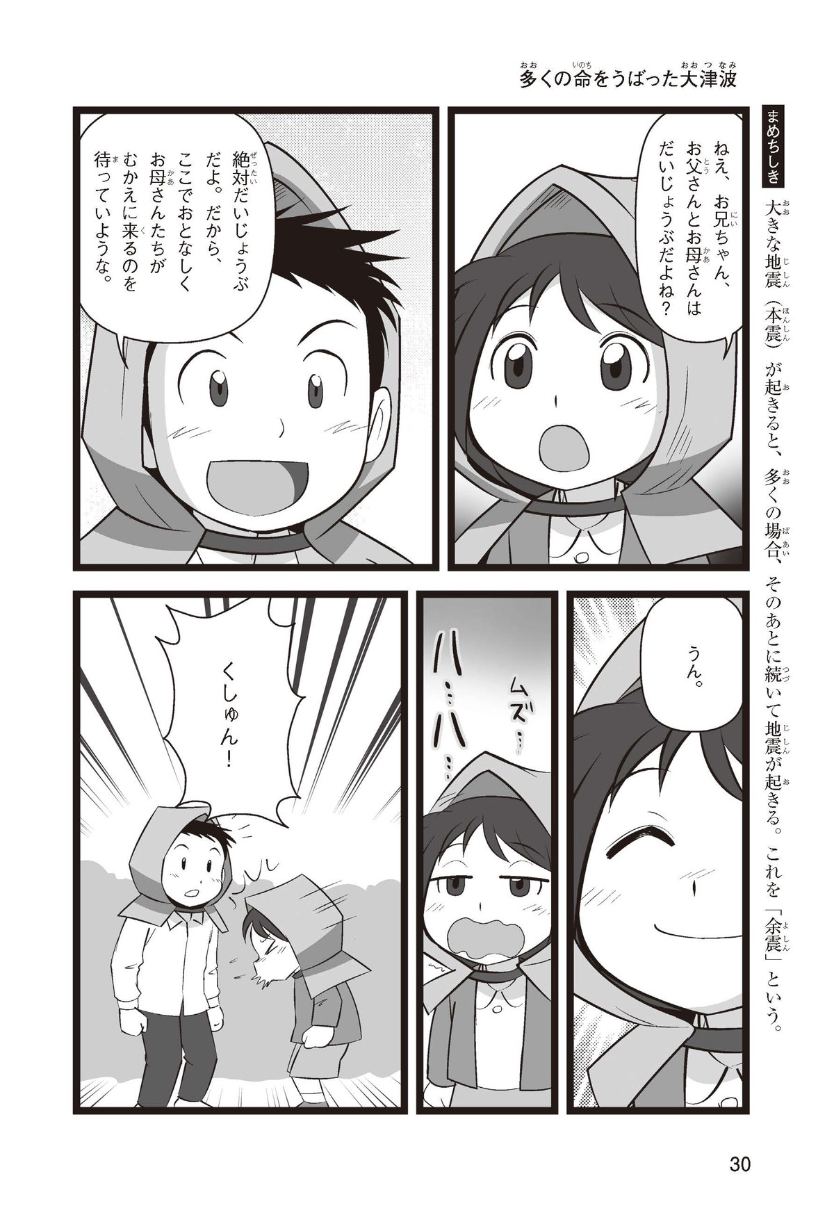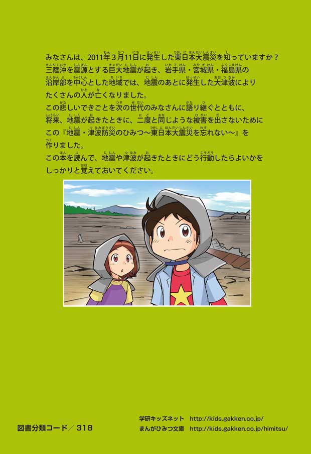 東日本大震災(ひがしにほんだいしんさい)から30年後の2041年3月11日。宮城県に住むススムとナツキは、ススムの両親から東日本大震災の時の体験(たいけん)を初めてくわしく聞くことになったよ。地震や津波のおそろしさを身近に感じたふたりは、被災(ひさい)した小学校を訪(たず)ねたり、当時の話を聞いたりして、改めて防災の大切さを知っていくよ。