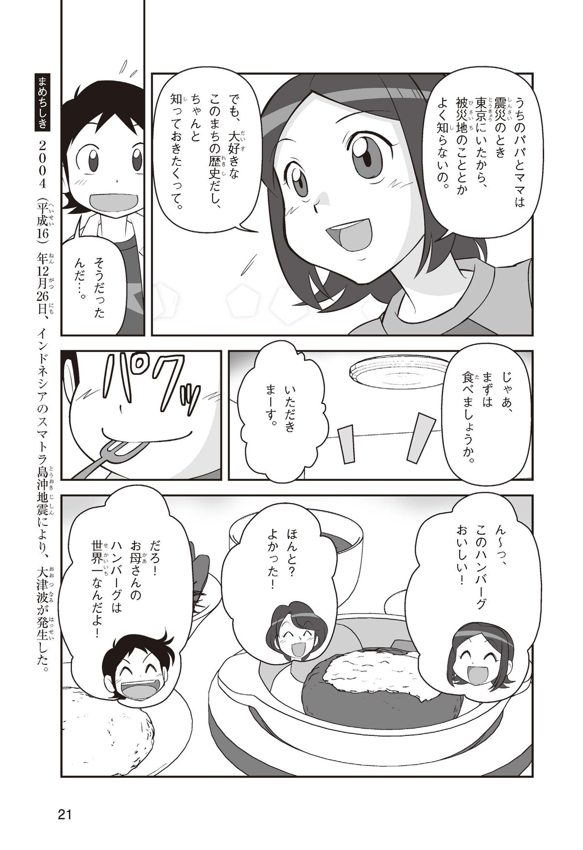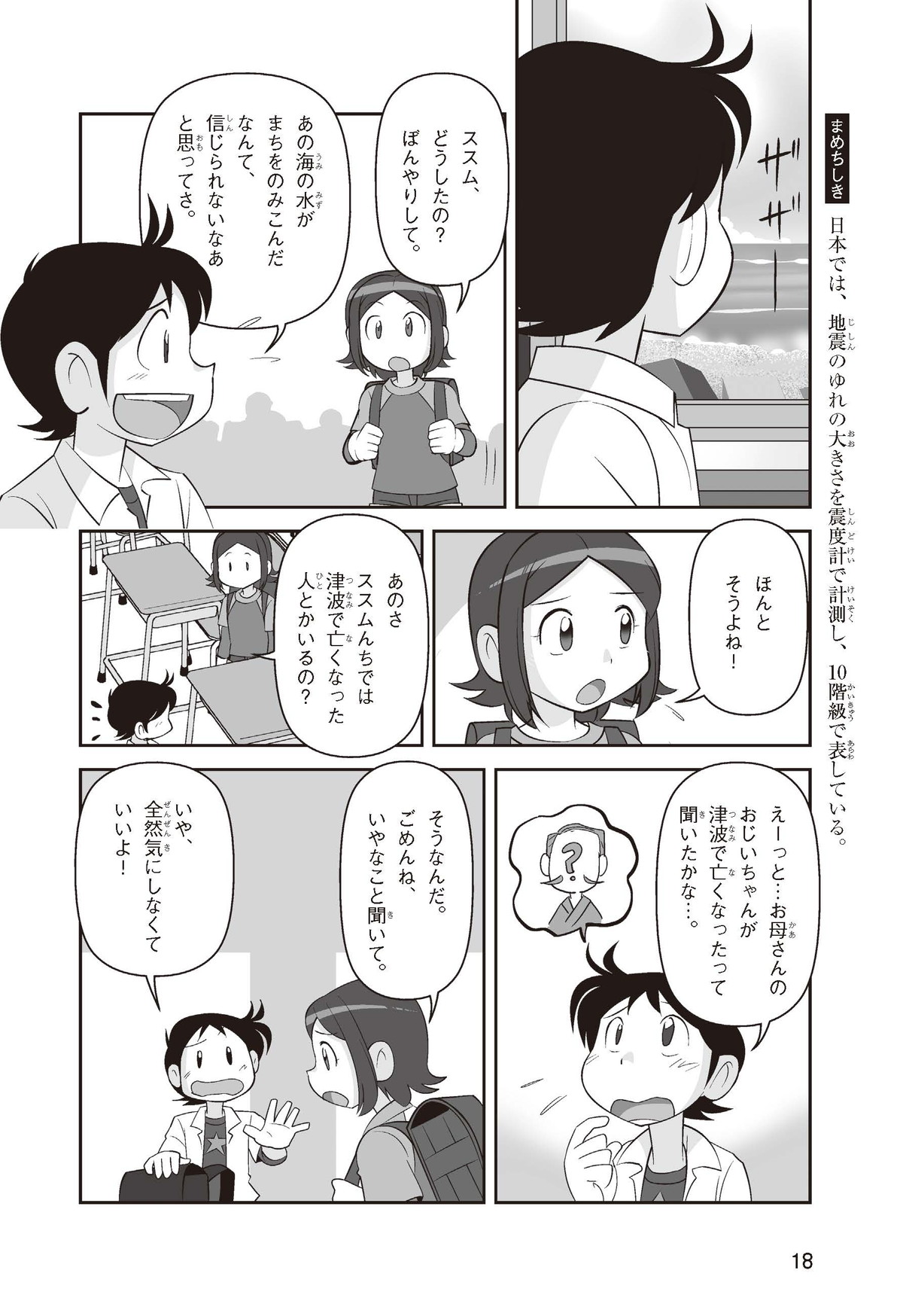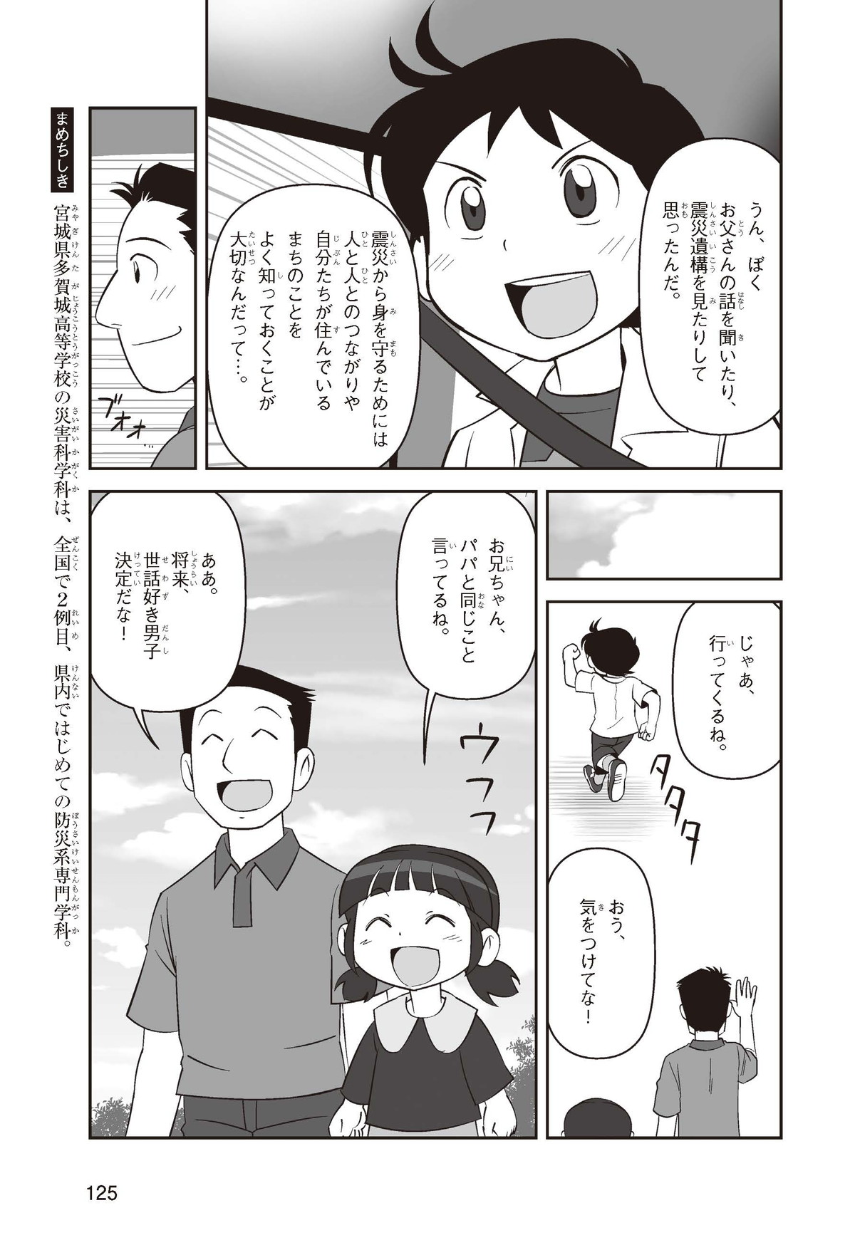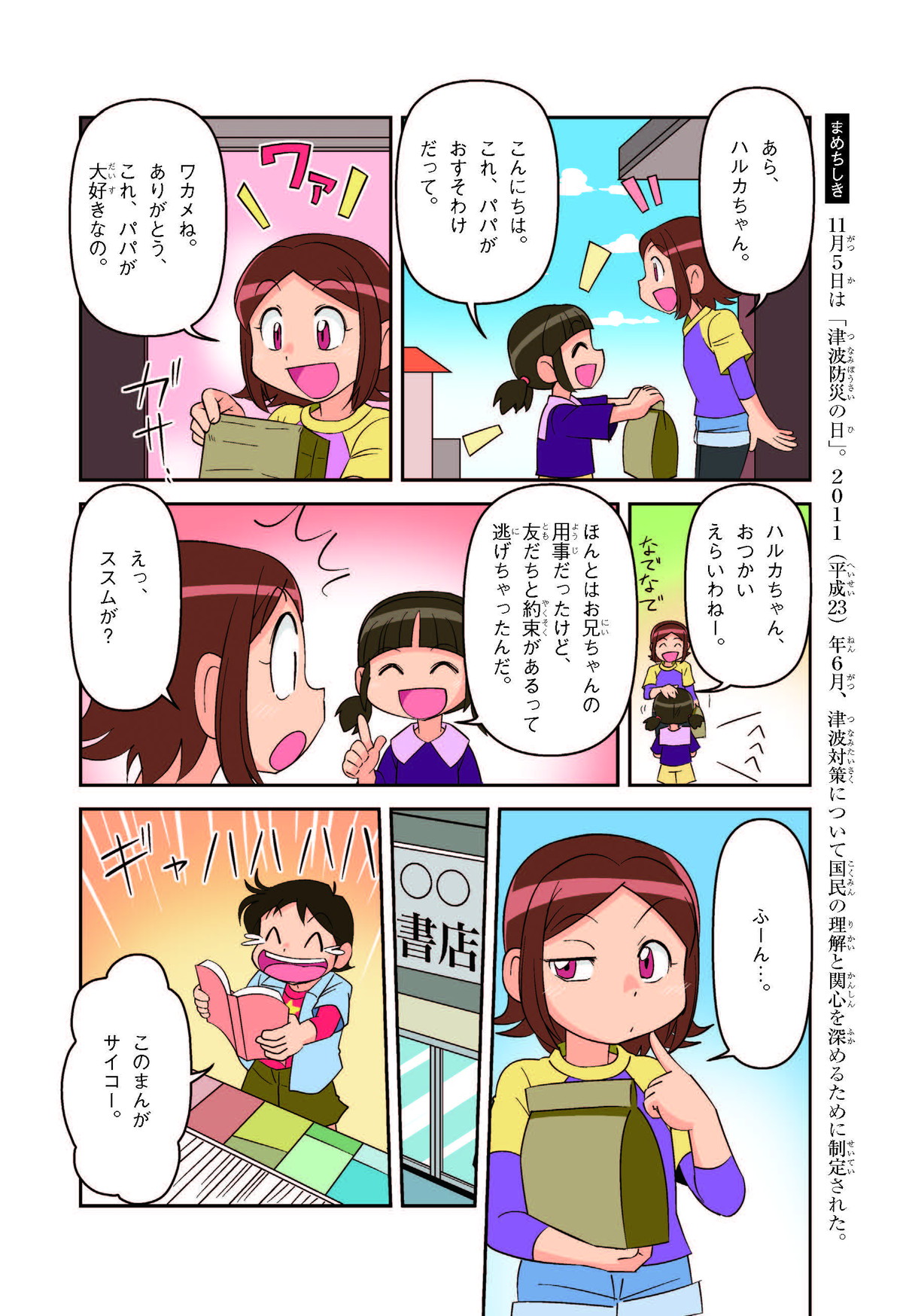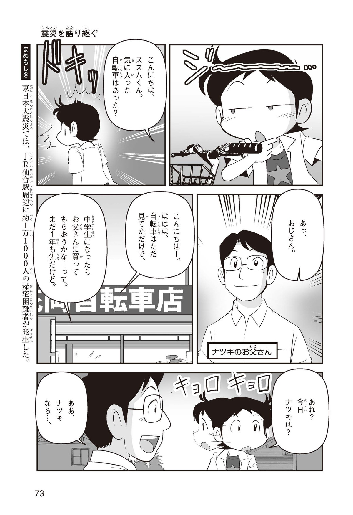 東日本大震災(ひがしにほんだいしんさい)から30年後の2041年3月11日。宮城県に住むススムとナツキは、ススムの両親から東日本大震災の時の体験(たいけん)を初めてくわしく聞くことになったよ。地震や津波のおそろしさを身近に感じたふたりは、被災(ひさい)した小学校を訪(たず)ねたり、当時の話を聞いたりして、改めて防災の大切さを知っていくよ。