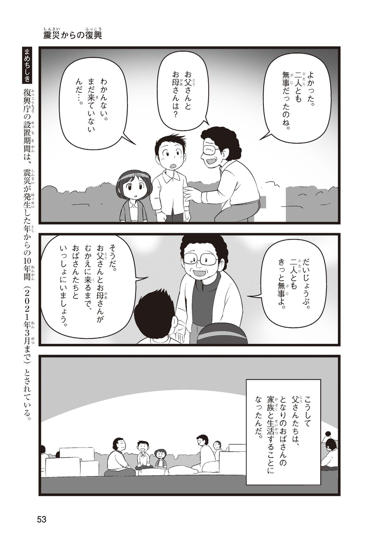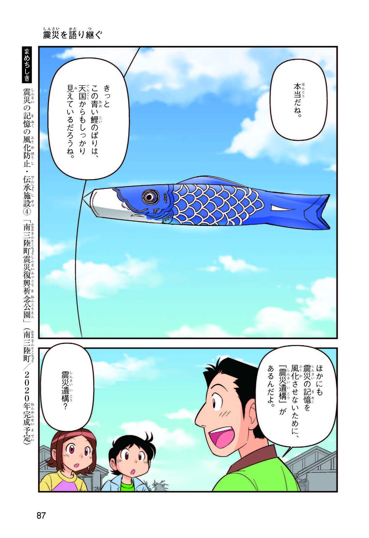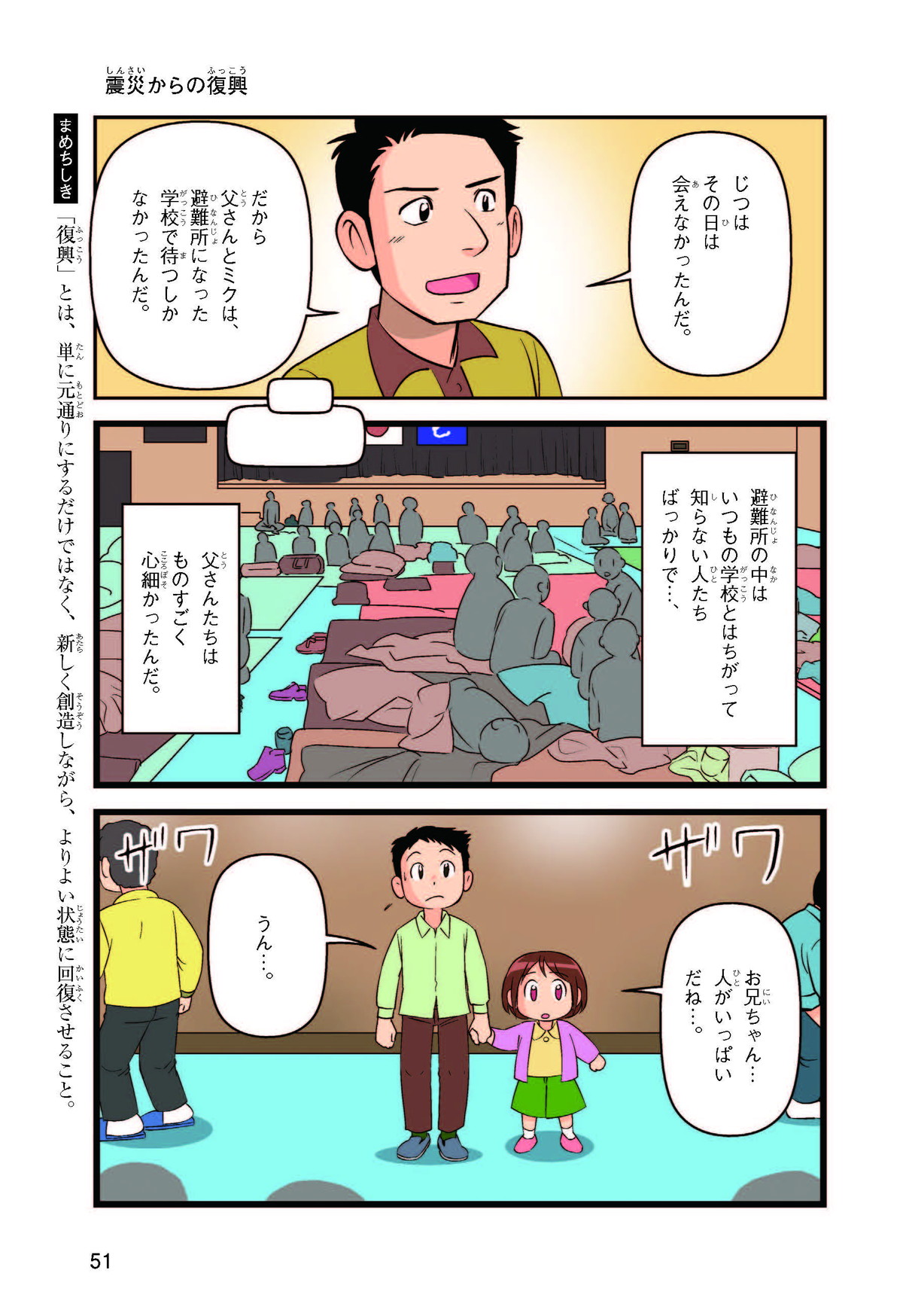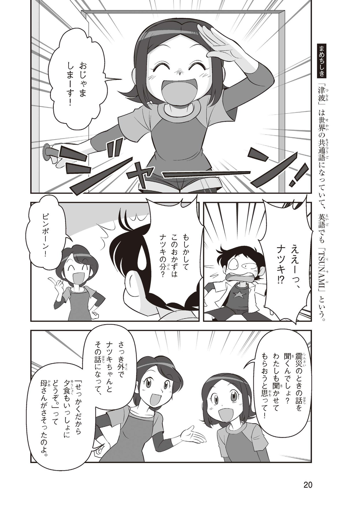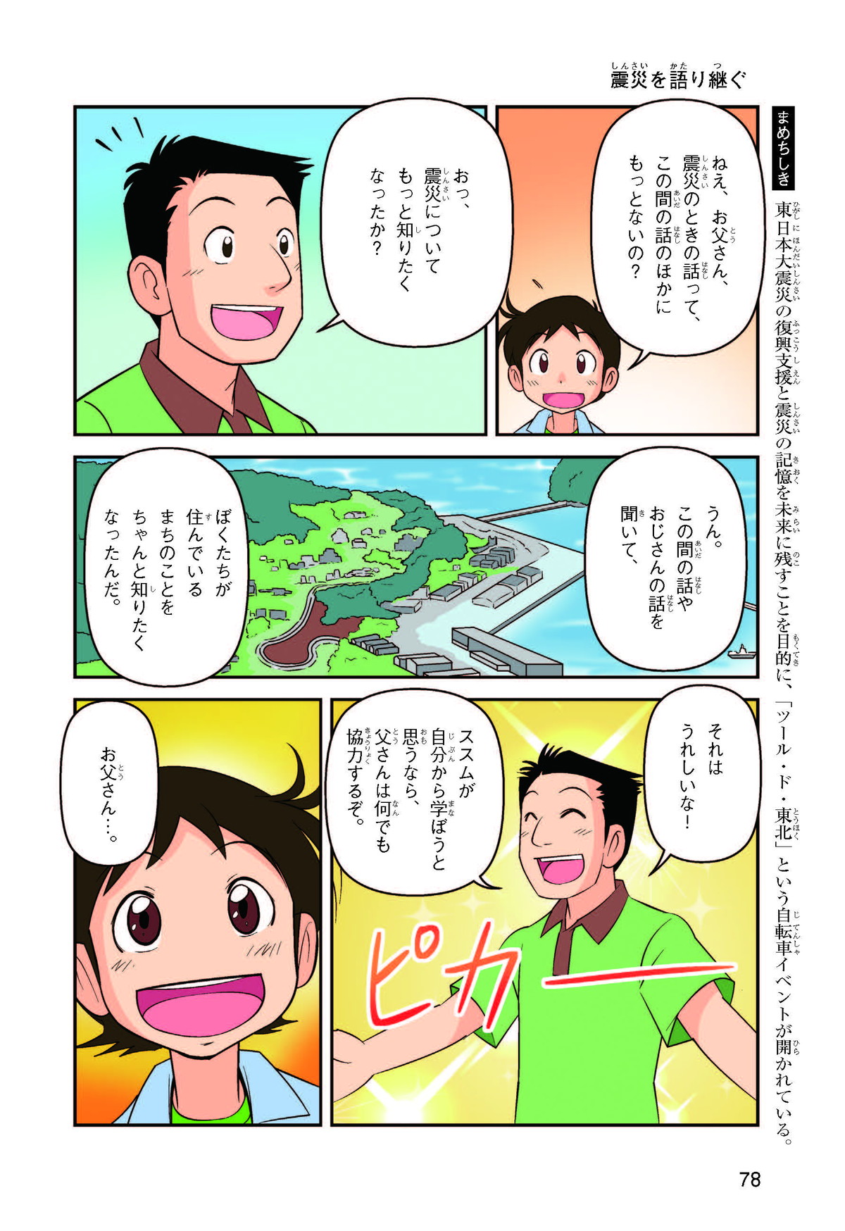 東日本大震災(ひがしにほんだいしんさい)から30年後の2041年3月11日。宮城県に住むススムとナツキは、ススムの両親から東日本大震災の時の体験(たいけん)を初めてくわしく聞くことになったよ。地震や津波のおそろしさを身近に感じたふたりは、被災(ひさい)した小学校を訪(たず)ねたり、当時の話を聞いたりして、改めて防災の大切さを知っていくよ。