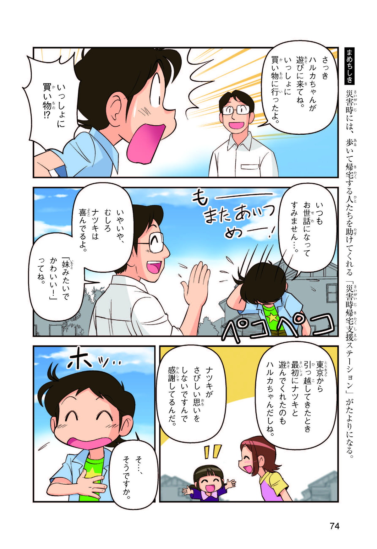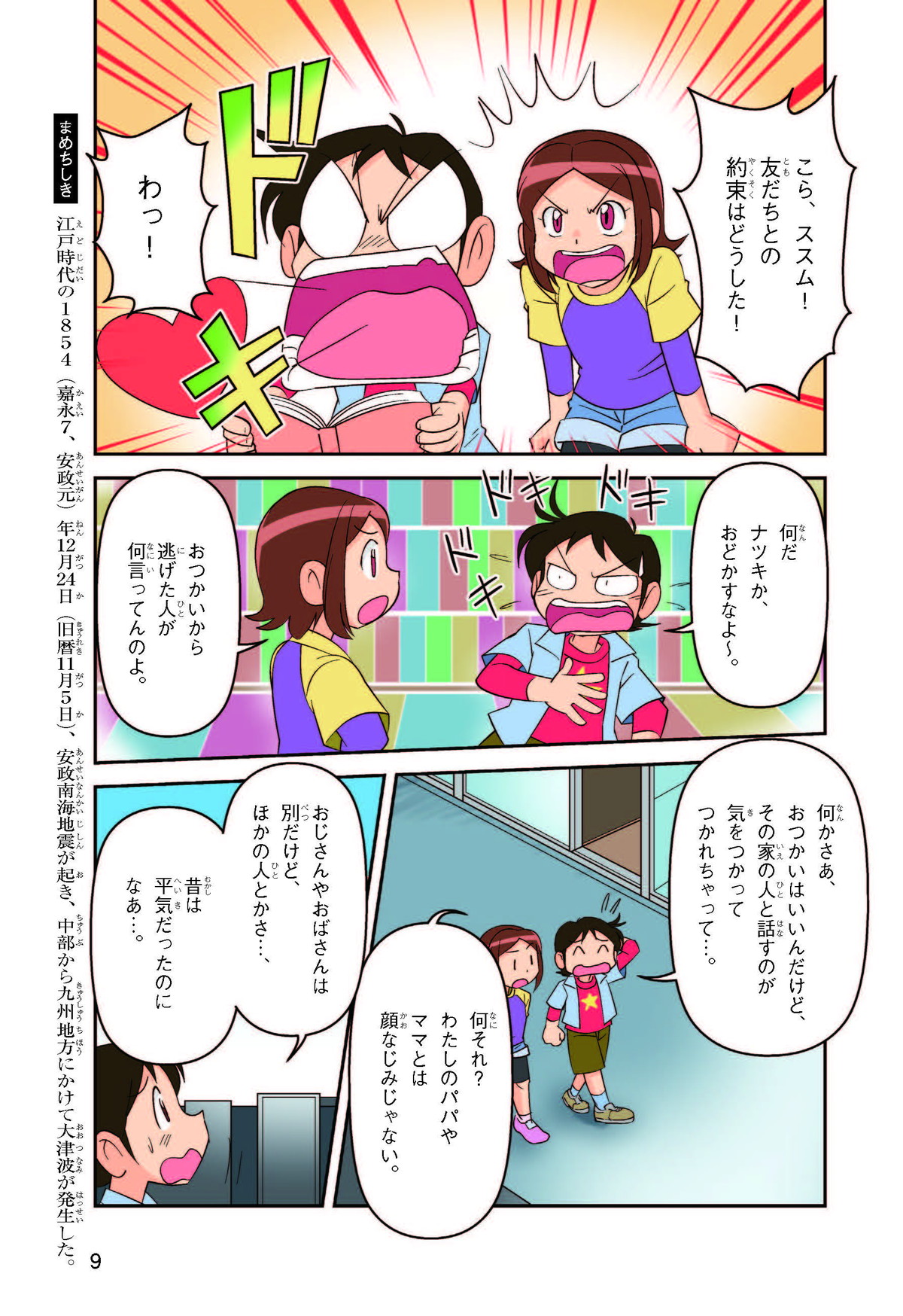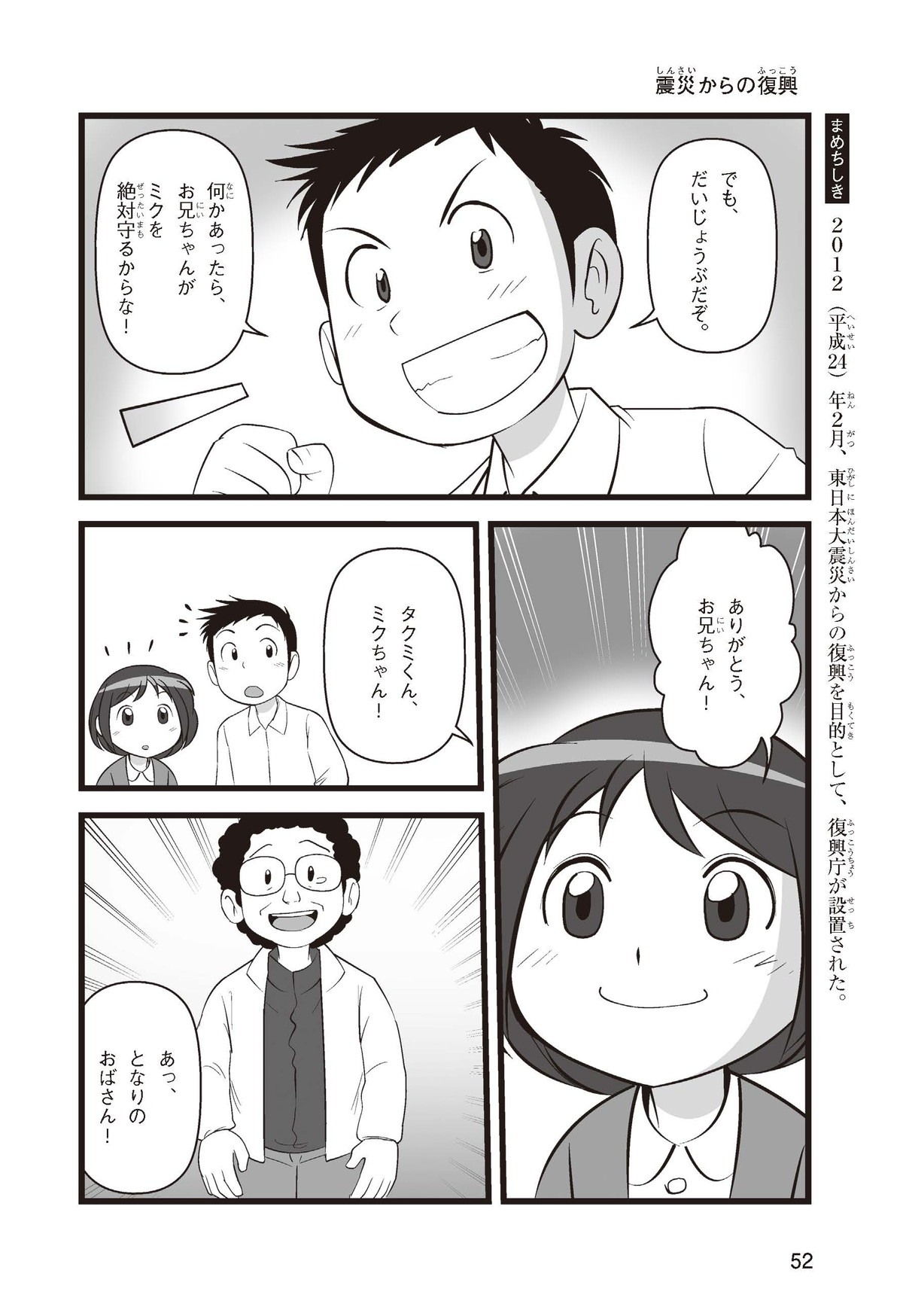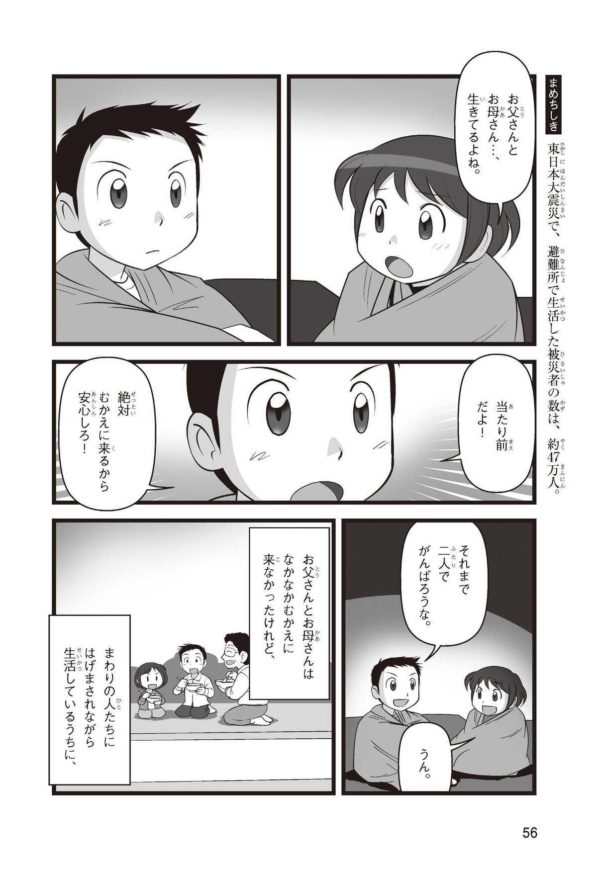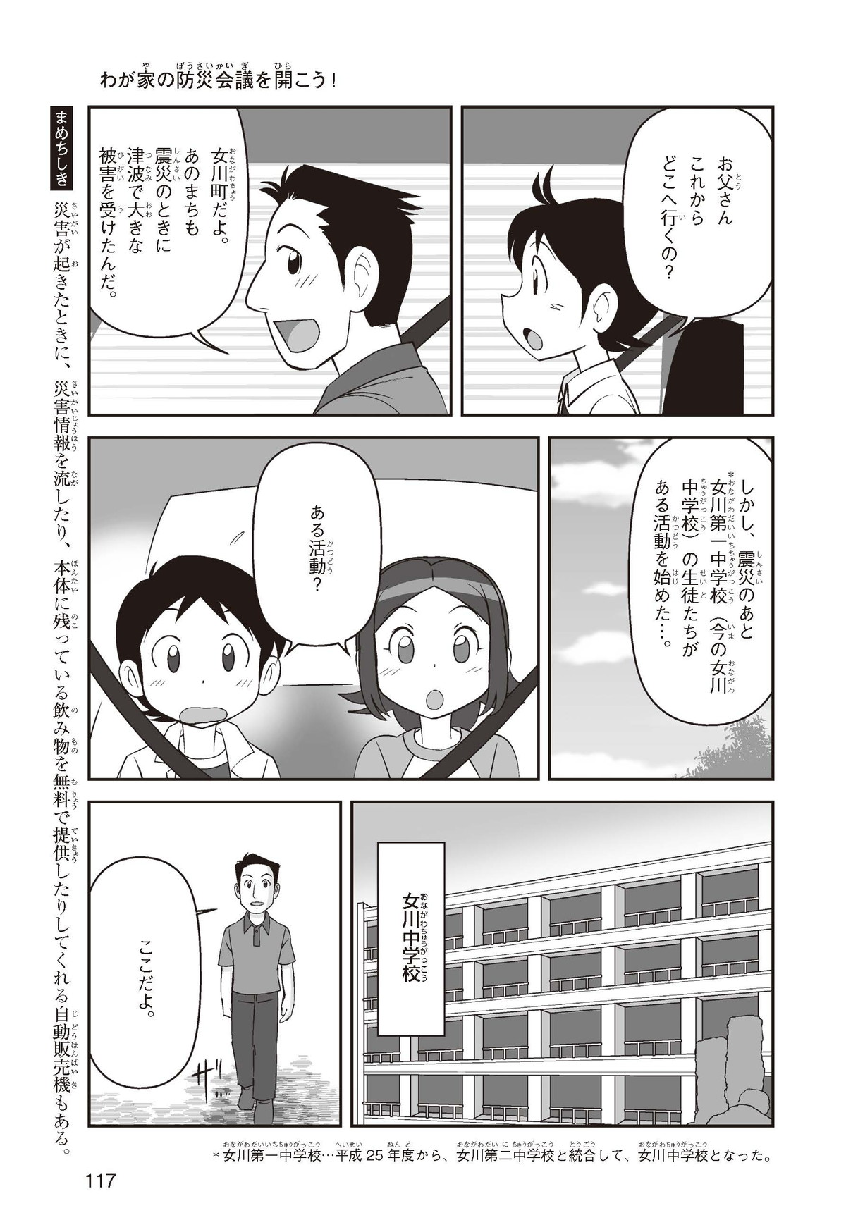 東日本大震災(ひがしにほんだいしんさい)から30年後の2041年3月11日。宮城県に住むススムとナツキは、ススムの両親から東日本大震災の時の体験(たいけん)を初めてくわしく聞くことになったよ。地震や津波のおそろしさを身近に感じたふたりは、被災(ひさい)した小学校を訪(たず)ねたり、当時の話を聞いたりして、改めて防災の大切さを知っていくよ。