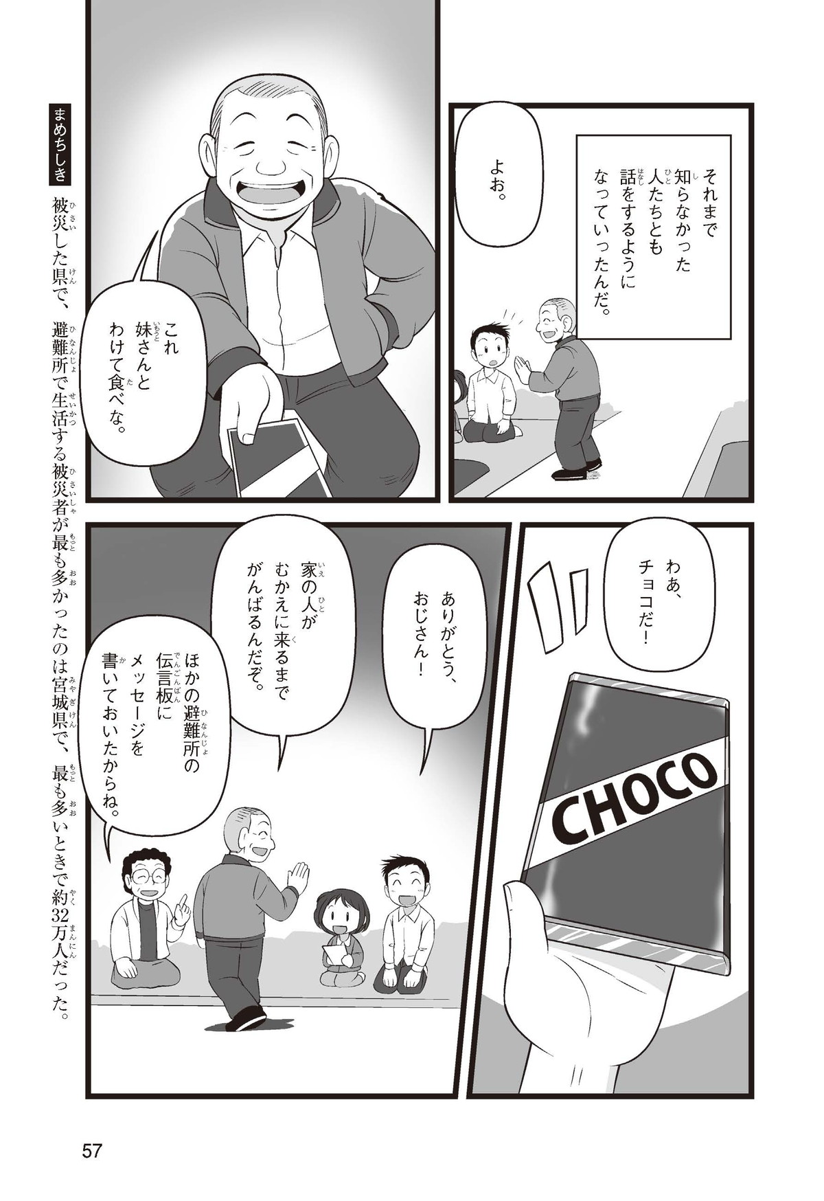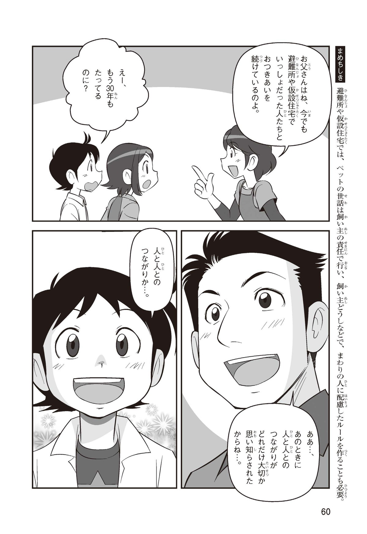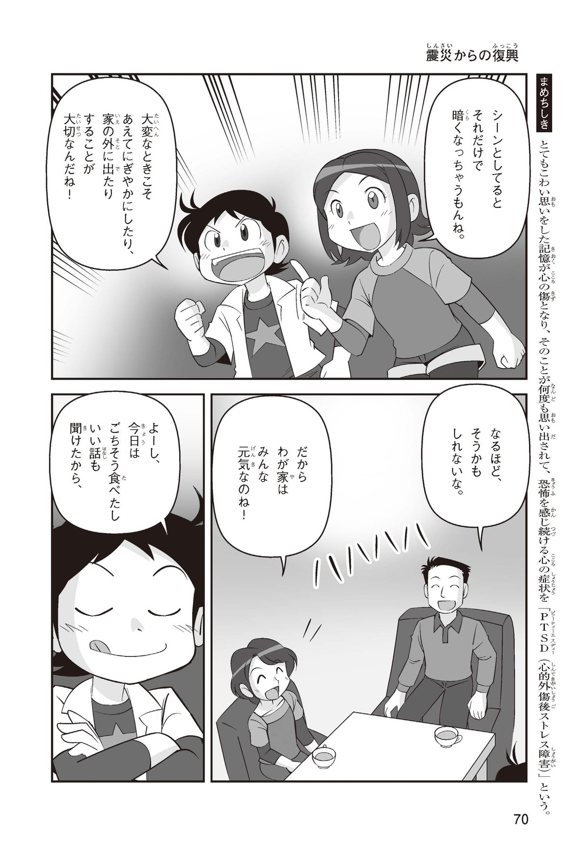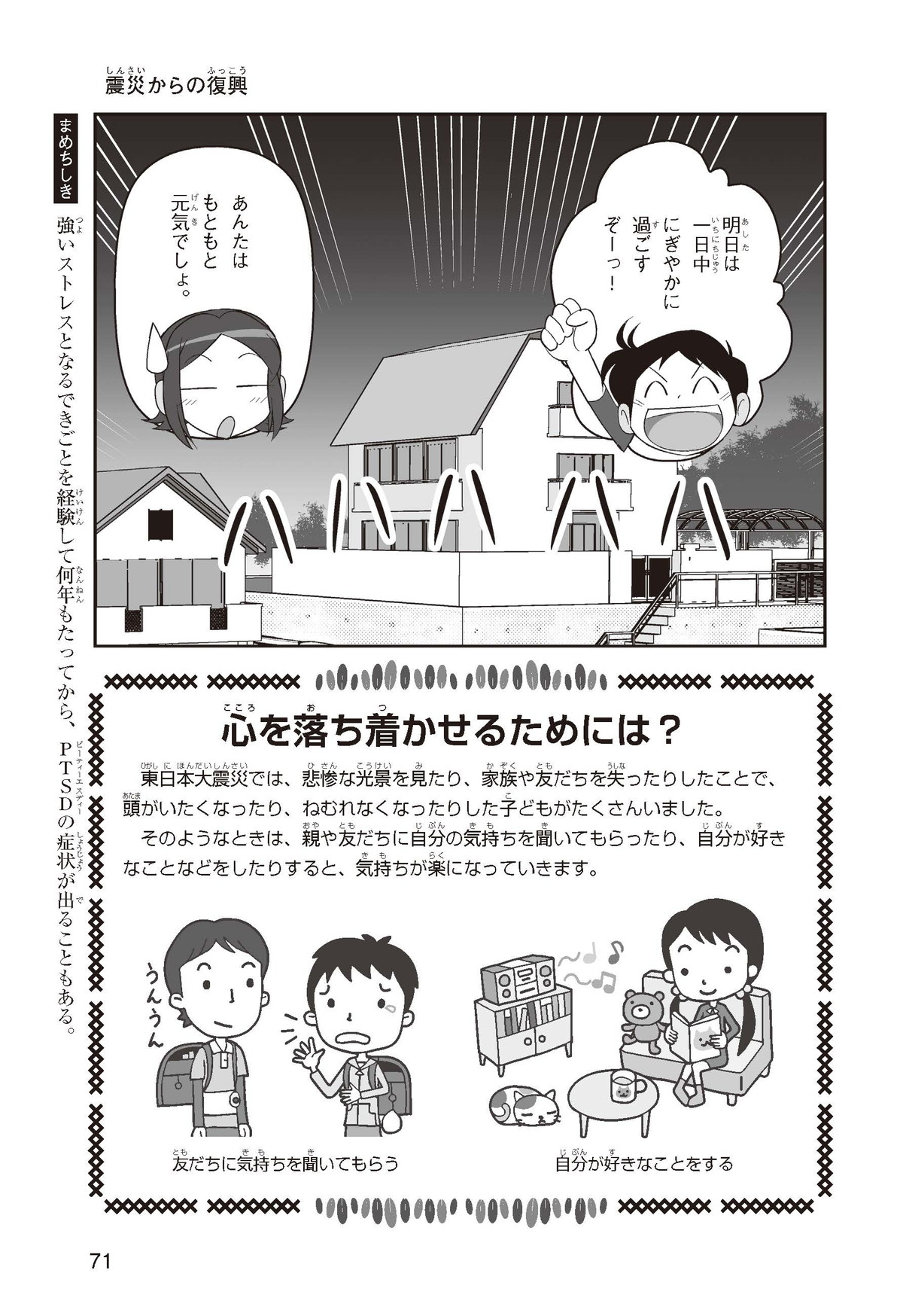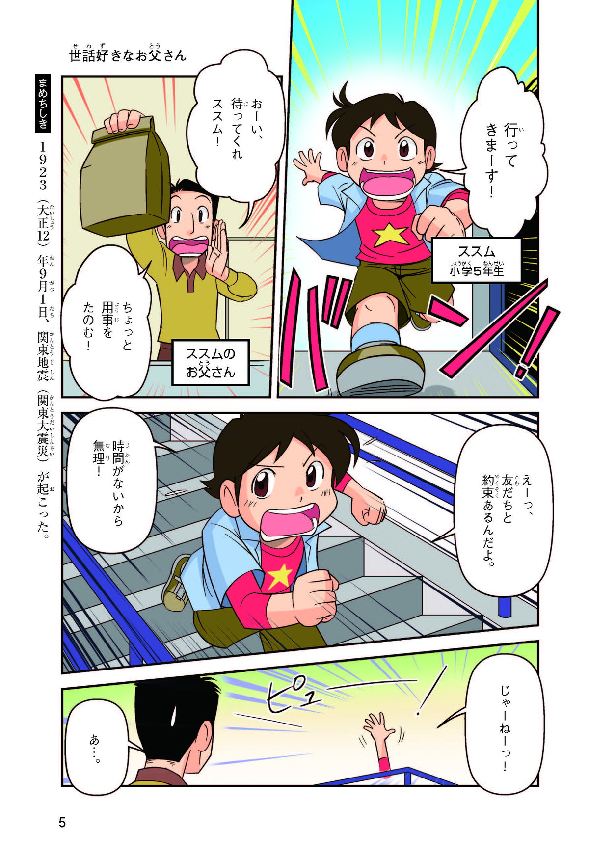東日本大震災(ひがしにほんだいしんさい)から30年後の2041年3月11日。宮城県に住むススムとナツキは、ススムの両親から東日本大震災の時の体験(たいけん)を初めてくわしく聞くことになったよ。地震や津波のおそろしさを身近に感じたふたりは、被災(ひさい)した小学校を訪(たず)ねたり、当時の話を聞いたりして、改めて防災の大切さを知っていくよ。