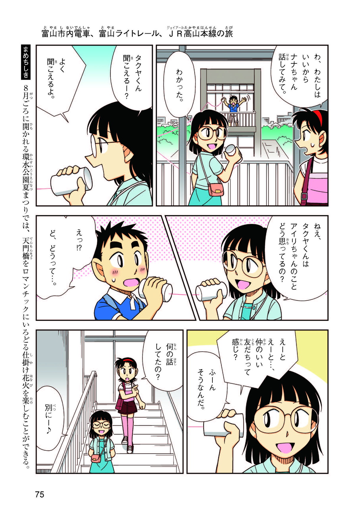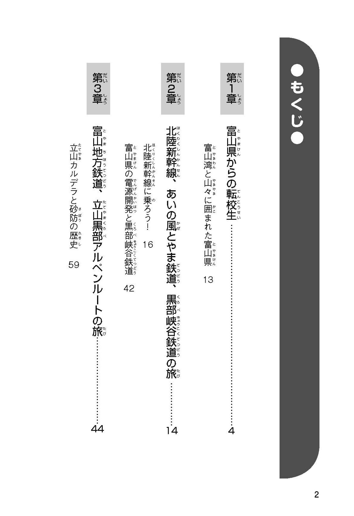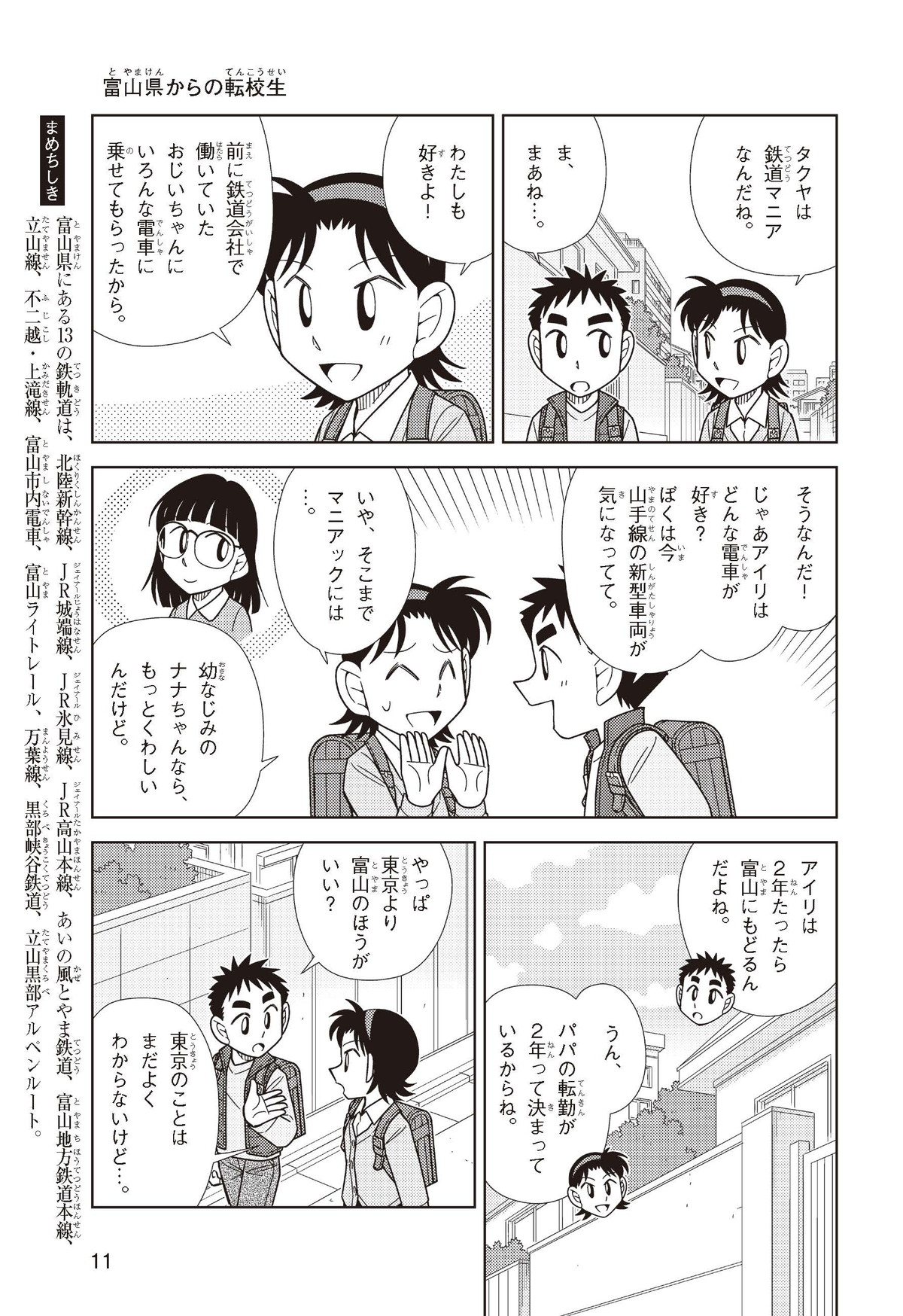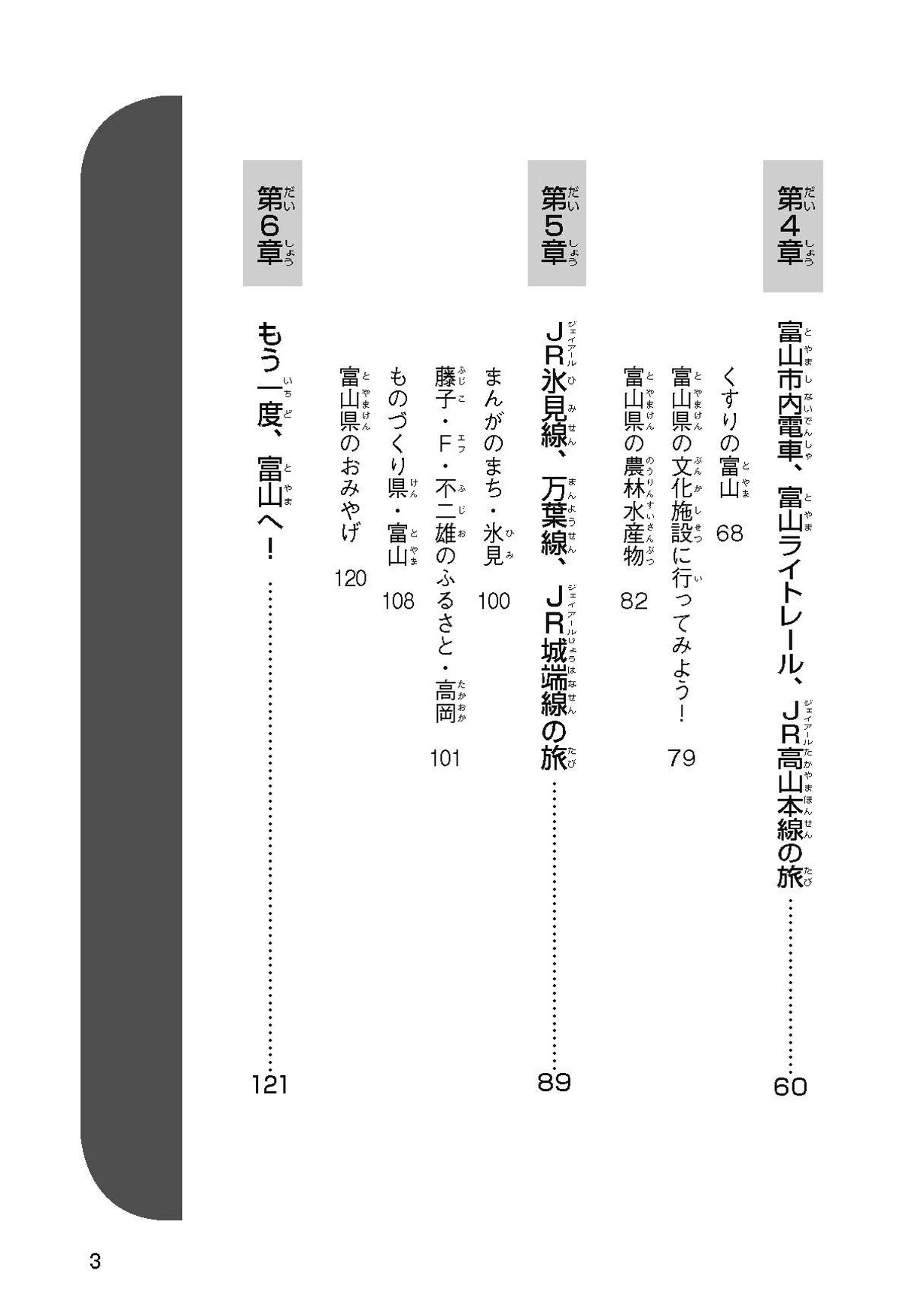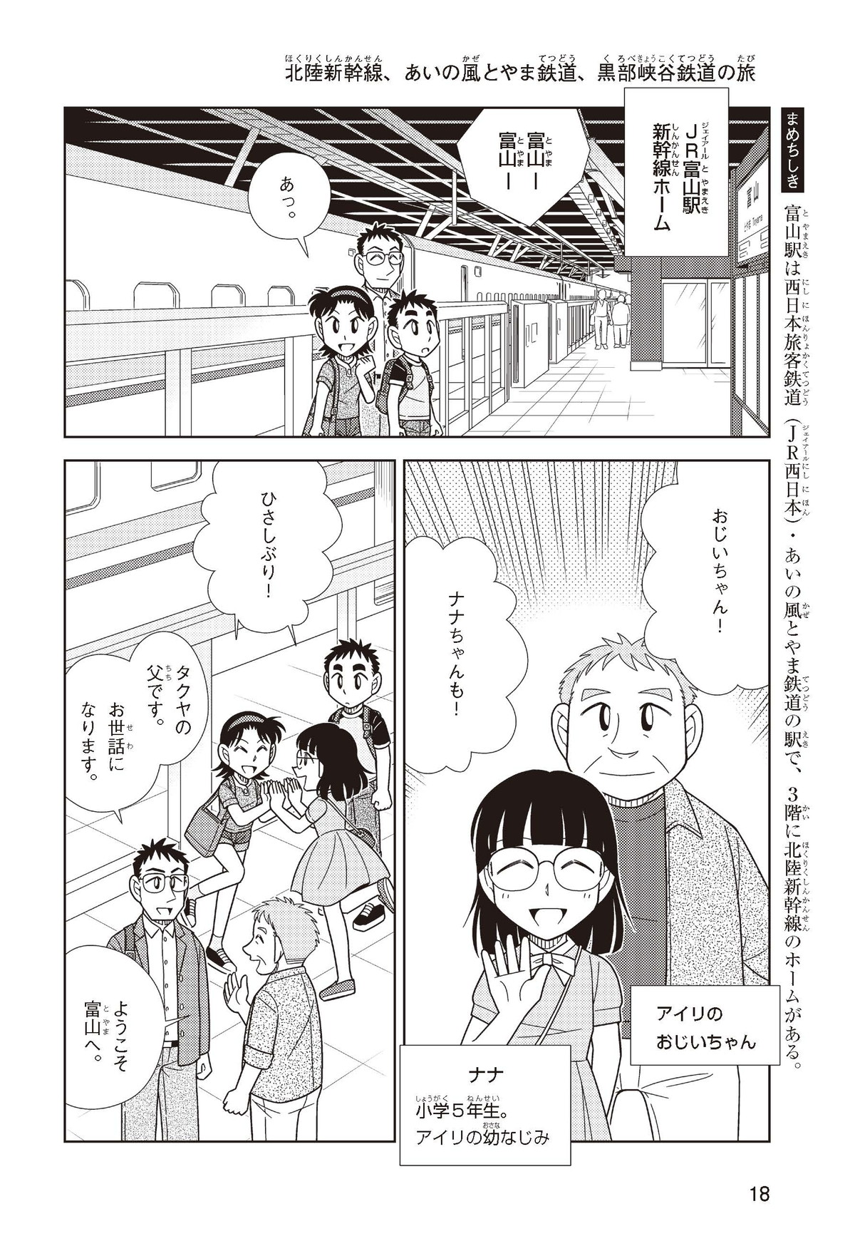 東京の小学校に通うタクヤは大の鉄道ファン。転校生アイリの出身地・富山県が“鉄軌道王国(てつきどうおうこく)”であると知って、「富山県鉄道乗りつくしの旅」に出ることに。タクヤとパパ、アイリとアイリのおじいちゃん、幼なじみのナナちゃんの5人は、豊かな自然を体験したり、富山湾の海の幸を食べたり、富山県の魅力(みりょく)を発見していくよ!