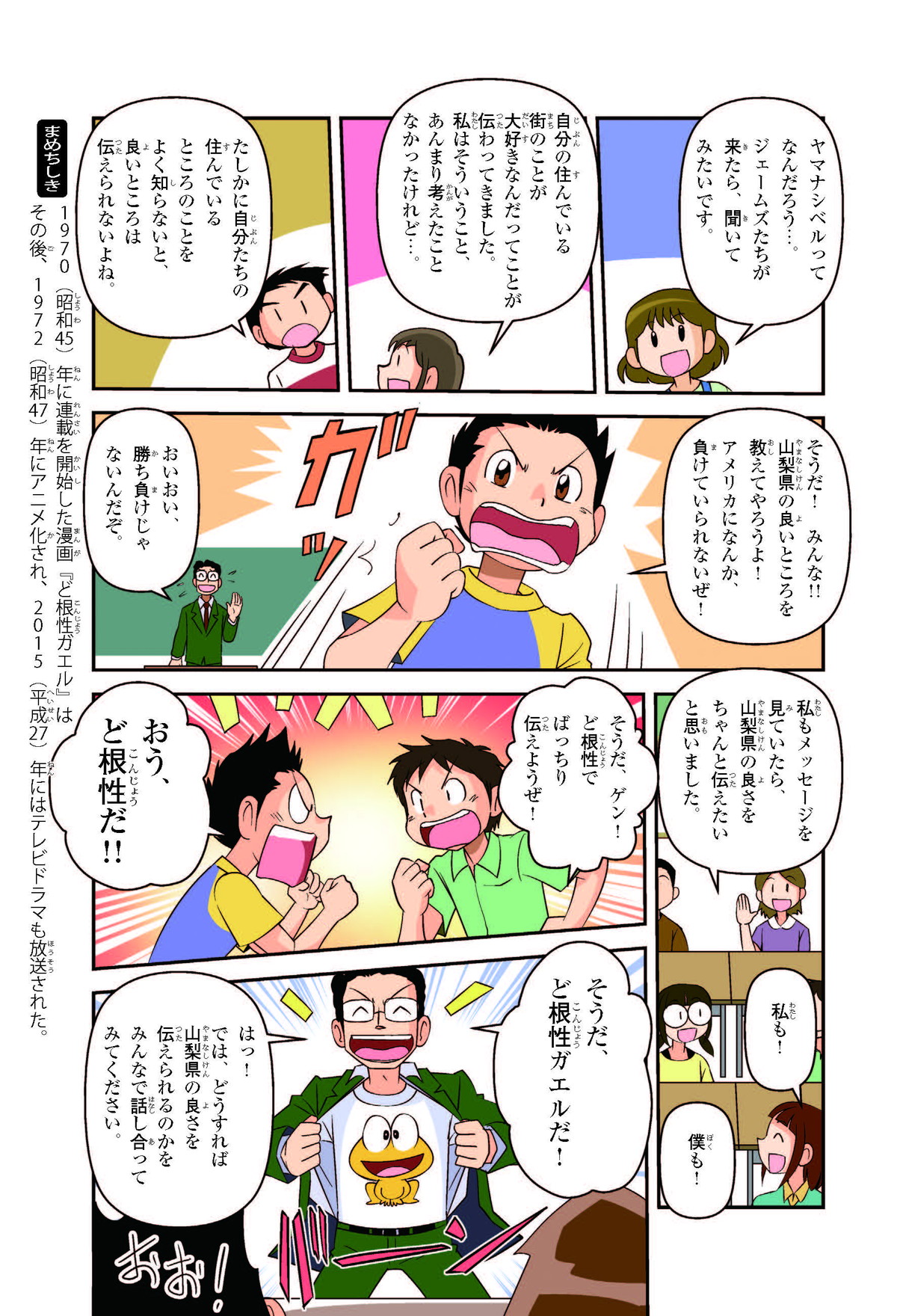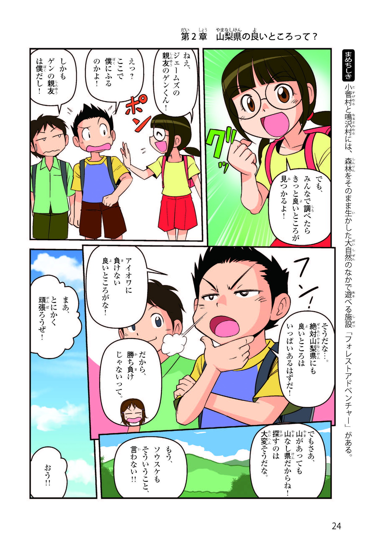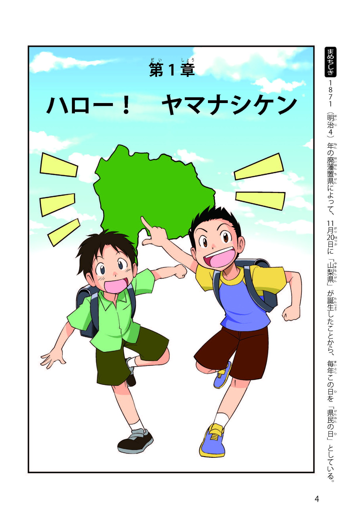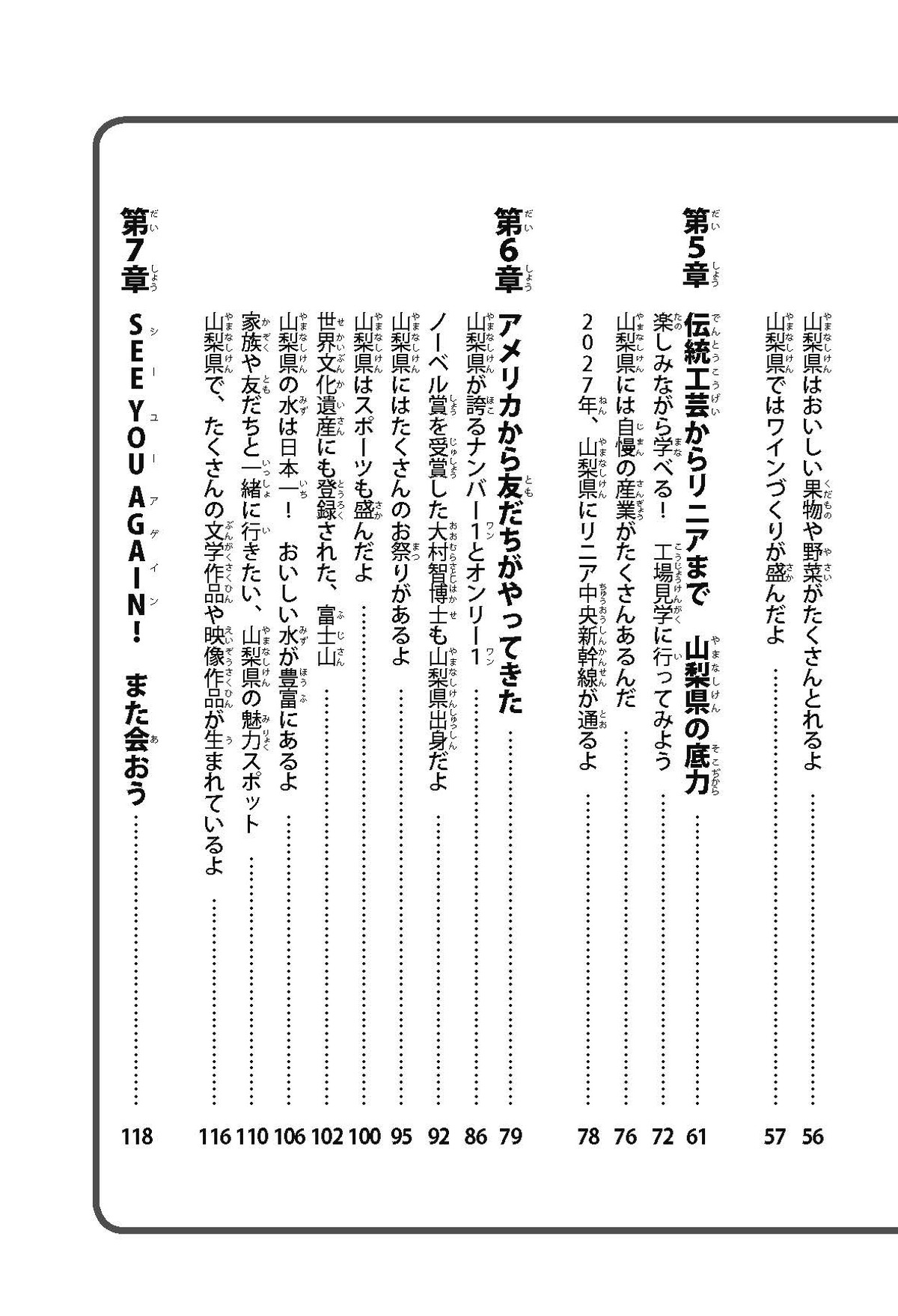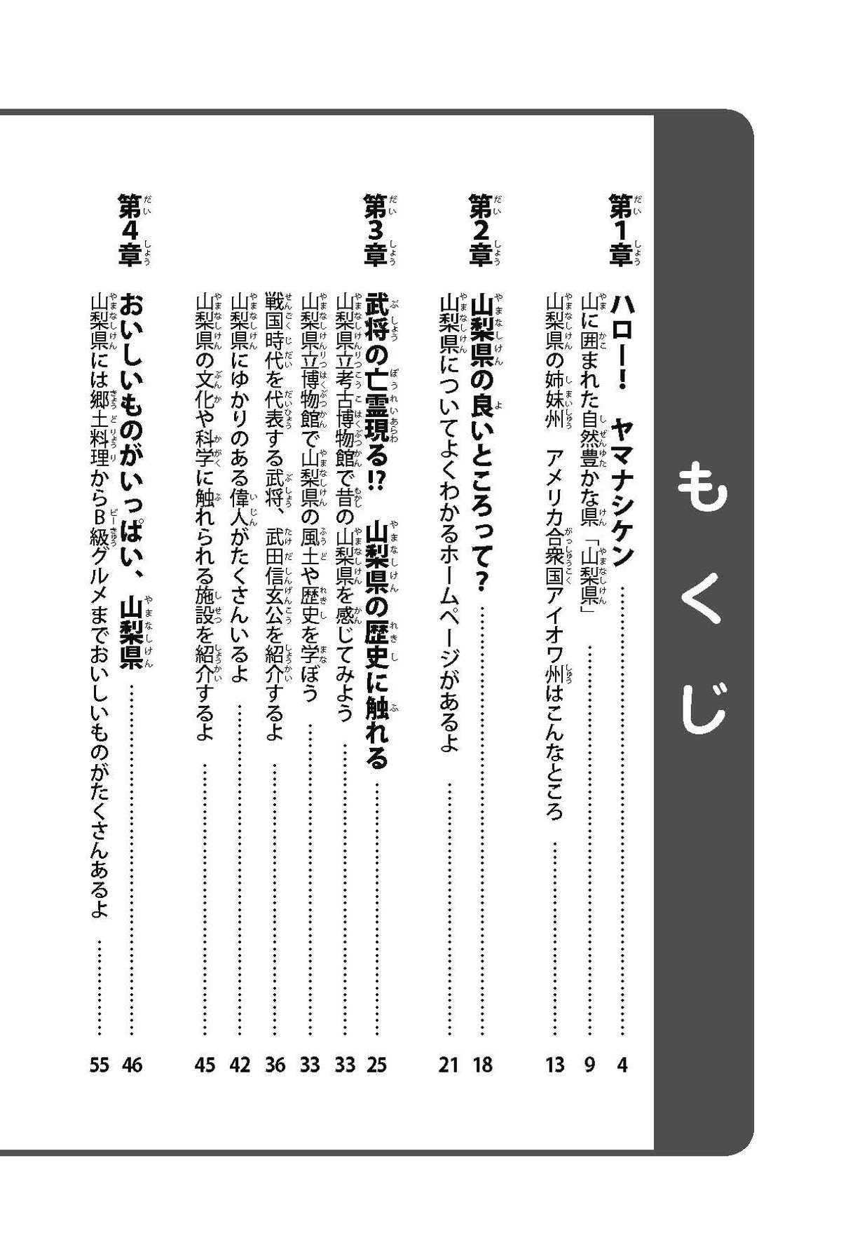 ゲンとリコは、山梨県の小学校に通う5年生。ある日、ふたりのクラスに、アメリカにある山梨県の姉妹都市・アイオワ州からの交換留学生がやってくることに。さっそくゲンとリコのクラスでは、交換留学生のジェームズとエマに、自分たちの住む山梨県の魅力を紹介するために、山梨県の良いところ探しを始めるよ。世界文化遺産の富士山に、ぶどうやももをはじめとする農産物、武田信玄公など多くの偉人を生んだ歴史、伝統工芸からリニアモーターカーの開発までとっても幅広い産業……。ほかにもたくさんの山梨県の魅力を発見していくよ!
