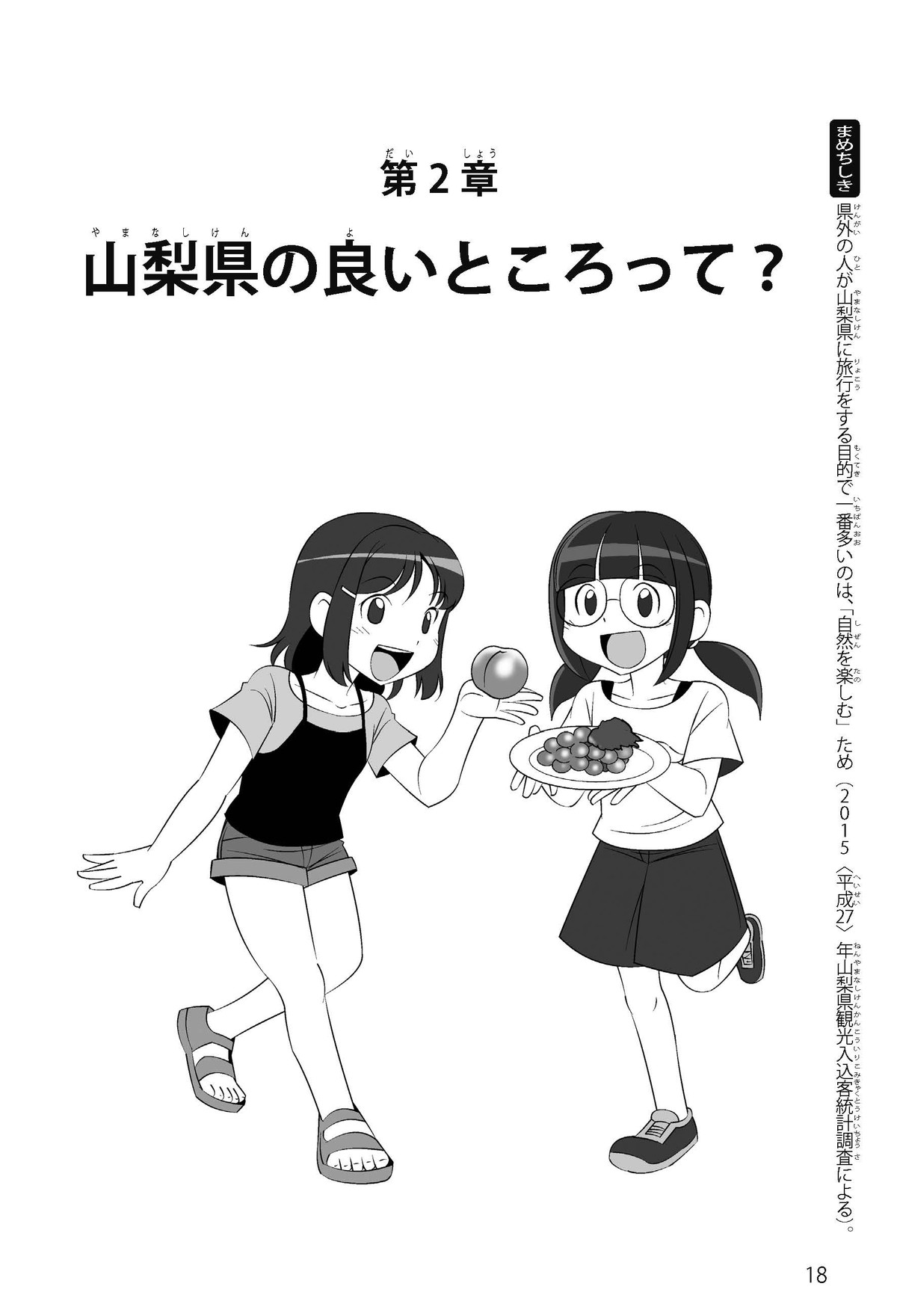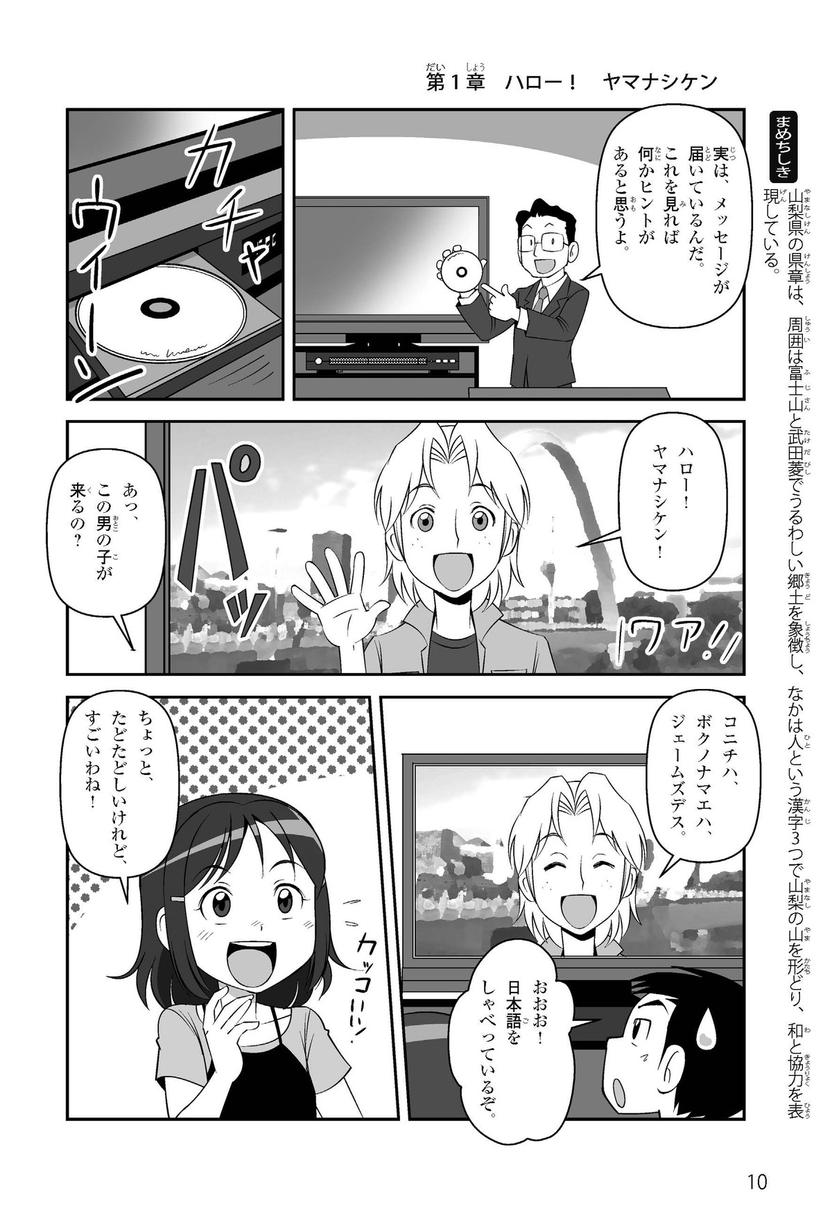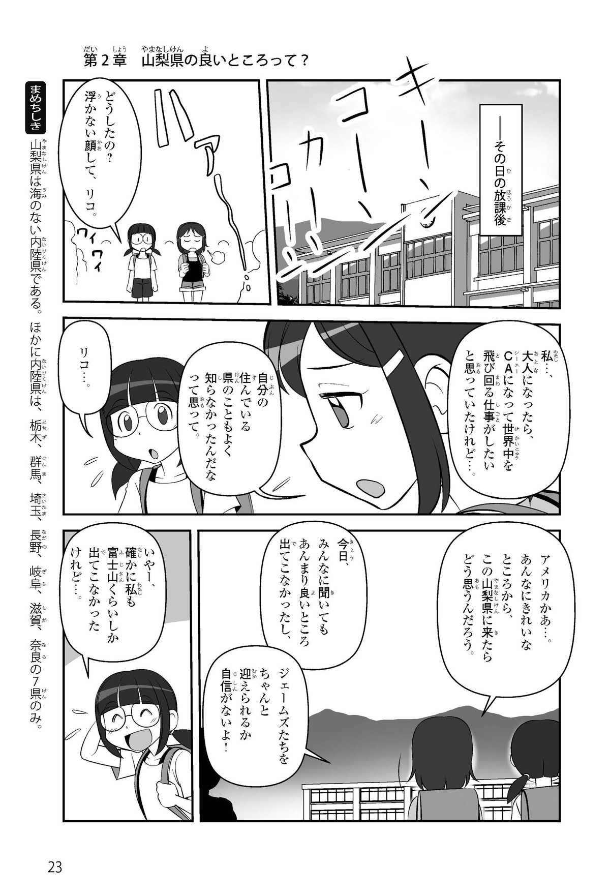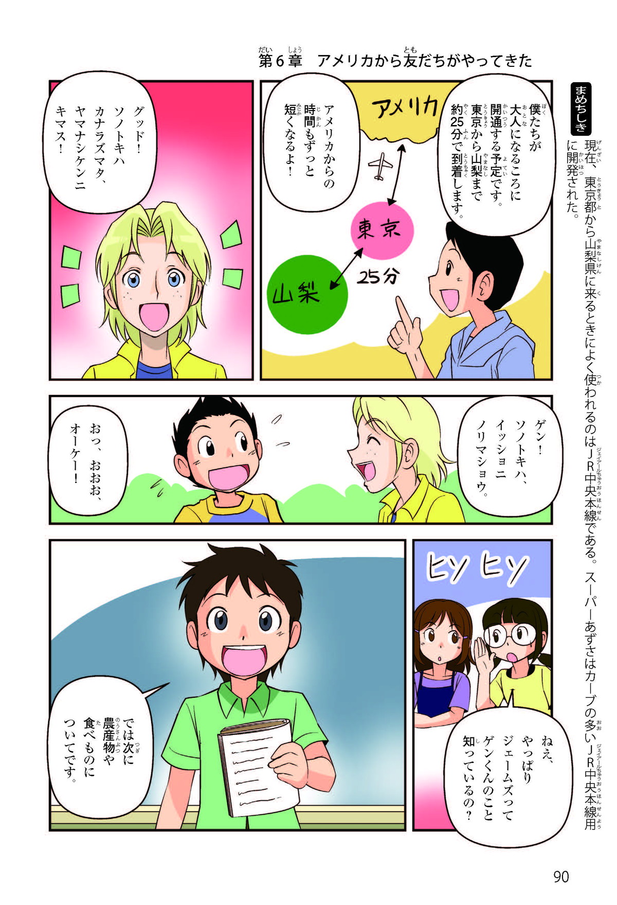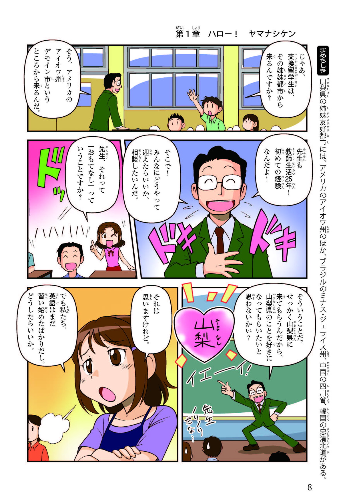 ゲンとリコは、山梨県の小学校に通う5年生。ある日、ふたりのクラスに、アメリカにある山梨県の姉妹都市・アイオワ州からの交換留学生がやってくることに。さっそくゲンとリコのクラスでは、交換留学生のジェームズとエマに、自分たちの住む山梨県の魅力を紹介するために、山梨県の良いところ探しを始めるよ。世界文化遺産の富士山に、ぶどうやももをはじめとする農産物、武田信玄公など多くの偉人を生んだ歴史、伝統工芸からリニアモーターカーの開発までとっても幅広い産業……。ほかにもたくさんの山梨県の魅力を発見していくよ!
