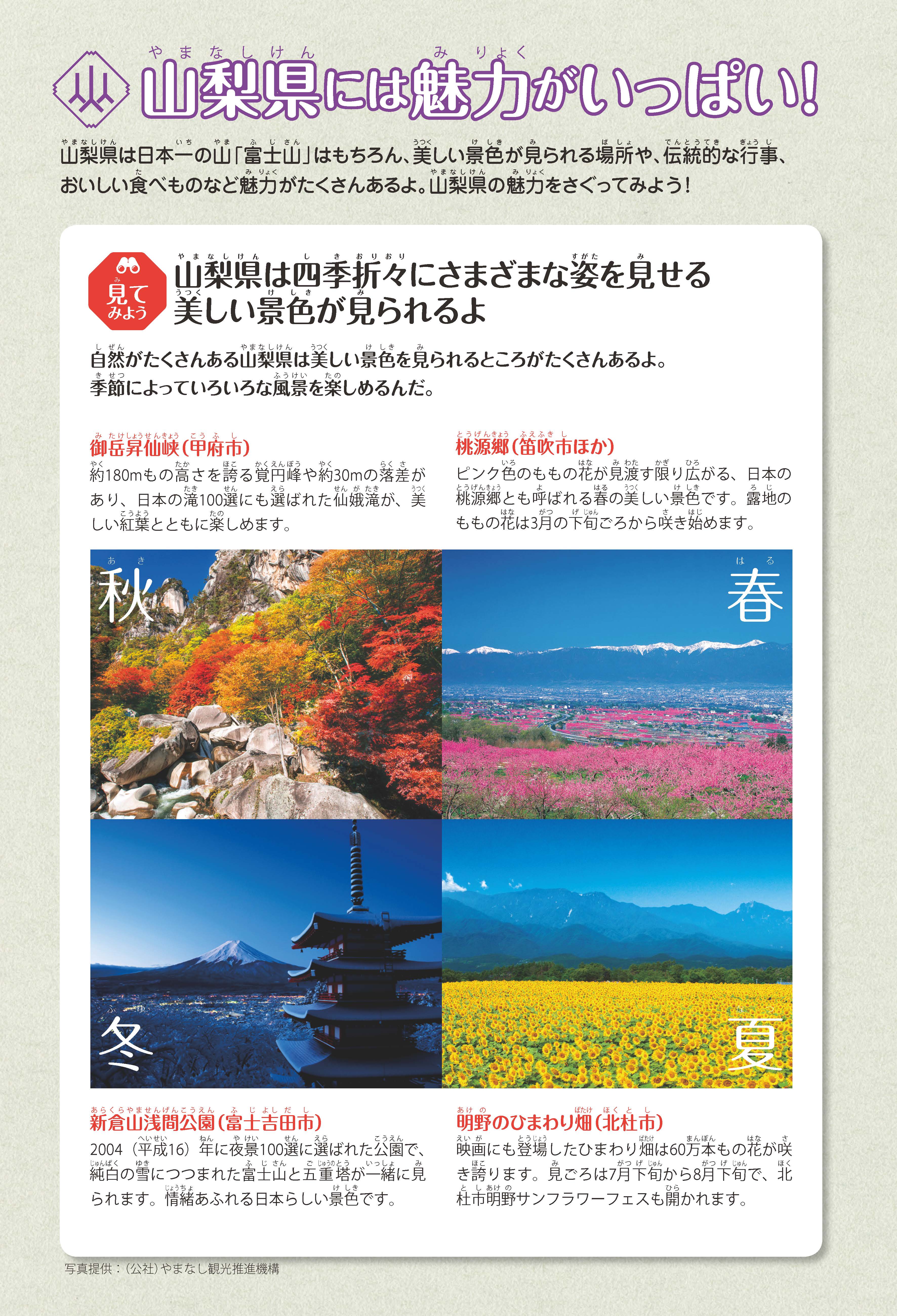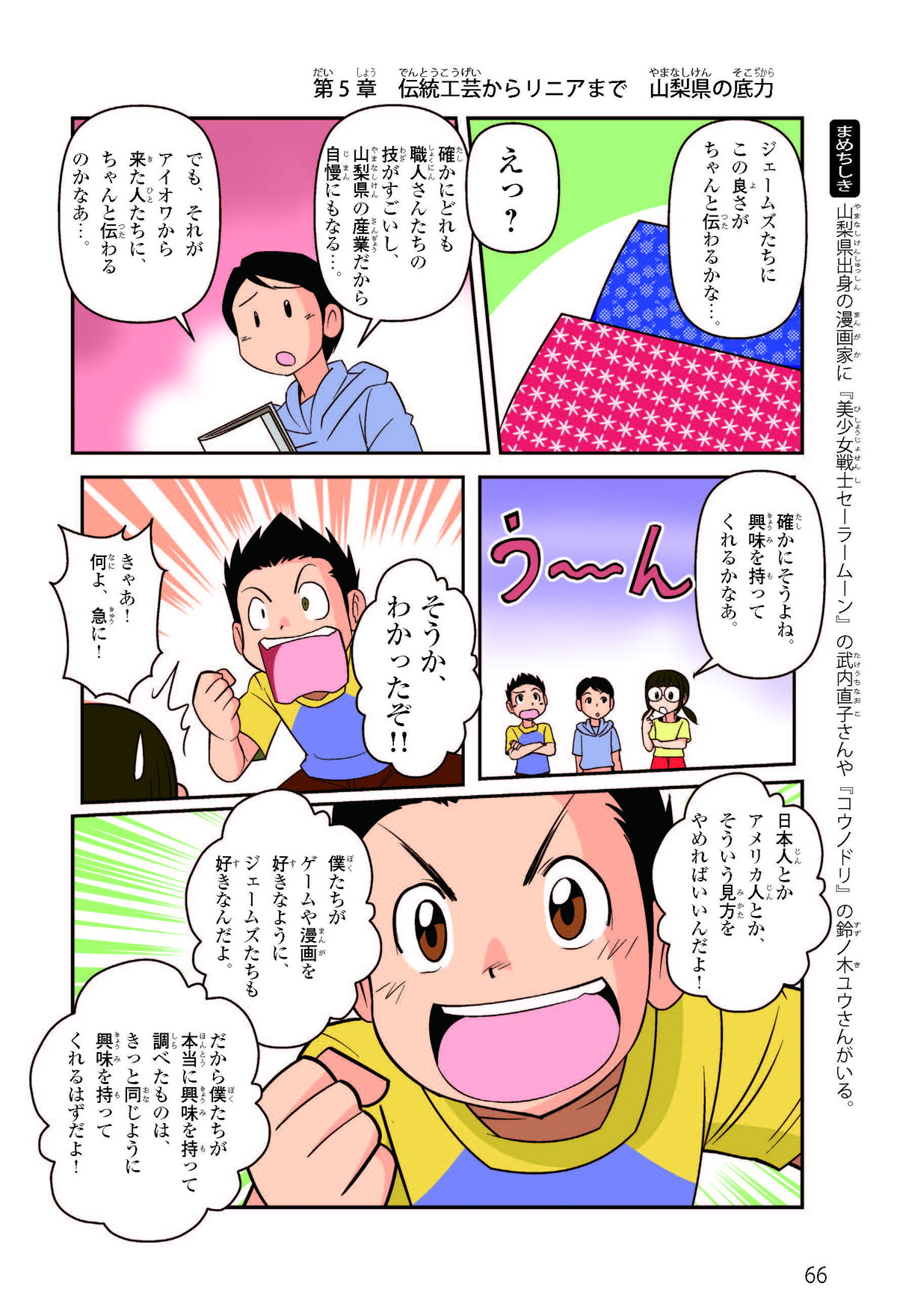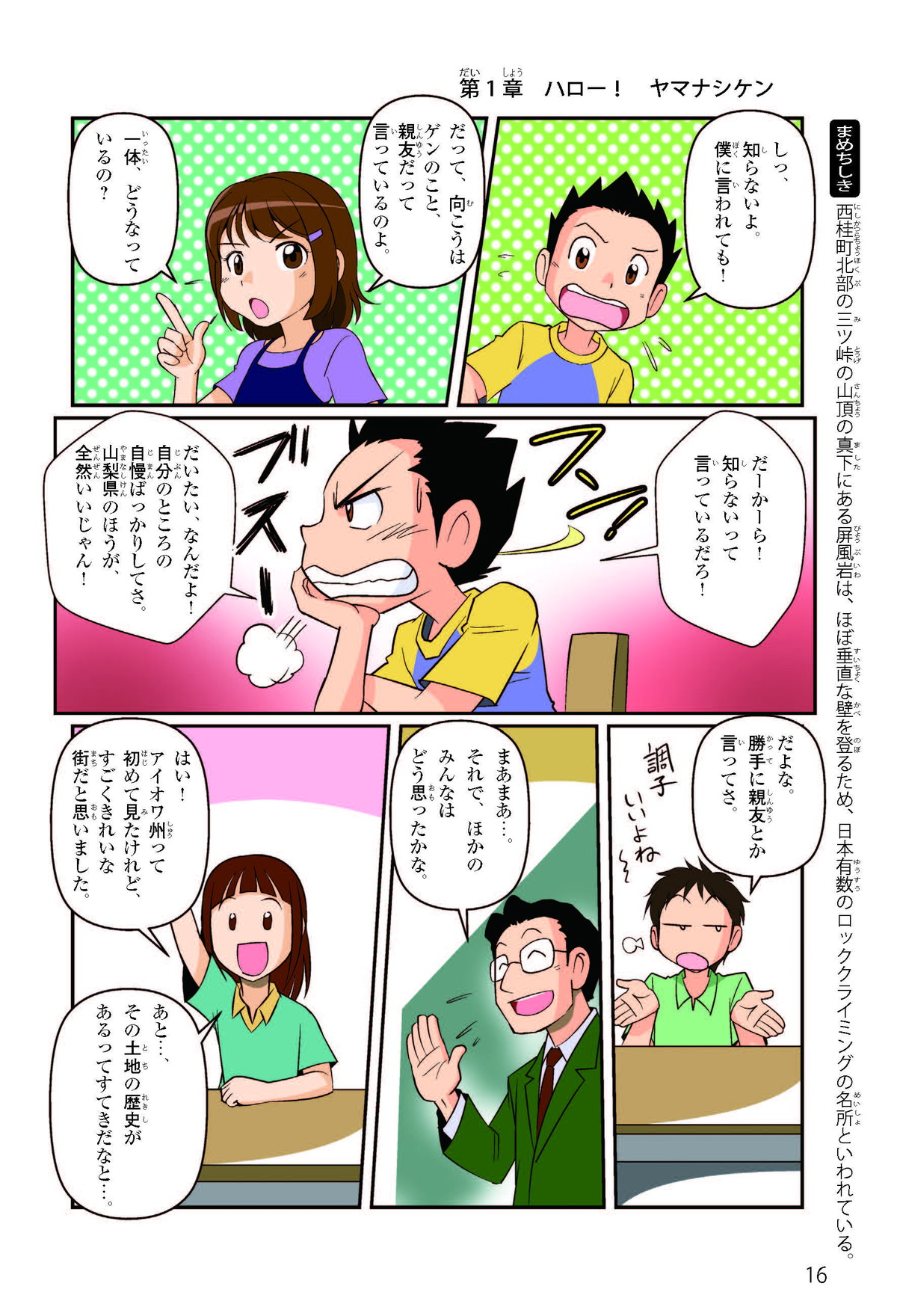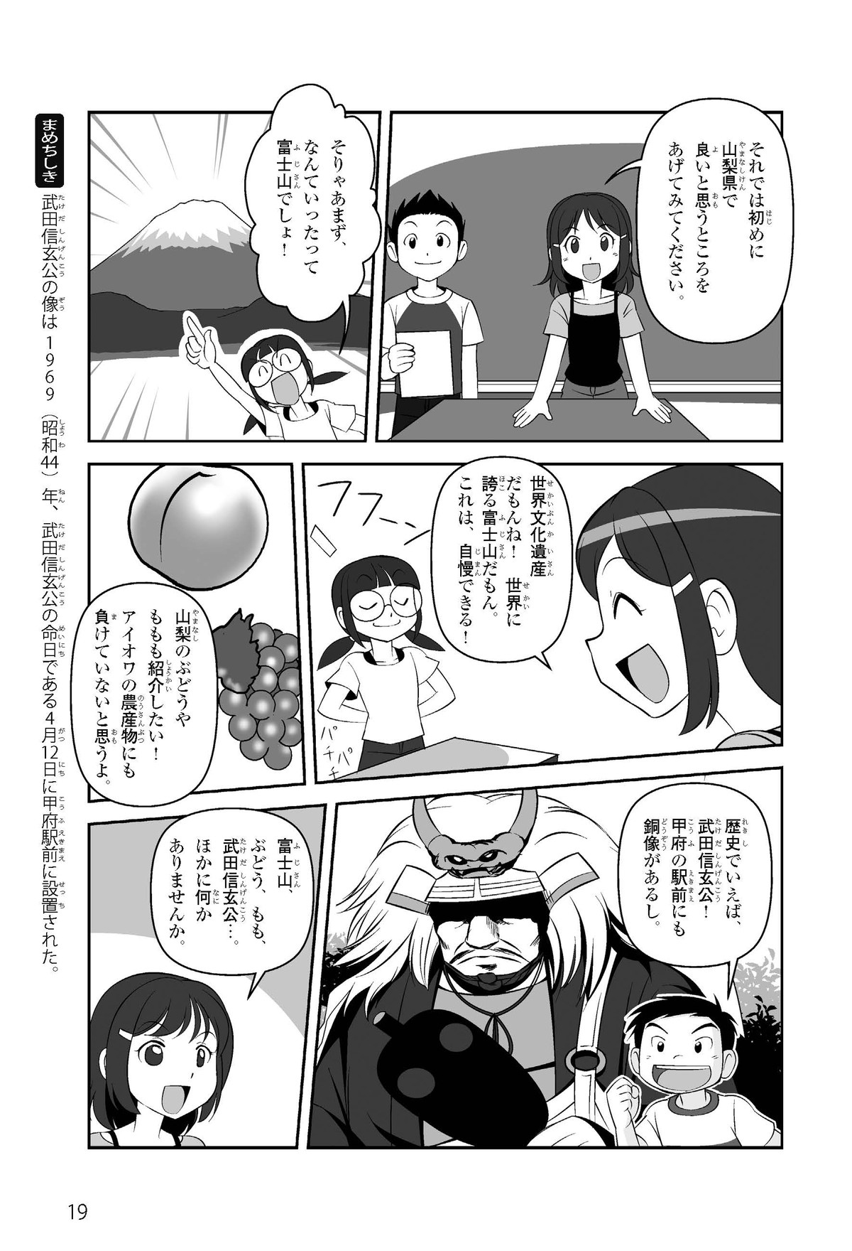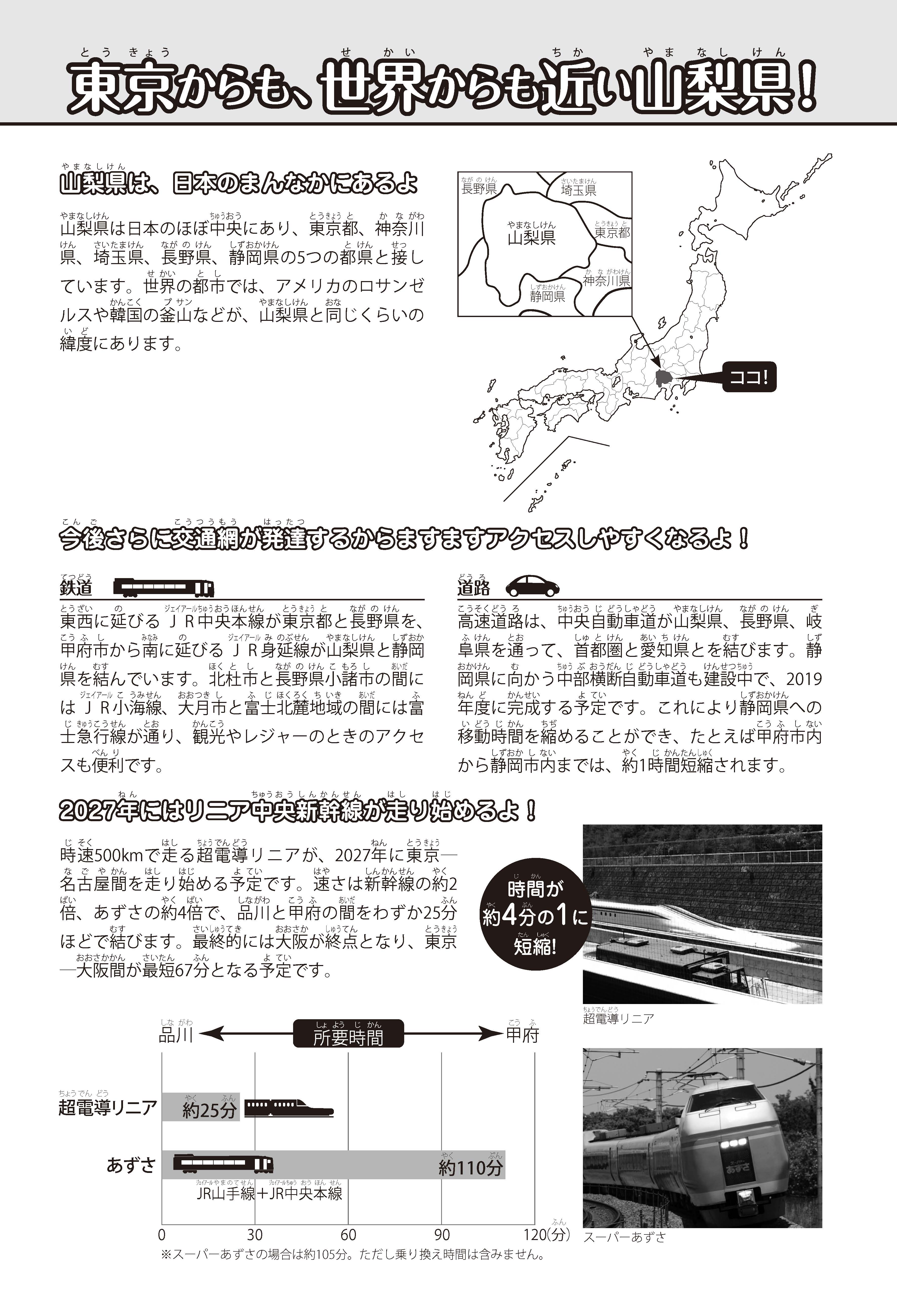 ゲンとリコは、山梨県の小学校に通う5年生。ある日、ふたりのクラスに、アメリカにある山梨県の姉妹都市・アイオワ州からの交換留学生がやってくることに。さっそくゲンとリコのクラスでは、交換留学生のジェームズとエマに、自分たちの住む山梨県の魅力を紹介するために、山梨県の良いところ探しを始めるよ。世界文化遺産の富士山に、ぶどうやももをはじめとする農産物、武田信玄公など多くの偉人を生んだ歴史、伝統工芸からリニアモーターカーの開発までとっても幅広い産業……。ほかにもたくさんの山梨県の魅力を発見していくよ!