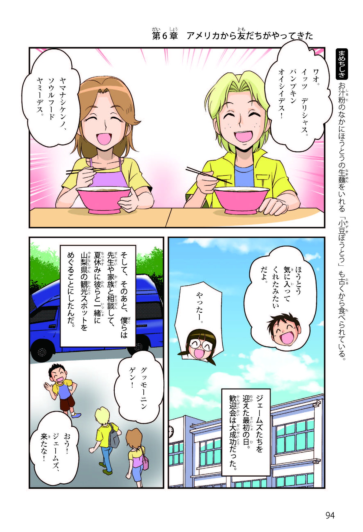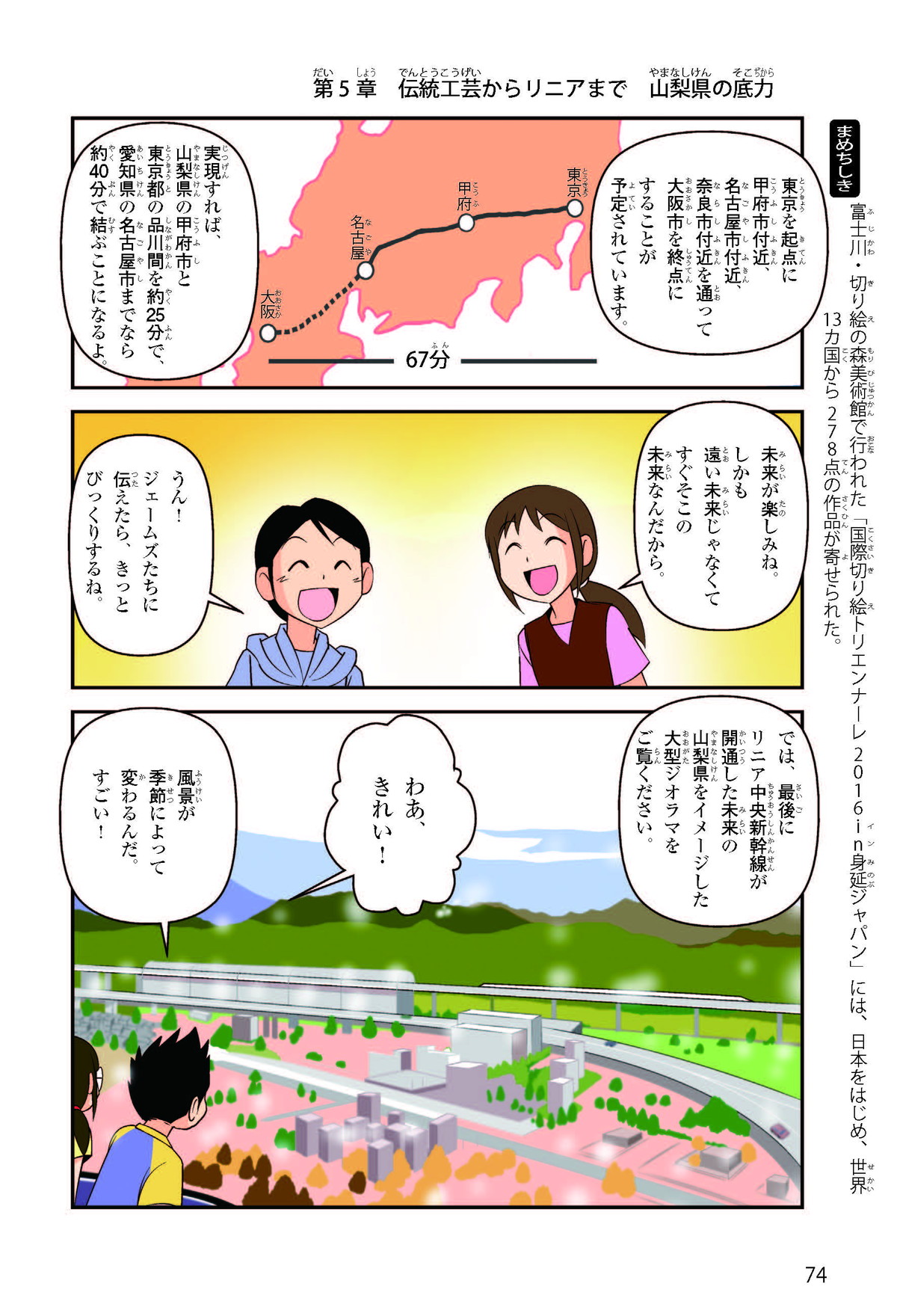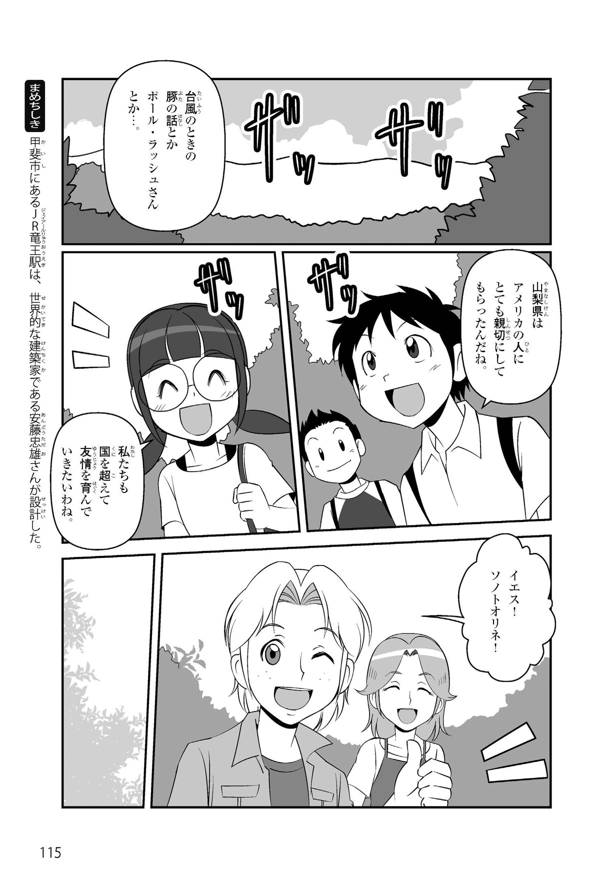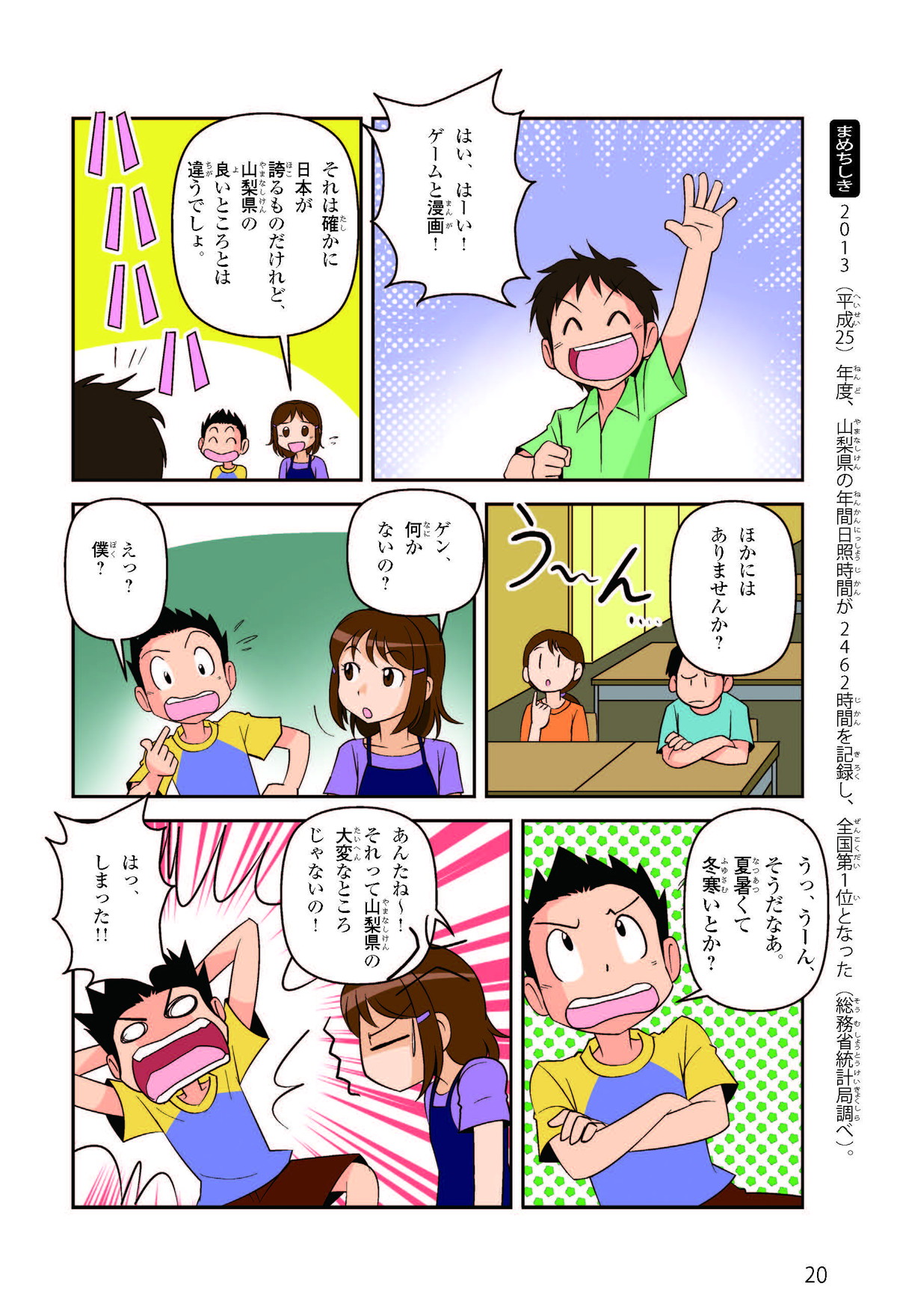 ゲンとリコは、山梨県の小学校に通う5年生。ある日、ふたりのクラスに、アメリカにある山梨県の姉妹都市・アイオワ州からの交換留学生がやってくることに。さっそくゲンとリコのクラスでは、交換留学生のジェームズとエマに、自分たちの住む山梨県の魅力を紹介するために、山梨県の良いところ探しを始めるよ。世界文化遺産の富士山に、ぶどうやももをはじめとする農産物、武田信玄公など多くの偉人を生んだ歴史、伝統工芸からリニアモーターカーの開発までとっても幅広い産業……。ほかにもたくさんの山梨県の魅力を発見していくよ!