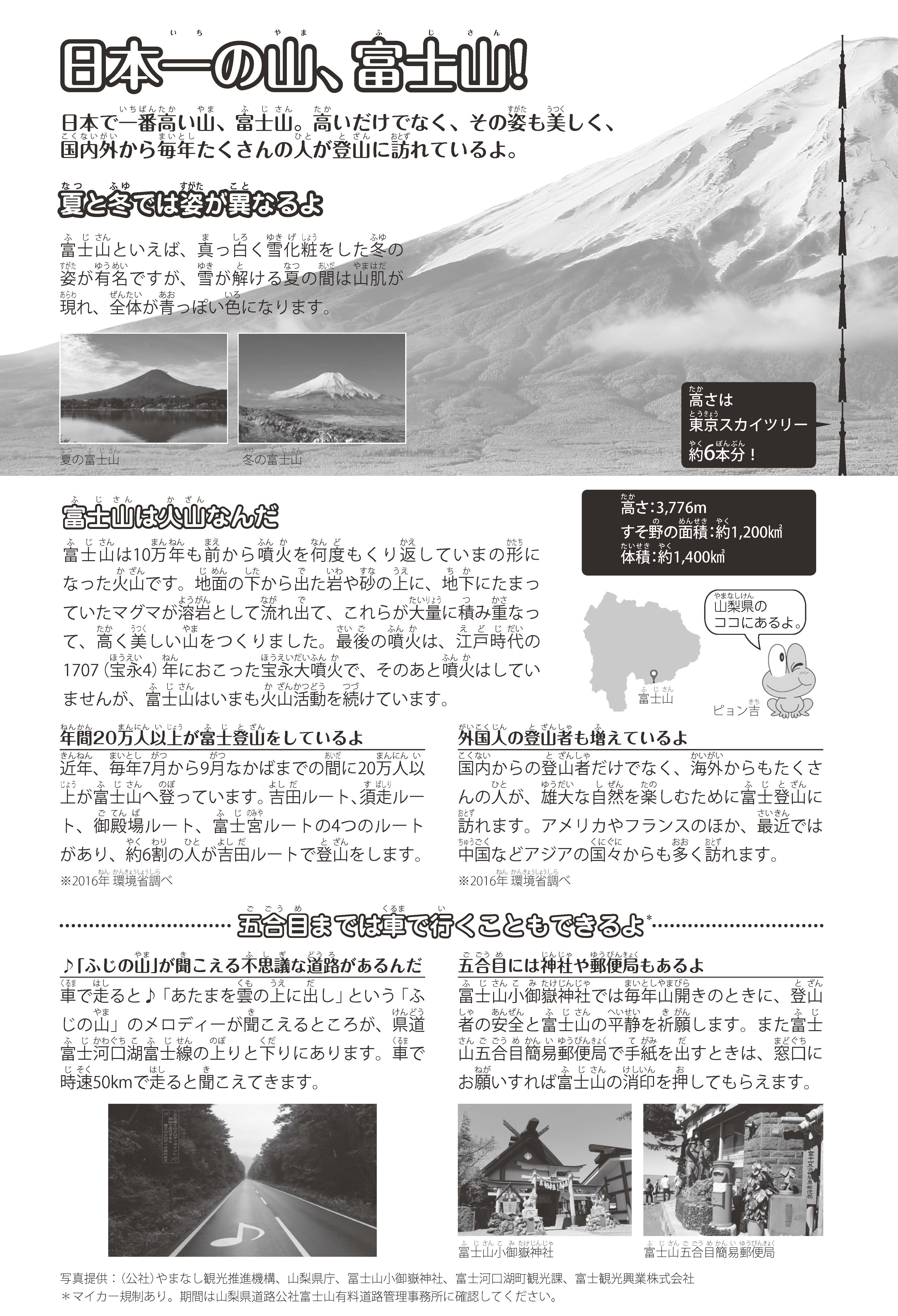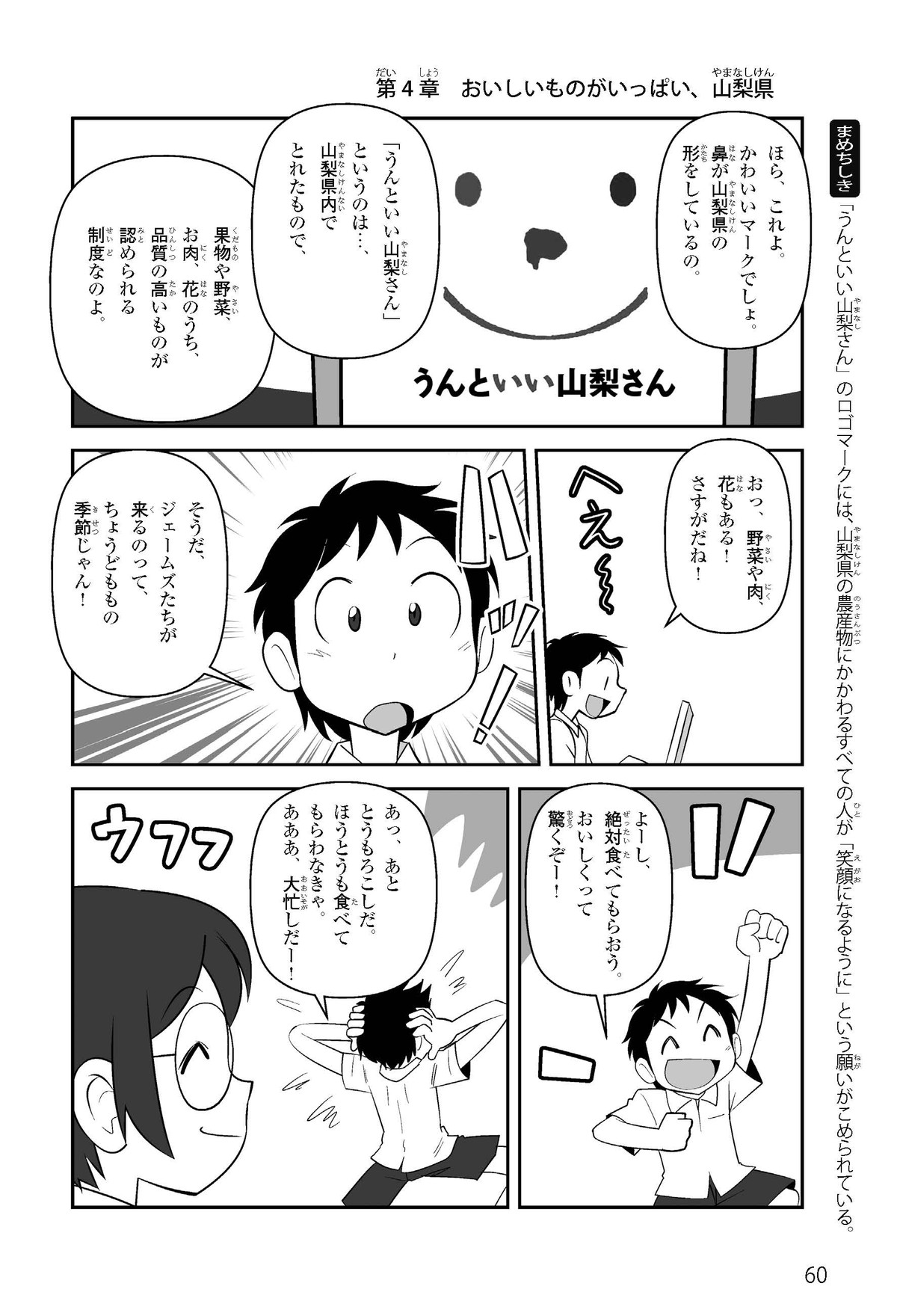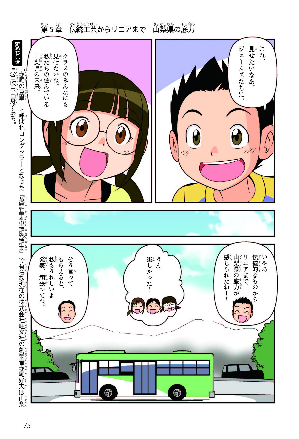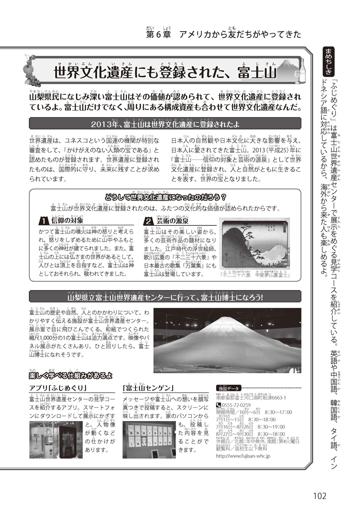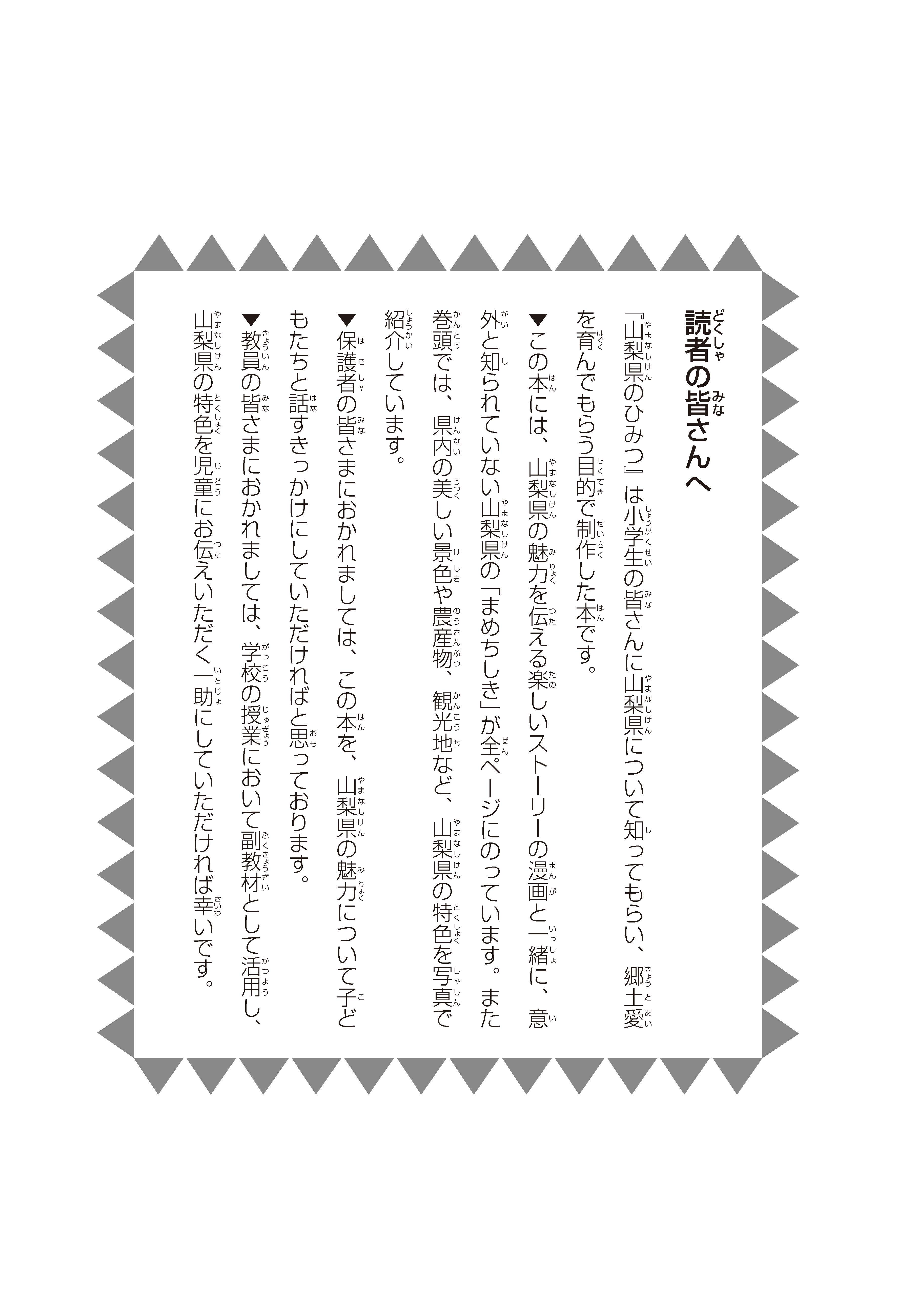 ゲンとリコは、山梨県の小学校に通う5年生。ある日、ふたりのクラスに、アメリカにある山梨県の姉妹都市・アイオワ州からの交換留学生がやってくることに。さっそくゲンとリコのクラスでは、交換留学生のジェームズとエマに、自分たちの住む山梨県の魅力を紹介するために、山梨県の良いところ探しを始めるよ。世界文化遺産の富士山に、ぶどうやももをはじめとする農産物、武田信玄公など多くの偉人を生んだ歴史、伝統工芸からリニアモーターカーの開発までとっても幅広い産業……。ほかにもたくさんの山梨県の魅力を発見していくよ!