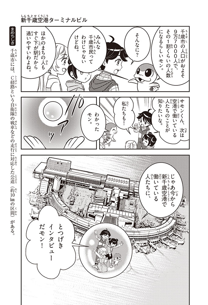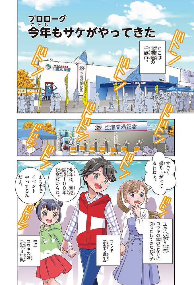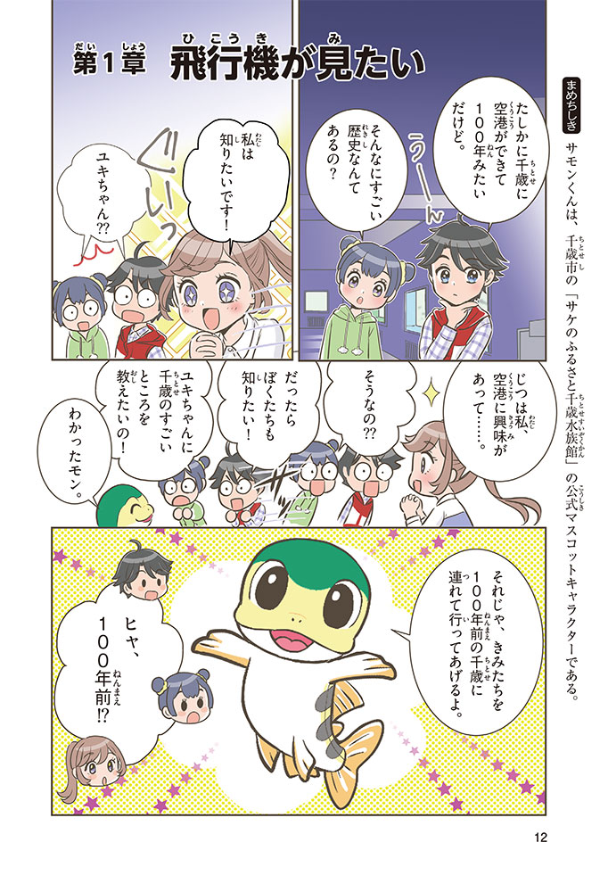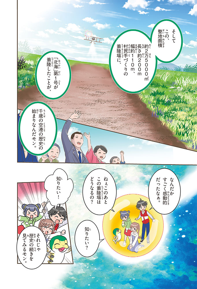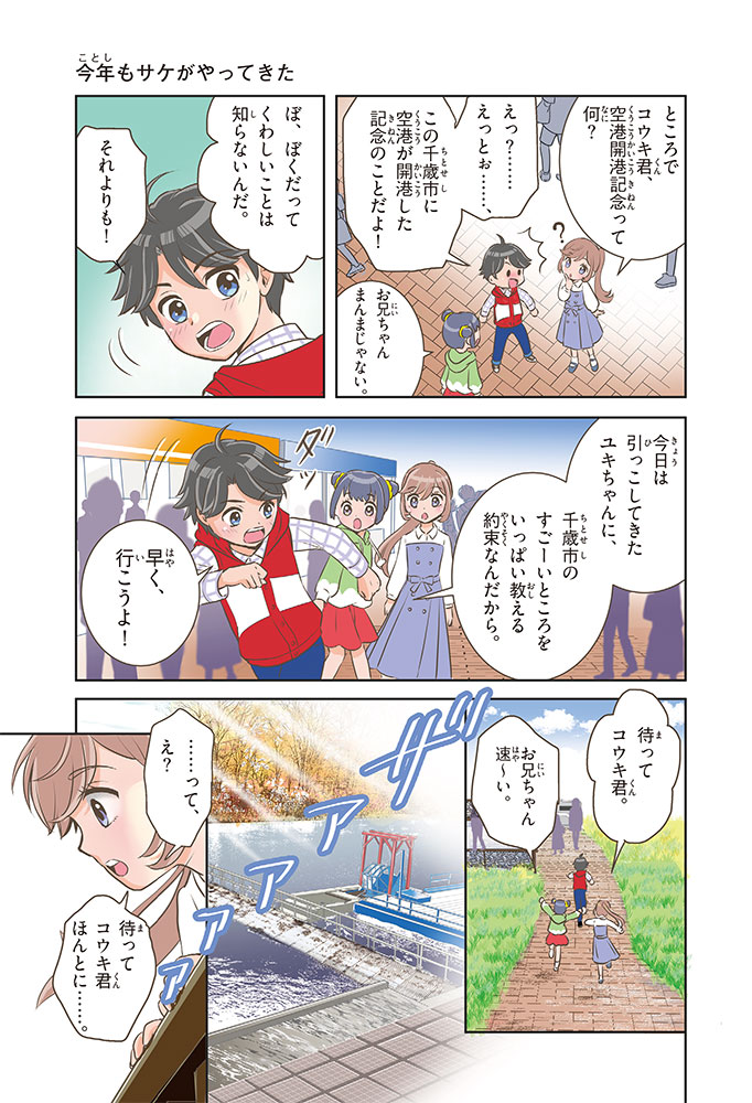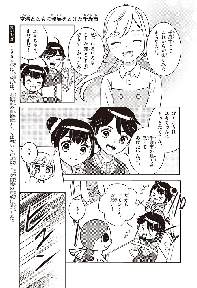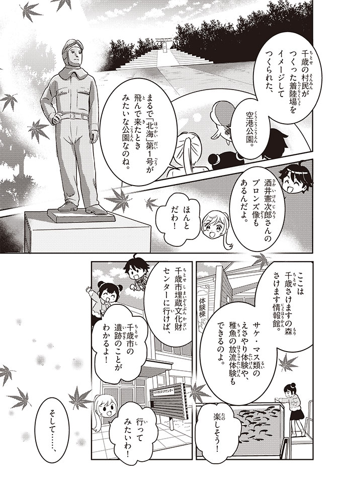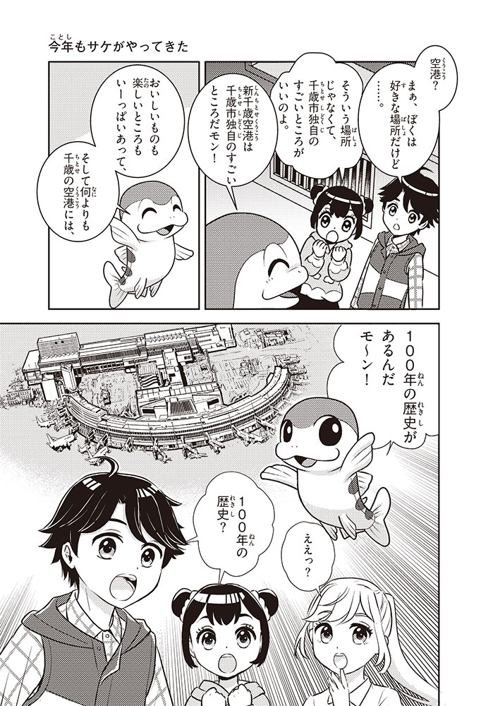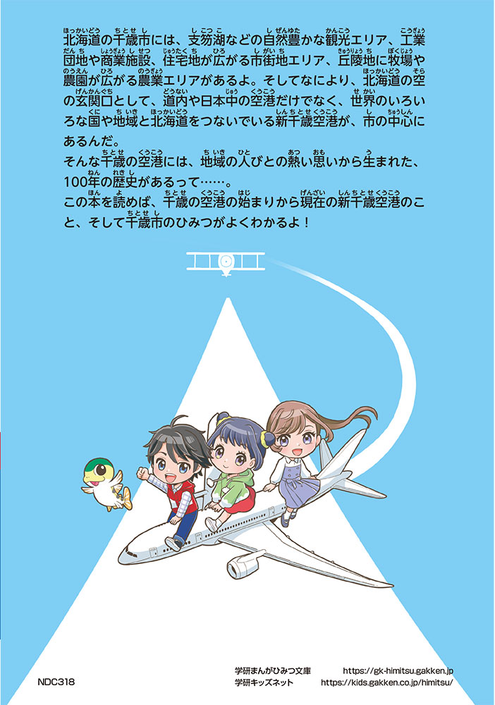 北海道の空の玄関口として、道内や日本中の空港だけでなく、世界のいろいろな国や地域と北海道をつないでいる、新千歳空港。その新千歳空港があるのが、北海道千歳市なんだ。千歳の空港には、地域の人びとの「飛行機が見たい!」という熱い思いから生まれた、100年の歴史があるって……。本書は、小学生のコウキ、ユキ、モモが、千歳っ子みんなの友だち・サケの妖精のサモンくんの案内で、千歳の空港の100年の歴史や現在の新千歳空港のこと、また支笏湖やキウス周堤墓群などの千歳市の魅力をたくさん知ることになります。みんなもこの本を読めば、千歳市の歴史とひみつがよくわかるよ!