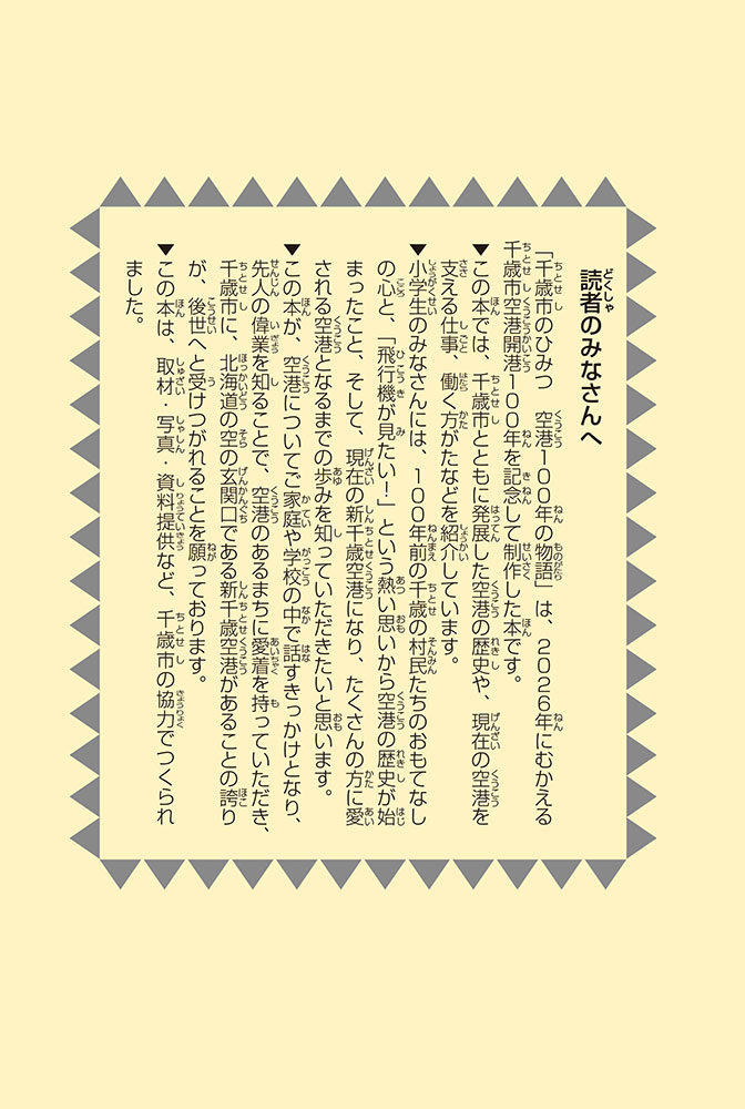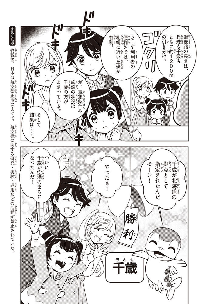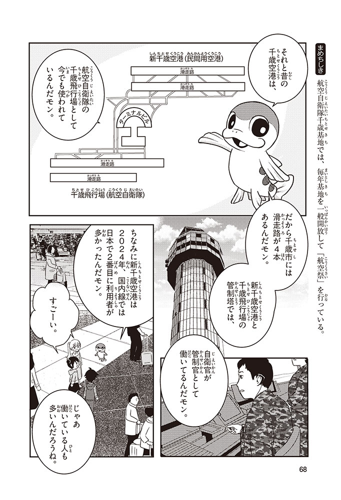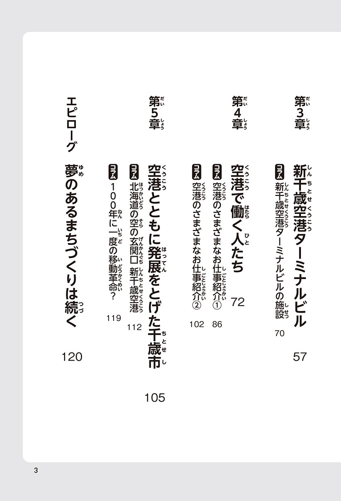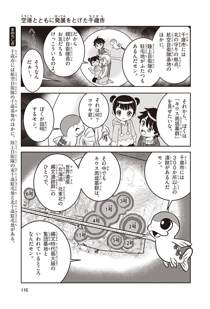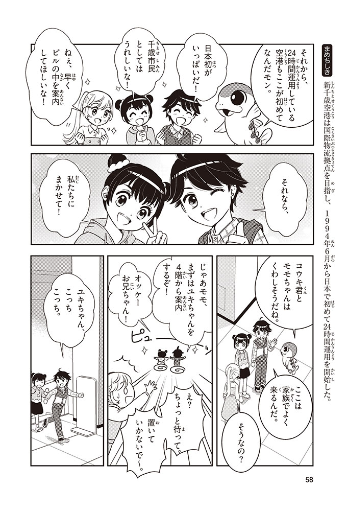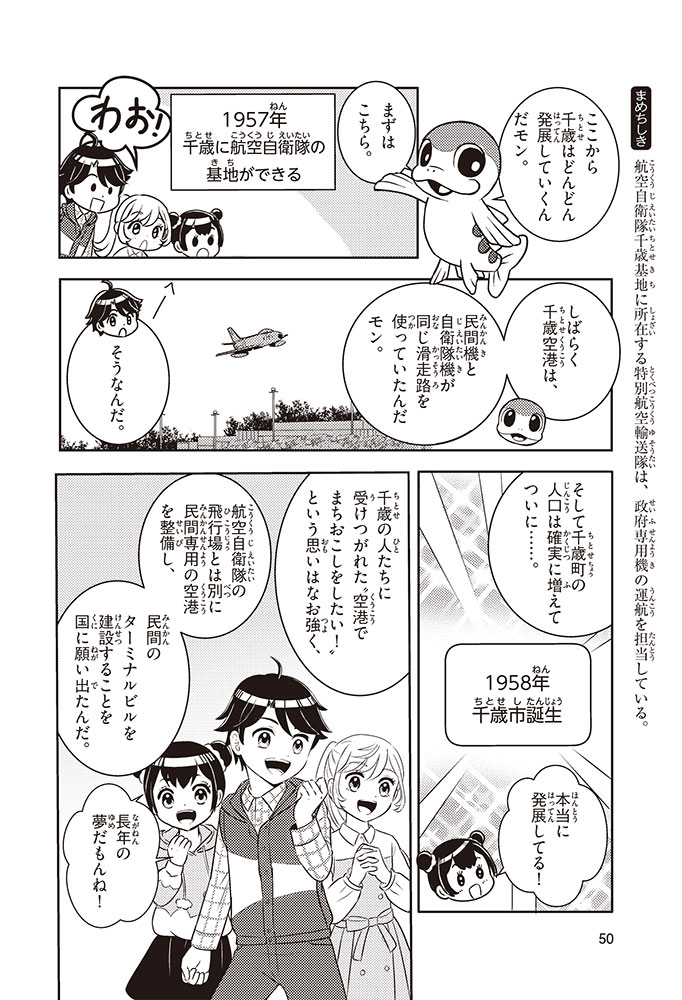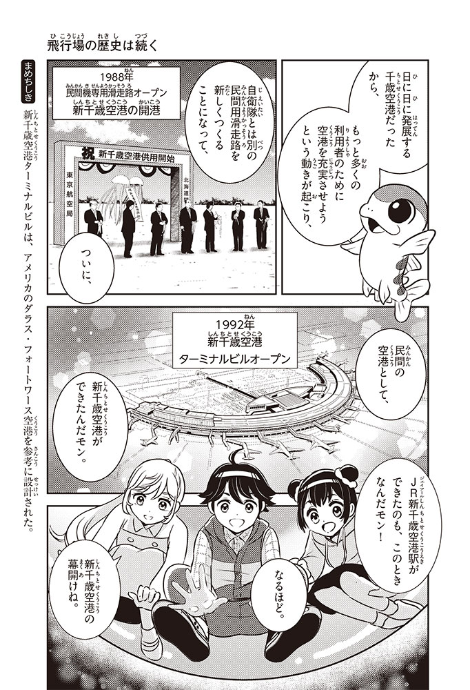 北海道の空の玄関口として、道内や日本中の空港だけでなく、世界のいろいろな国や地域と北海道をつないでいる、新千歳空港。その新千歳空港があるのが、北海道千歳市なんだ。千歳の空港には、地域の人びとの「飛行機が見たい!」という熱い思いから生まれた、100年の歴史があるって……。本書は、小学生のコウキ、ユキ、モモが、千歳っ子みんなの友だち・サケの妖精のサモンくんの案内で、千歳の空港の100年の歴史や現在の新千歳空港のこと、また支笏湖やキウス周堤墓群などの千歳市の魅力をたくさん知ることになります。みんなもこの本を読めば、千歳市の歴史とひみつがよくわかるよ!
