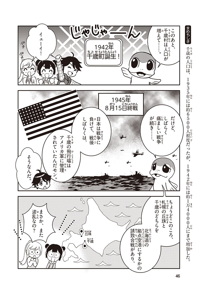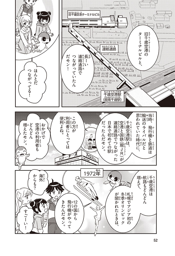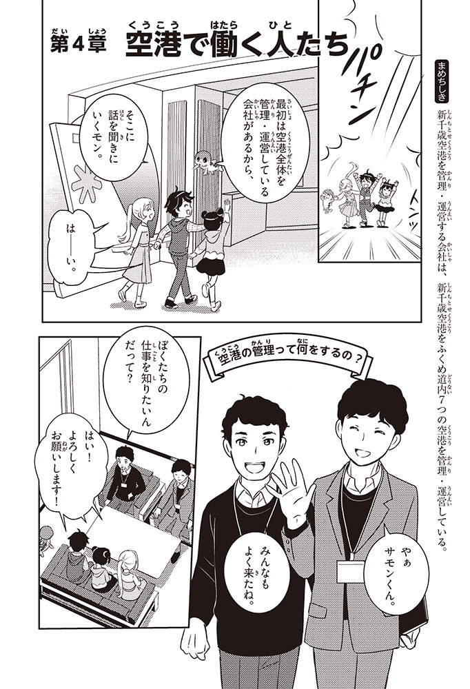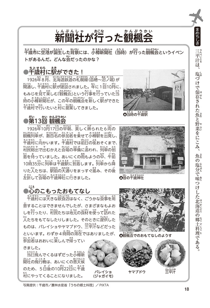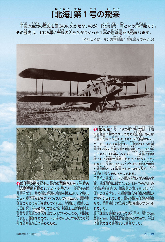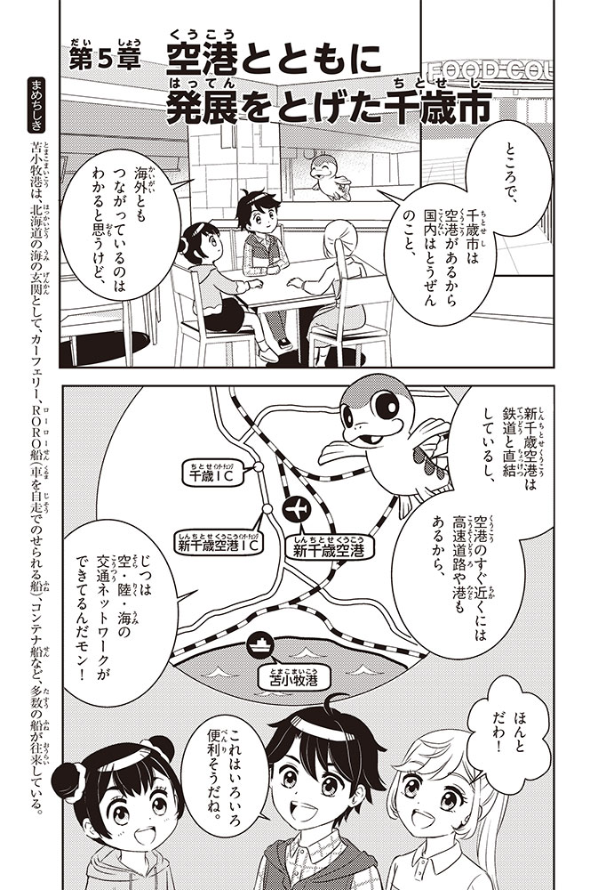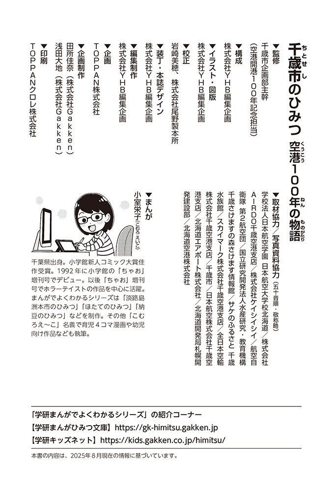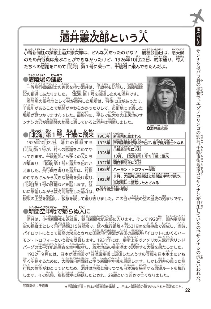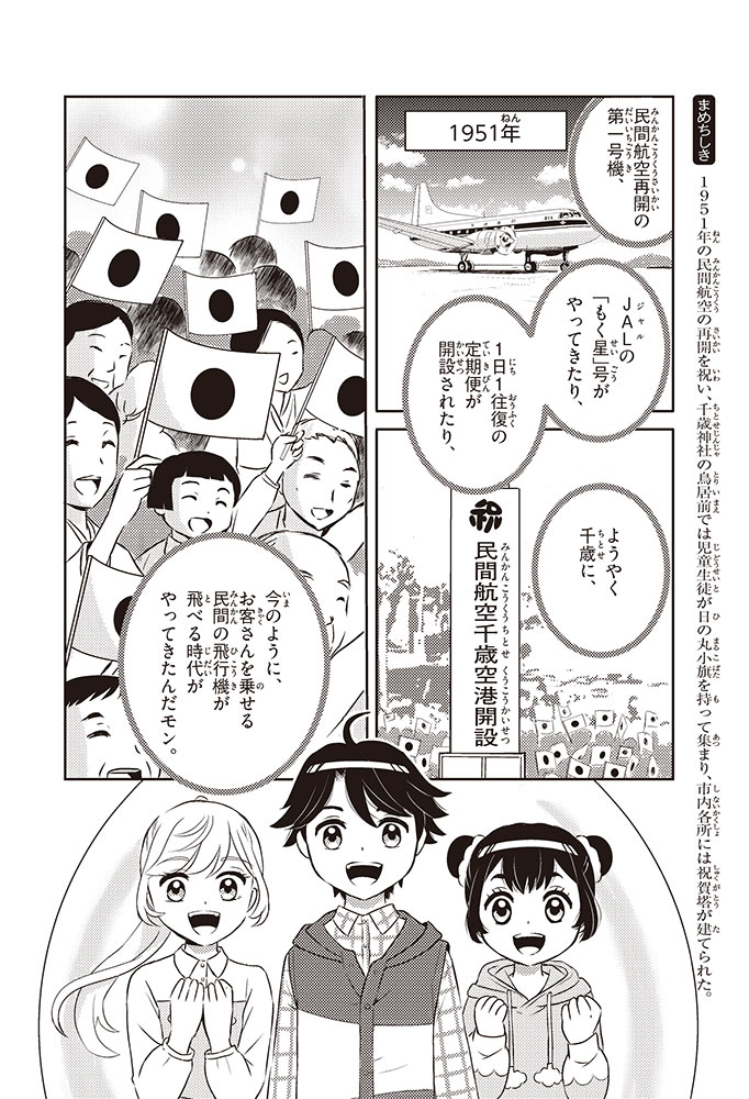 北海道の空の玄関口として、道内や日本中の空港だけでなく、世界のいろいろな国や地域と北海道をつないでいる、新千歳空港。その新千歳空港があるのが、北海道千歳市なんだ。千歳の空港には、地域の人びとの「飛行機が見たい!」という熱い思いから生まれた、100年の歴史があるって……。本書は、小学生のコウキ、ユキ、モモが、千歳っ子みんなの友だち・サケの妖精のサモンくんの案内で、千歳の空港の100年の歴史や現在の新千歳空港のこと、また支笏湖やキウス周堤墓群などの千歳市の魅力をたくさん知ることになります。みんなもこの本を読めば、千歳市の歴史とひみつがよくわかるよ!
