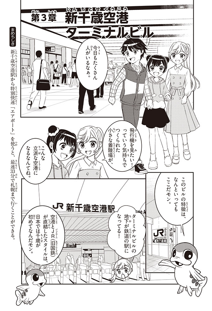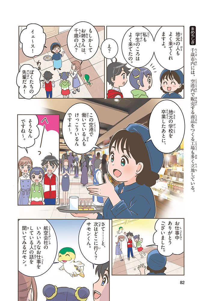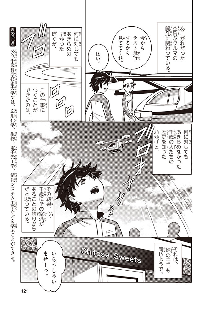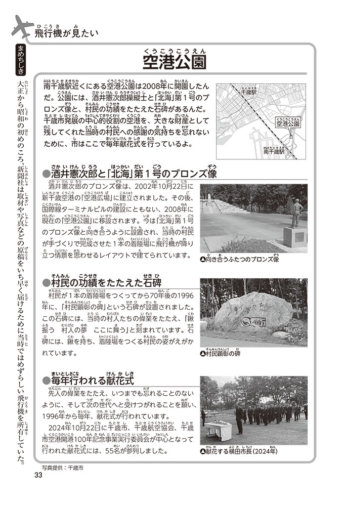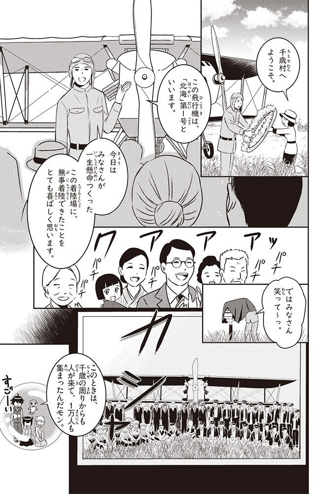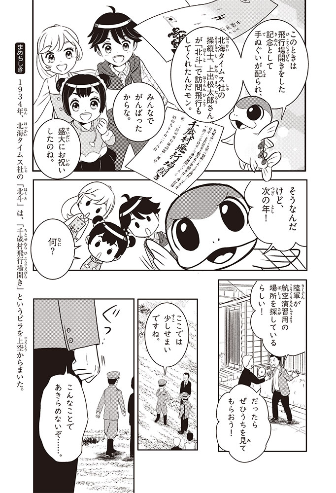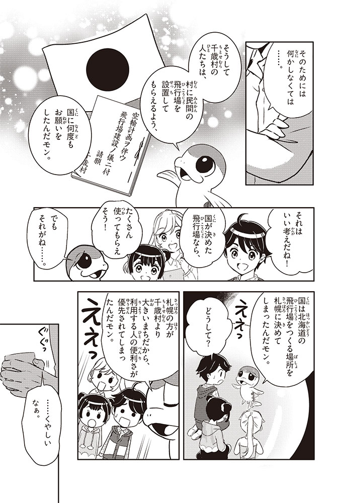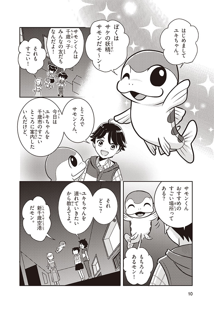 北海道の空の玄関口として、道内や日本中の空港だけでなく、世界のいろいろな国や地域と北海道をつないでいる、新千歳空港。その新千歳空港があるのが、北海道千歳市なんだ。千歳の空港には、地域の人びとの「飛行機が見たい!」という熱い思いから生まれた、100年の歴史があるって……。本書は、小学生のコウキ、ユキ、モモが、千歳っ子みんなの友だち・サケの妖精のサモンくんの案内で、千歳の空港の100年の歴史や現在の新千歳空港のこと、また支笏湖やキウス周堤墓群などの千歳市の魅力をたくさん知ることになります。みんなもこの本を読めば、千歳市の歴史とひみつがよくわかるよ!
