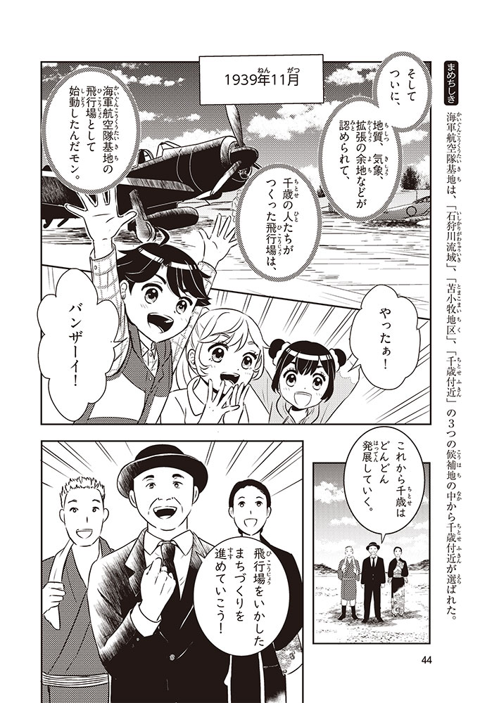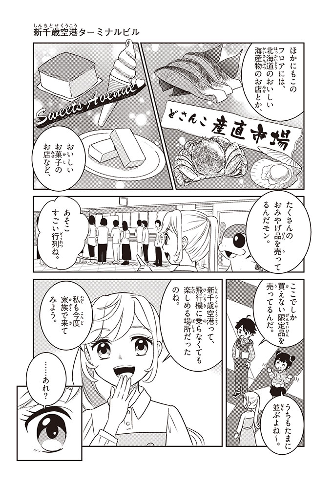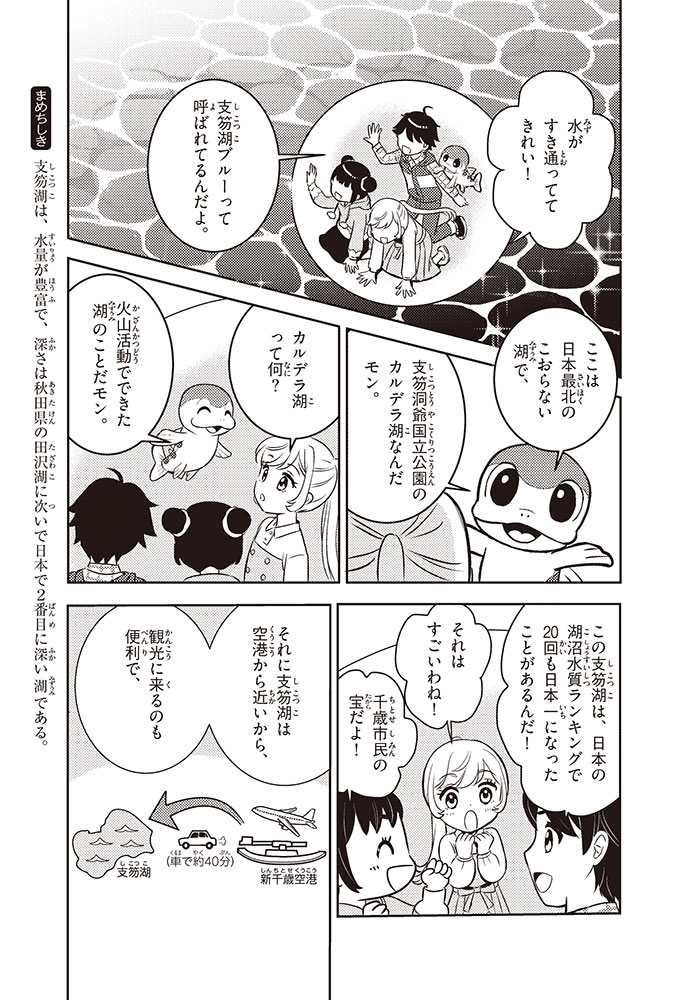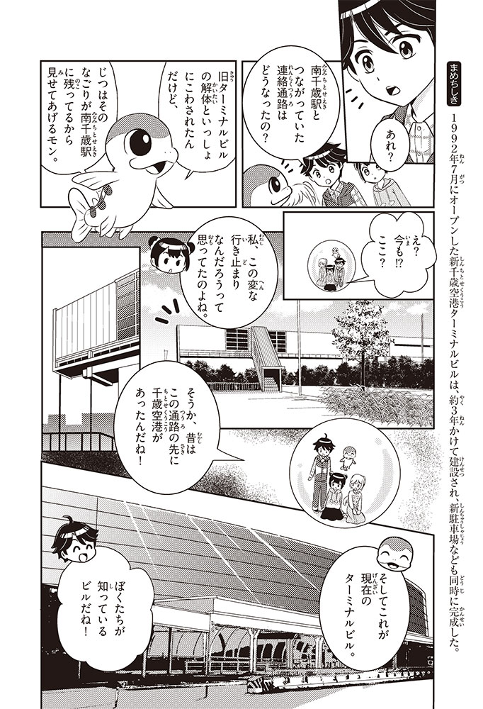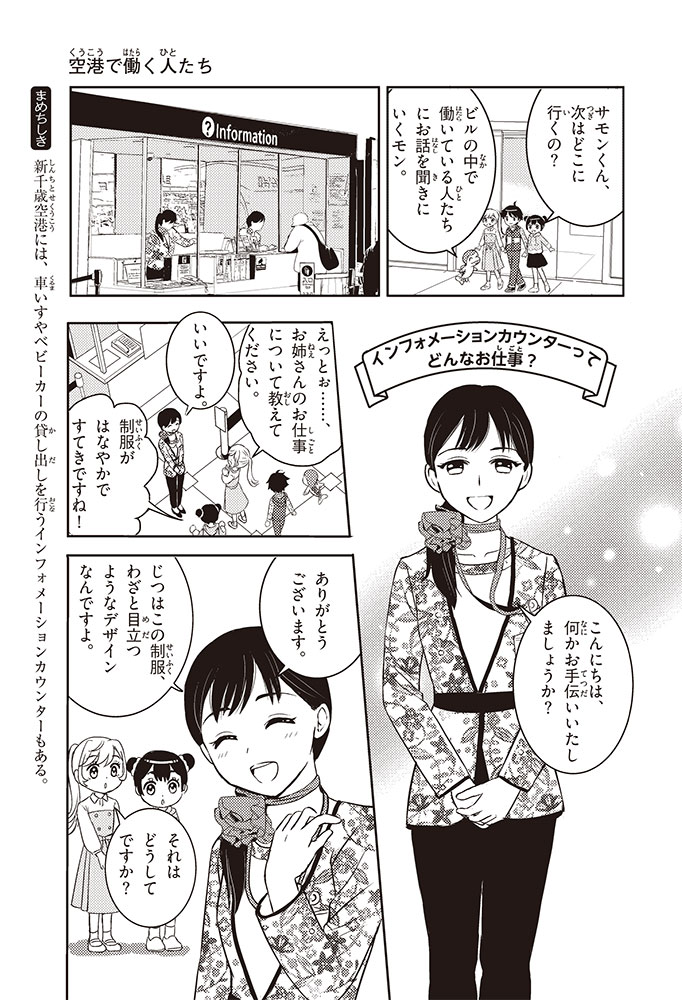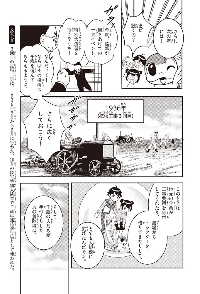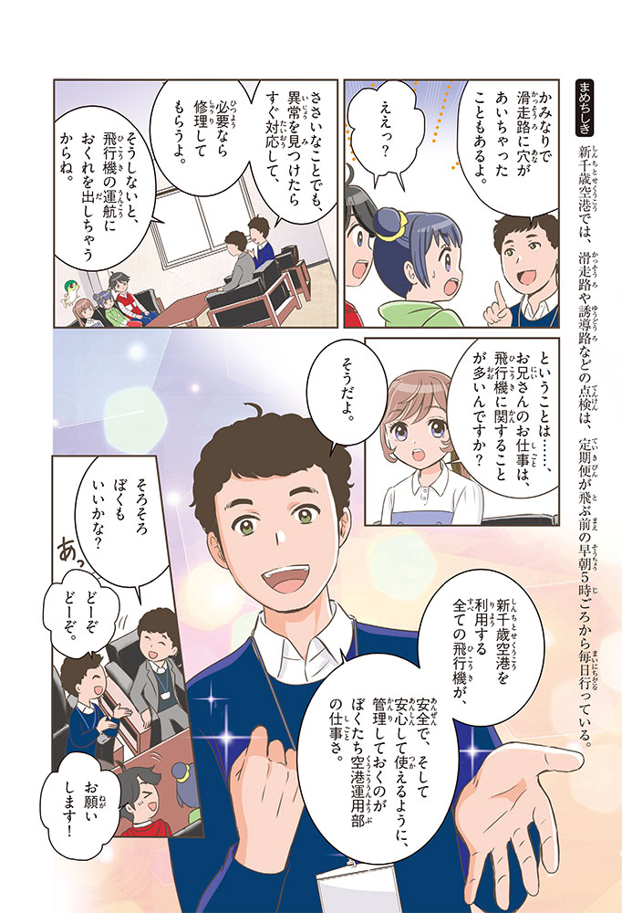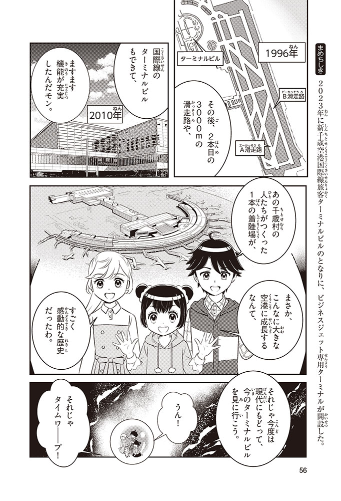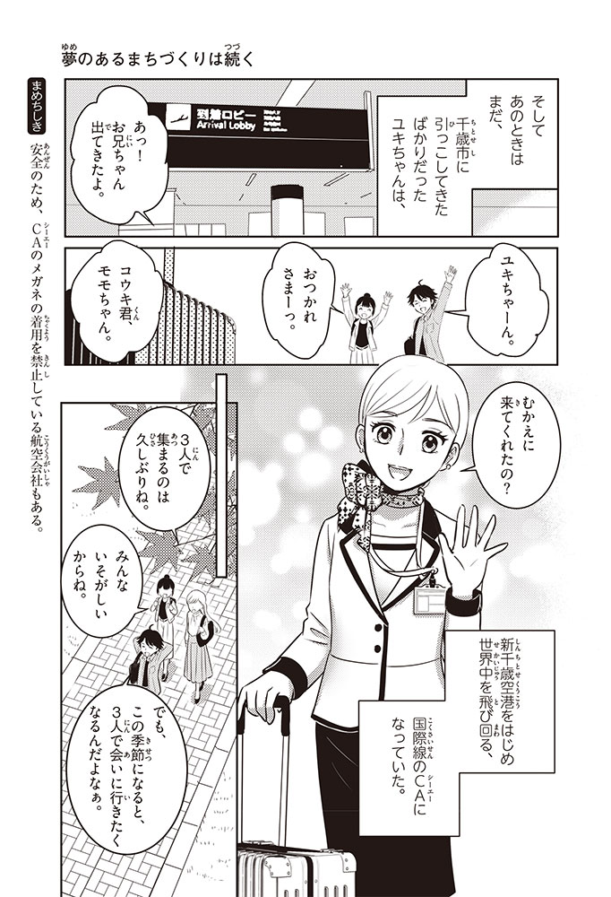 北海道の空の玄関口として、道内や日本中の空港だけでなく、世界のいろいろな国や地域と北海道をつないでいる、新千歳空港。その新千歳空港があるのが、北海道千歳市なんだ。千歳の空港には、地域の人びとの「飛行機が見たい!」という熱い思いから生まれた、100年の歴史があるって……。本書は、小学生のコウキ、ユキ、モモが、千歳っ子みんなの友だち・サケの妖精のサモンくんの案内で、千歳の空港の100年の歴史や現在の新千歳空港のこと、また支笏湖やキウス周堤墓群などの千歳市の魅力をたくさん知ることになります。みんなもこの本を読めば、千歳市の歴史とひみつがよくわかるよ!