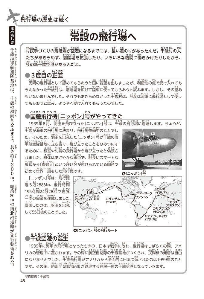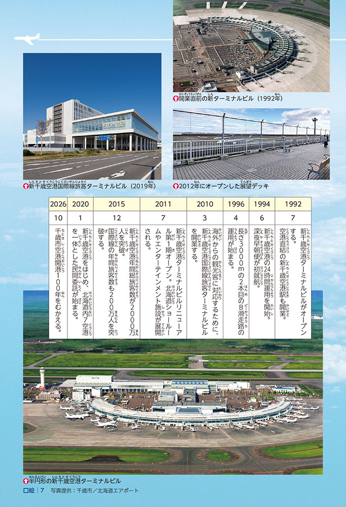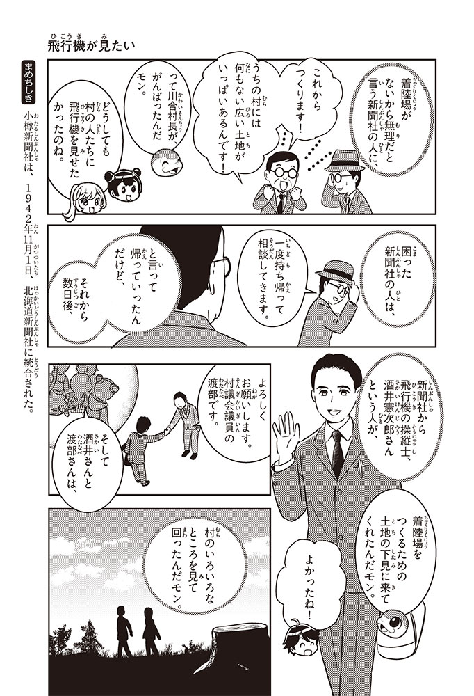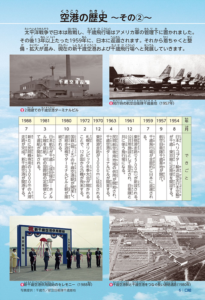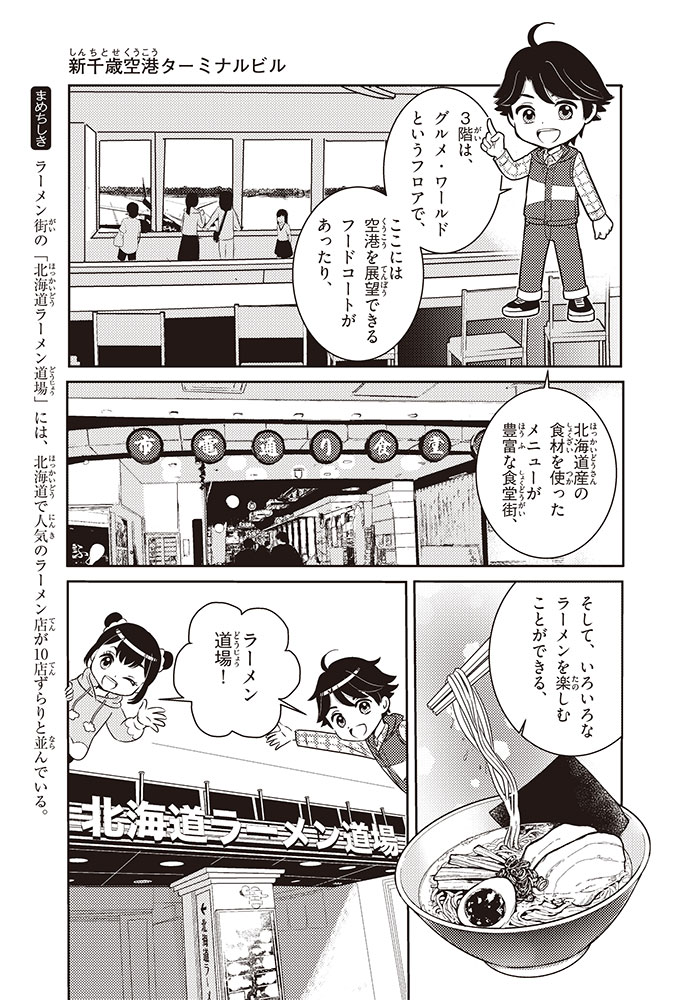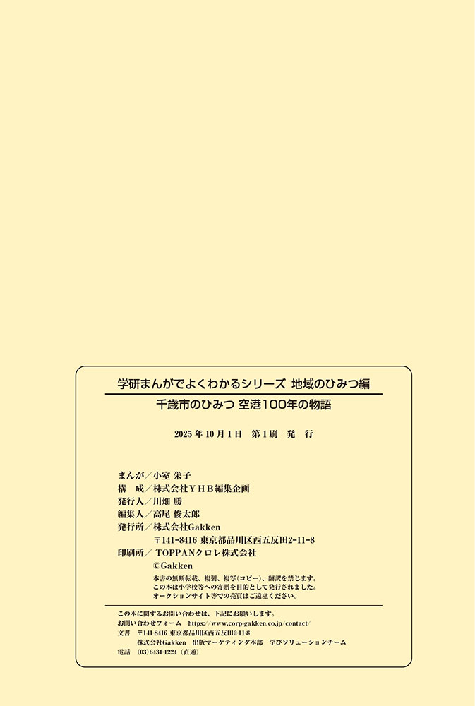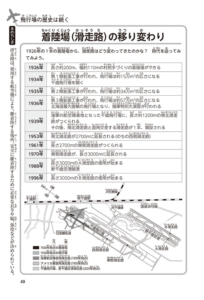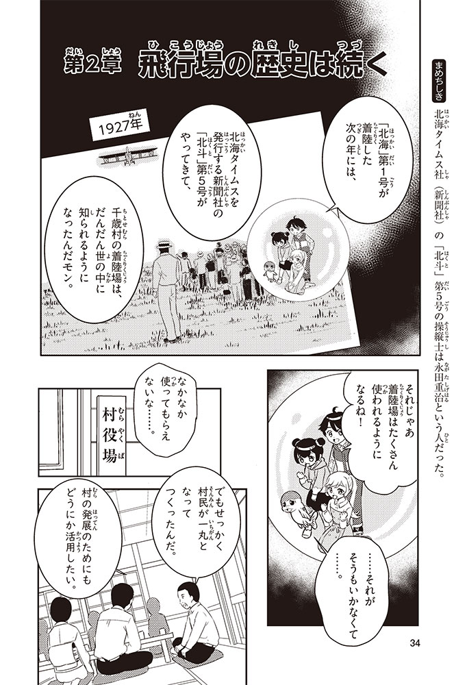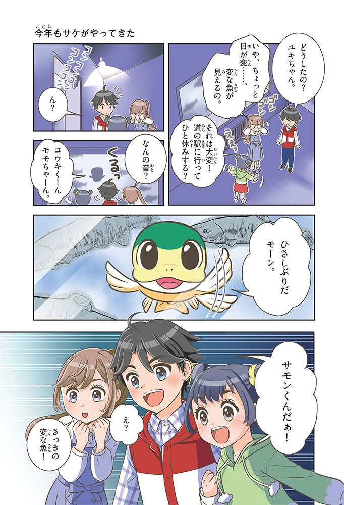 北海道の空の玄関口として、道内や日本中の空港だけでなく、世界のいろいろな国や地域と北海道をつないでいる、新千歳空港。その新千歳空港があるのが、北海道千歳市なんだ。千歳の空港には、地域の人びとの「飛行機が見たい!」という熱い思いから生まれた、100年の歴史があるって……。本書は、小学生のコウキ、ユキ、モモが、千歳っ子みんなの友だち・サケの妖精のサモンくんの案内で、千歳の空港の100年の歴史や現在の新千歳空港のこと、また支笏湖やキウス周堤墓群などの千歳市の魅力をたくさん知ることになります。みんなもこの本を読めば、千歳市の歴史とひみつがよくわかるよ!
