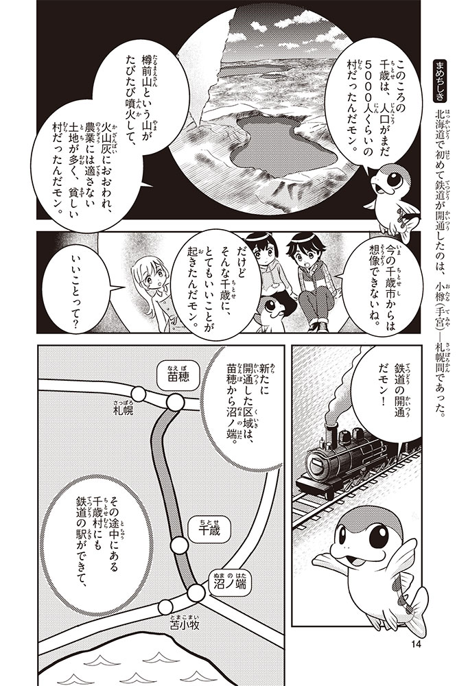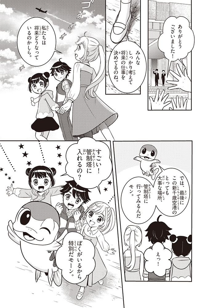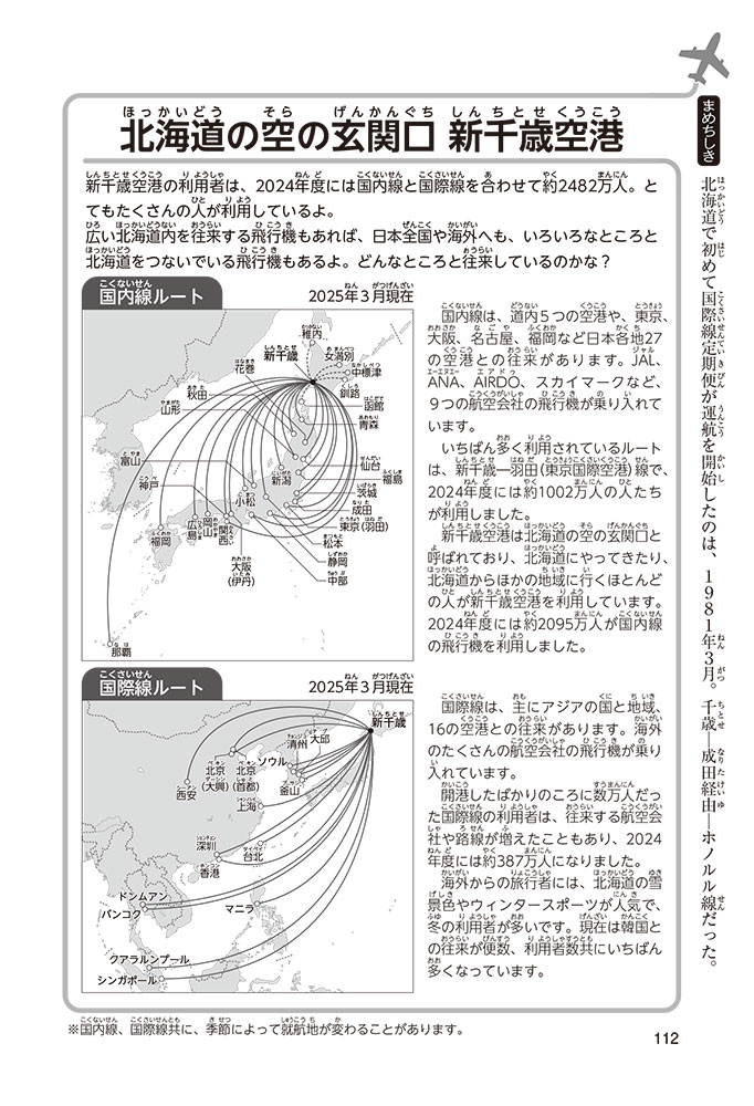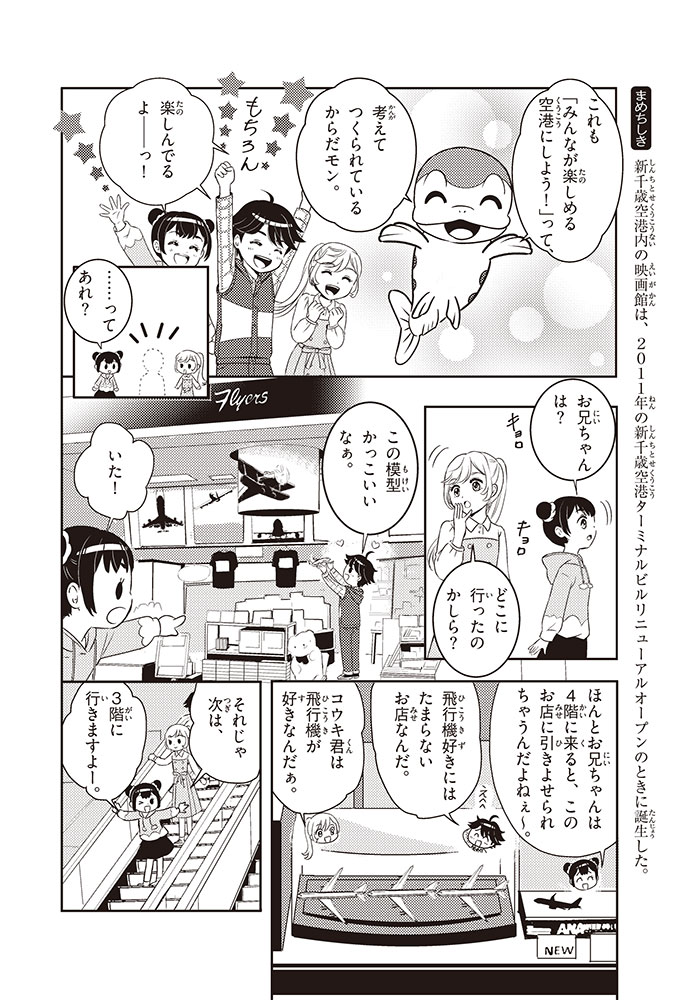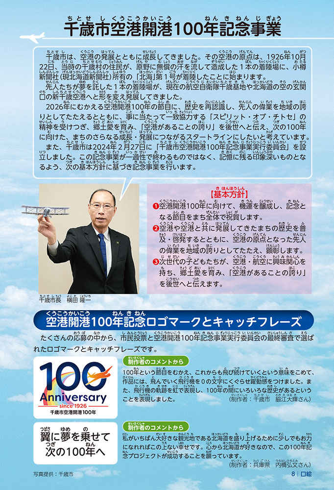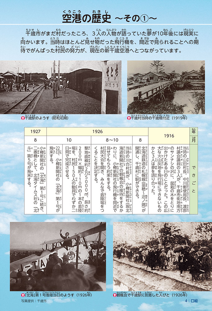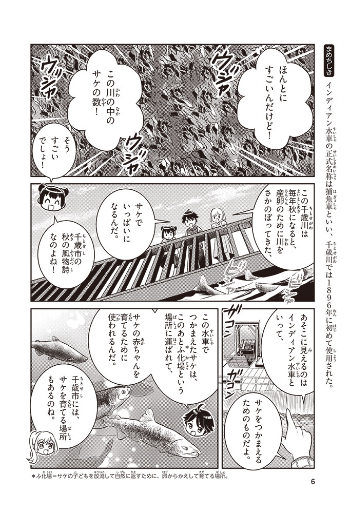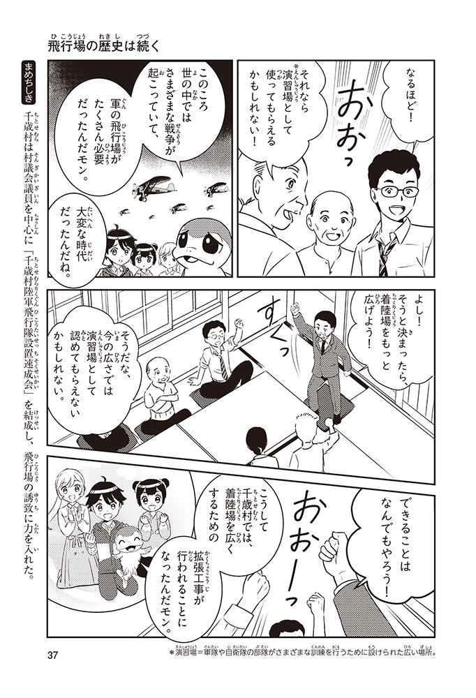北海道の空の玄関口として、道内や日本中の空港だけでなく、世界のいろいろな国や地域と北海道をつないでいる、新千歳空港。その新千歳空港があるのが、北海道千歳市なんだ。千歳の空港には、地域の人びとの「飛行機が見たい!」という熱い思いから生まれた、100年の歴史があるって……。本書は、小学生のコウキ、ユキ、モモが、千歳っ子みんなの友だち・サケの妖精のサモンくんの案内で、千歳の空港の100年の歴史や現在の新千歳空港のこと、また支笏湖やキウス周堤墓群などの千歳市の魅力をたくさん知ることになります。みんなもこの本を読めば、千歳市の歴史とひみつがよくわかるよ!