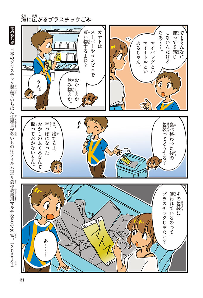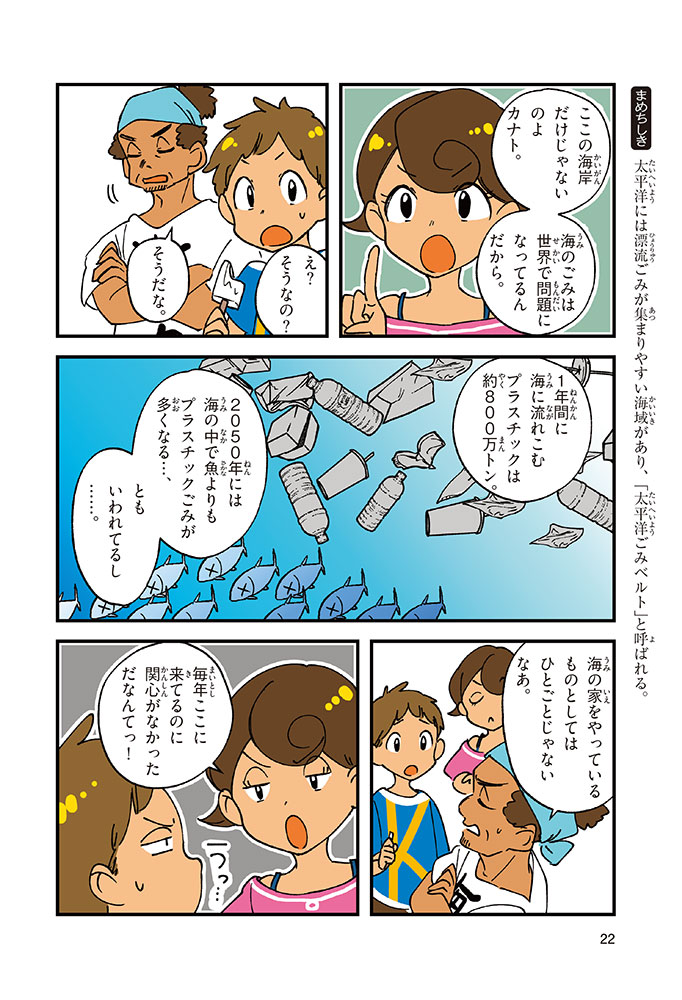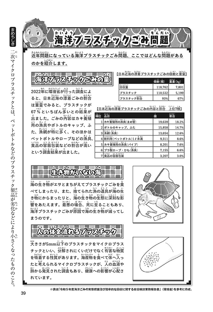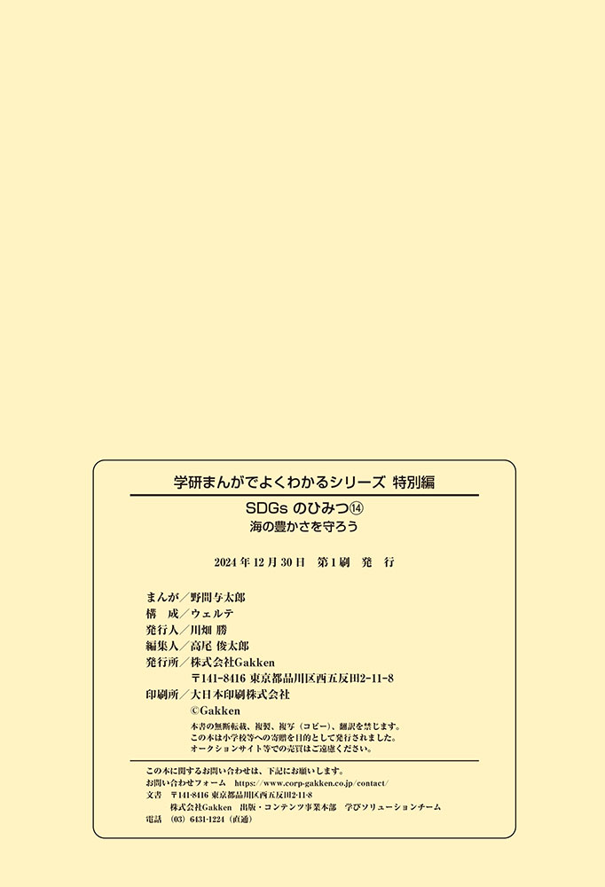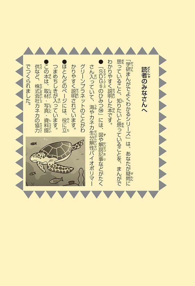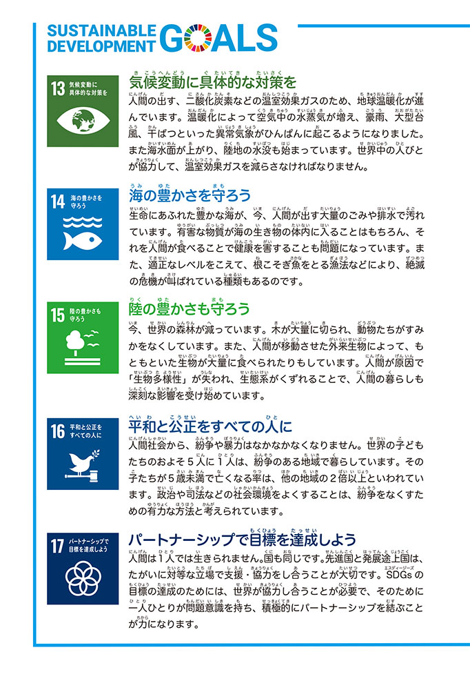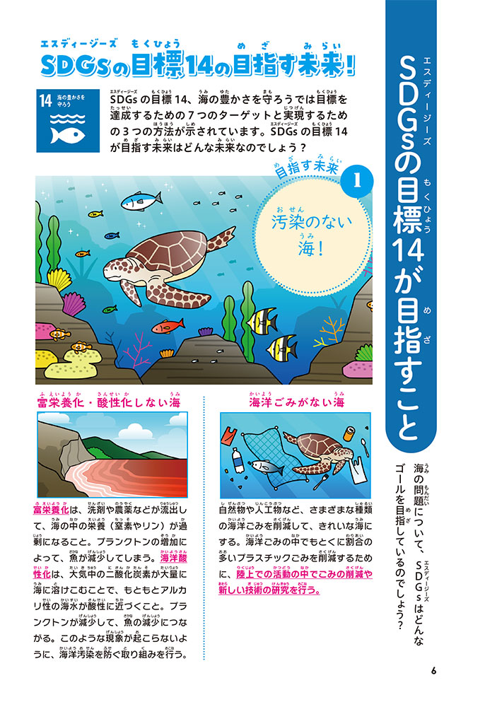 SDGsの目標14「海の豊かさを守ろう」は海の生き物の多様性を守るため、持続可能な漁業や海洋ごみの削減について呼びかけているよ。この本では、捨てられた漁の道具やペットボトルやそのキャップなど、海洋ごみで大きな割合を占める「プラスチック」をテーマに問題解決のためのヒントをたくさん紹介しているんだ。この本を読んで魚や貝、カメやイルカなど海の生き物の命を守るため、普段の生活の中でできることを考えてみよう!