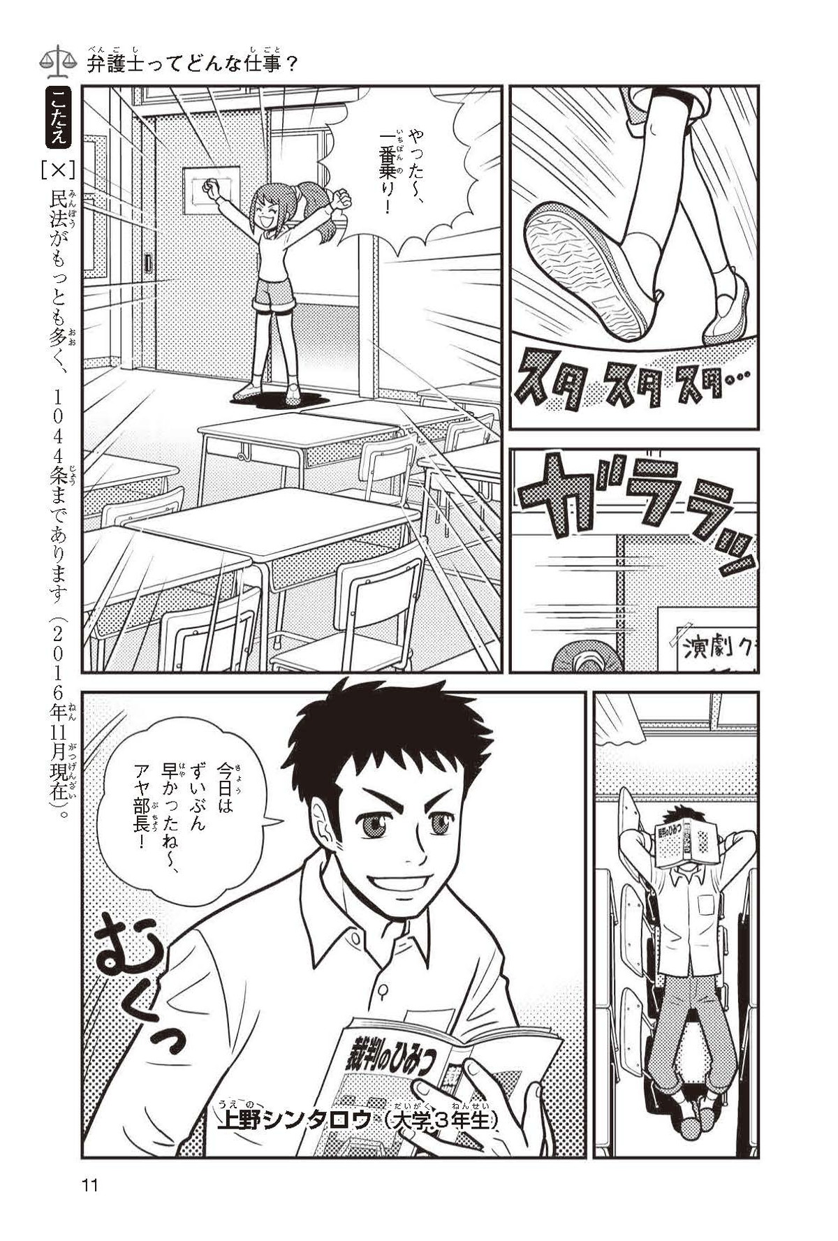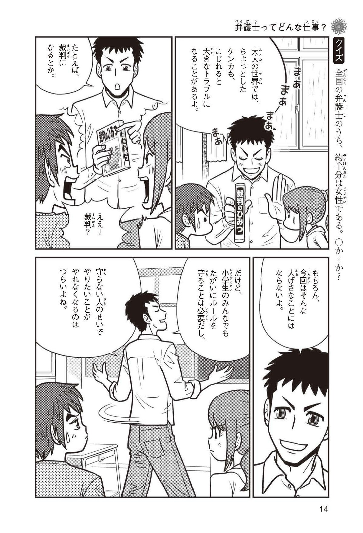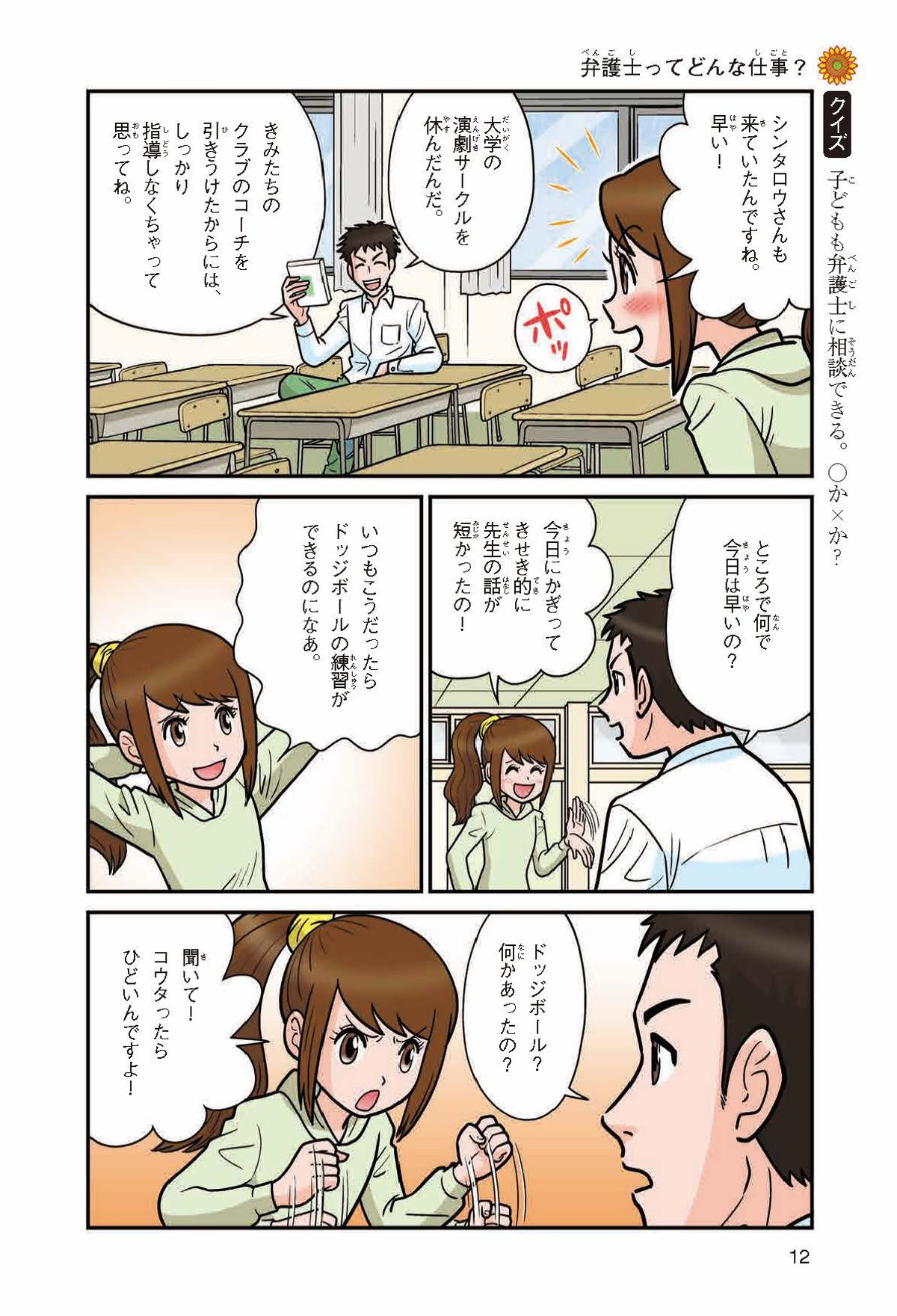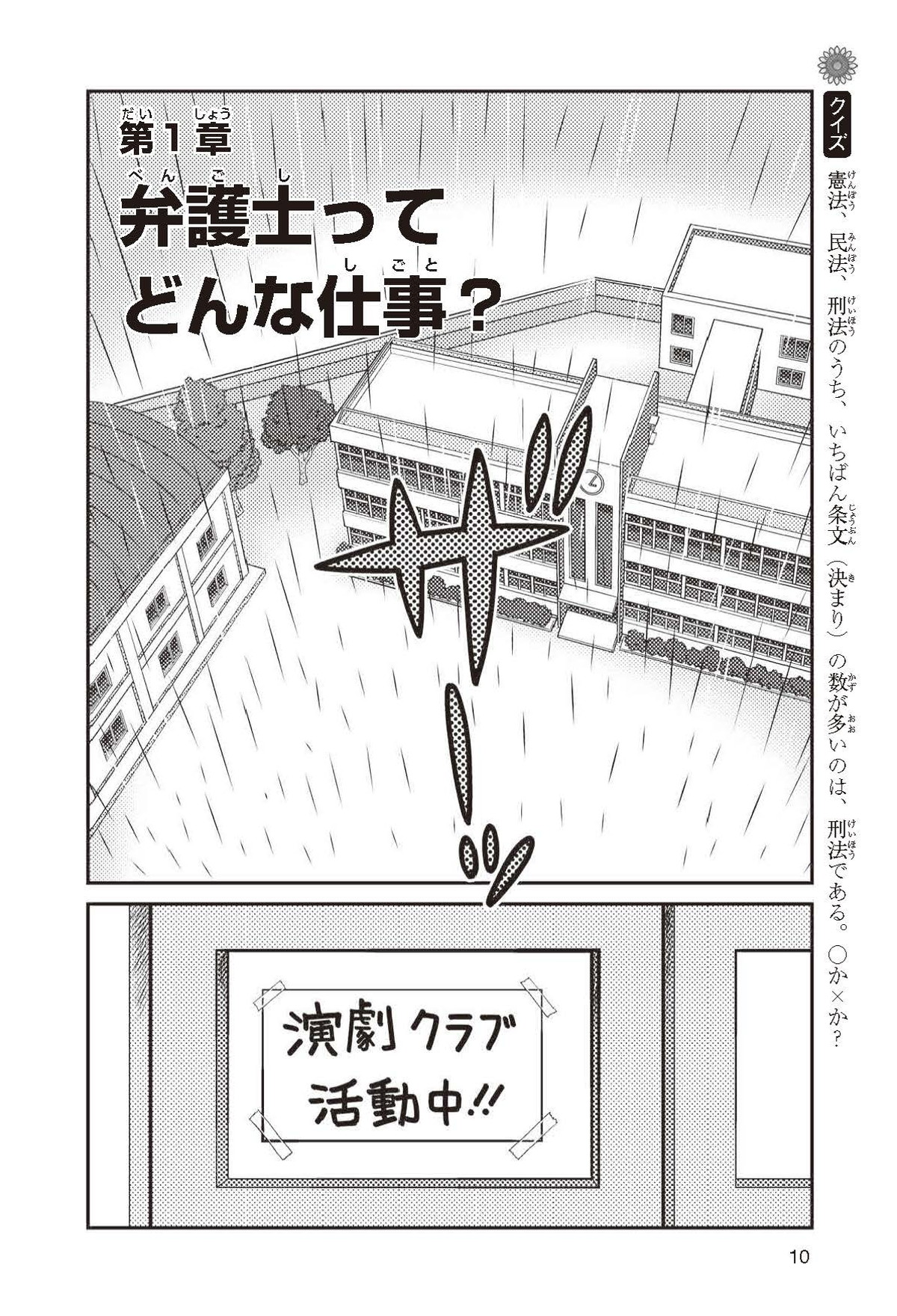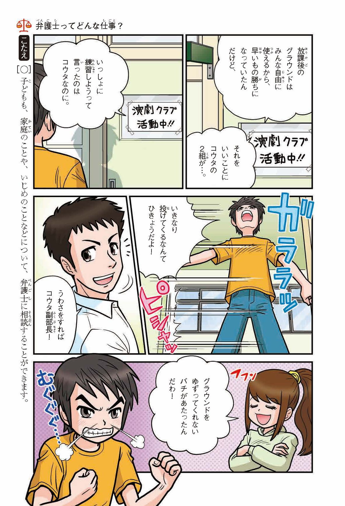 小学6年生のアヤとコウタは、同じ演劇(えんげき)クラブに所属(しょぞく)する仲間。だけど、ドッジボール大会の練習場所をめぐって言い争いになってしまうよ。演劇クラブのコーチで弁護士(べんごし)を目指す大学生、シンタロウが仲裁(ちゅうさい)してくれたのをきっかけに、弁護士の仕事に興味(きょうみ)を持ったアヤとコウタ。ふたりは、シンタロウといっしょに、裁判の現場(げんば)や法科大学院などに出かけ、弁護士の仕事のひみつをさぐっていくよ。
