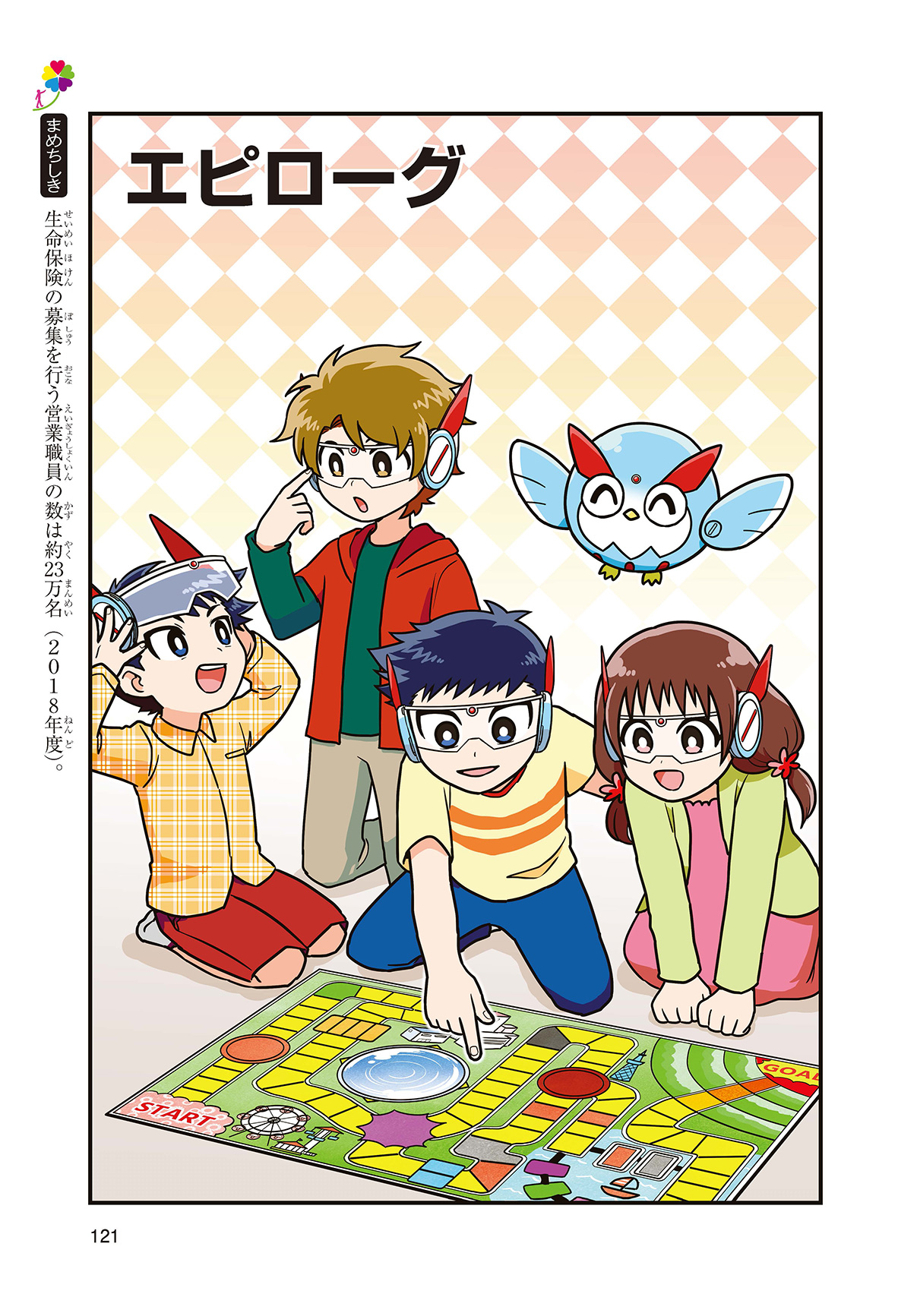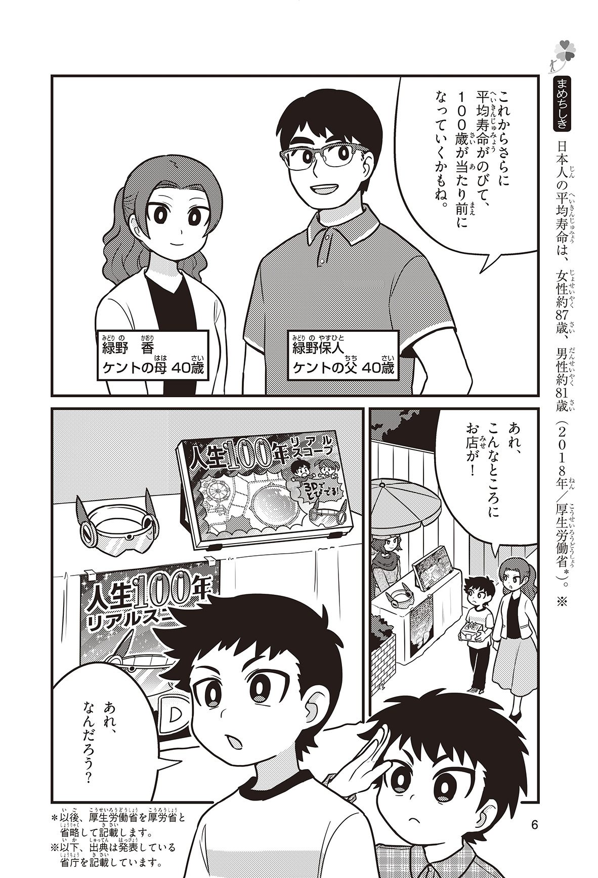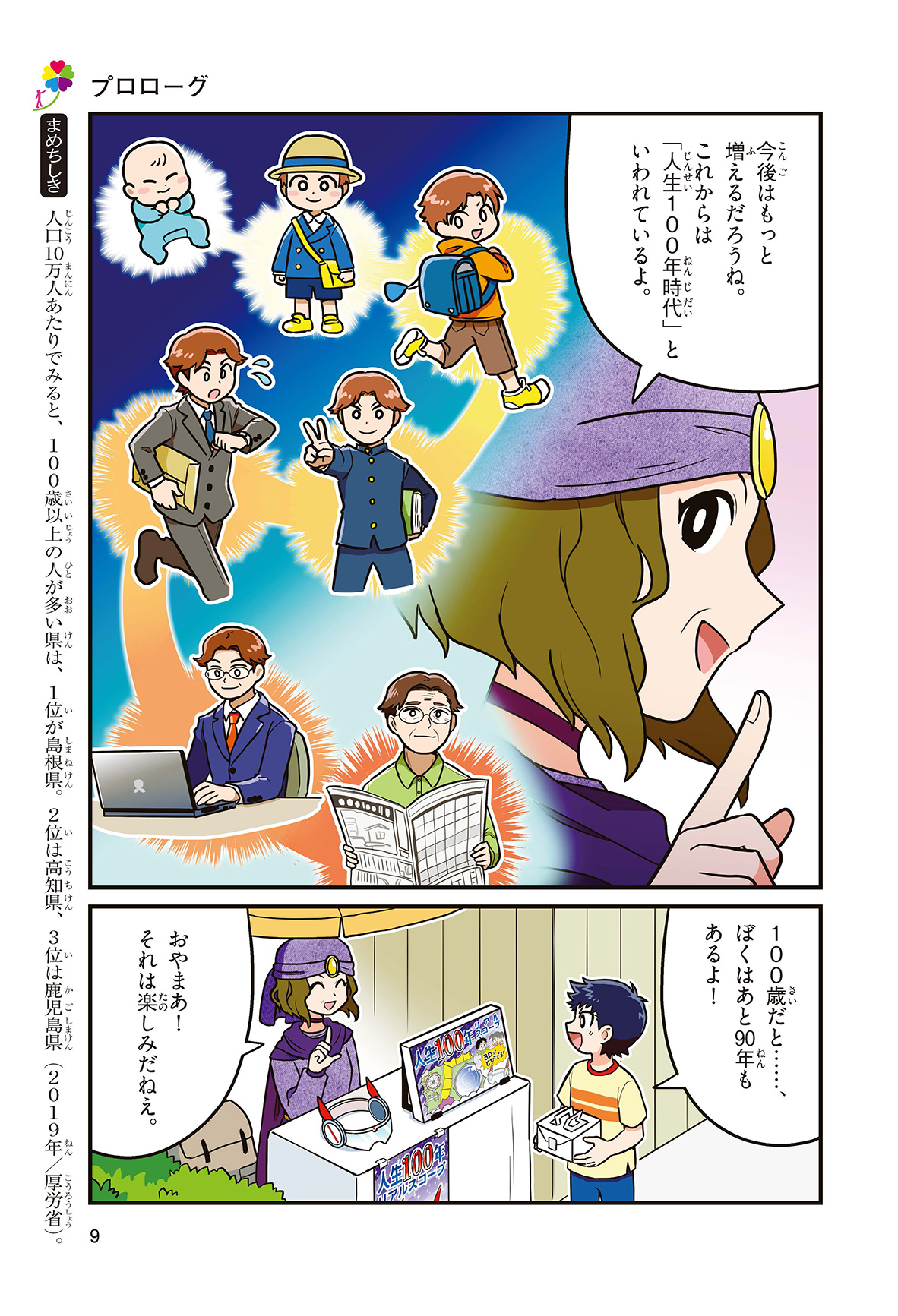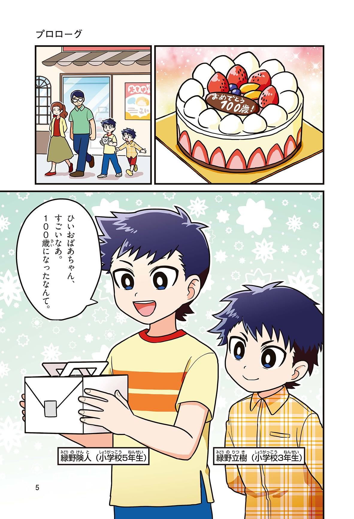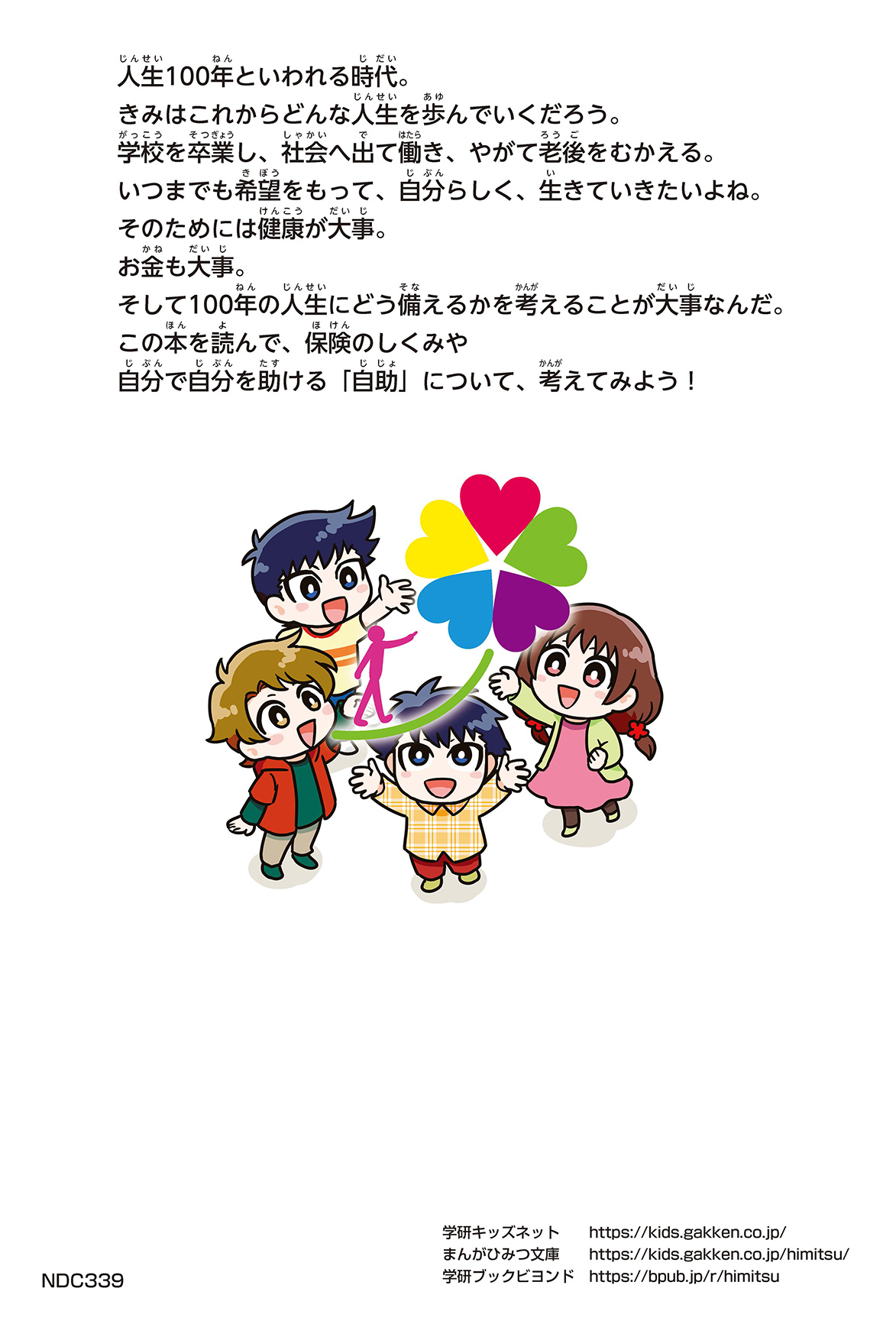 小学5年生のケントのひいおばあちゃんが100歳(さい)に! 100年の人生、色々なことがあったという話を聞くうちに、人生に起こるかもしれない危険(リスク)と、それに備える保険のしくみについて知りたくなるよ。ふしぎなゲーム『人生100年スコープ』を通じて、ケントたちと一緒に、自分らしい生き方や長い人生のために必要な準備、選択、そして自分で自分を助ける「自助」について、考えてみよう!