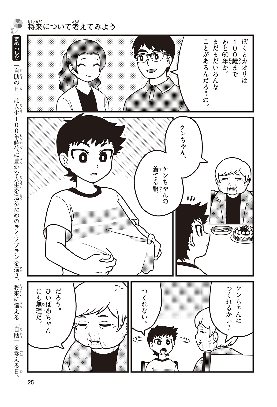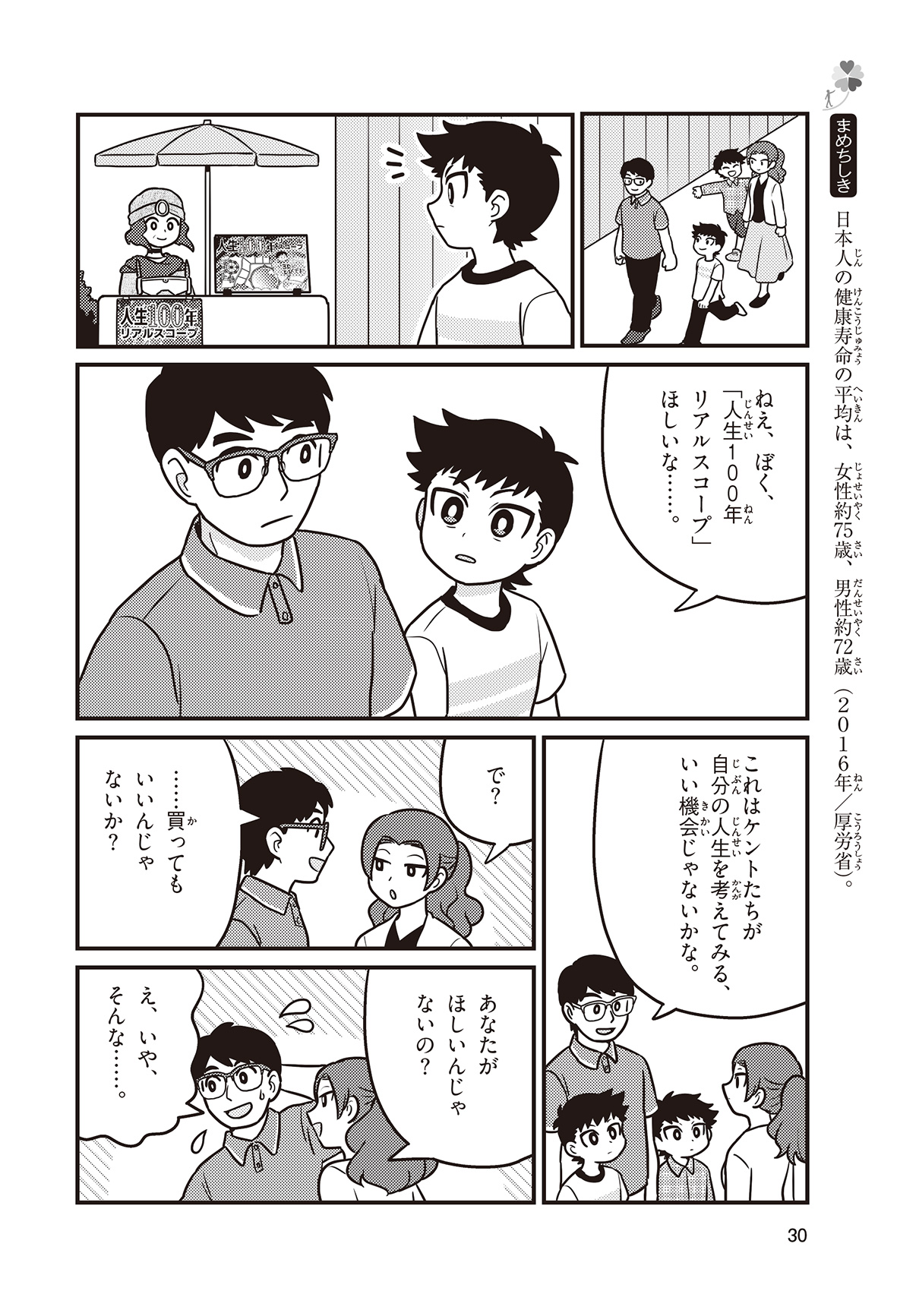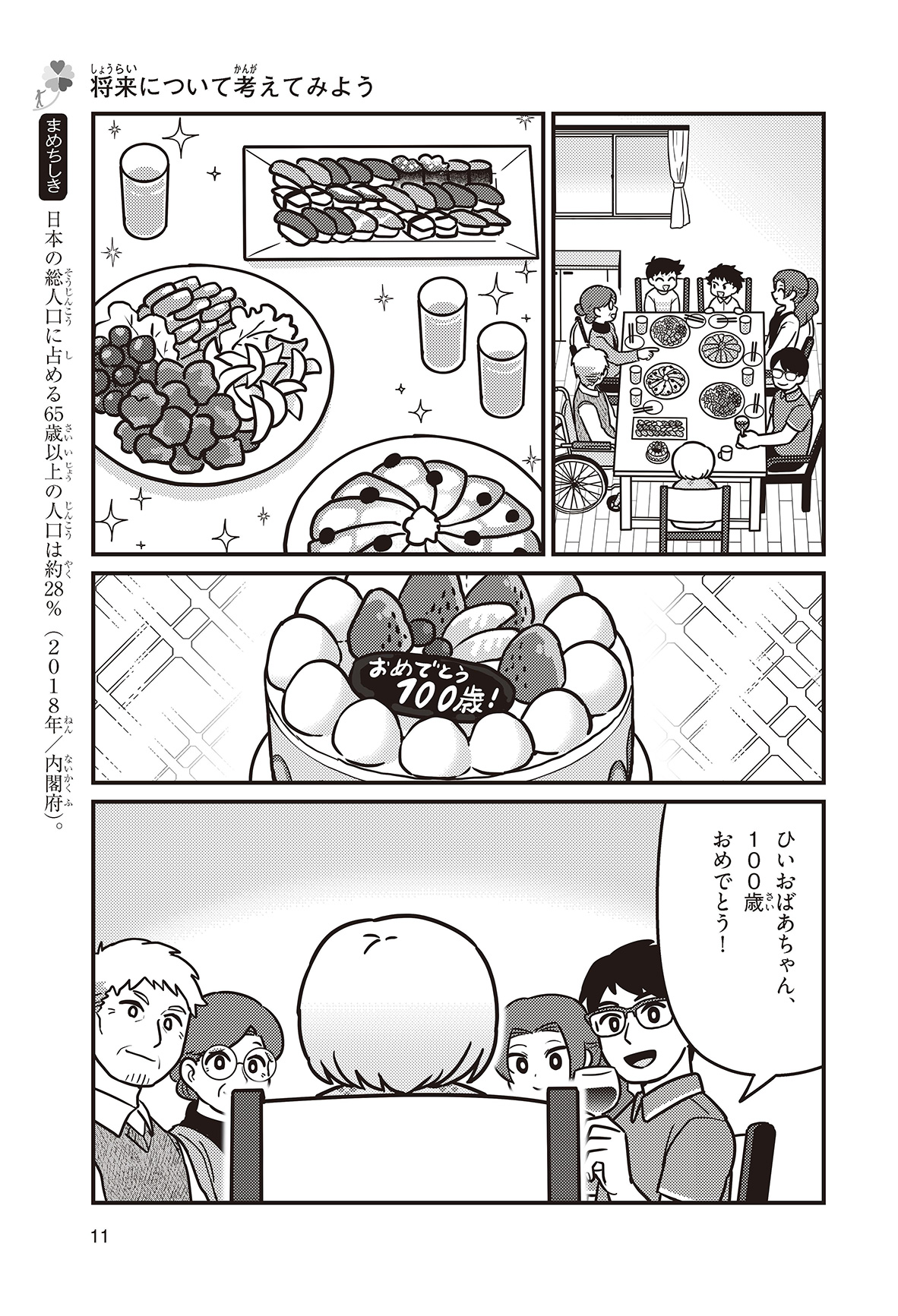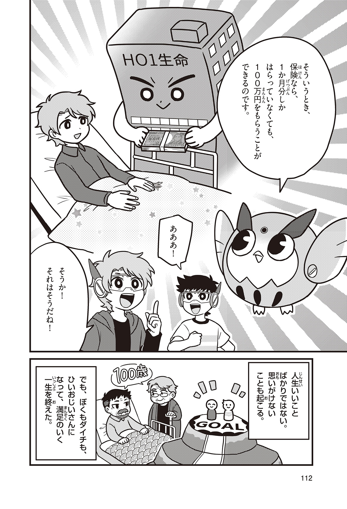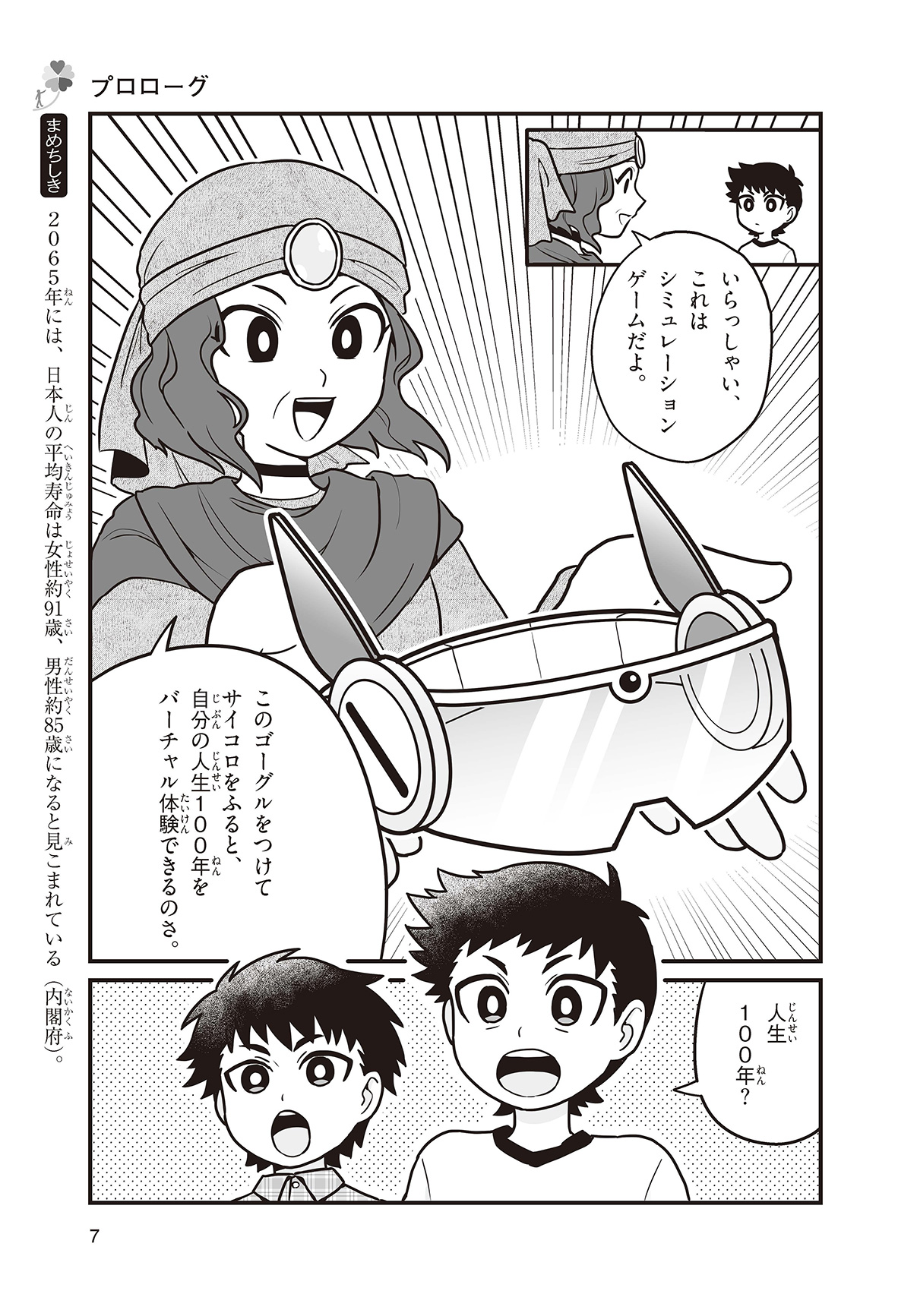 小学5年生のケントのひいおばあちゃんが100歳(さい)に! 100年の人生、色々なことがあったという話を聞くうちに、人生に起こるかもしれない危険(リスク)と、それに備える保険のしくみについて知りたくなるよ。ふしぎなゲーム『人生100年スコープ』を通じて、ケントたちと一緒に、自分らしい生き方や長い人生のために必要な準備、選択、そして自分で自分を助ける「自助」について、考えてみよう!