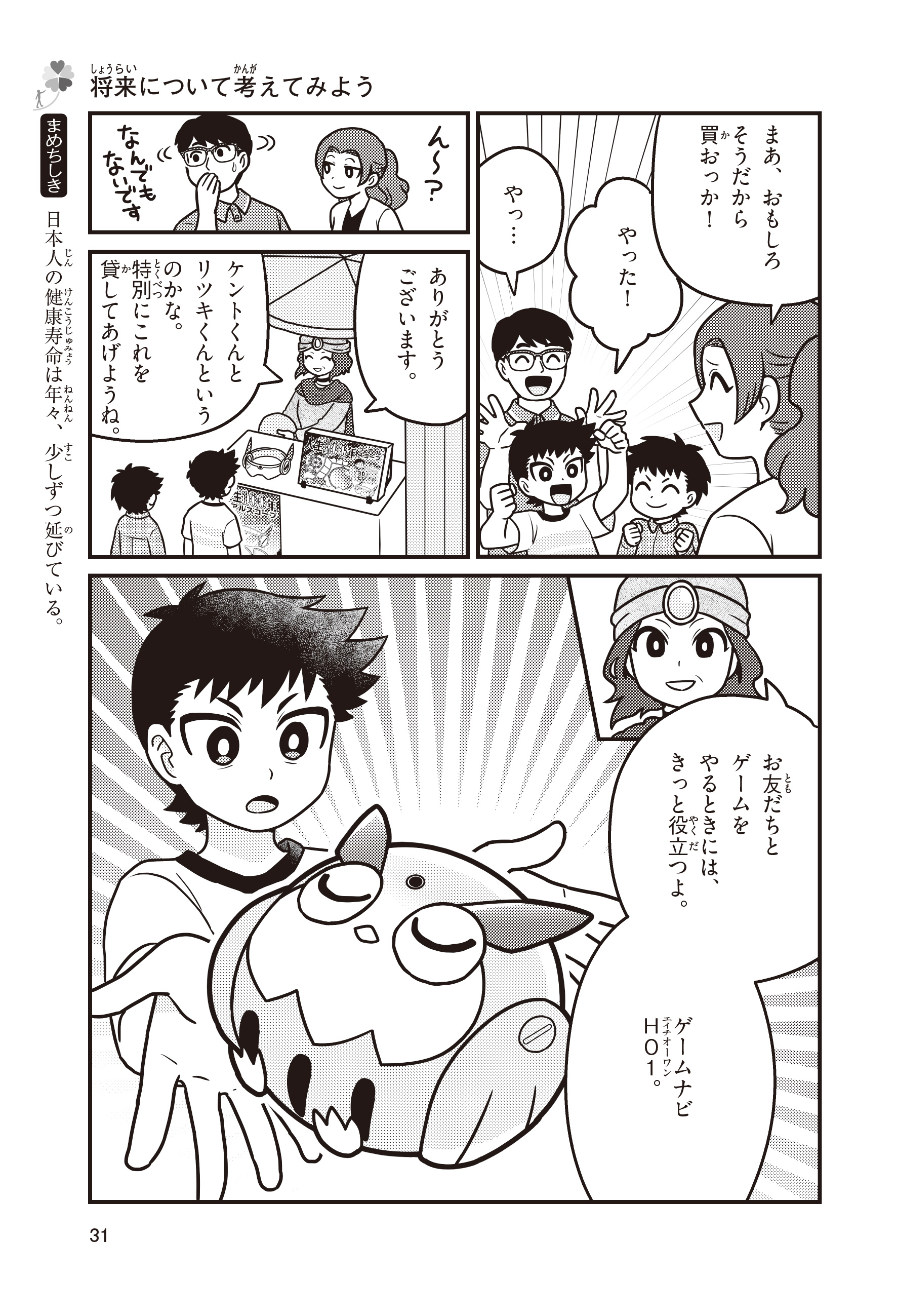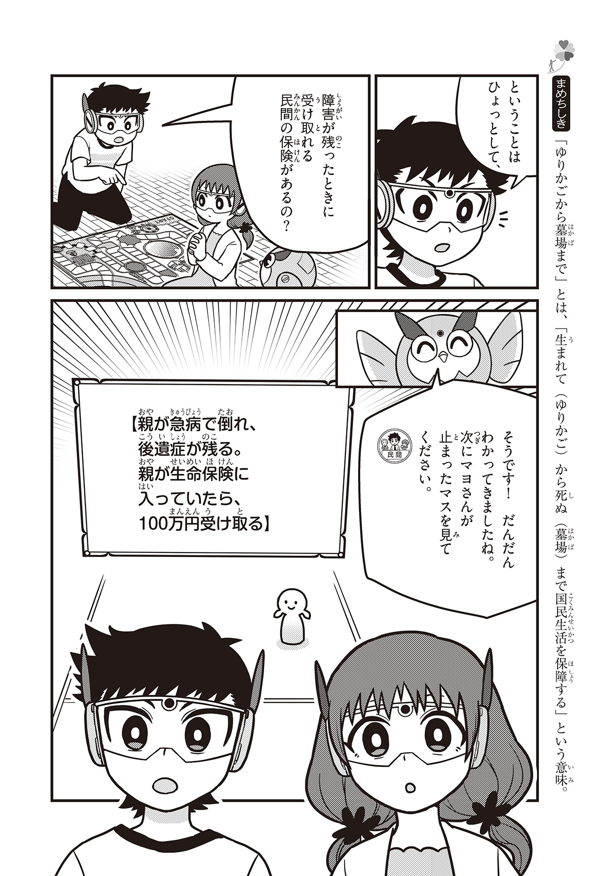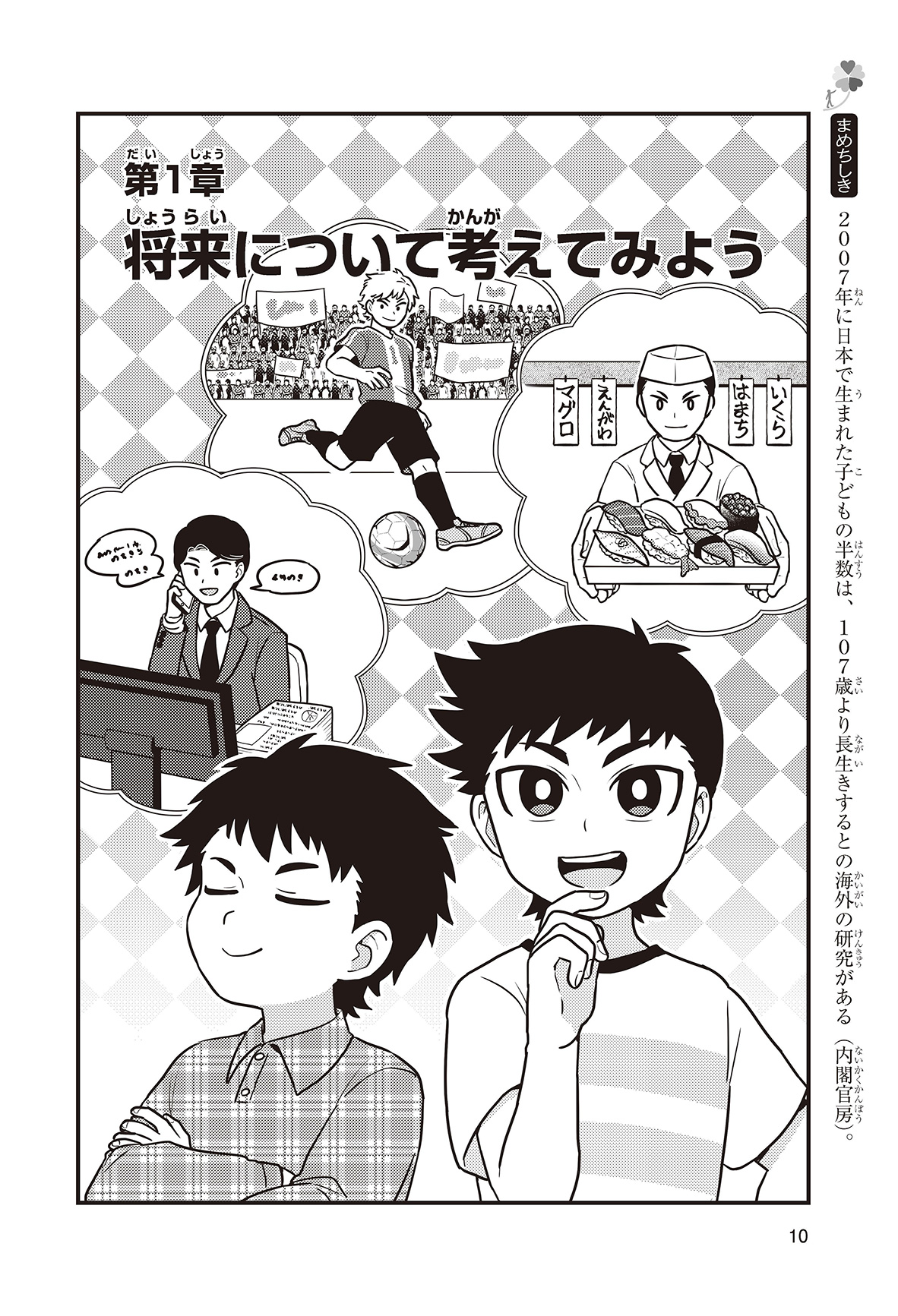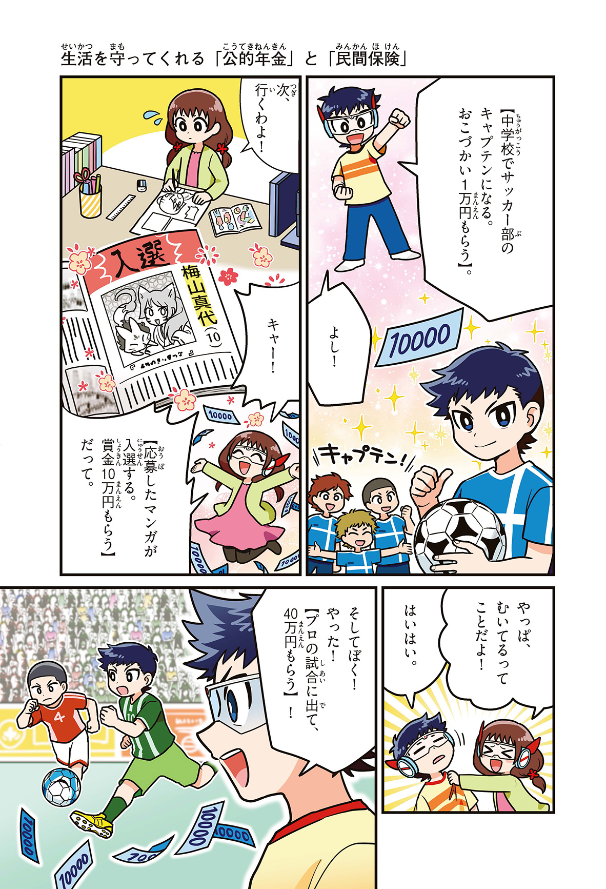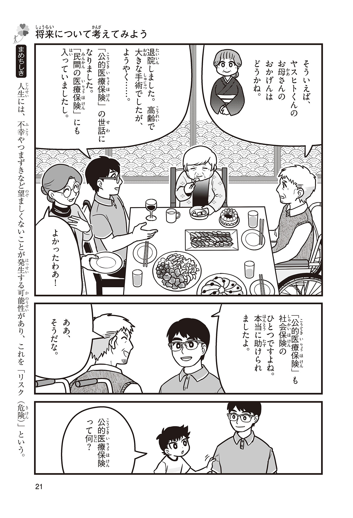 小学5年生のケントのひいおばあちゃんが100歳(さい)に! 100年の人生、色々なことがあったという話を聞くうちに、人生に起こるかもしれない危険(リスク)と、それに備える保険のしくみについて知りたくなるよ。ふしぎなゲーム『人生100年スコープ』を通じて、ケントたちと一緒に、自分らしい生き方や長い人生のために必要な準備、選択、そして自分で自分を助ける「自助」について、考えてみよう!