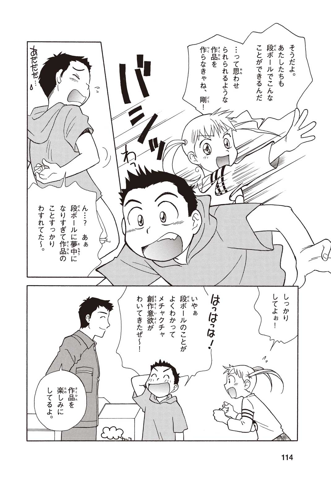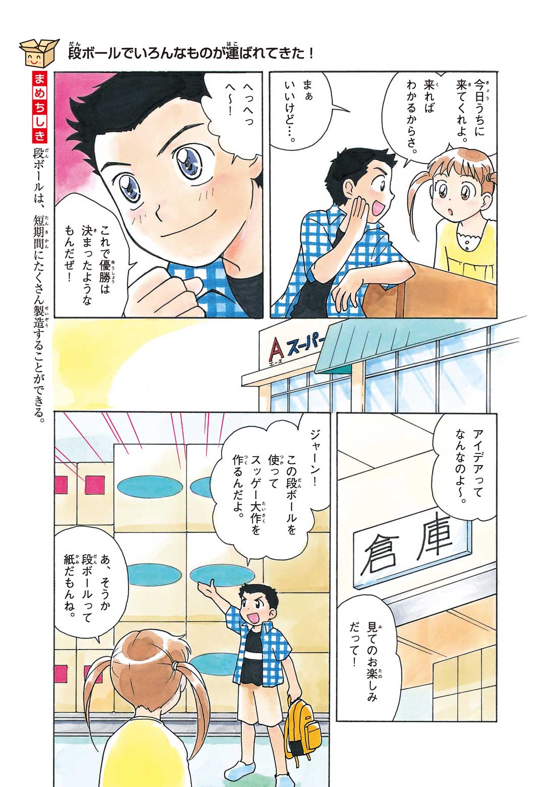 町の工作コンクールに、剛(ごう)の小学校が出品することになった。工作の決まりは、紙で作ること。剛(ごう)は、絵のじょうずな「かれん」といっしょに組むことで、優勝をねらう意欲(いよく)を燃やす。放課後、さっそくかれんを自分の家にさそう剛。剛の家はスーパーマーケットを営んでいて、工作にピッタリな段ボールがたくさんあるのだった・・・。