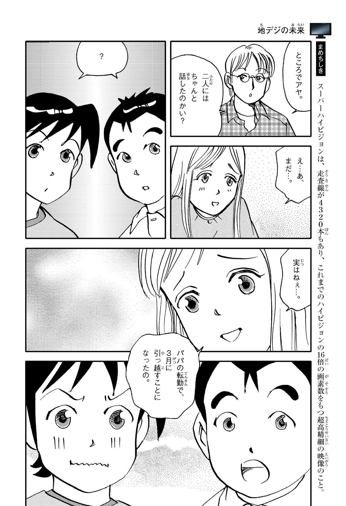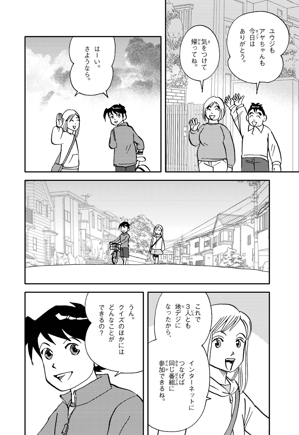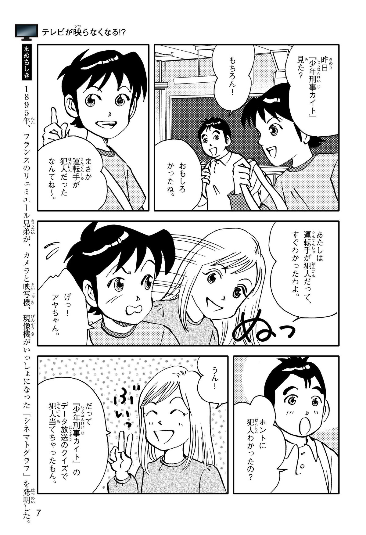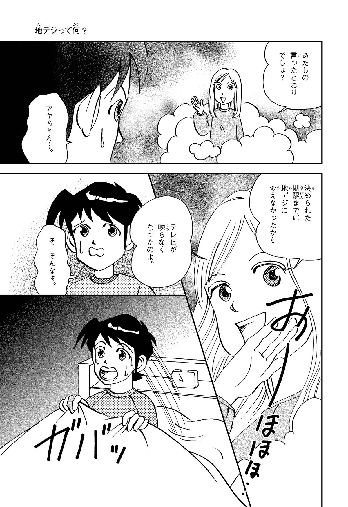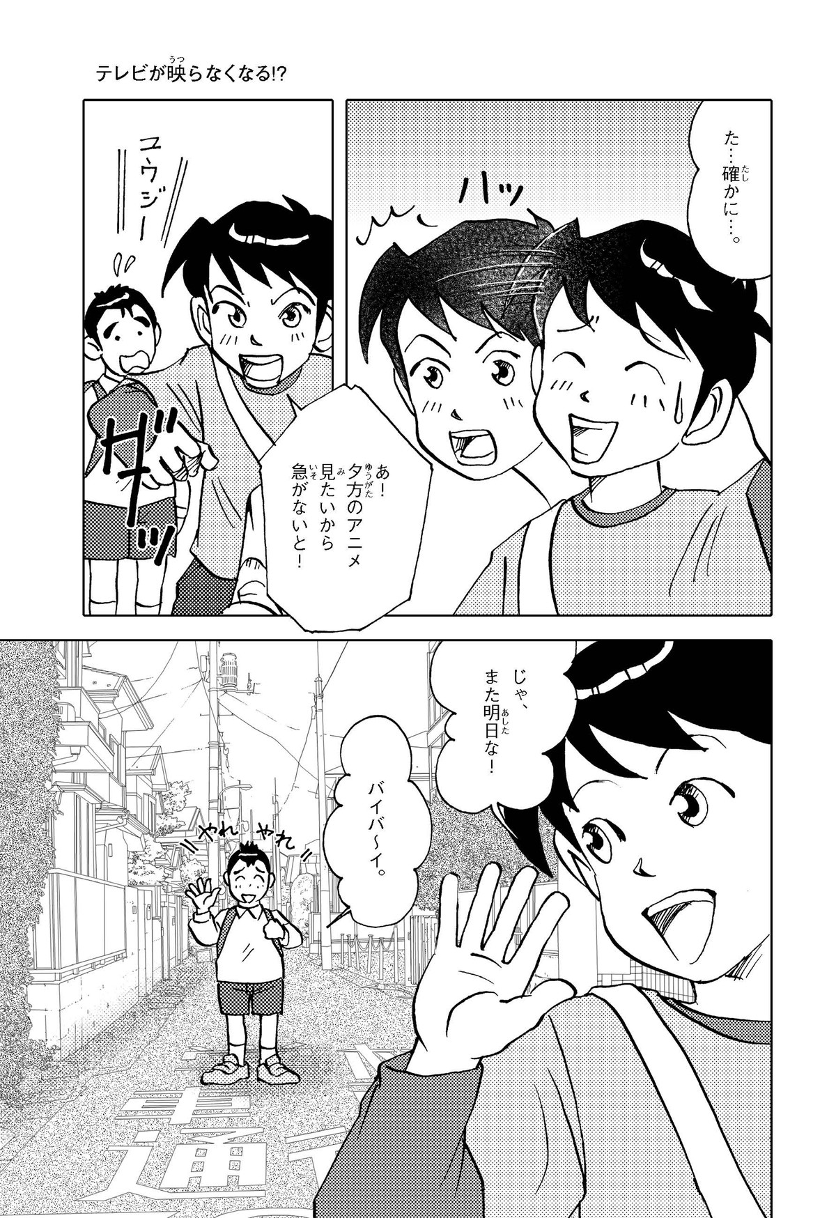 もうすぐテレビが映(うつ)らなくなる? ちょっと気になるアヤちゃんのことばを、はじめはぜんぜん信用しなかったユウジ。自分ちが地デジになったのをじまんしたかっただけでしょ、と思っていたんだけど、夢(ゆめ)の中で見ていた番組『少年刑事(しょうねんけいじ)カイト』が急に映らなくなっちゃった。心配になったユウジは、テレビ局で働いているアヤちゃんのパパに会いにアヤちゃんのおうちをたずねることに…。