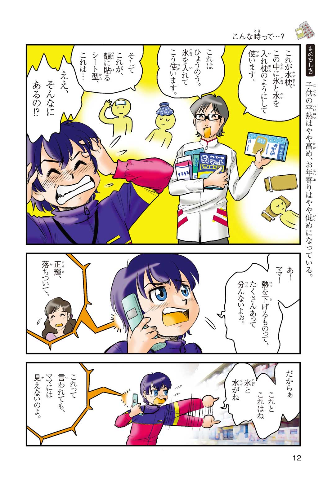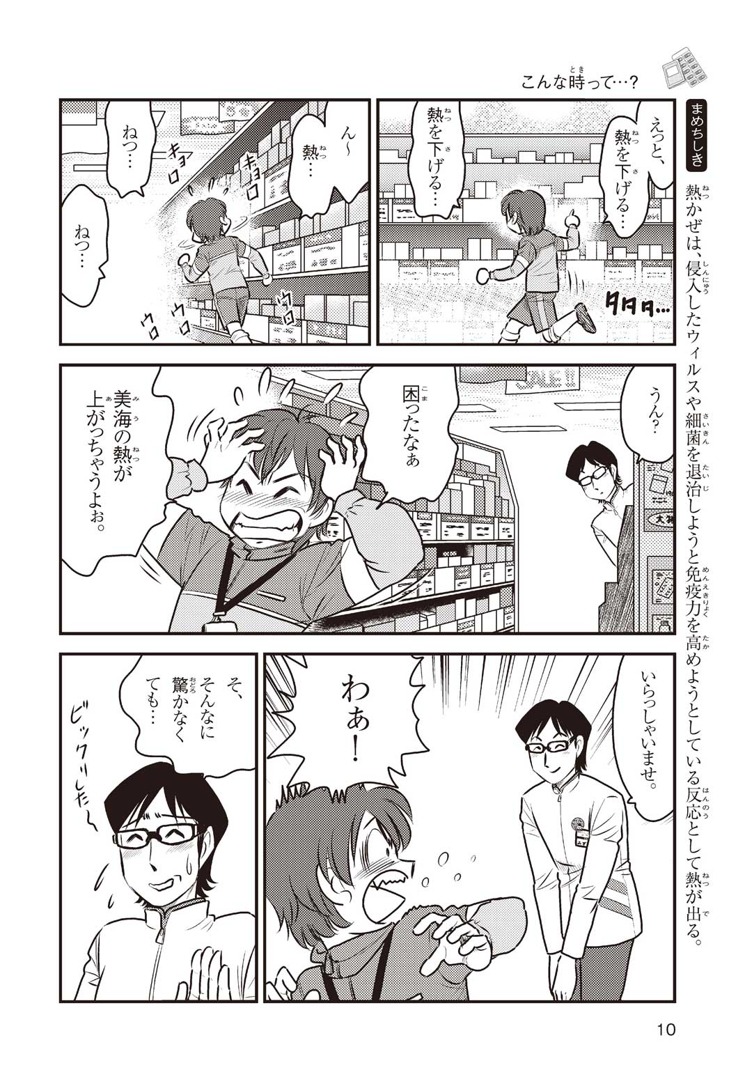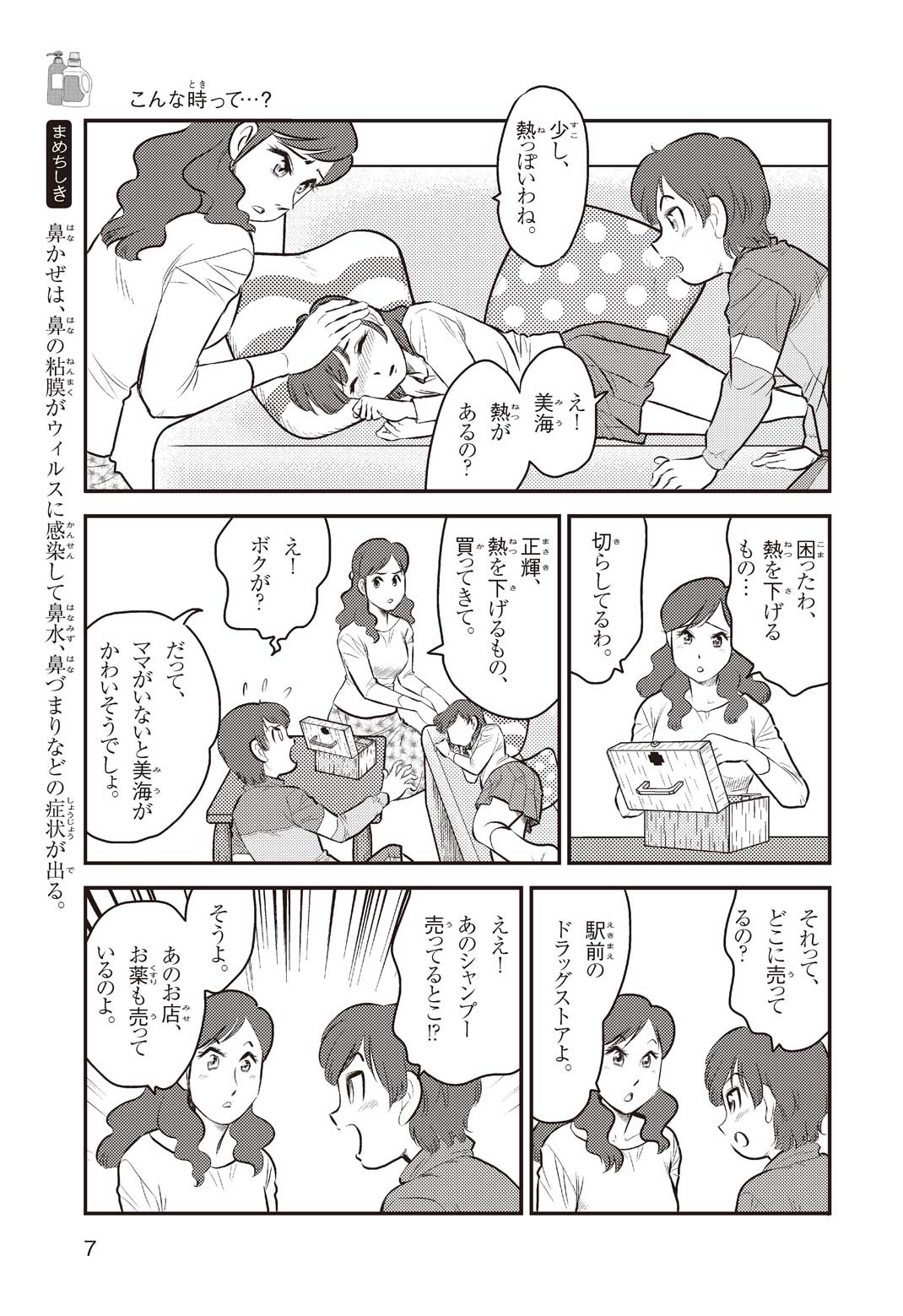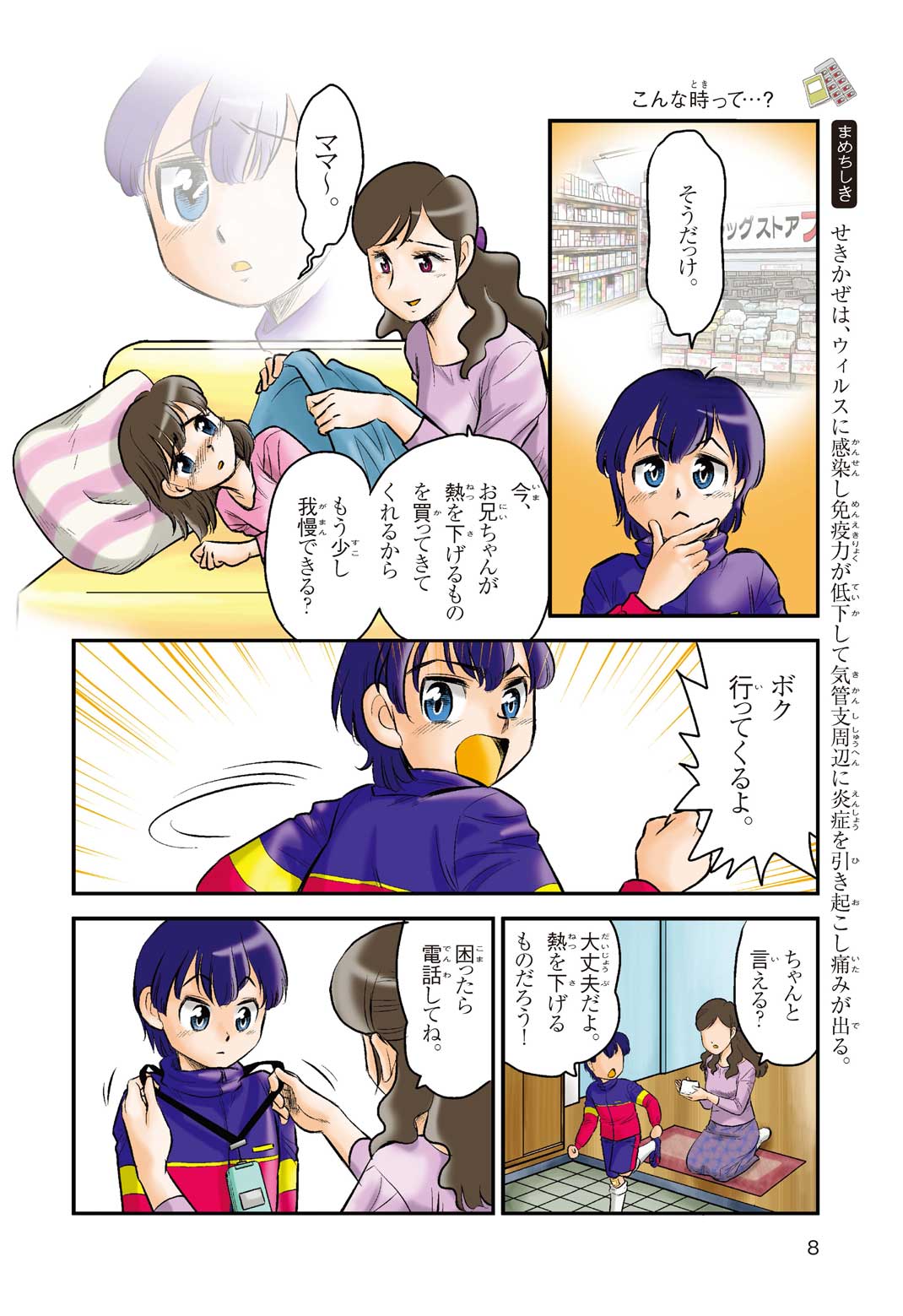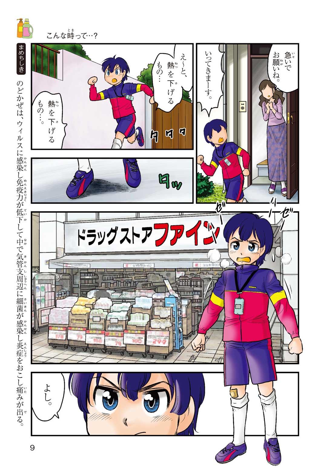 小学5年の正輝(まさき)がサッカーの練習から帰ると、妹の美海(みう)が熱を出してぐったりしていた。救急箱の中には熱を下げるために使うものがなく、正輝がドラッグストアに買いに行くことになった。ところが、お店には熱を下げるものがたくさんあって、どれを買えばいいのかわからない。早くしなくちゃ美海の熱が上がっちゃう! さて、どうする? 正輝。