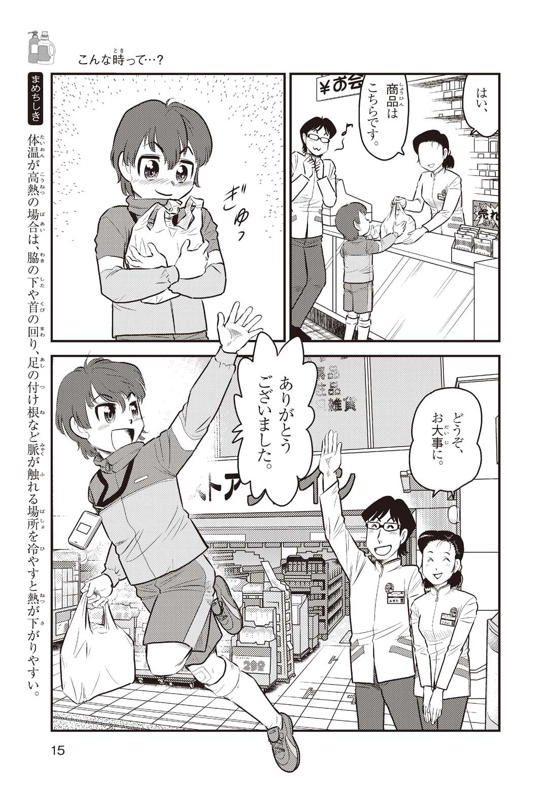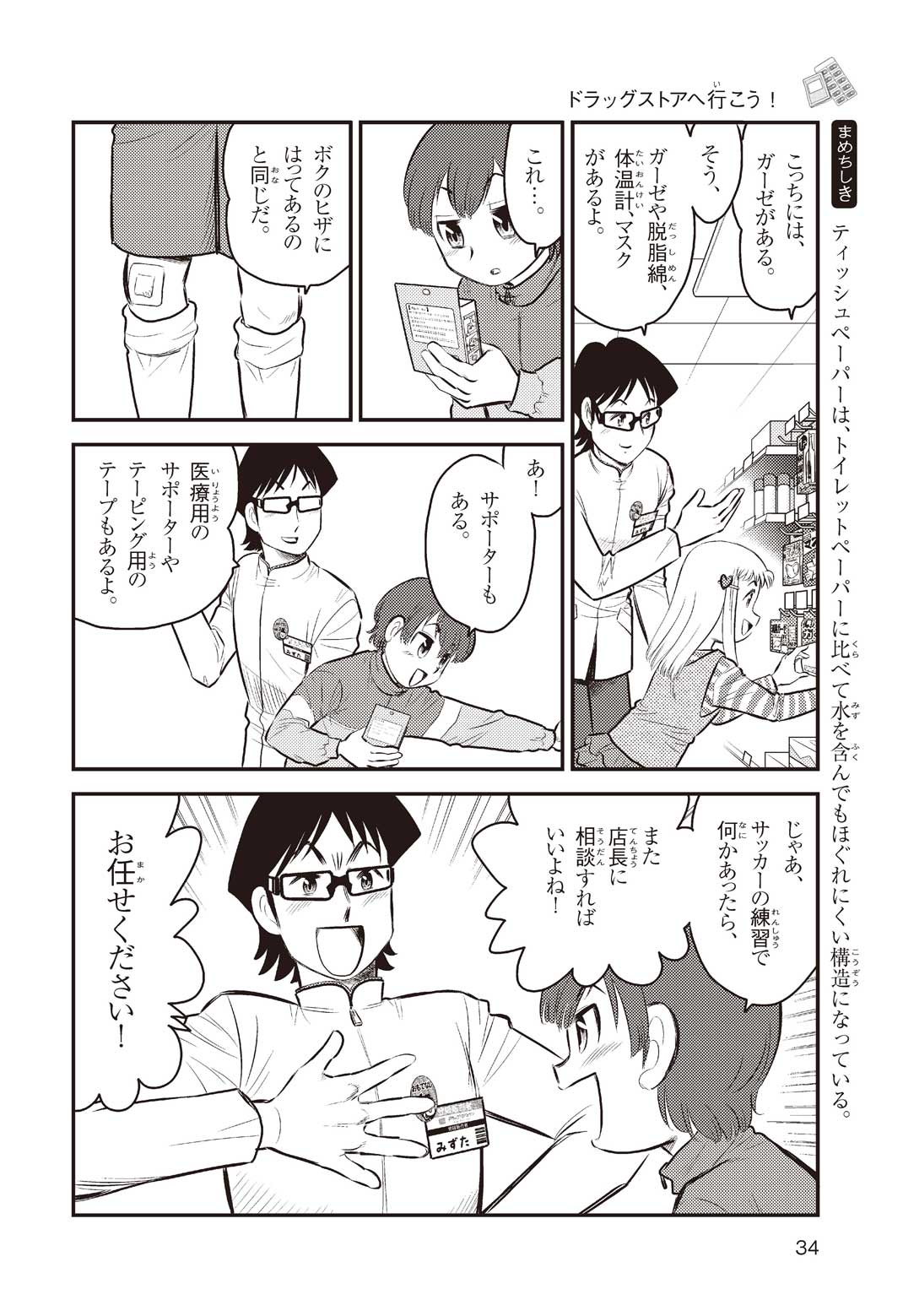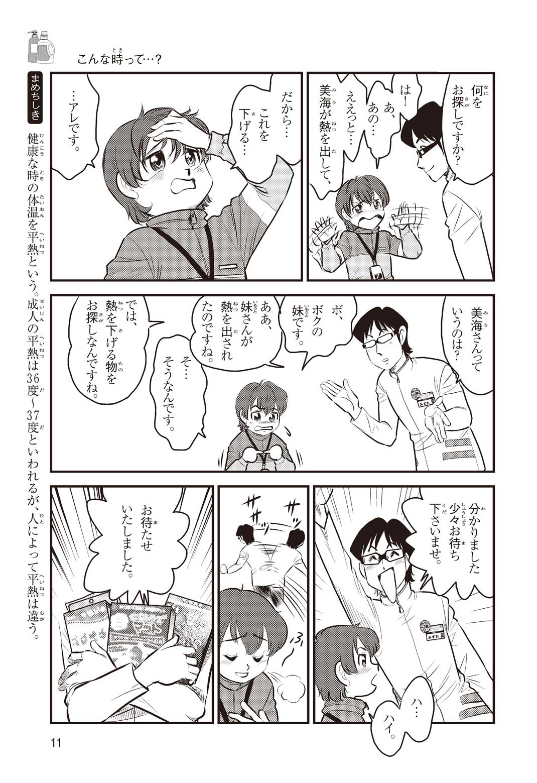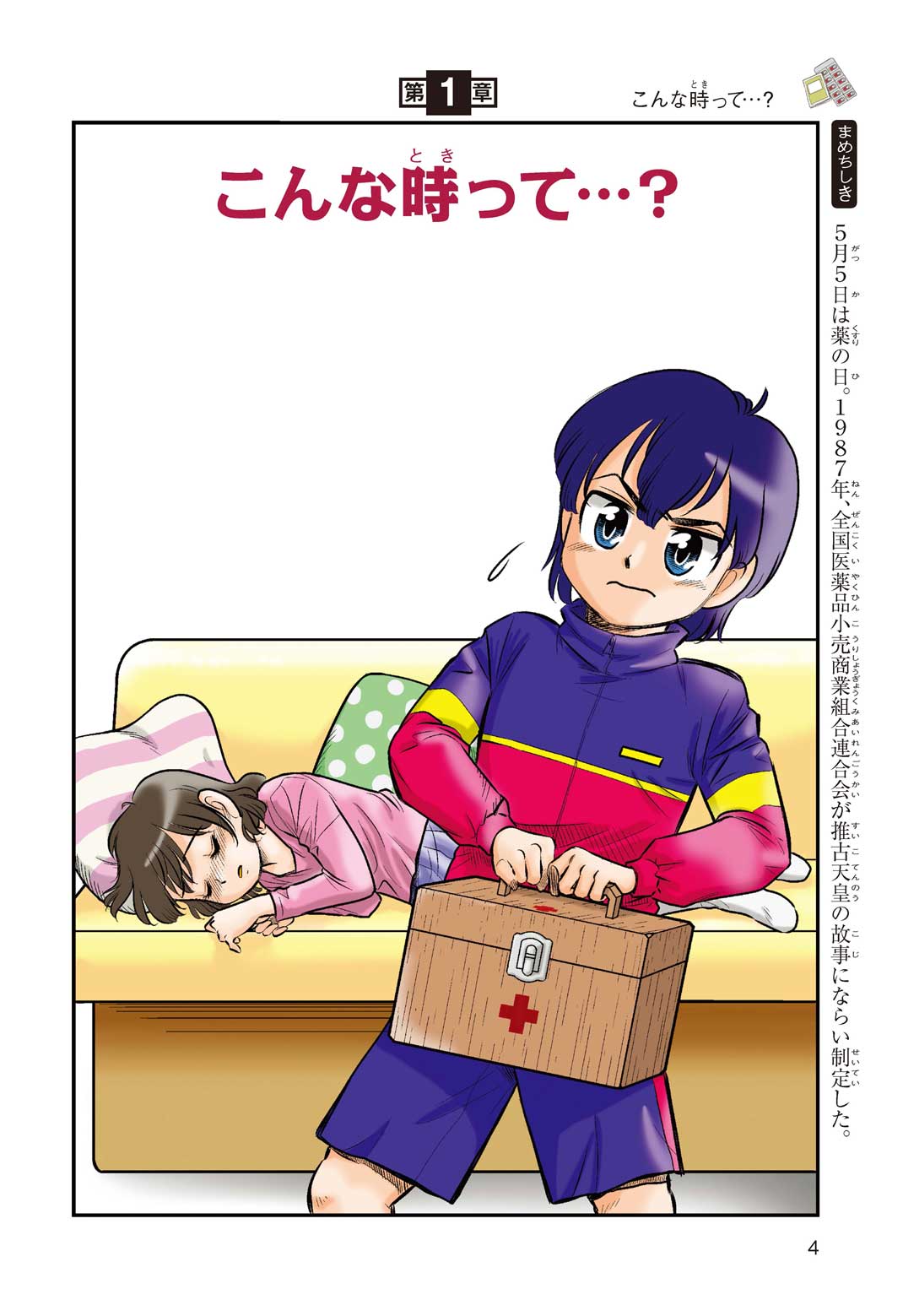 小学5年の正輝(まさき)がサッカーの練習から帰ると、妹の美海(みう)が熱を出してぐったりしていた。救急箱の中には熱を下げるために使うものがなく、正輝がドラッグストアに買いに行くことになった。ところが、お店には熱を下げるものがたくさんあって、どれを買えばいいのかわからない。早くしなくちゃ美海の熱が上がっちゃう! さて、どうする? 正輝。