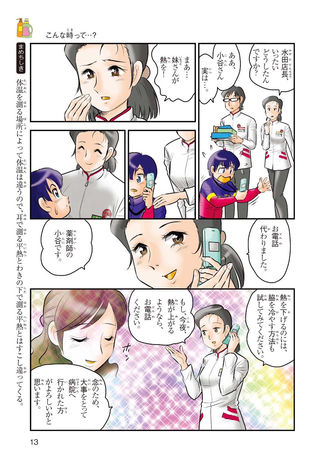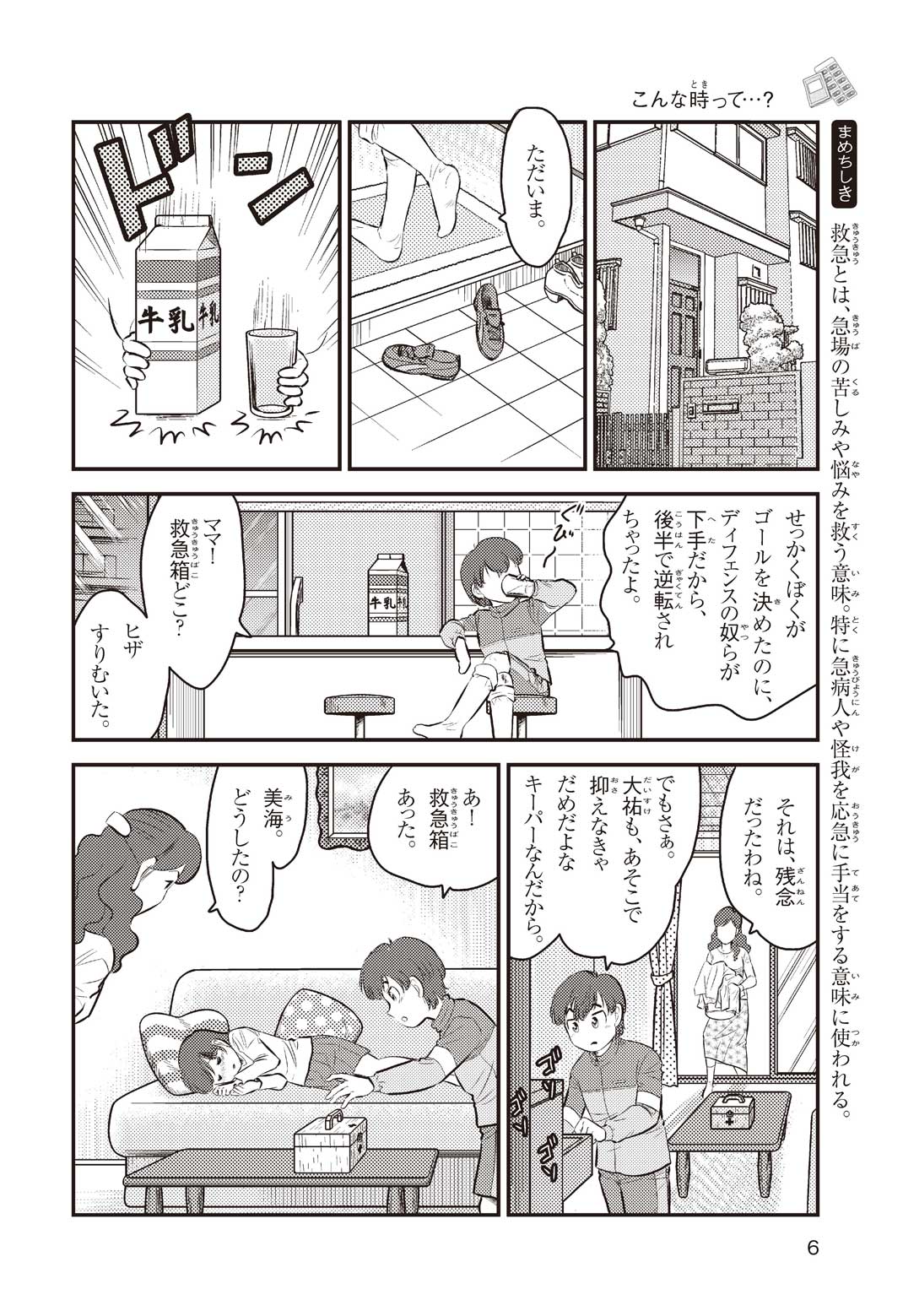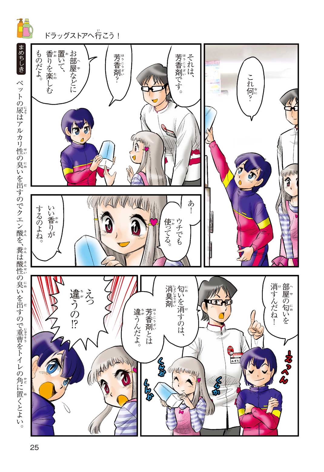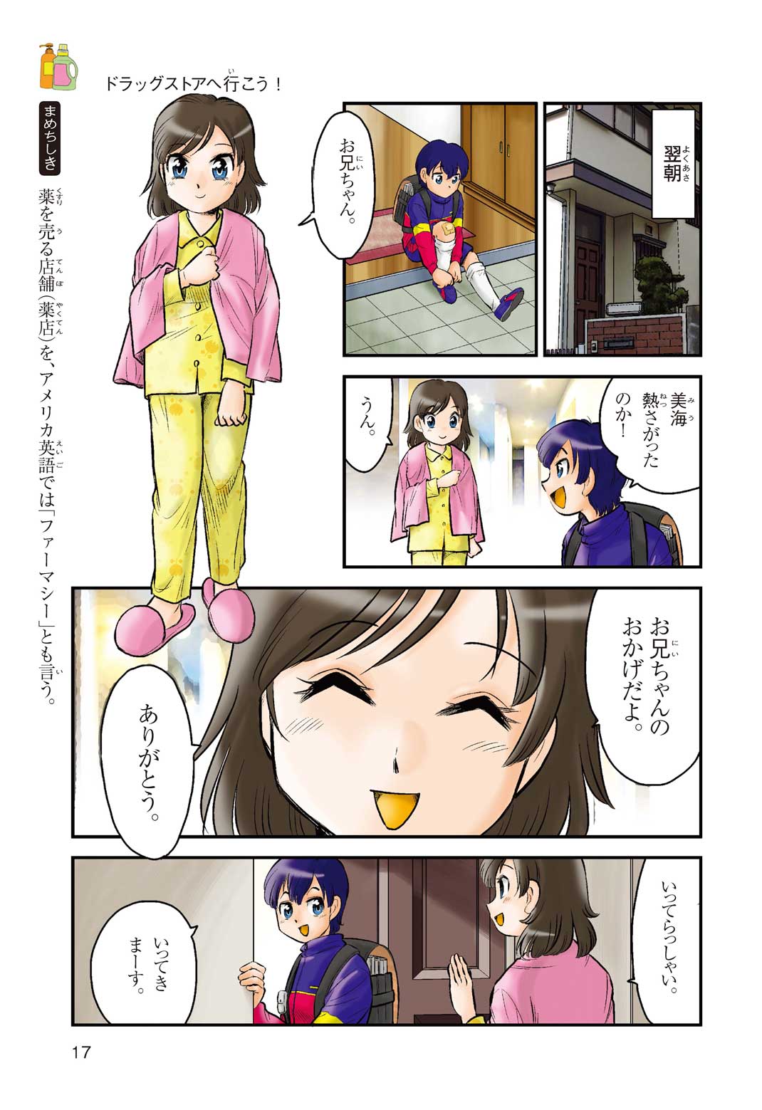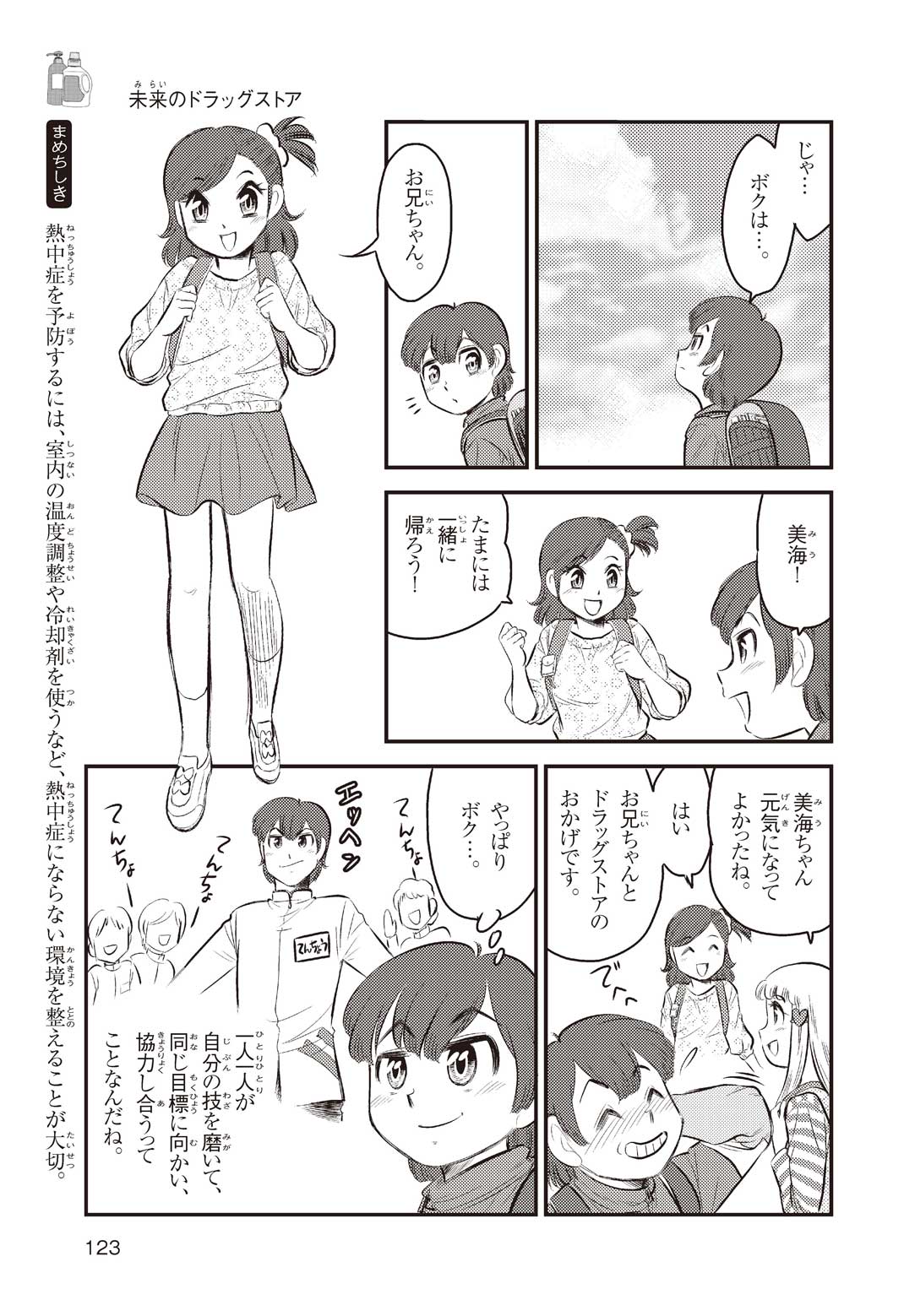 小学5年の正輝(まさき)がサッカーの練習から帰ると、妹の美海(みう)が熱を出してぐったりしていた。救急箱の中には熱を下げるために使うものがなく、正輝がドラッグストアに買いに行くことになった。ところが、お店には熱を下げるものがたくさんあって、どれを買えばいいのかわからない。早くしなくちゃ美海の熱が上がっちゃう! さて、どうする? 正輝。